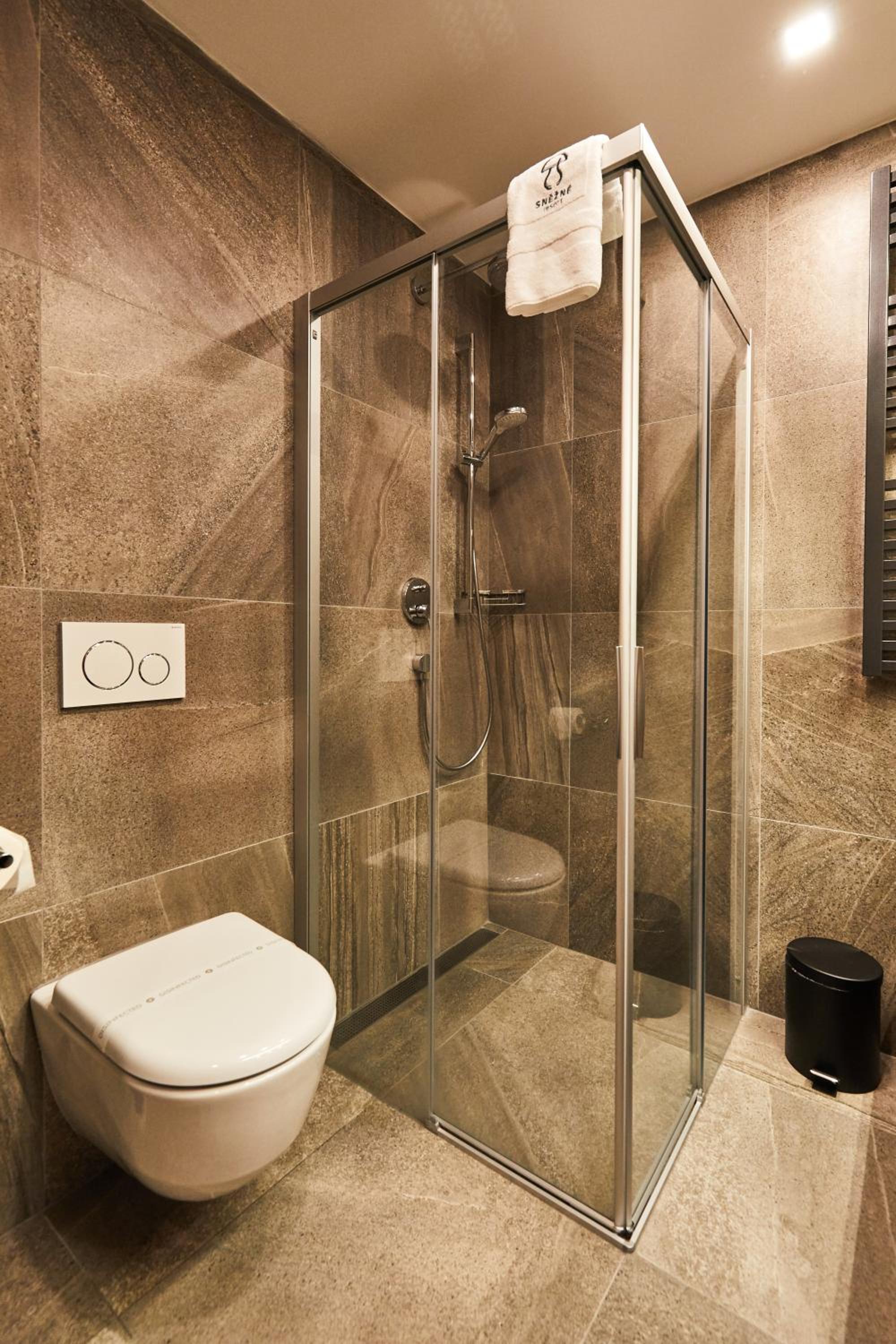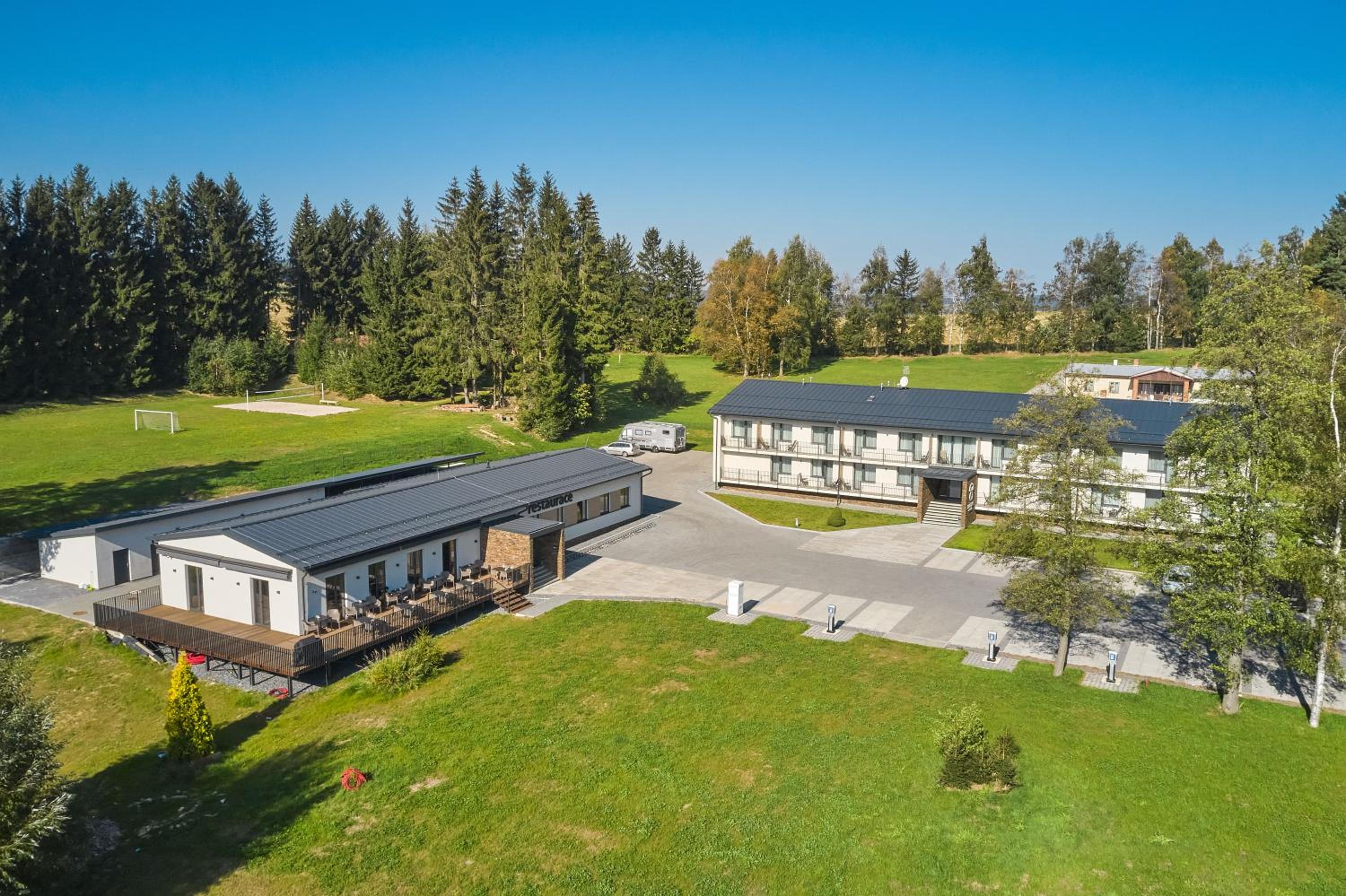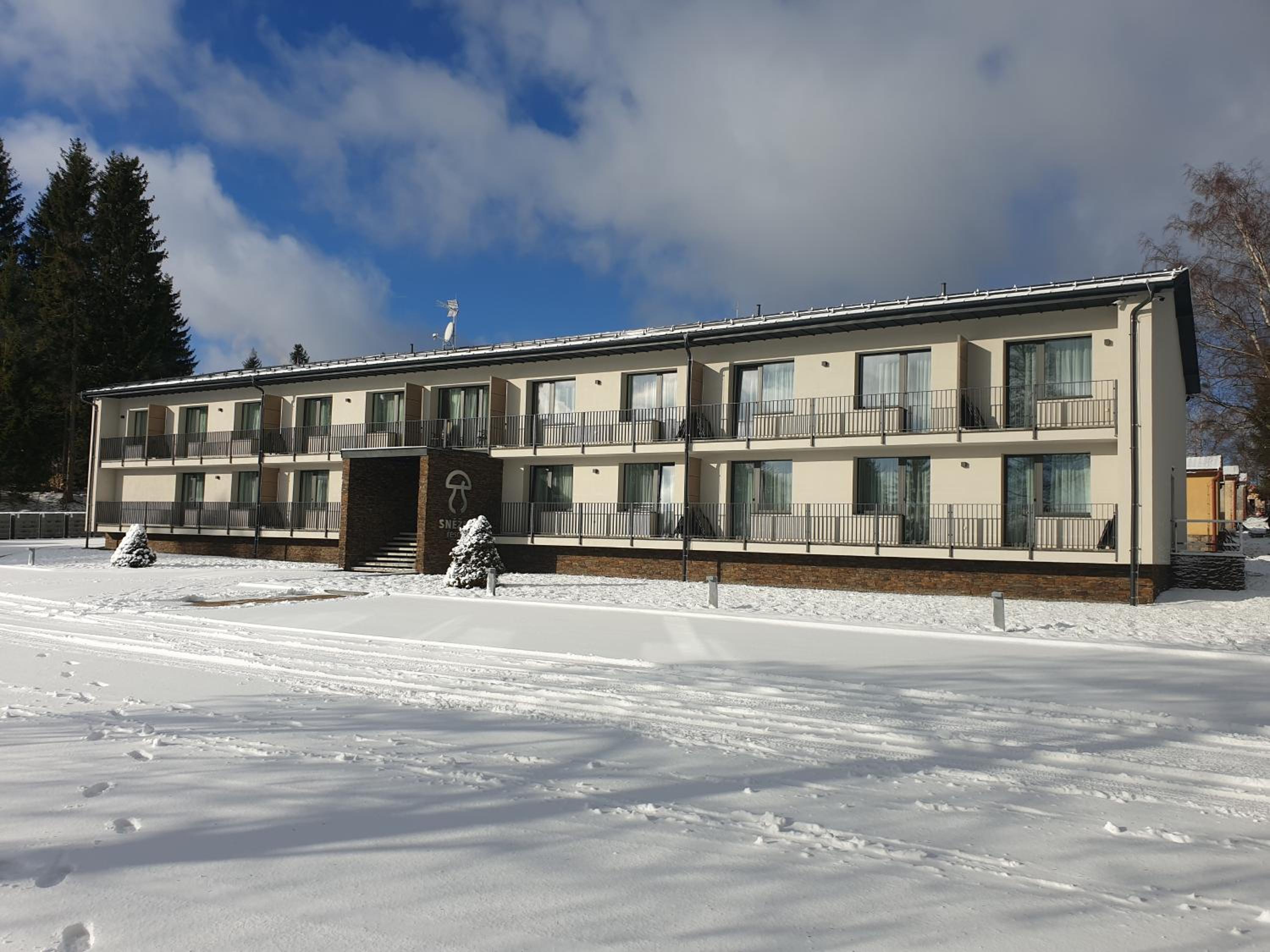 Cele zařízení bylo nové a moc hezké. Motiv muchomůrky se objevoval všude a bylo to vtipné a příjemné. Pokoje čisté a nové - není co vytknout. Okolí bylo taky super. Velké parkoviště i pro elektromobily a nabíječky na elektro kola. Super. Ubytování jsme vybírali převážně podle lokality, protože jsme potřebovali být blízko obce Sněžné.