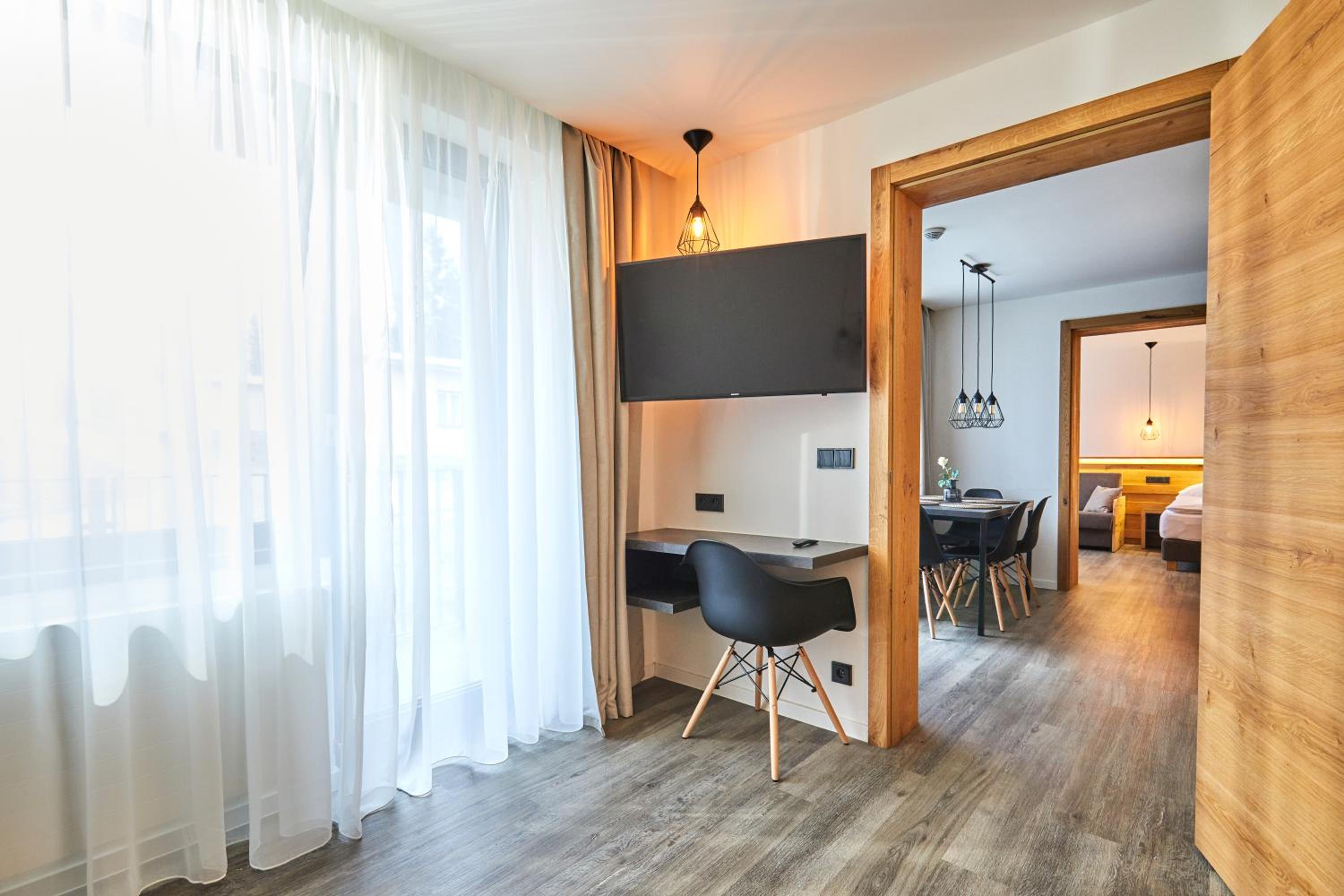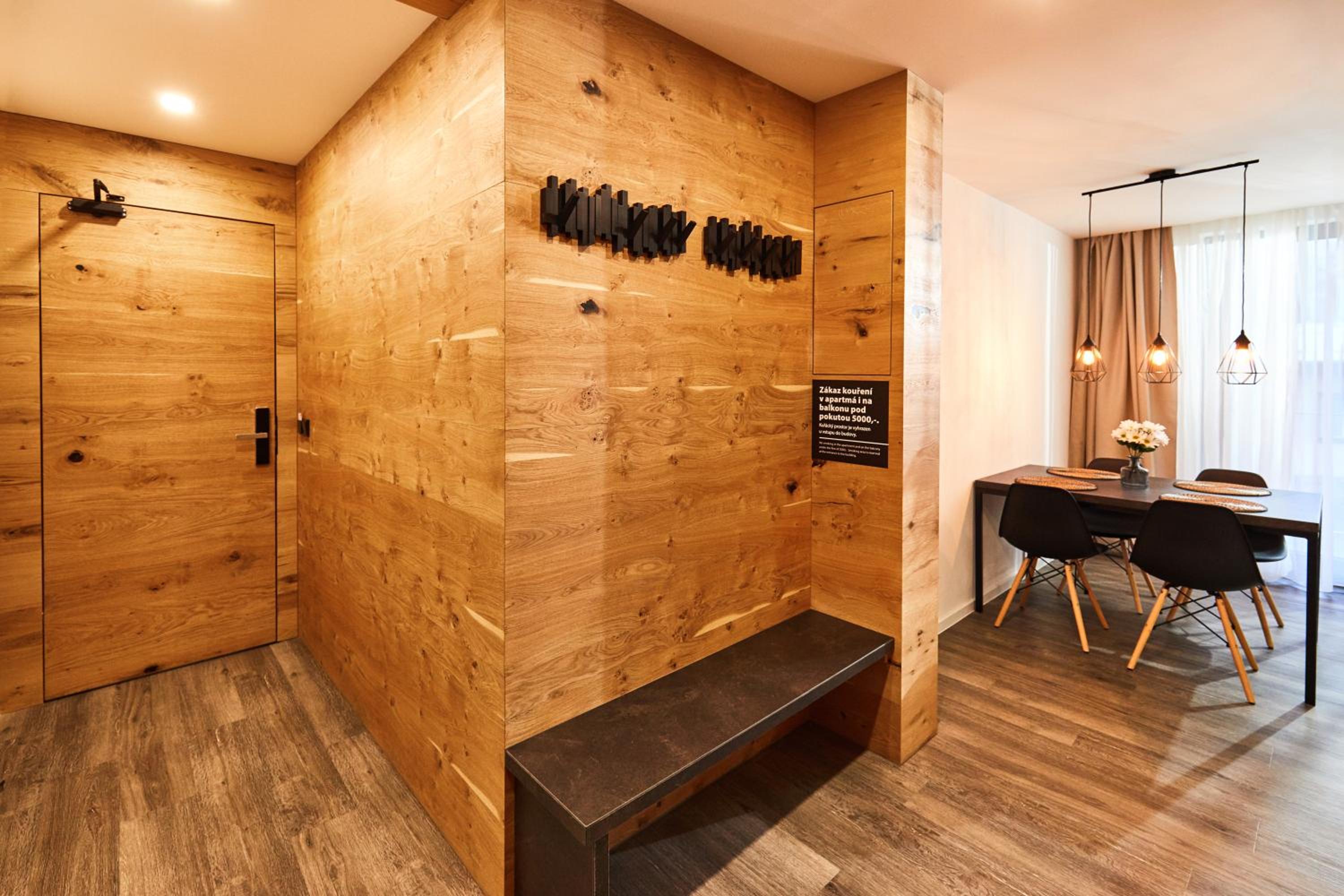Veľký apartmán postačujúci pre 4, čistý a dobre usporiadaný, recepčná nám poradila reštaurácie v okolí (Selský dvur v Dankoviciah bol super :), vyhovela nám s neskorším checkout-im