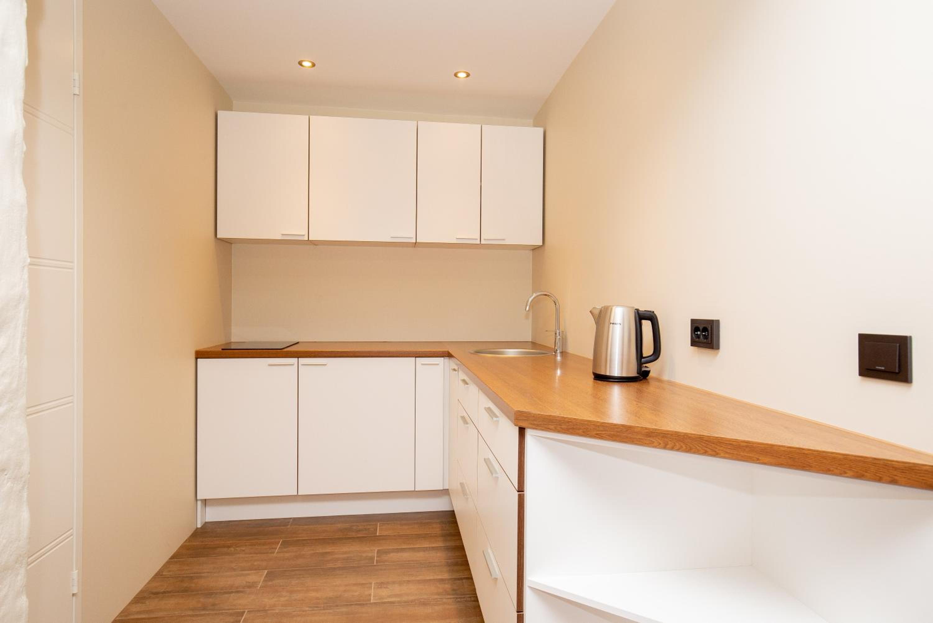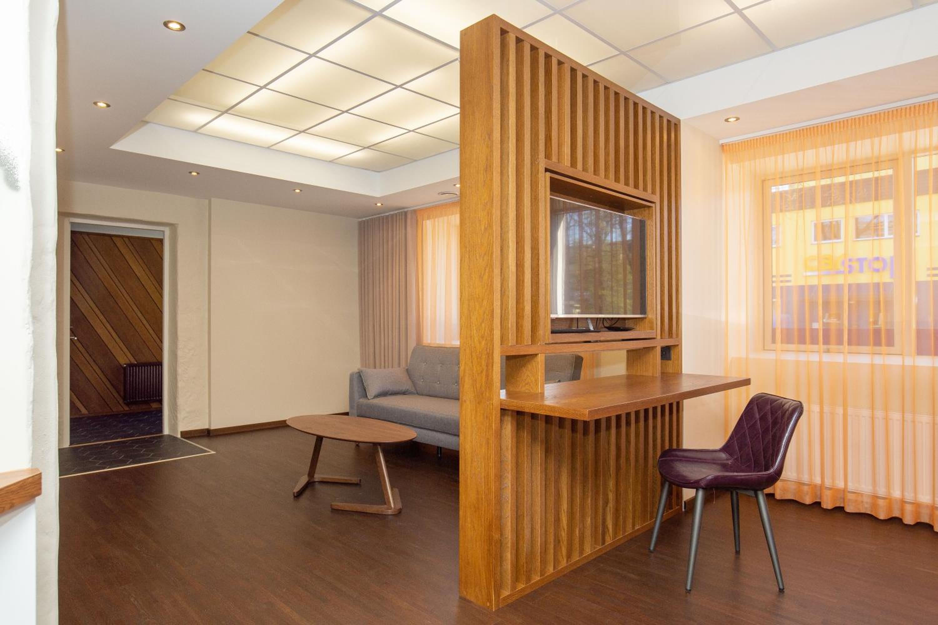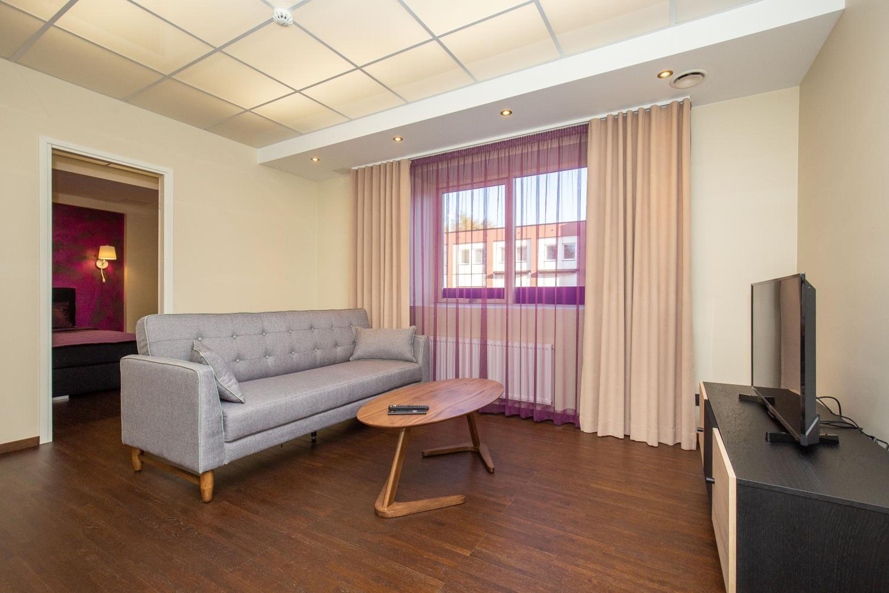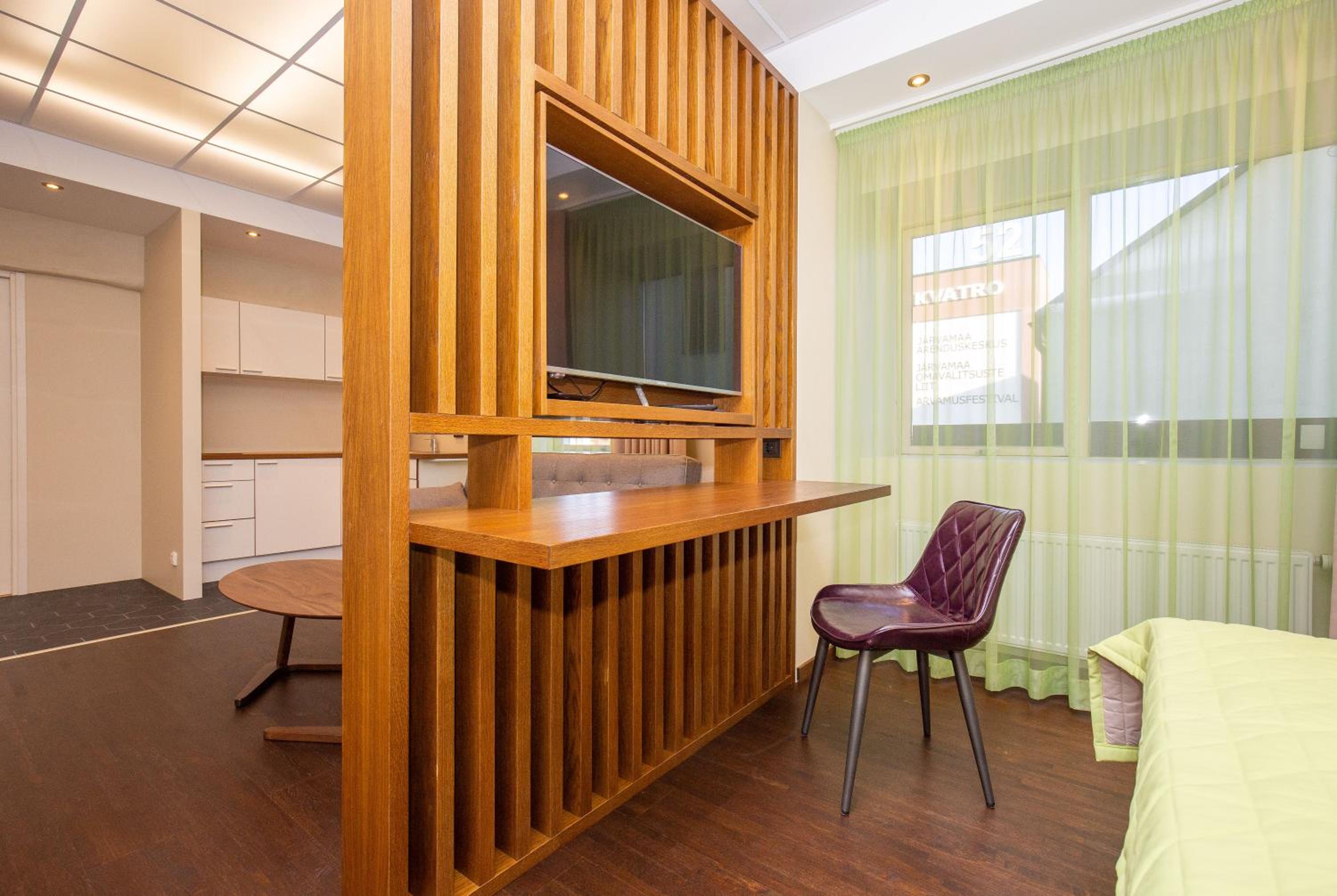 P54 Apartment in Paide offers elegant family rooms with parquet floors, fully equipped kitchens, and modern amenities like flat-screen TVs. Enjoy the convenience of a walk-in shower and complimentary slippers during your stay.