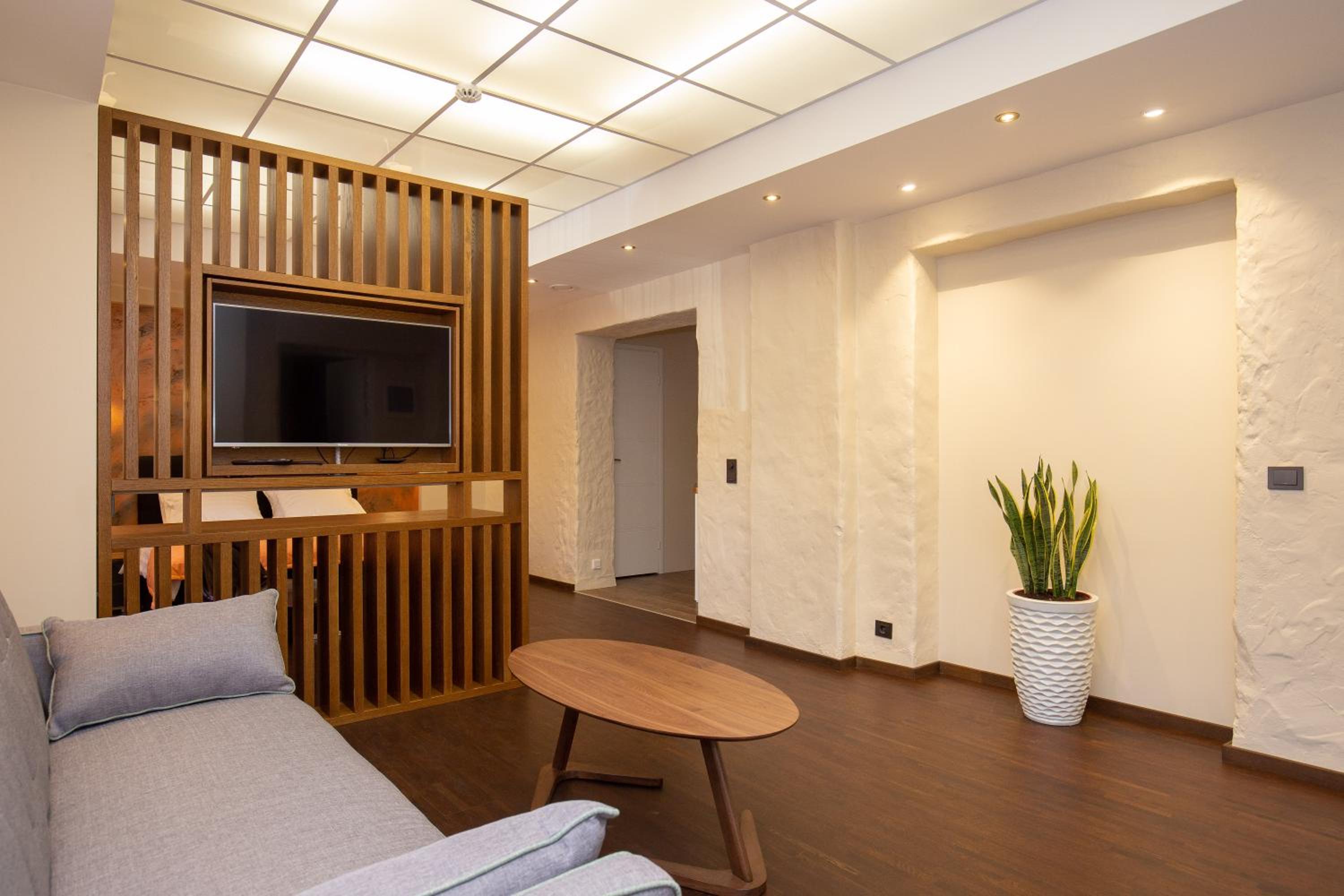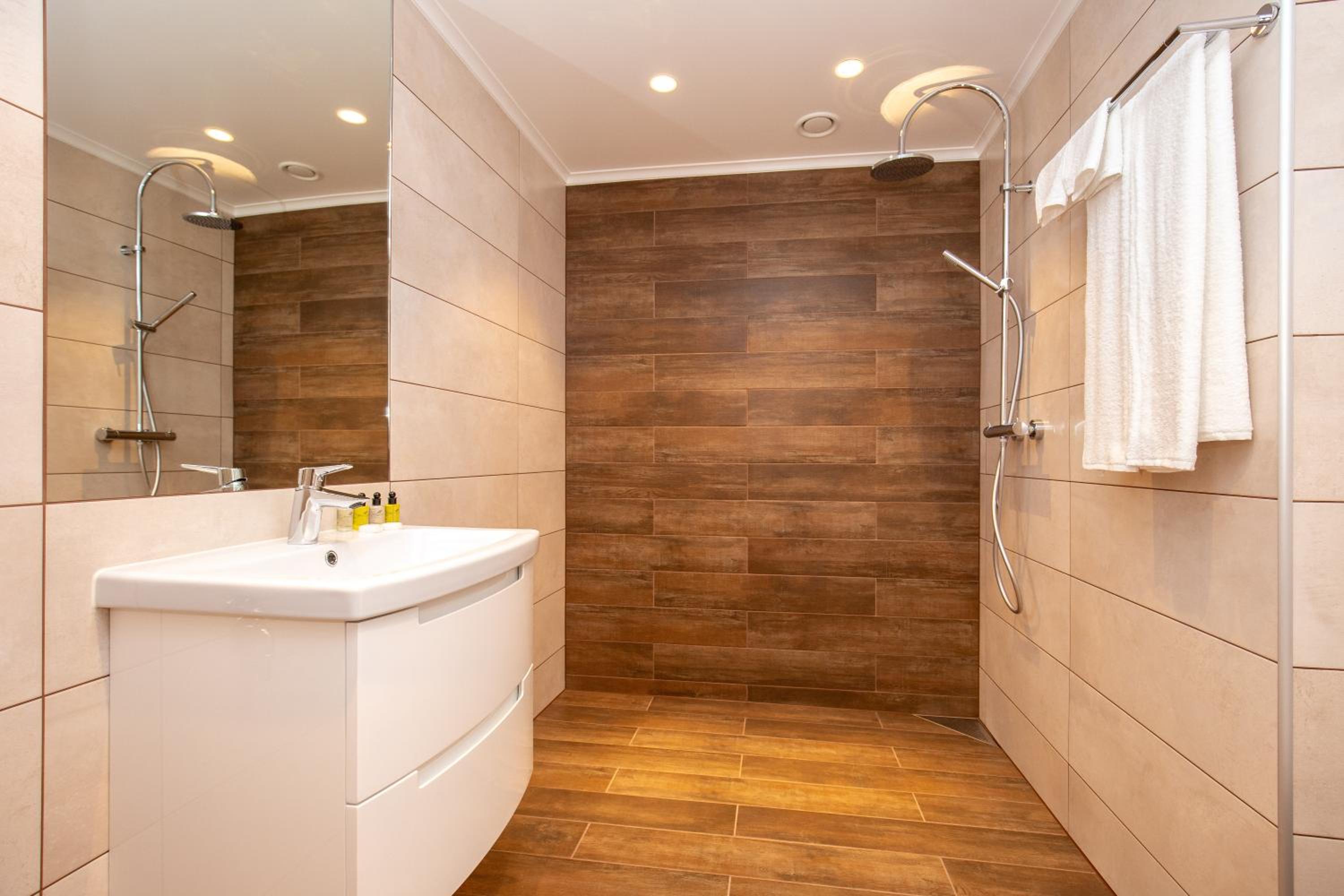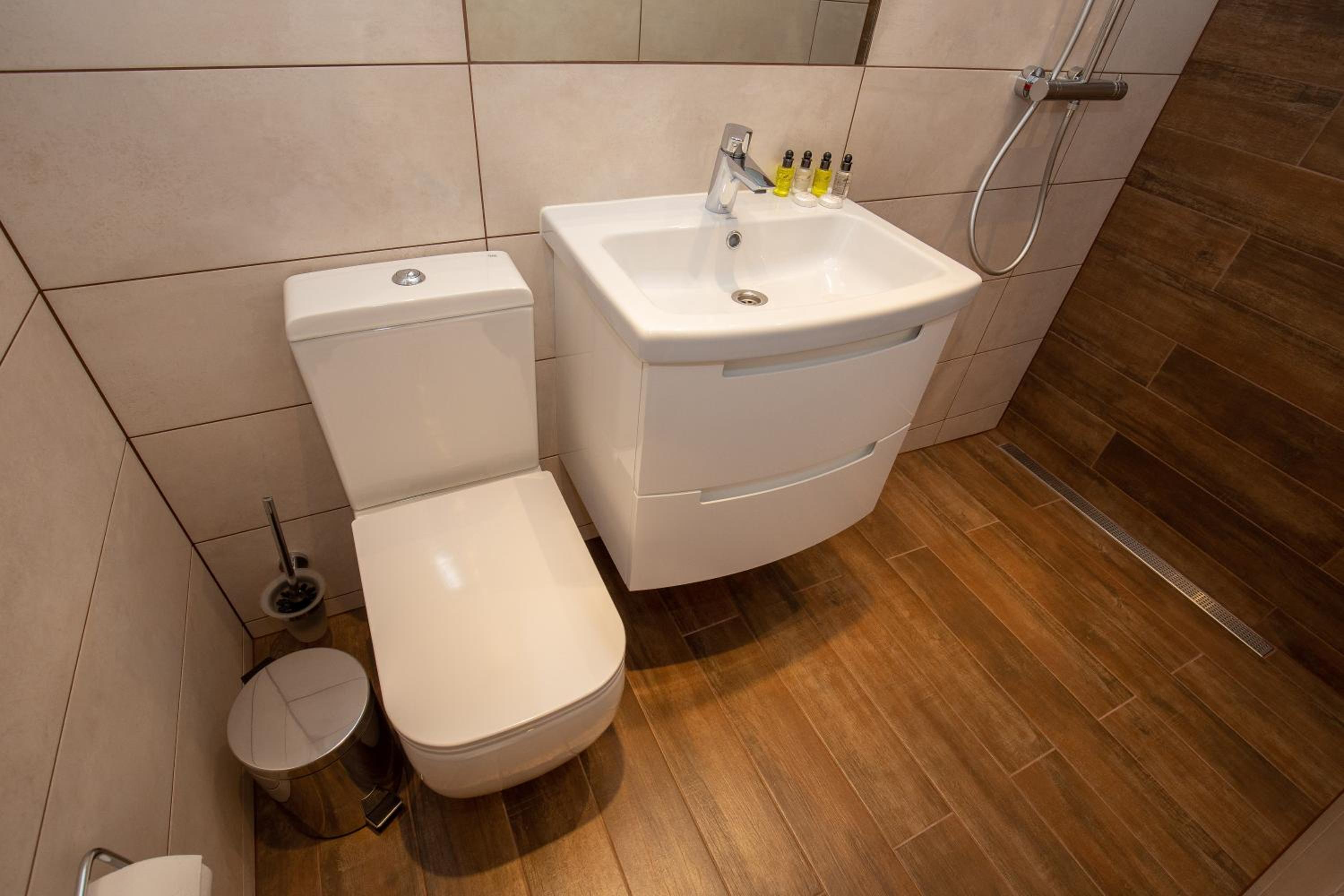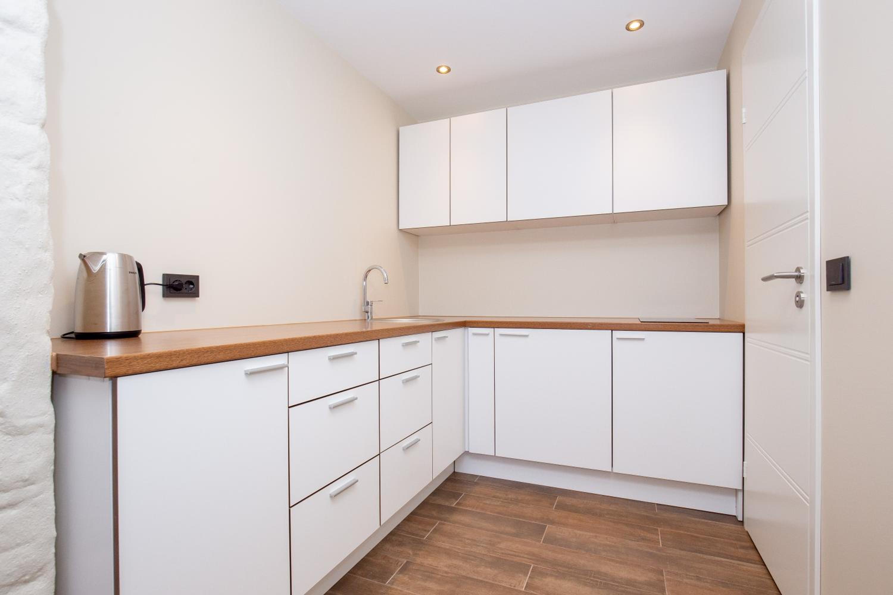 P54 Apartment in Paide offers elegant family rooms with parquet floors, fully equipped kitchens, and modern amenities like flat-screen TVs. Enjoy the convenience of a walk-in shower and complimentary slippers during your stay.