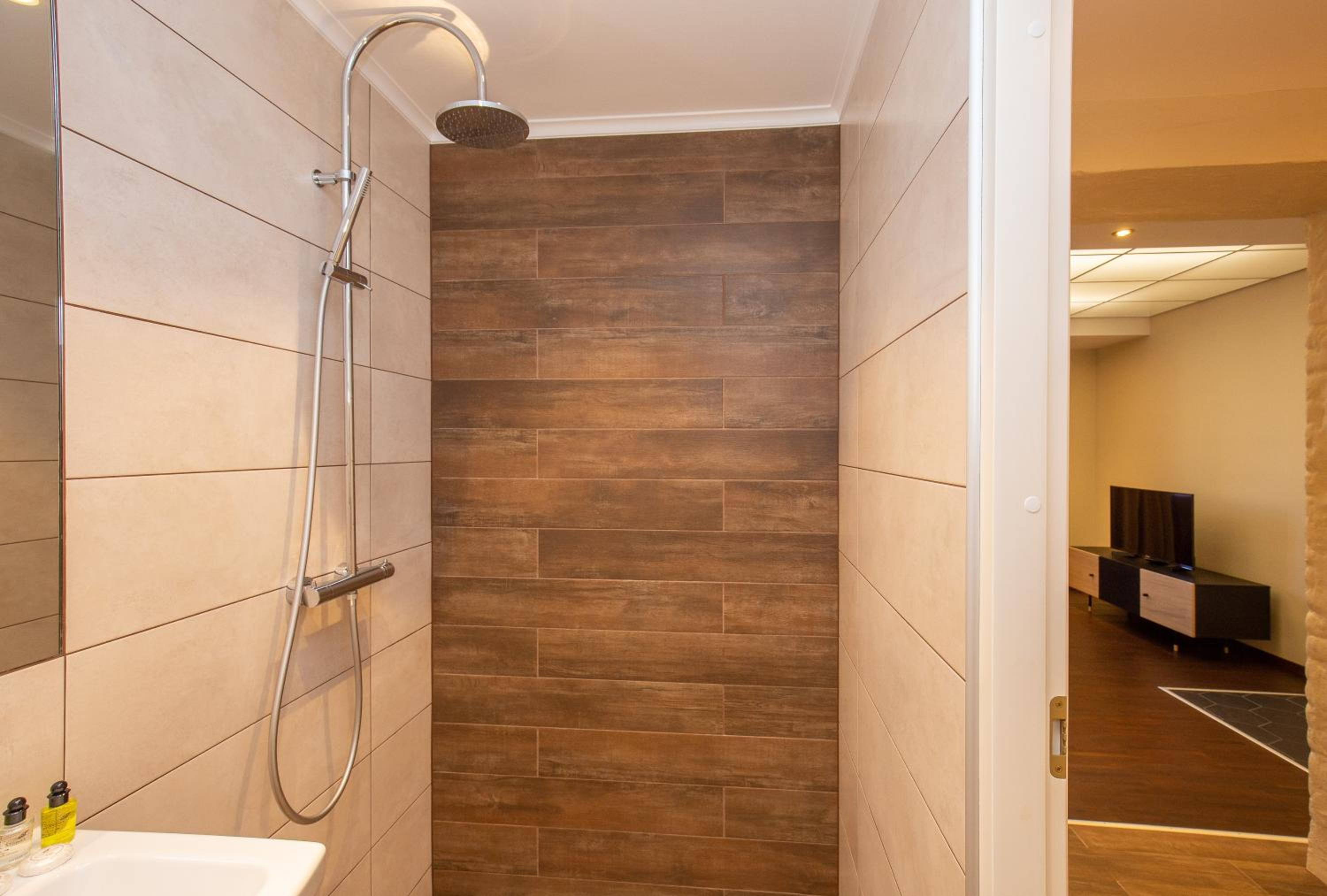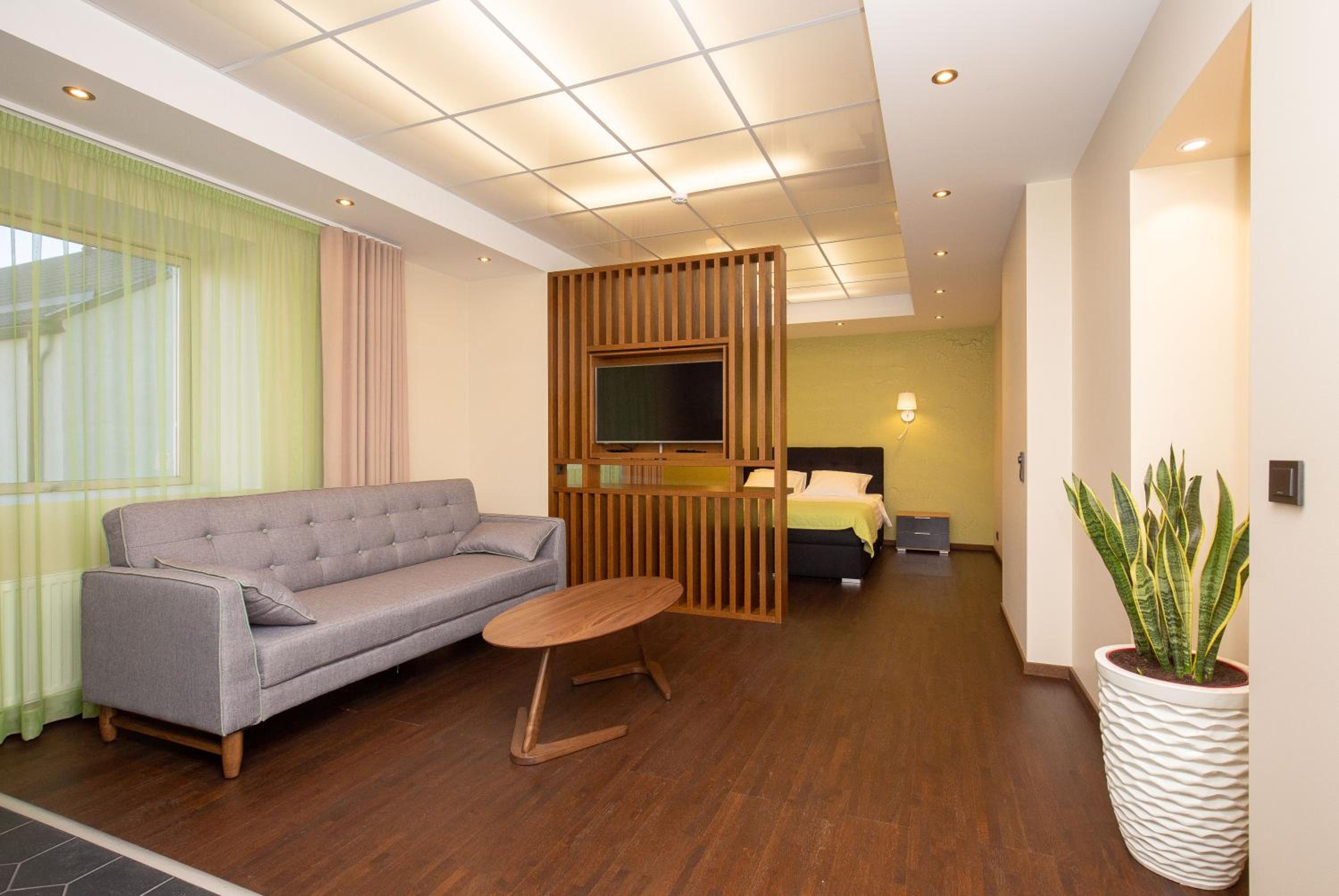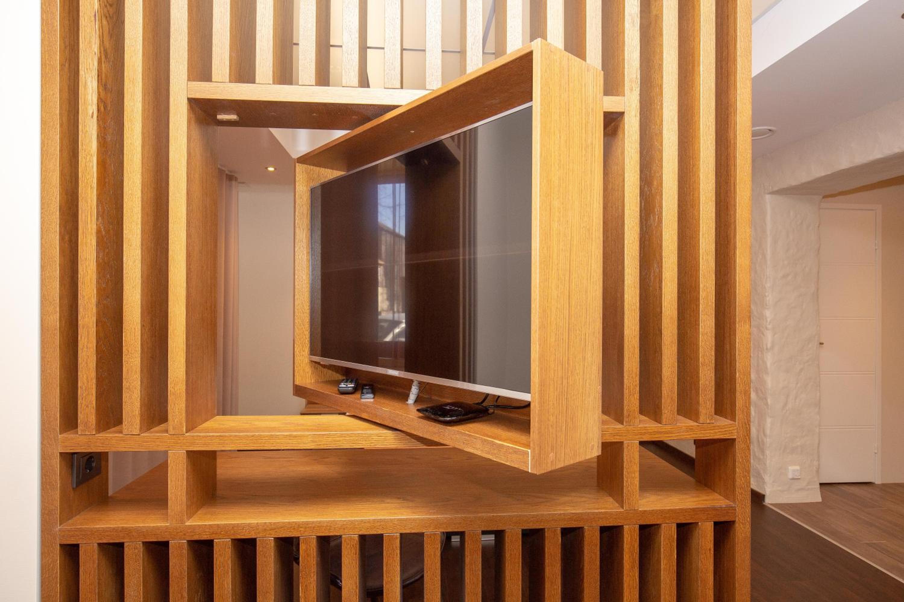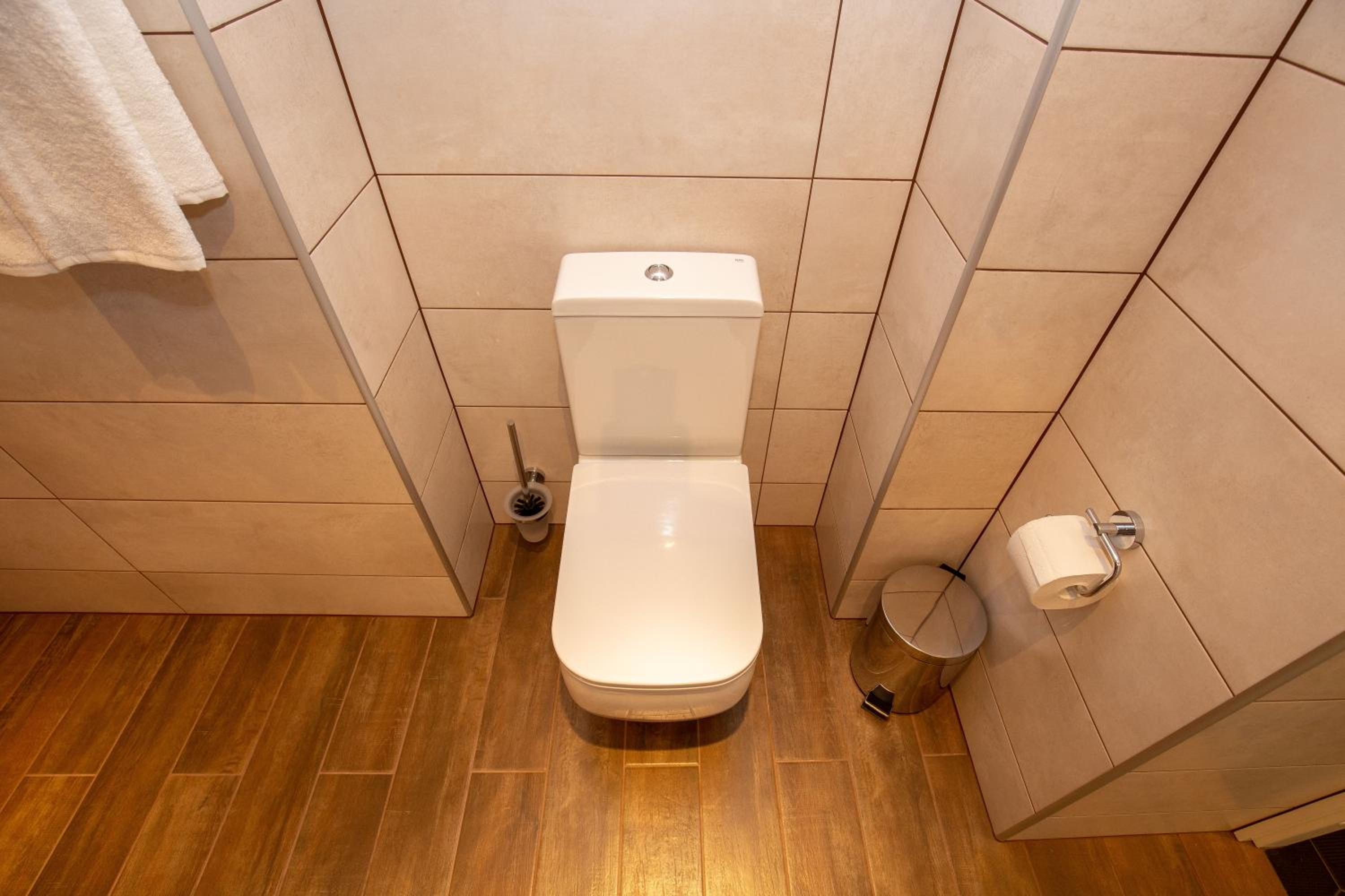 P54 Apartment in Paide offers elegant family rooms with parquet floors, fully equipped kitchens, and modern amenities like flat-screen TVs. Enjoy the convenience of a walk-in shower and complimentary slippers during your stay.