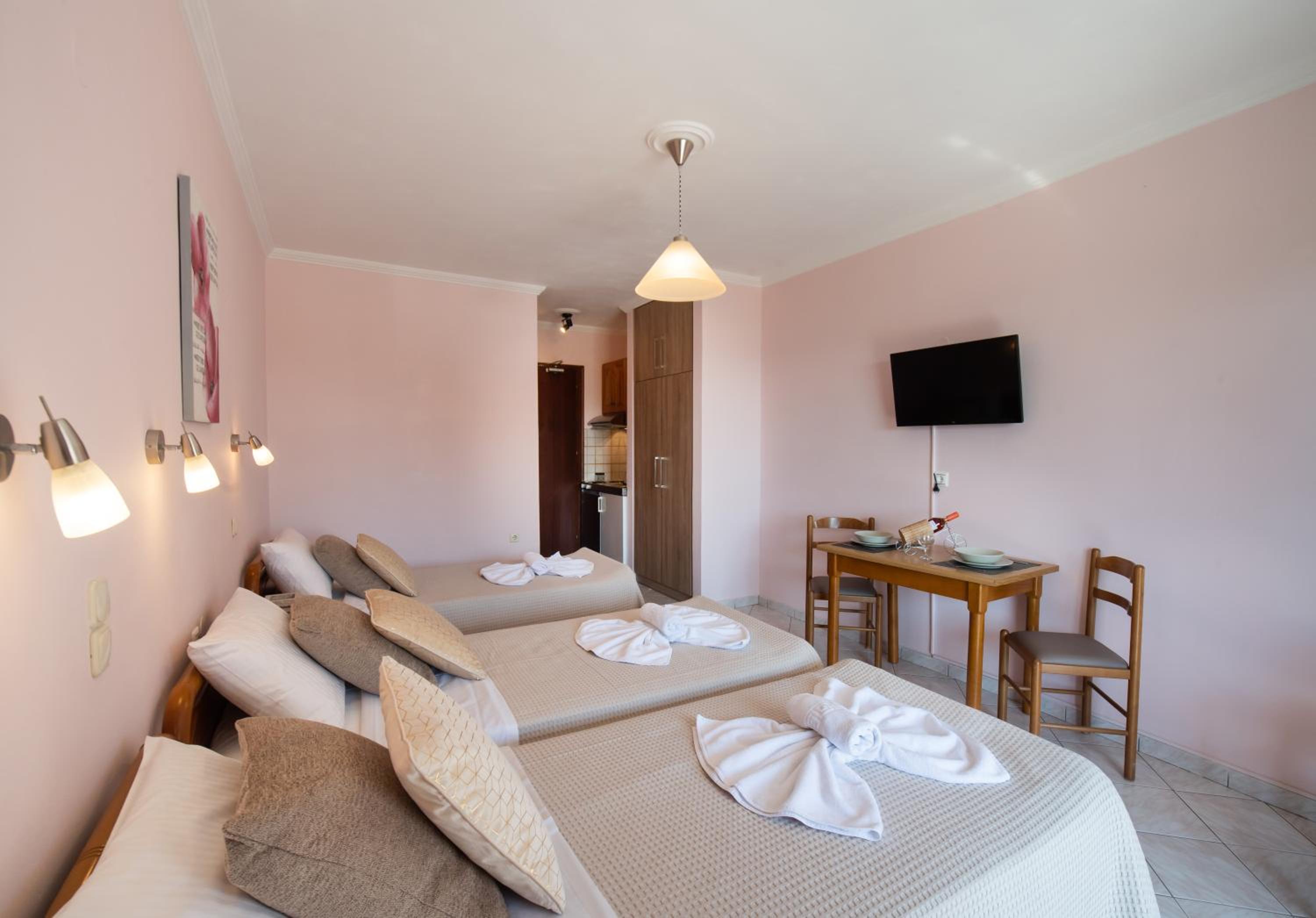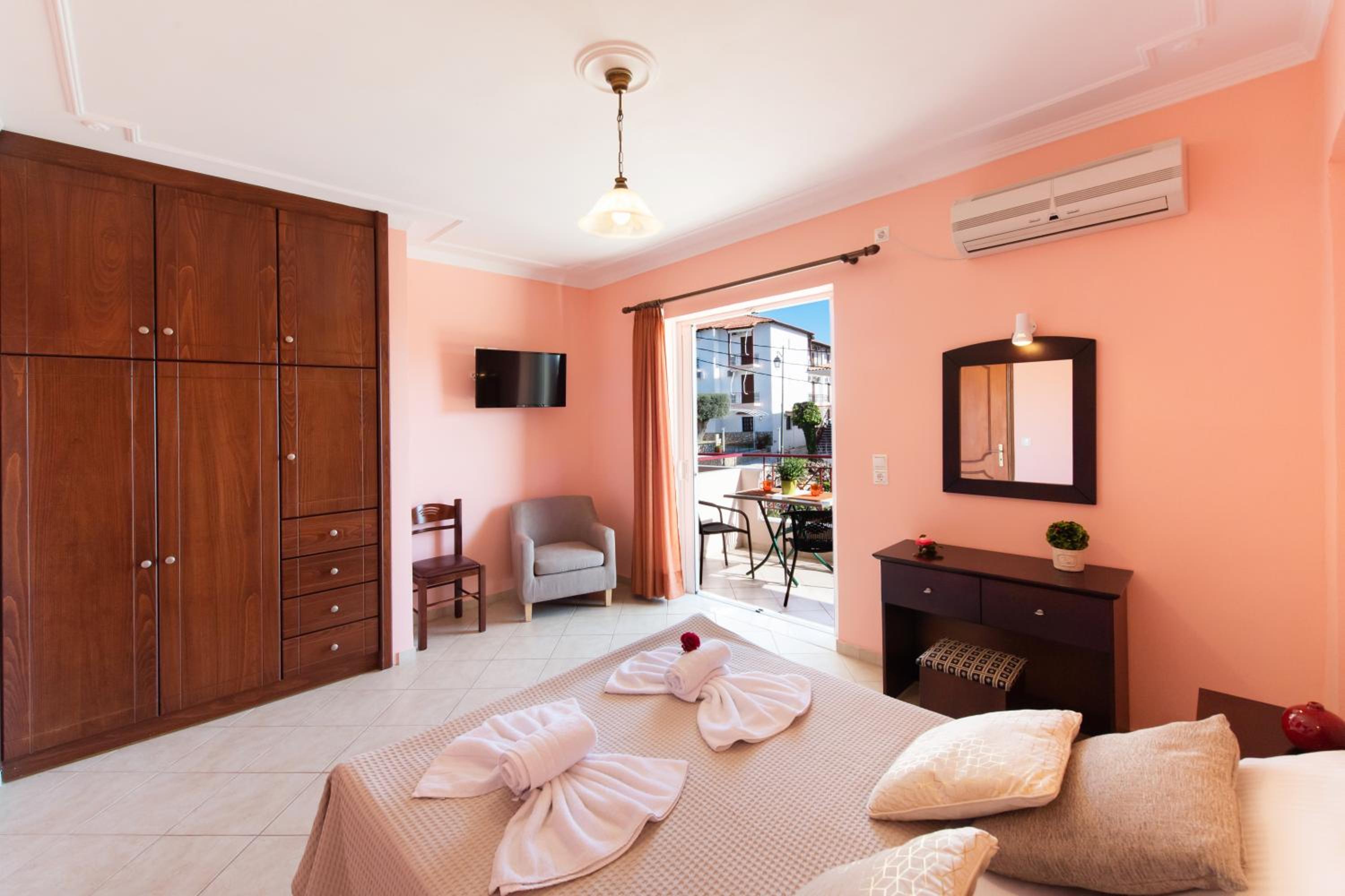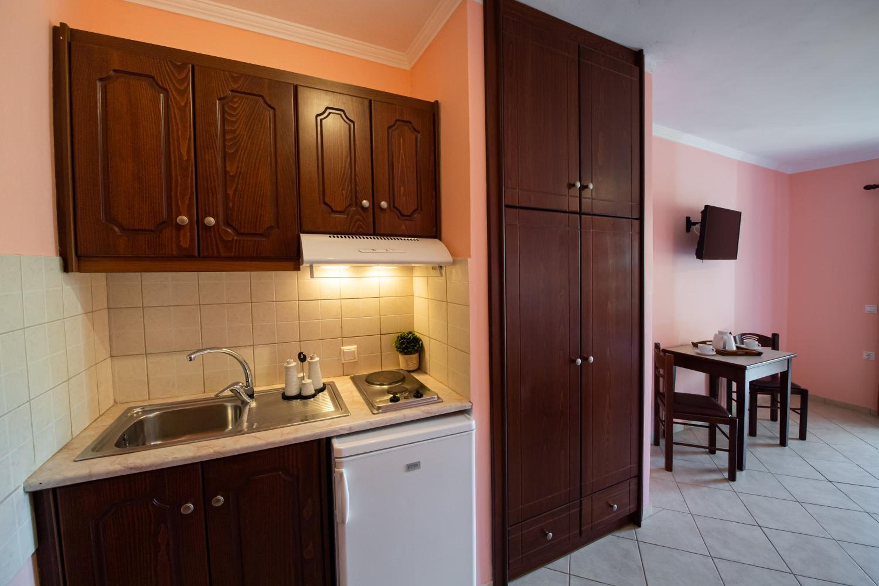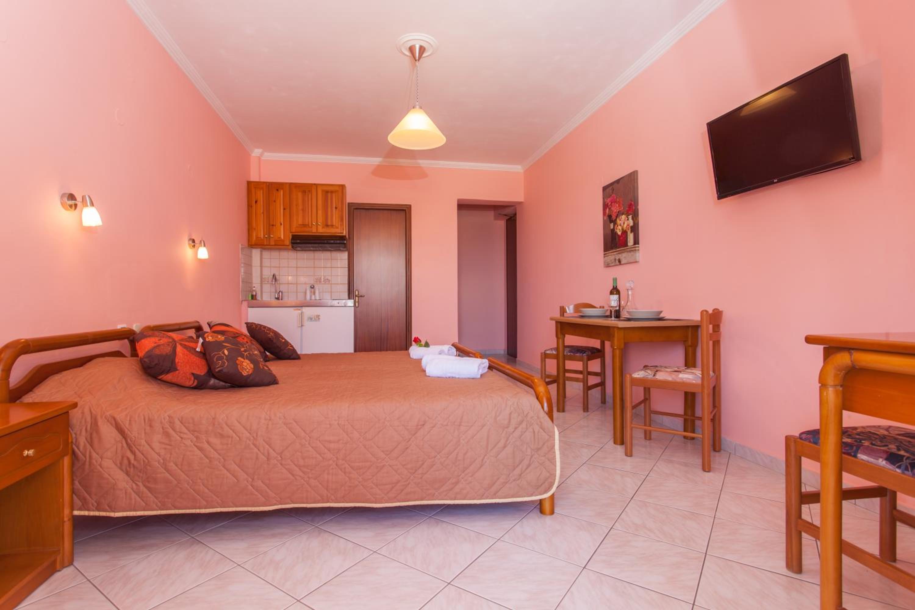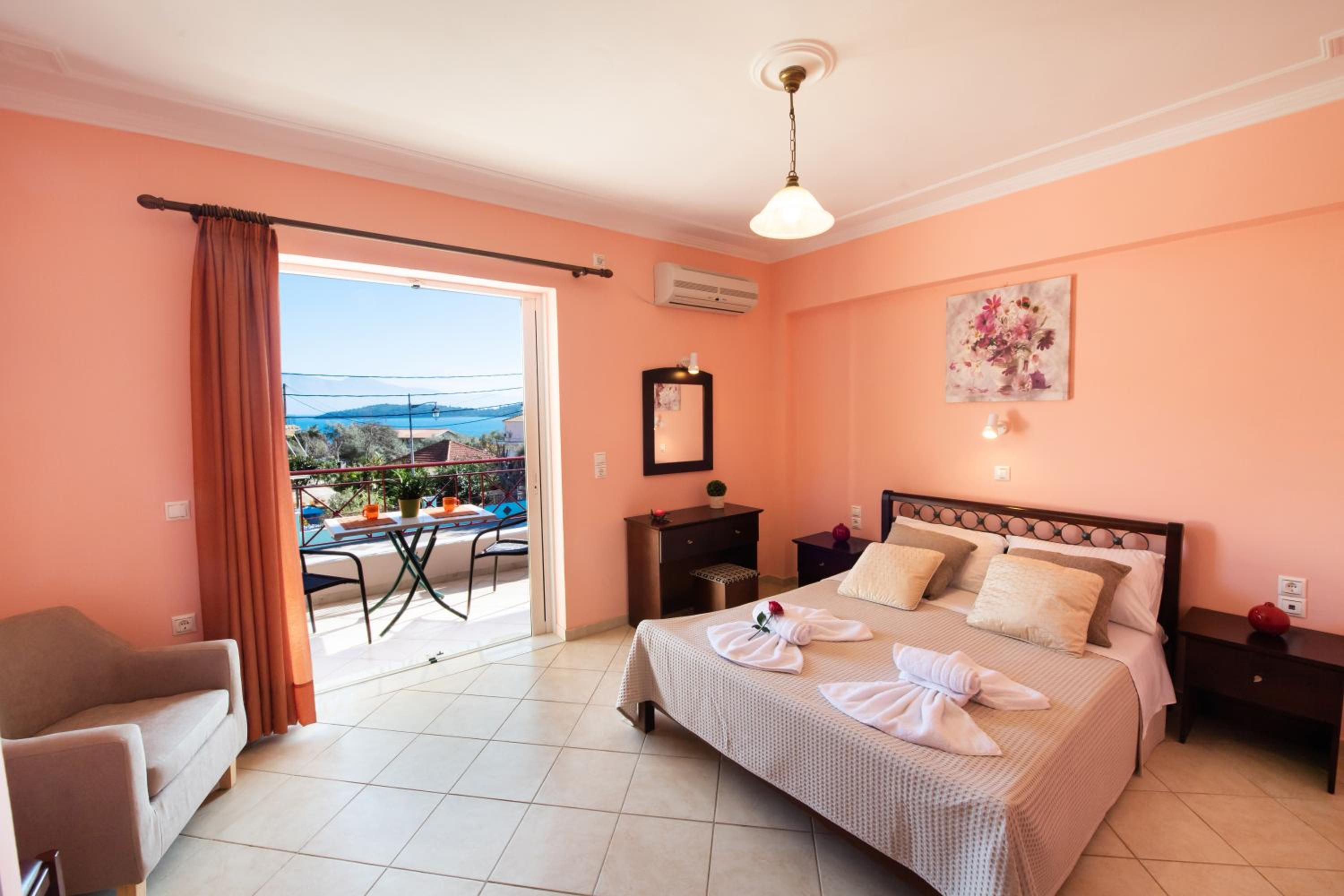 Experience comfort and style in the self-catering units at Sunrise Studios. Admire stunning Ionian Sea or pool views from your tastefully furnished studio featuring a kitchenette, air conditioning, and modern amenities like a TV and a safe.