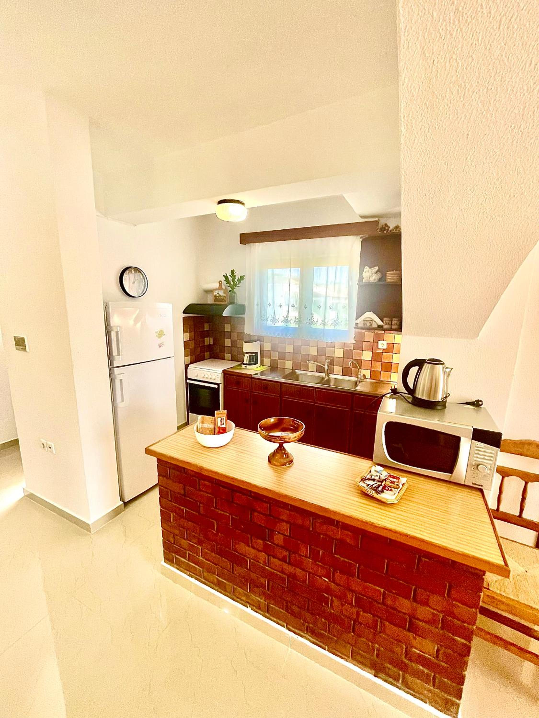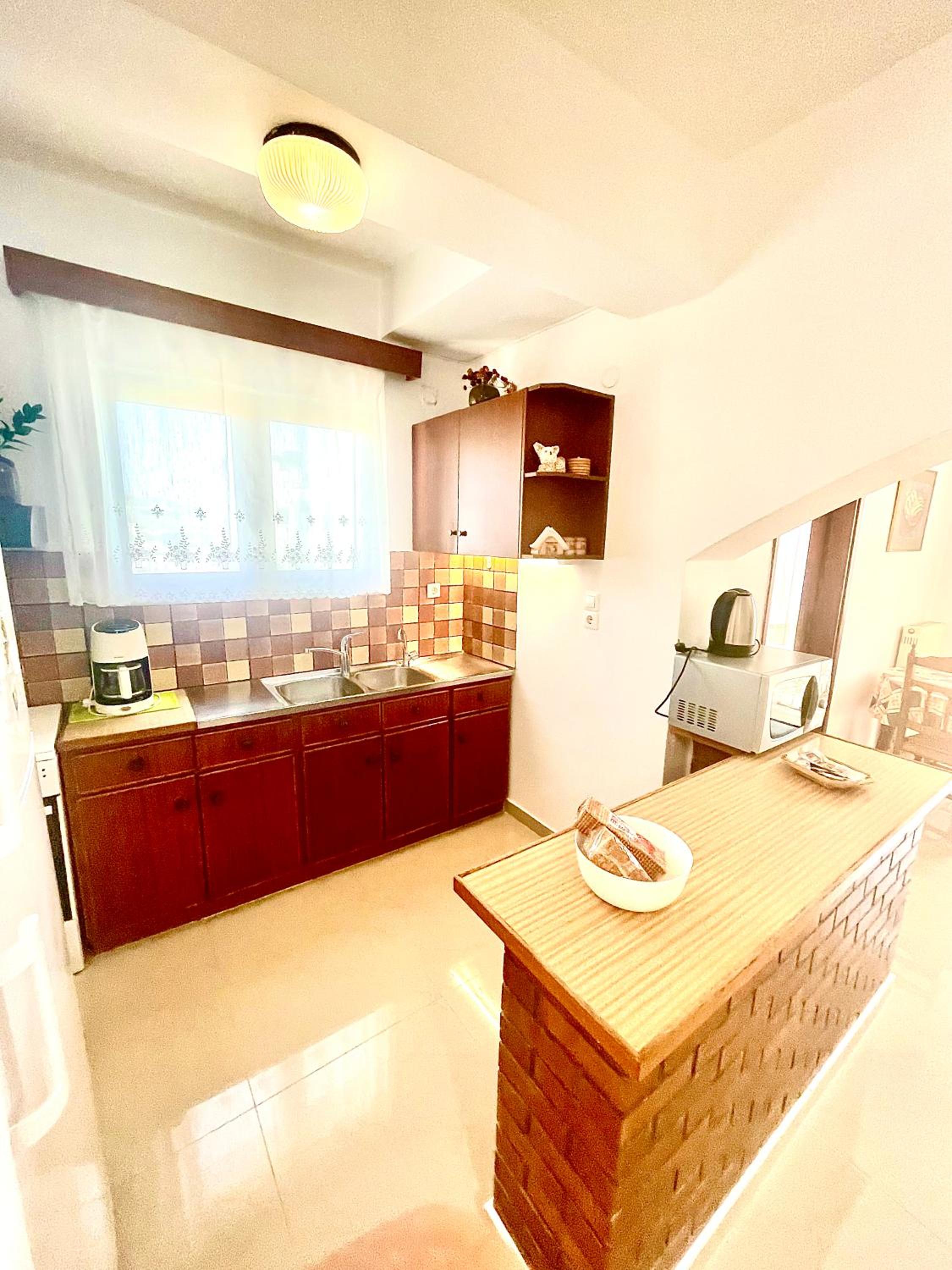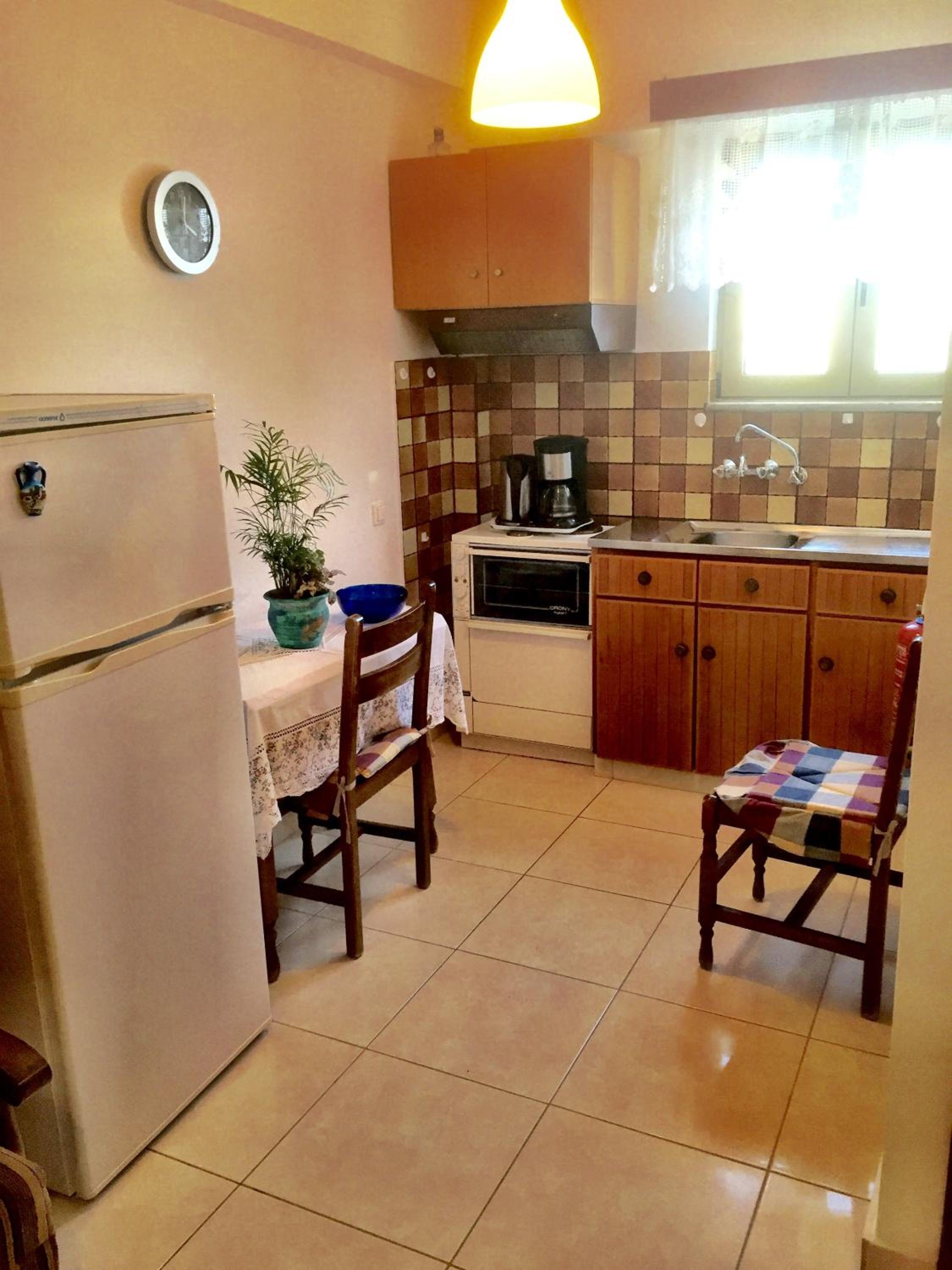 Keuken gedateerd, maar ruime keuze in keukenspullen. Coffee en theeapparaten aanwezig
