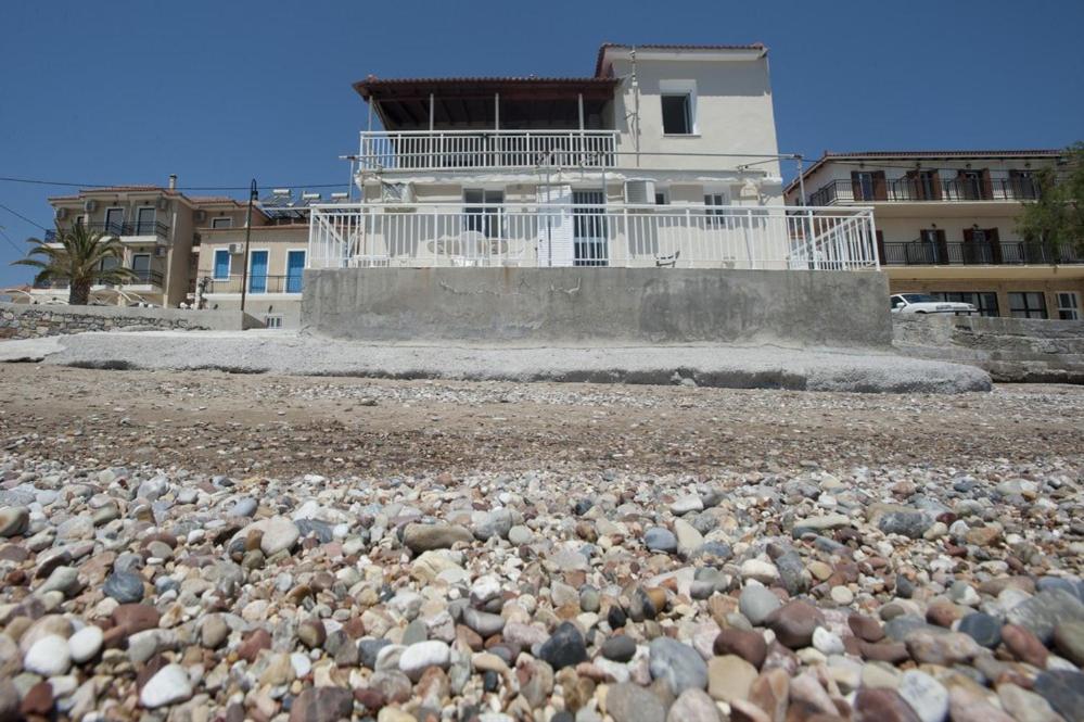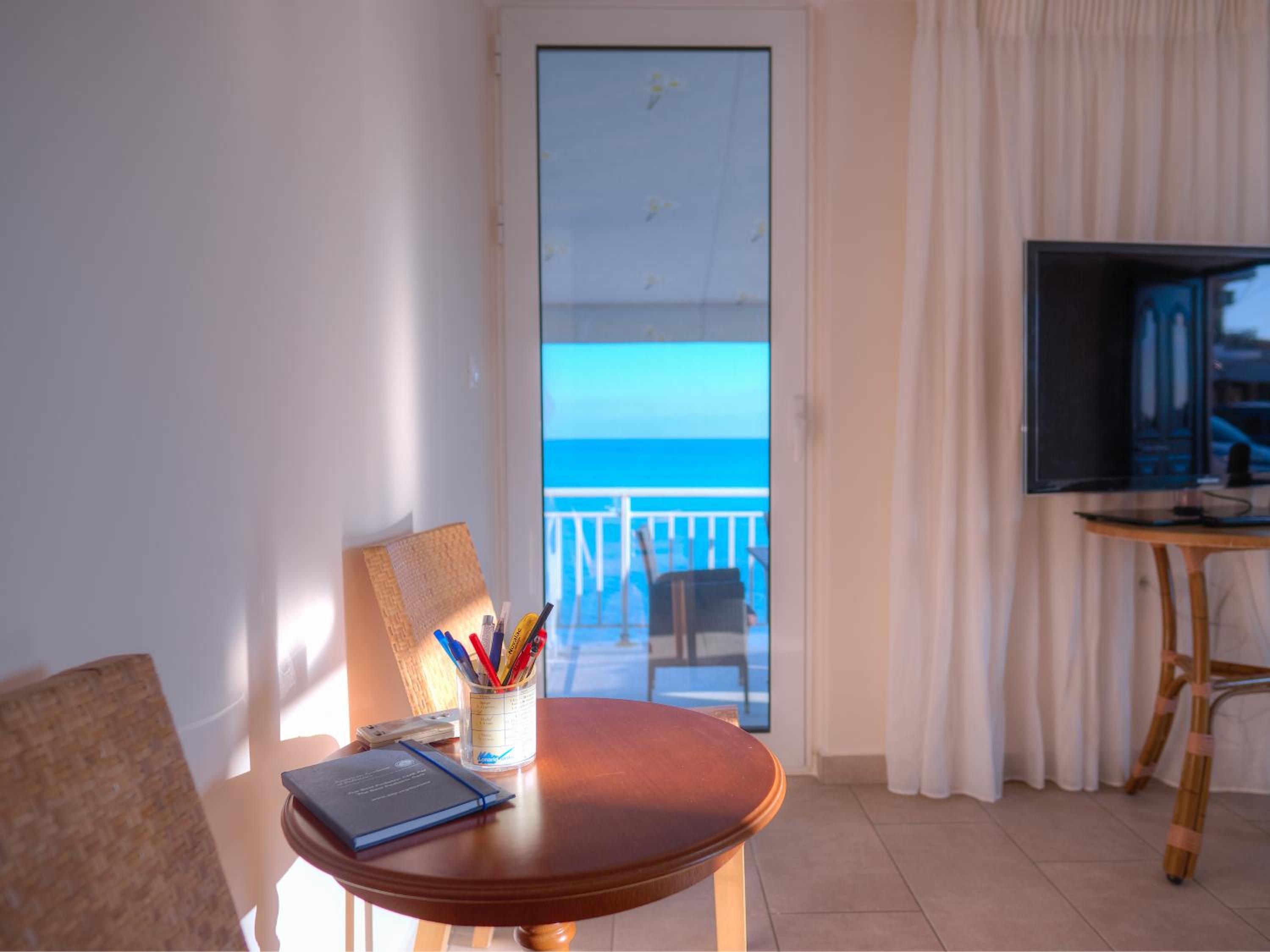 This place is literally on the beach at the end of the little town that is Finikounta. I stayed in a simple studio on the upper floor with kitchenette, and--the reason for being there--a large private, well-shaded porch with table and chairs and views to south (sea, islands, boats, Libya) and west (beach and town). It was easy to go downstairs to the beach, swim, then return to the porch; repeat. Lots of snack places along the beach/strip, and nice waterfront restaurants for dinner within five minutes. For luxurious appointments, go to a resort. No frills, but clean and well maintained, and the location can't be beat. Easy and friendly check-in and check out.