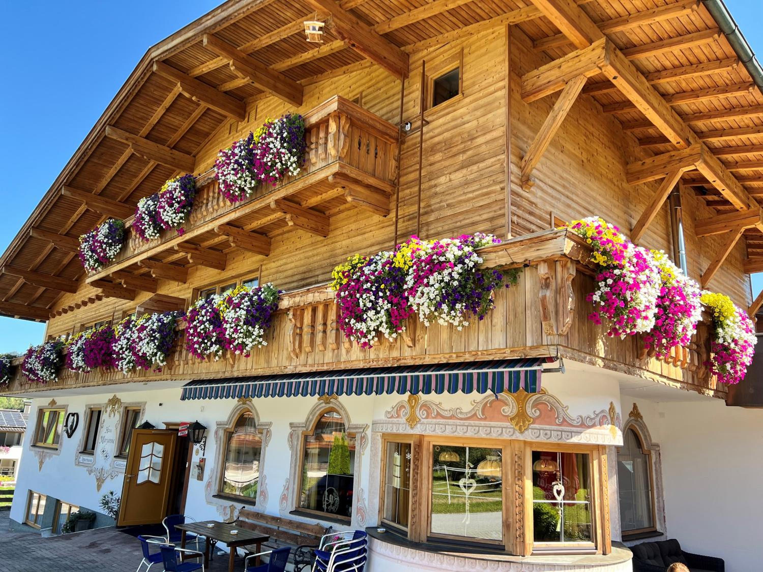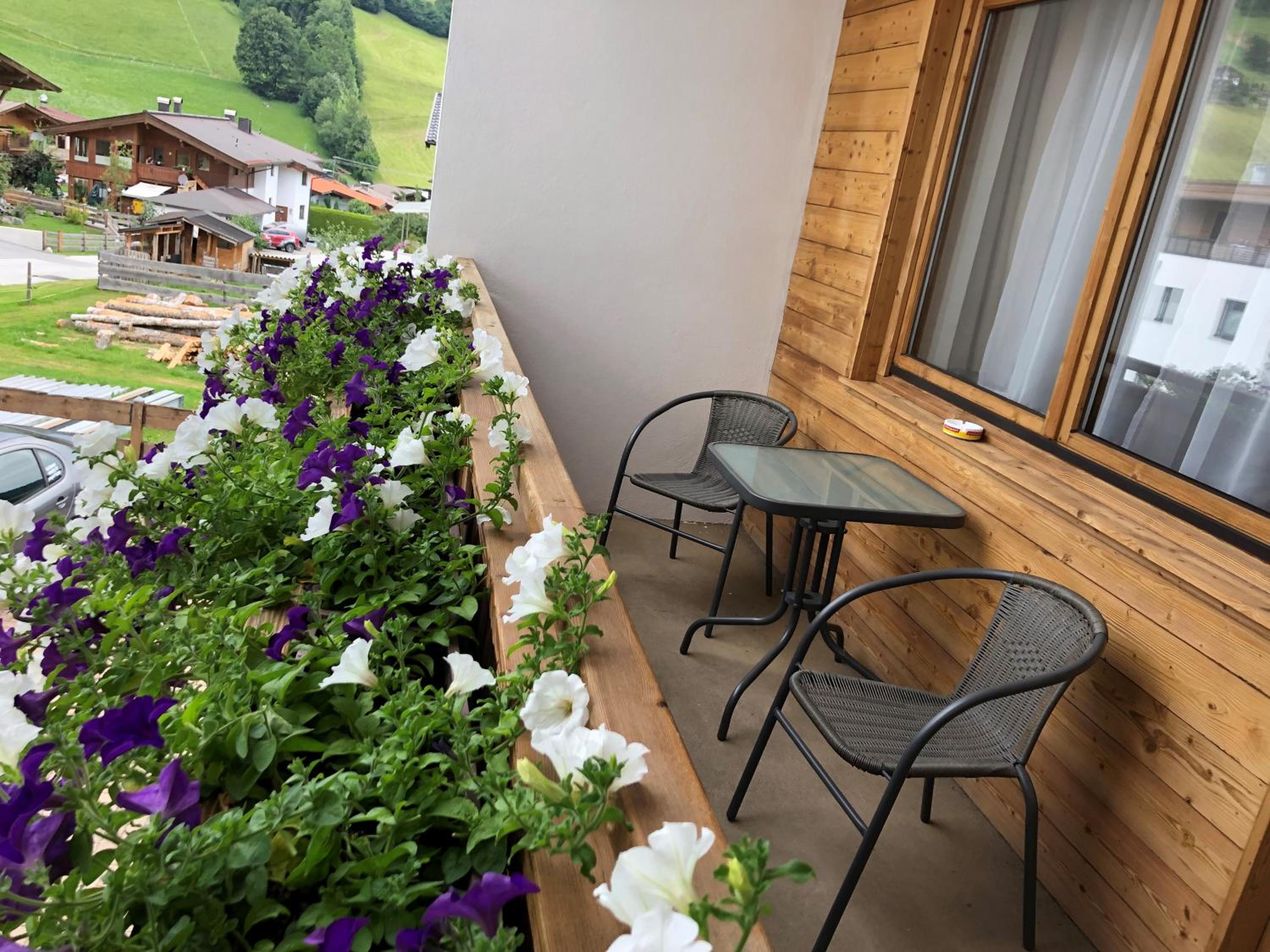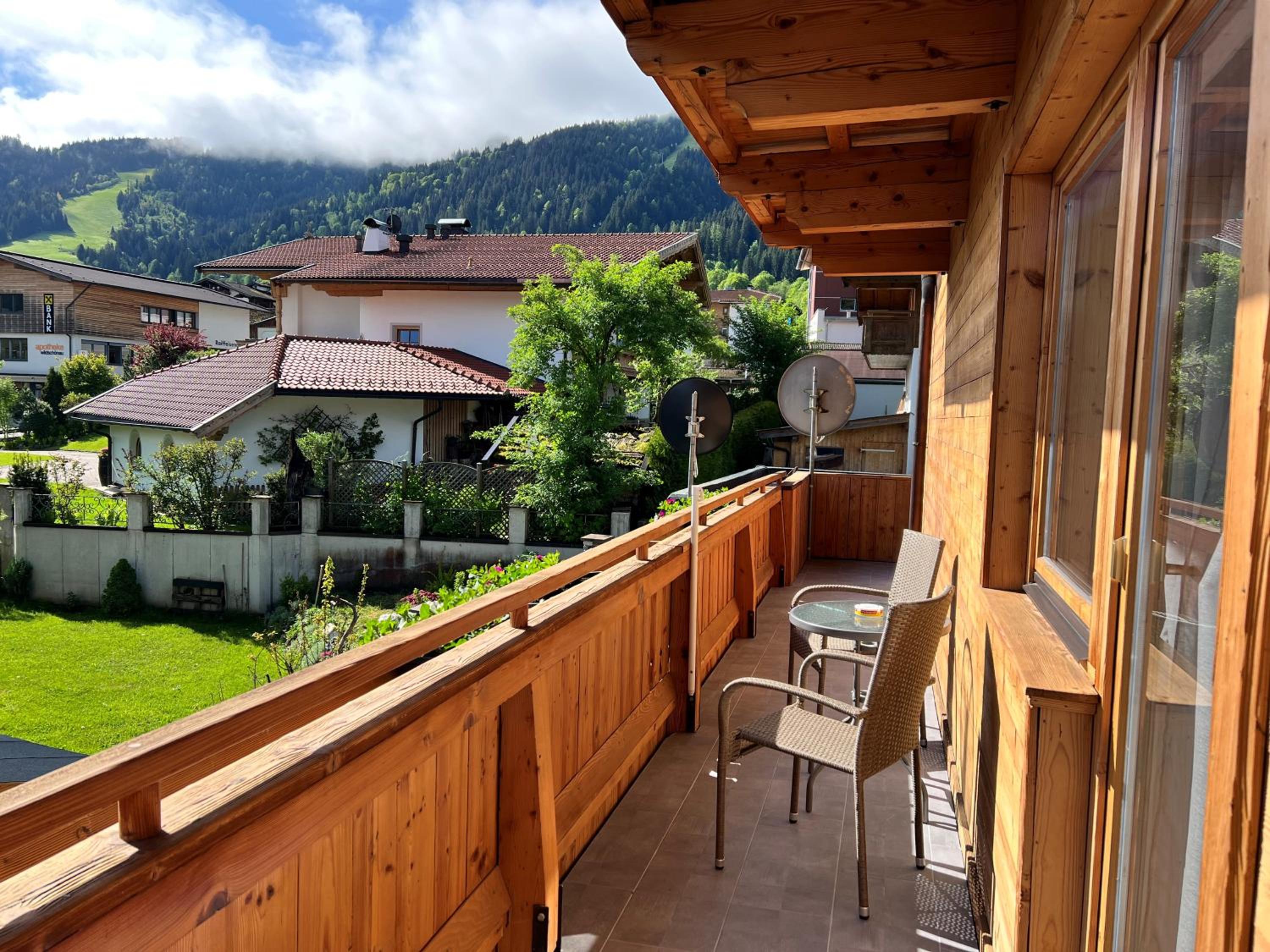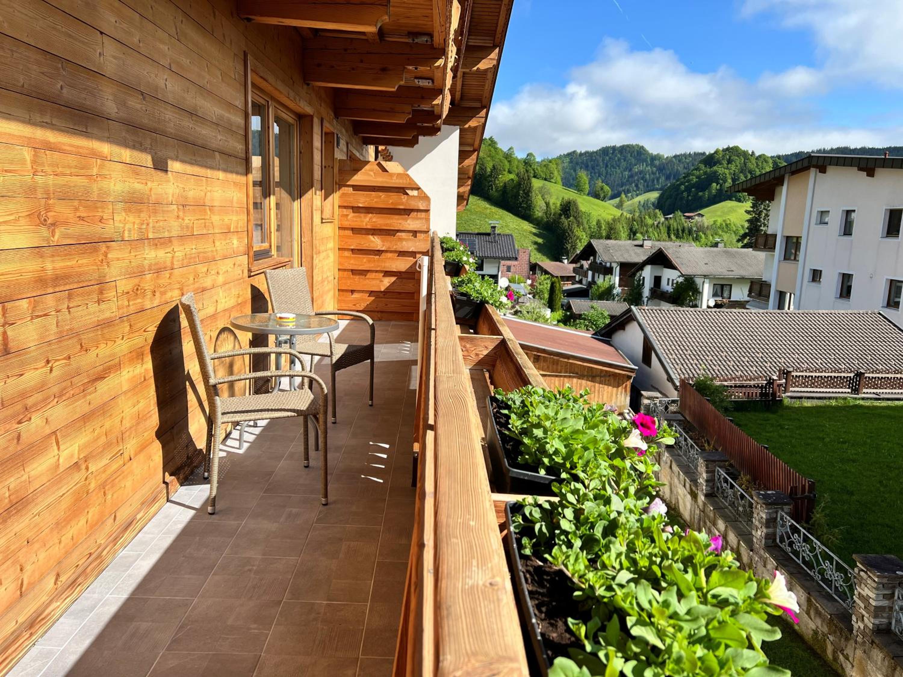 Enjoy stunning mountain and city views from our sun terrace at Haus Marjanne in Niederau. Relax in the peaceful surroundings and soak in the beauty of the landscape.