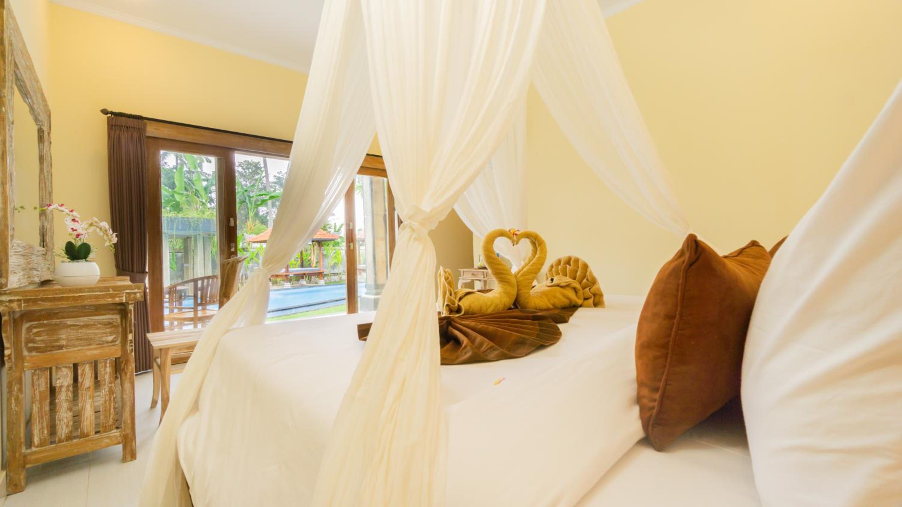 Ruime kamer met een grote badkamer met regendouche. Mooi zwembad en we hebben een heerlijke Balinese massage gehad van Putu. Rustig gelegen en wat verder weg van de openbare weg. Wat voor ons prima was.