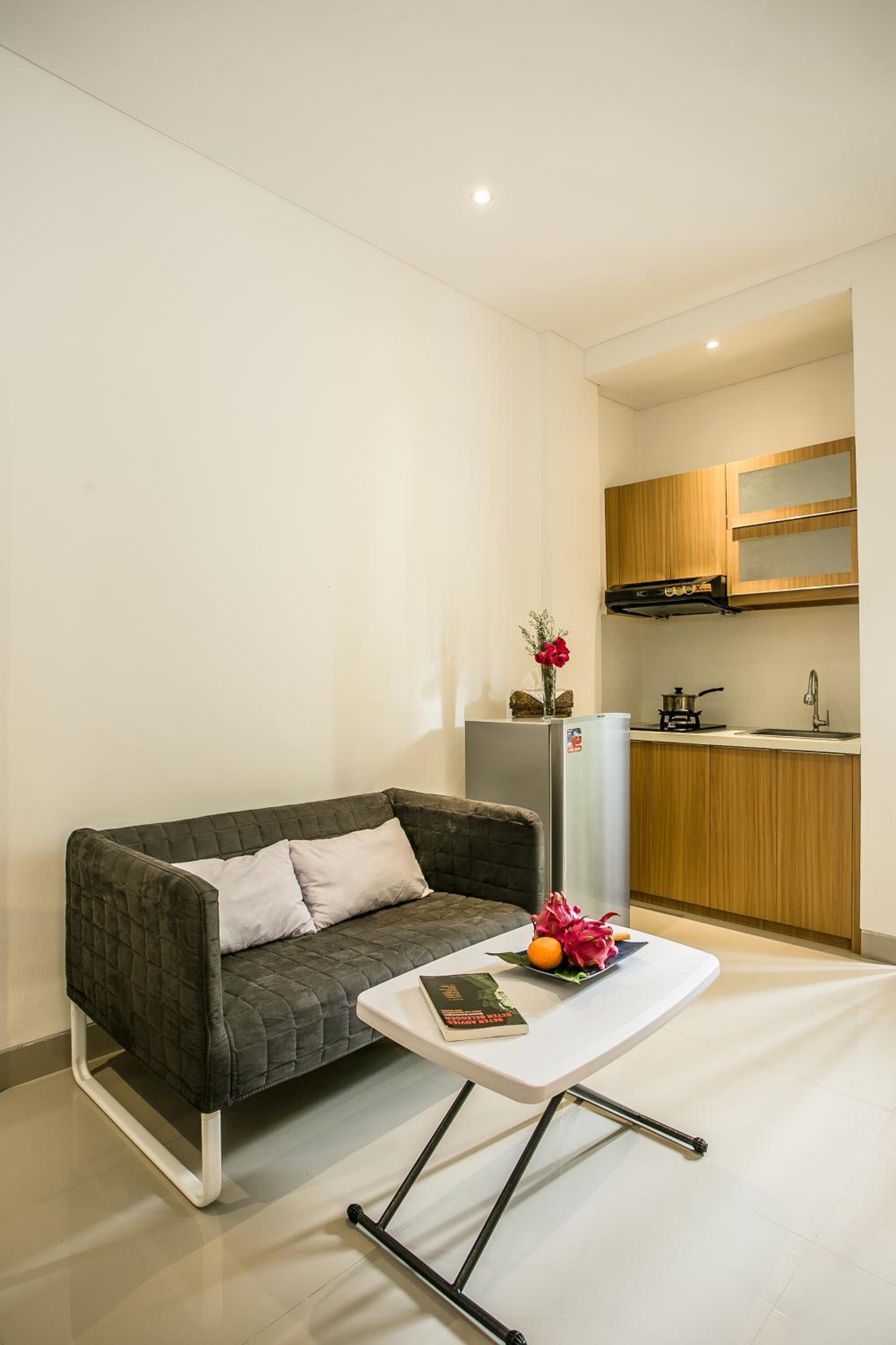Dev Bali Apartement in Kerobokan offers air-conditioned 1-bedroom units with balconies, perfect for enjoying the tropical breeze. The modern kitchenette, flat-screen TV, and cozy seating area provide all the comforts of home.