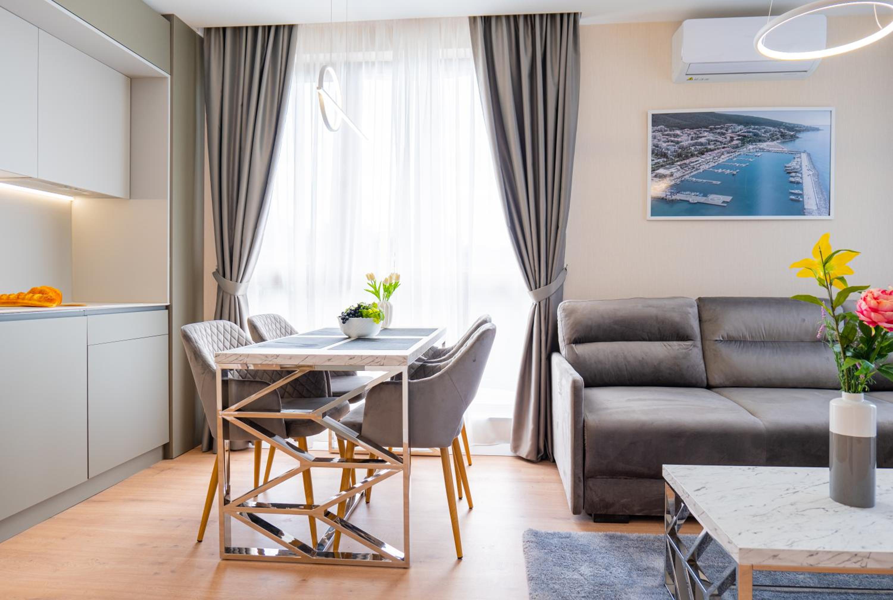 Harmony Suites Grand Resort in Sunny Beach offers air-conditioned units with modern amenities like fully equipped kitchenettes and flat-screen TVs. The parquet floors and balconies provide a touch of elegance to your stay.