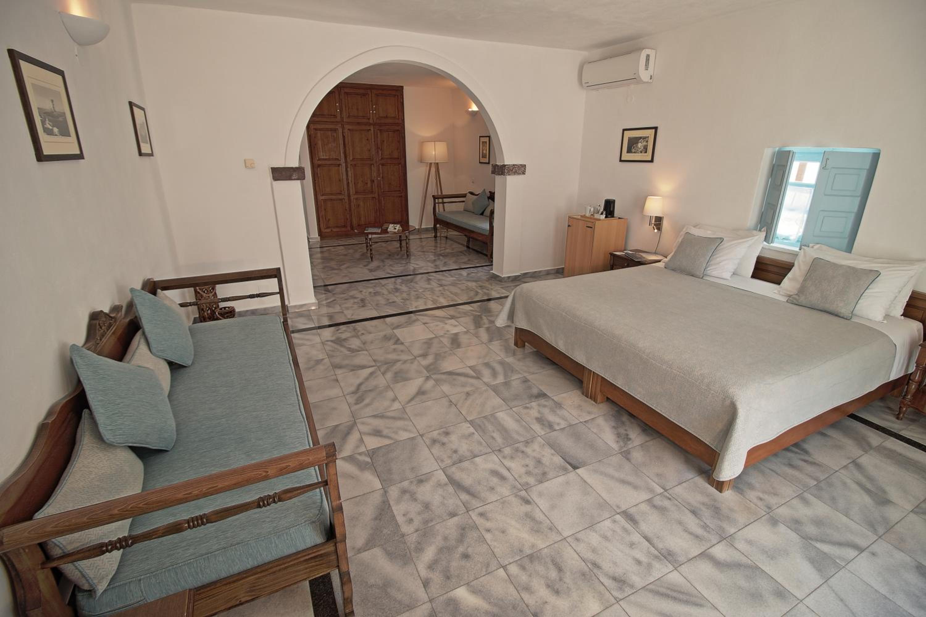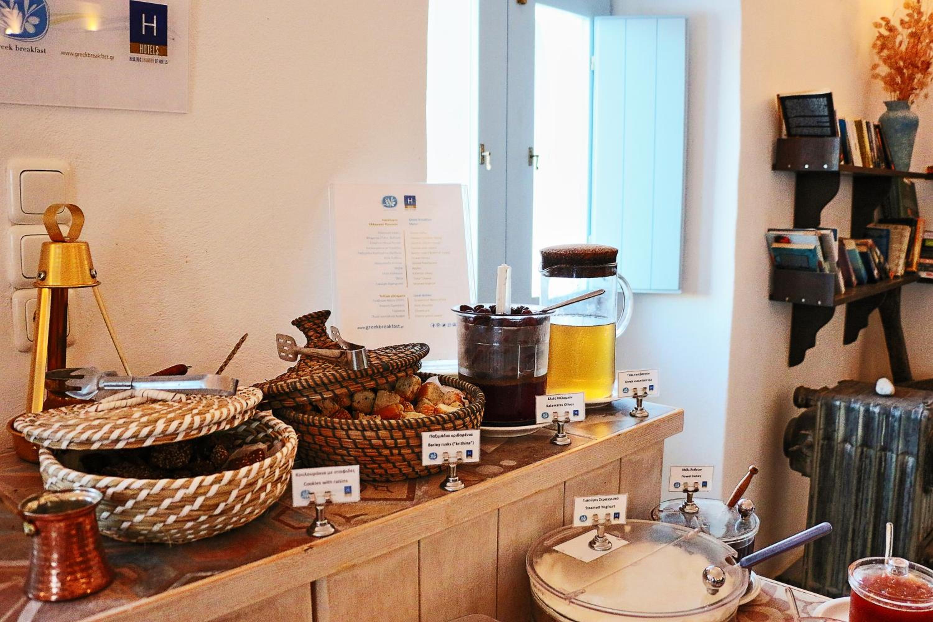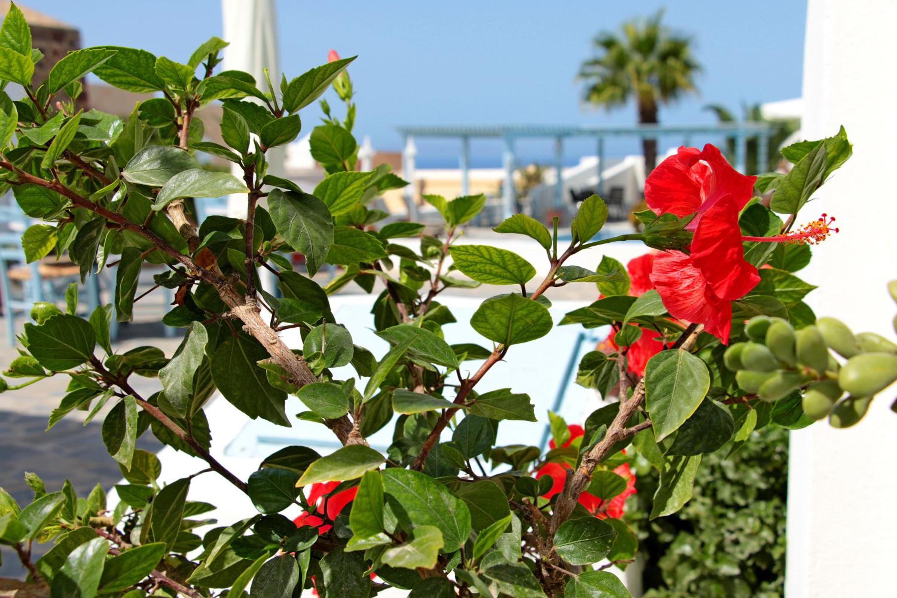 It was lovely and quiet but not far from shops, restaurants and stunning views. Our room was very pretty and spacious with a view of the pool and our own balcony. Great that a guy took our luggage both ways as it was quite a walk over cobblestones. Foni was very helpful. She organised transfers for us and booked restaurants. The cocktails and sunset views from up on the terrace were fabulous!