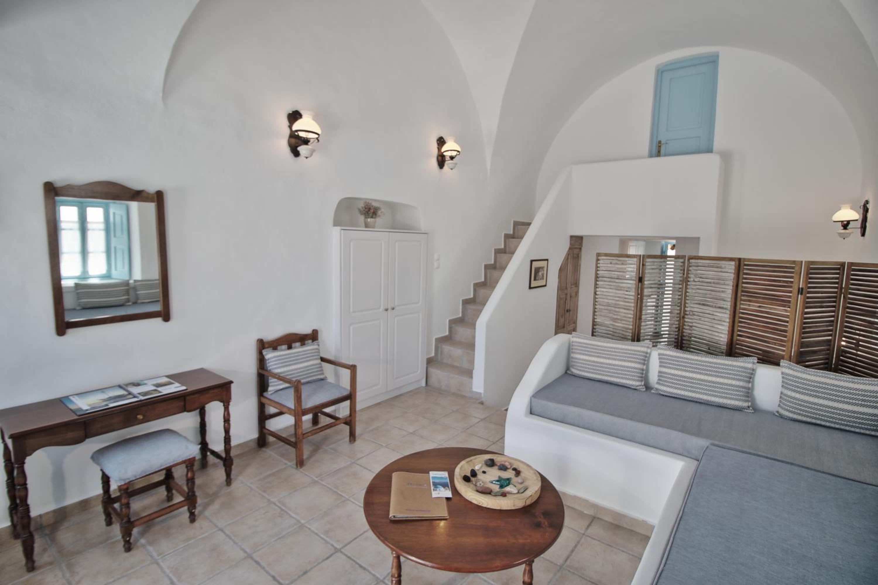 Stylish Accommodations: Aethrio Sunset Village - Oia Hotel offers studios, apartments, and superior rooms designed in traditional Cycladic architecture, each equipped with modern amenities and a private balcony.