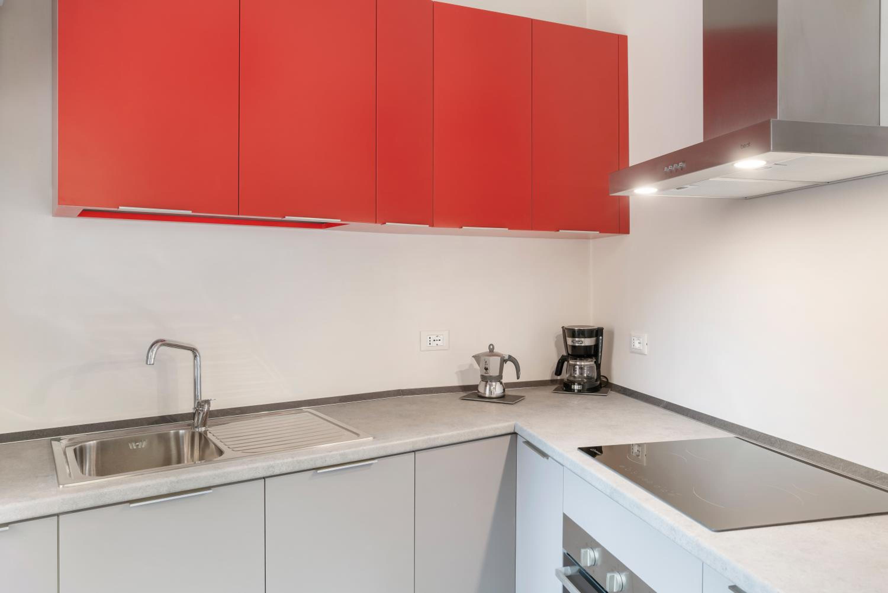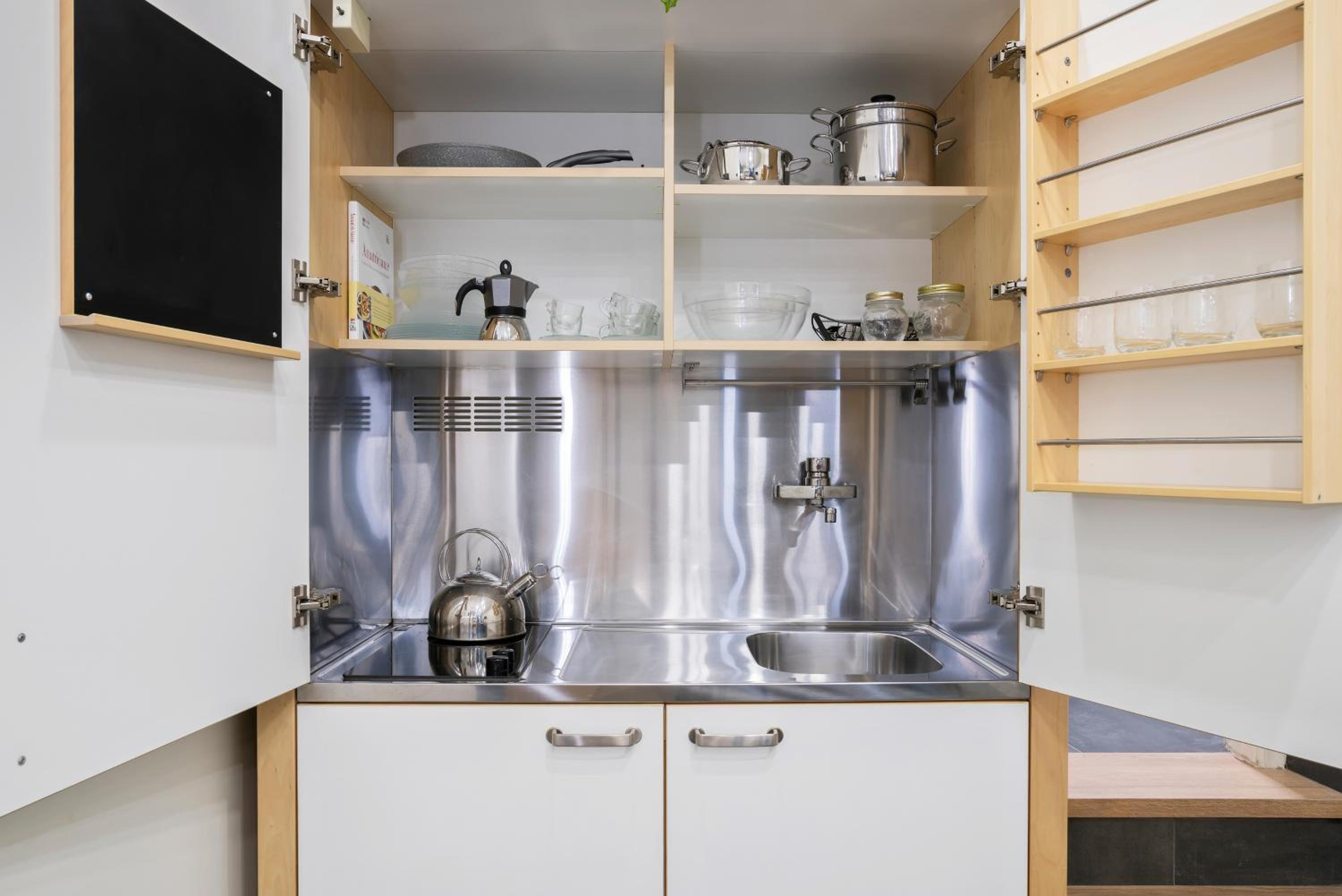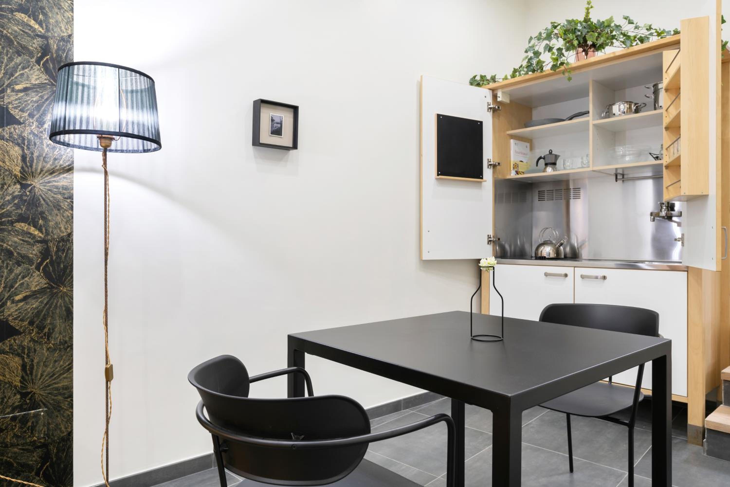 The layout of the apt. is a bit quirky, but ok. It's relatively luminous and not noisy, despite having two restaurants just below. The lift opens directly into the apt. for which reason you need a code to use it. The double room is of normal size, not very large, and the living/dining room is large. On the other hand, the single "room" is more like a wide aisle corner than a room. The kitchen is modernish and well equiped but pretty small (the mokka didn't work on the induction stove even with the attachment).