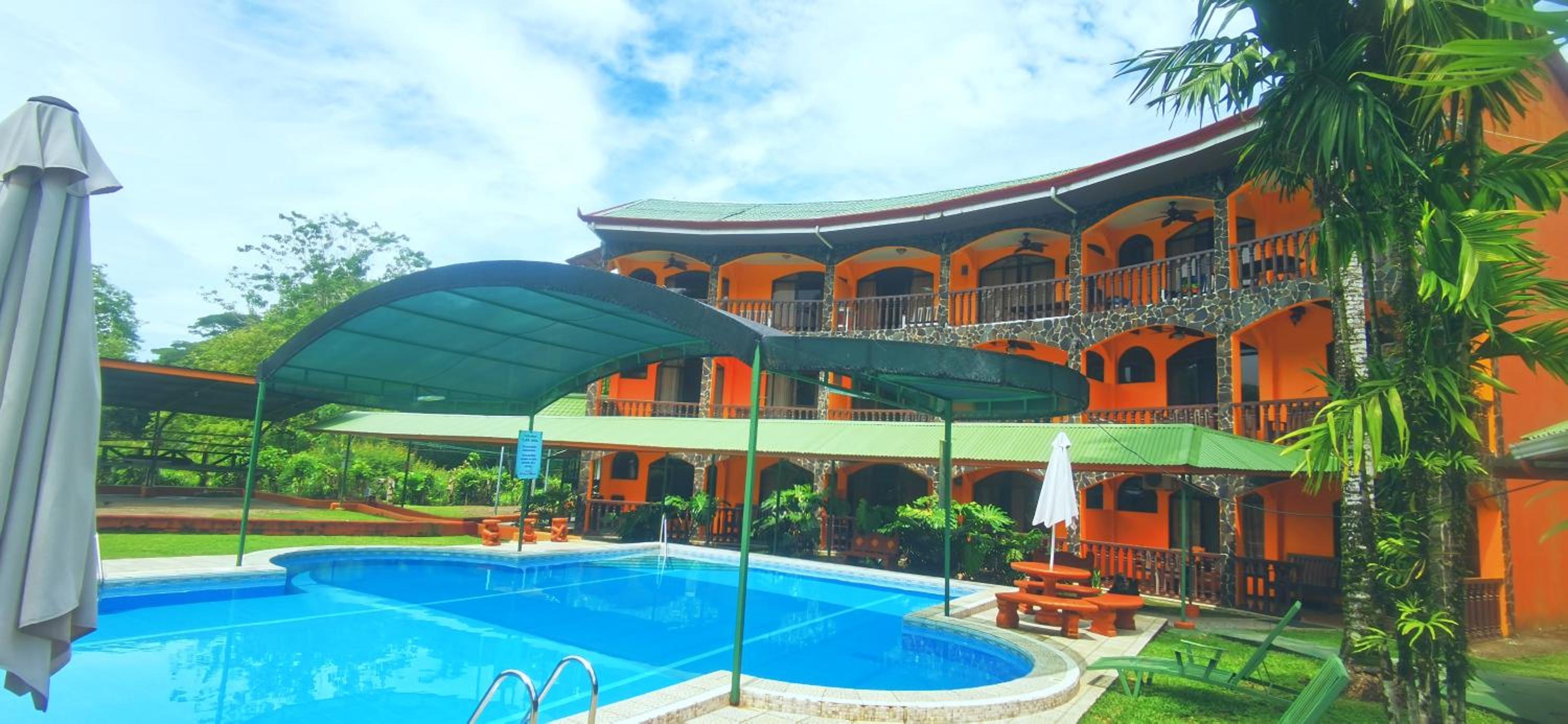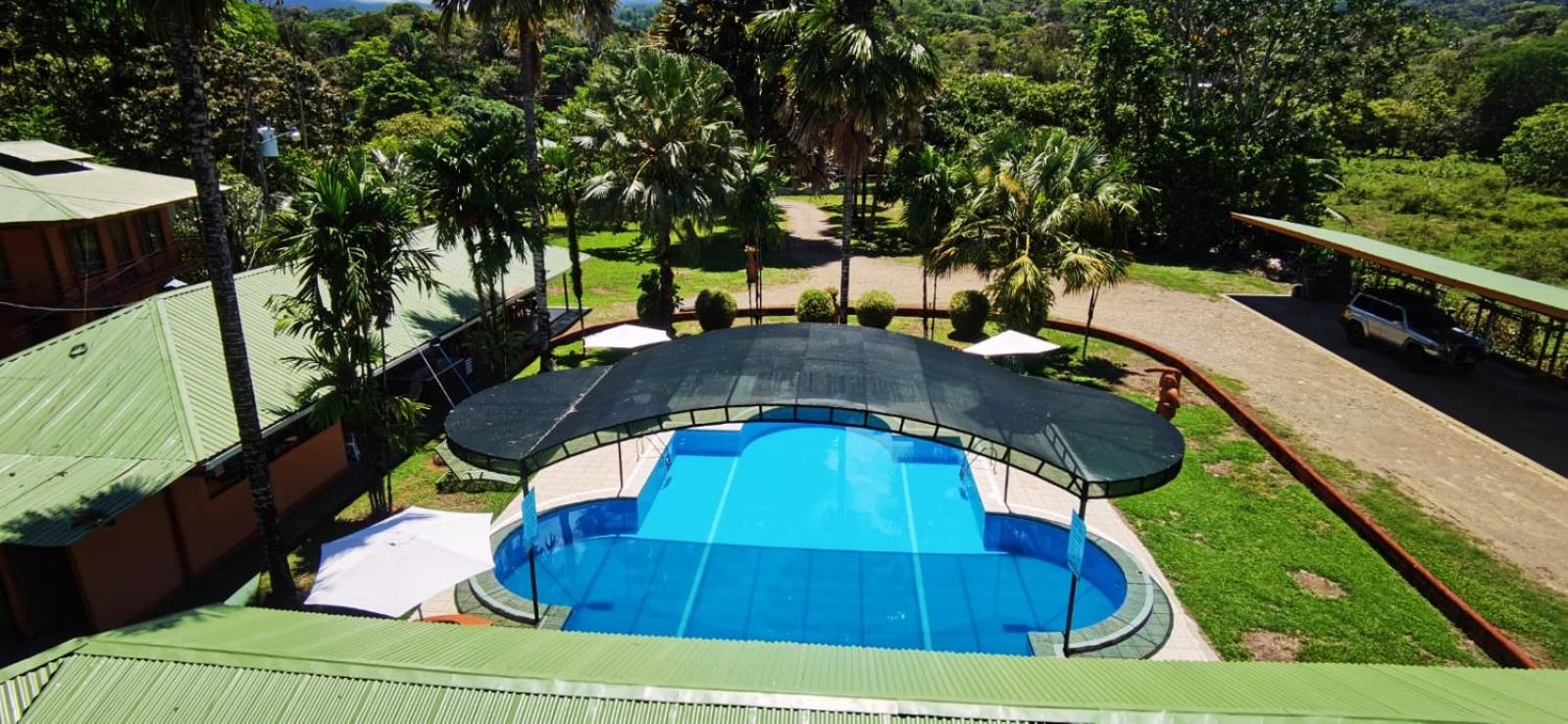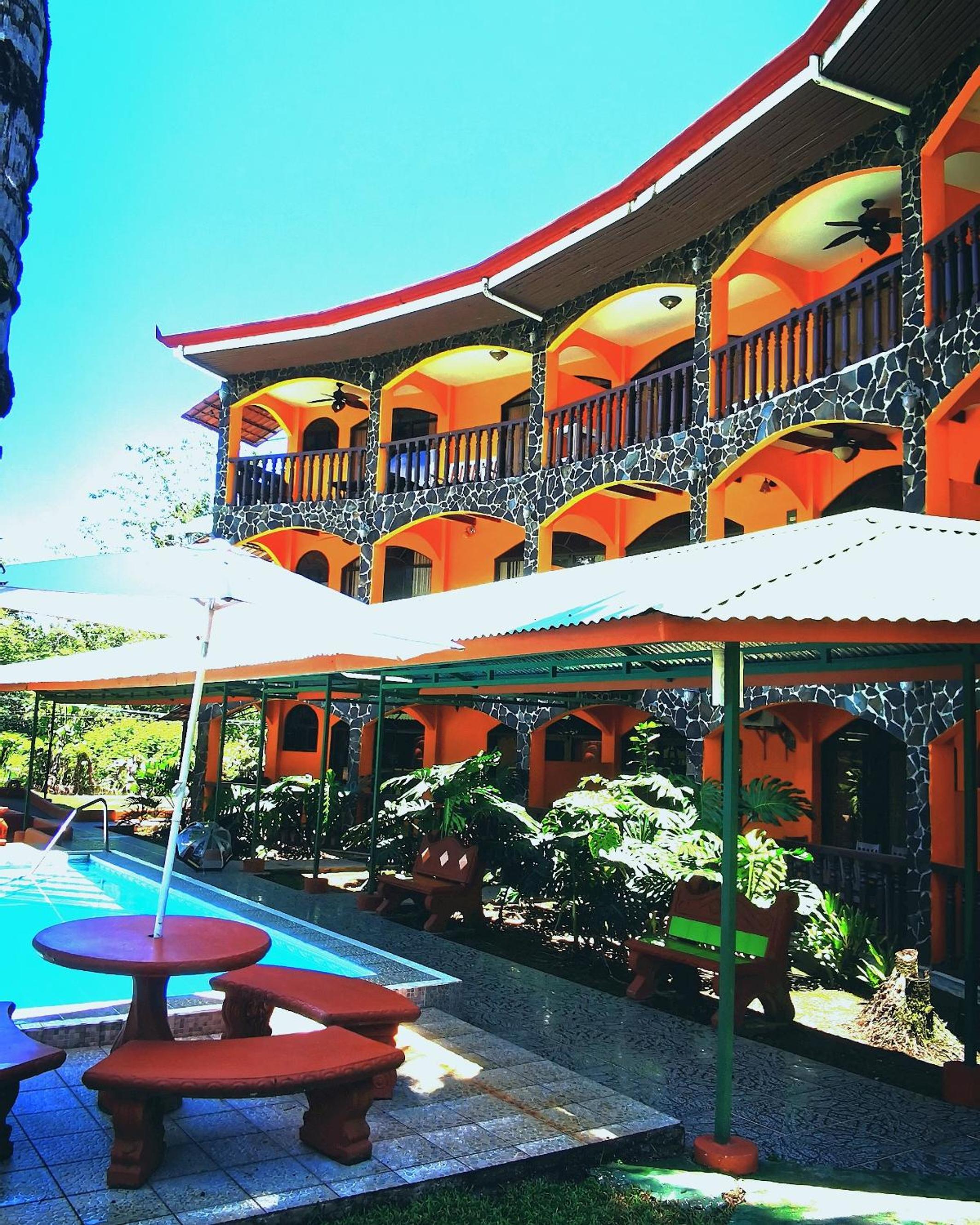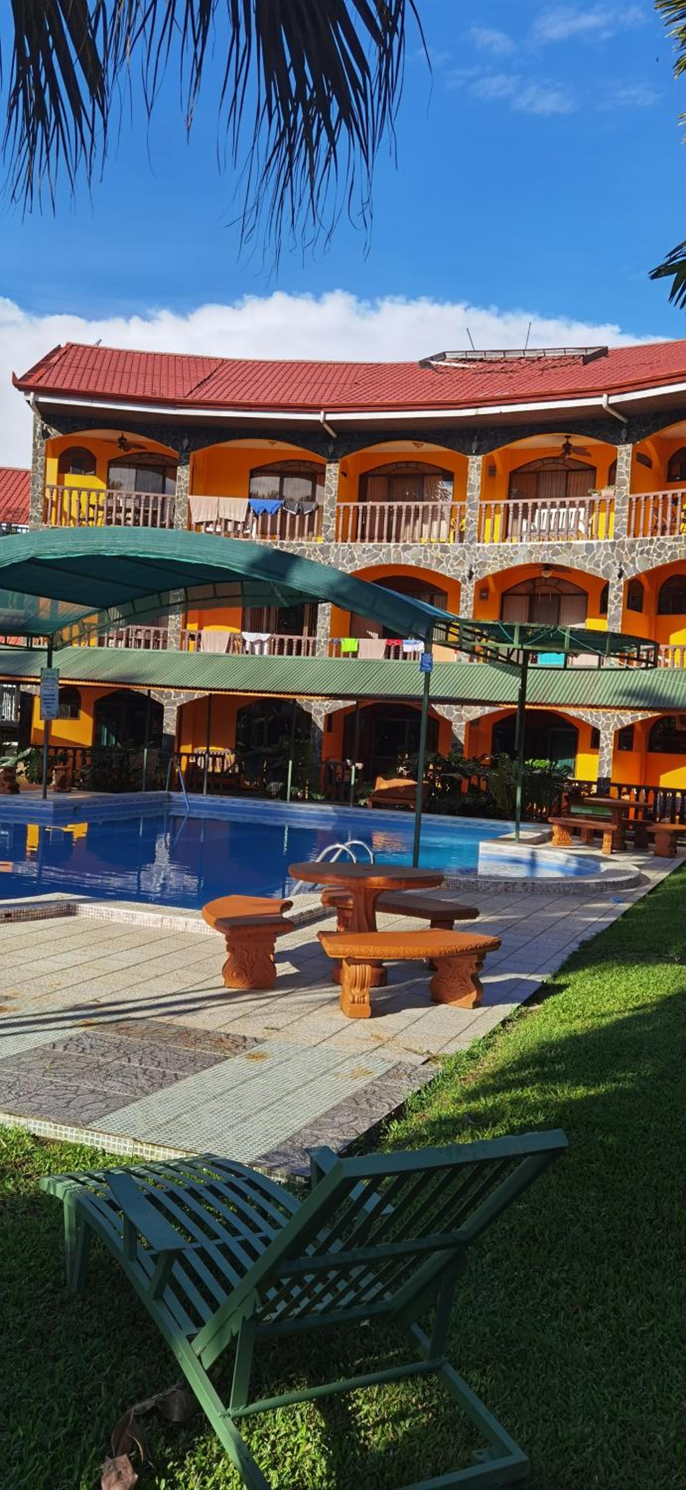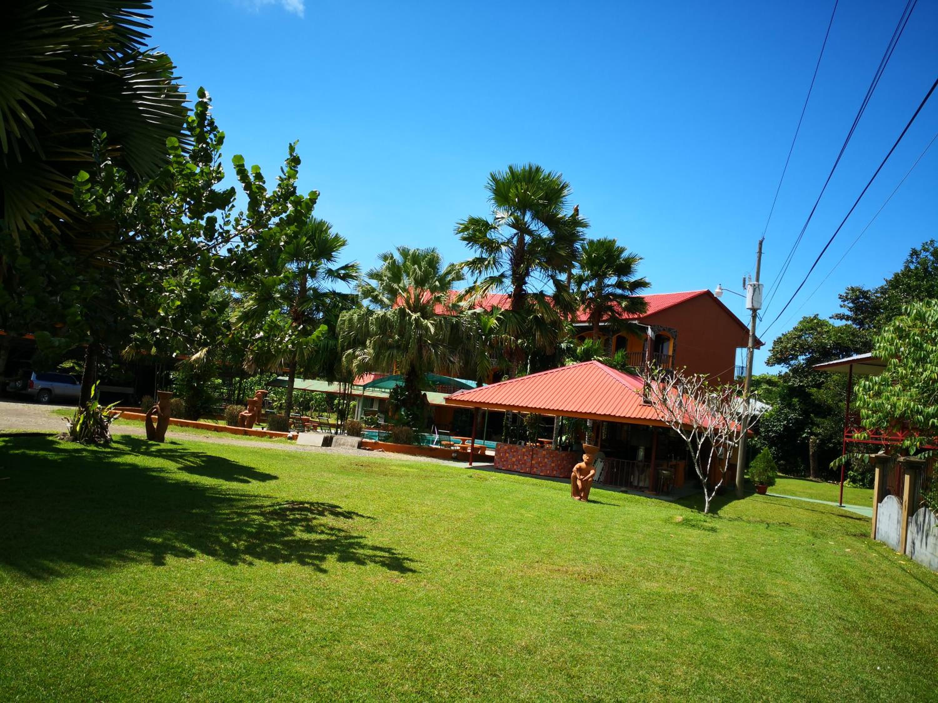 Right off main road but quiet ,on the edge of the jungle. Wildlife abundant on property.Saw iguana toucans frogs macaws and other colorful birds.Good pool . Rooms were good. Armando was super helpful,spoke great English,gave great recommendations on restaurants (Tex Mex adjacent to property)Left my headphones and he what apped me and put them in mail on his own time and they caught up with me at my next stay in Puerto Jimenez.Covered parking fully equipped kitchen hot water gated entrance. Thanks Armando.