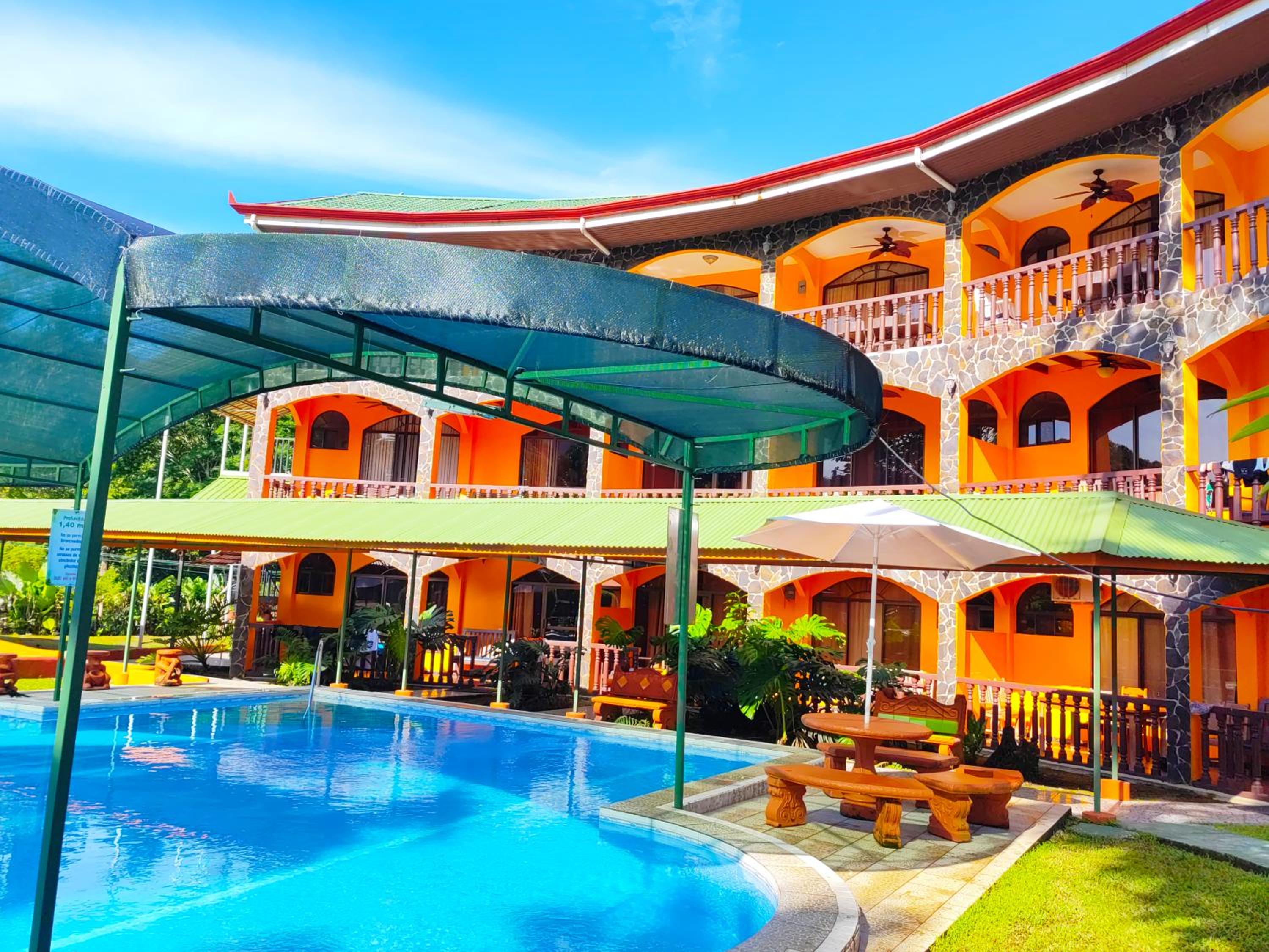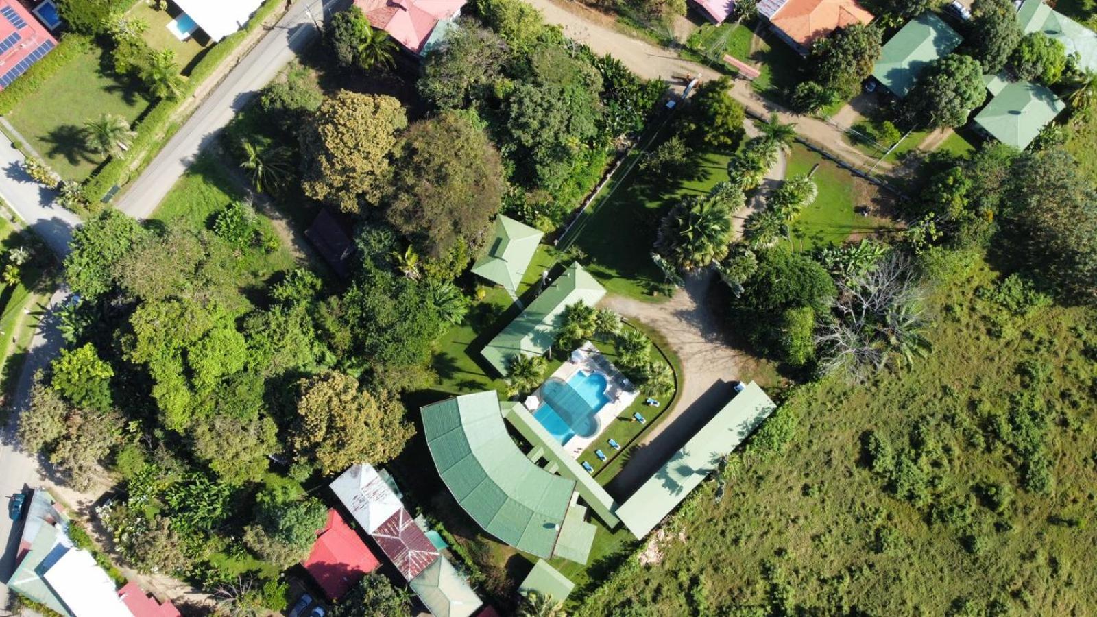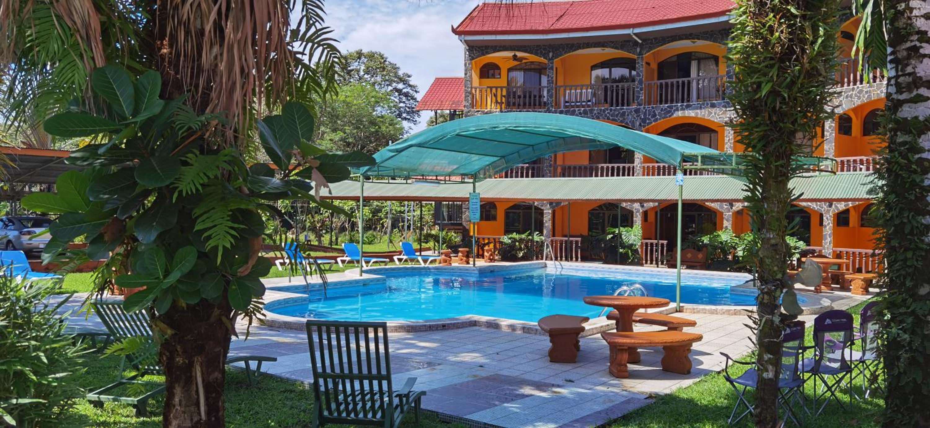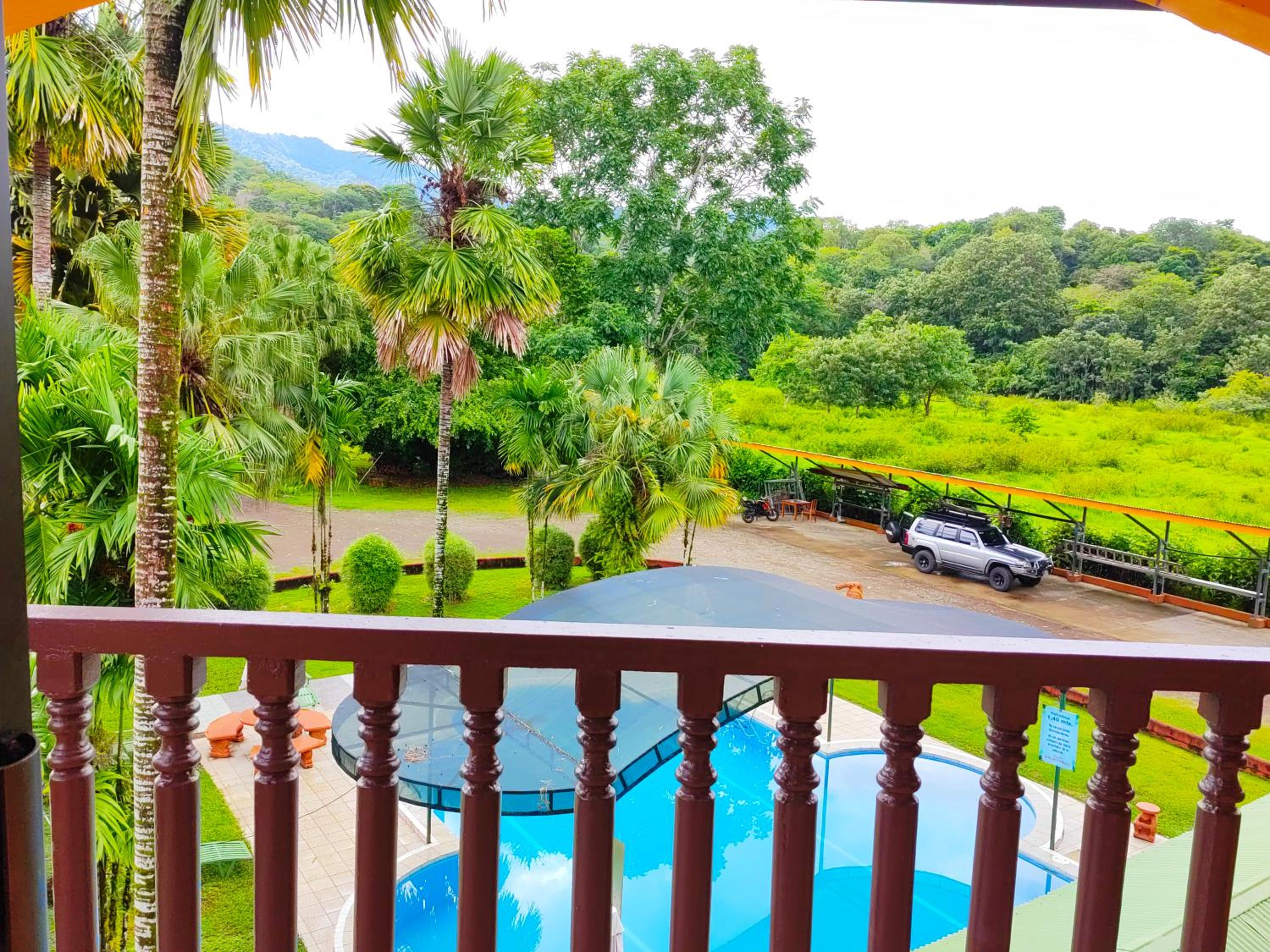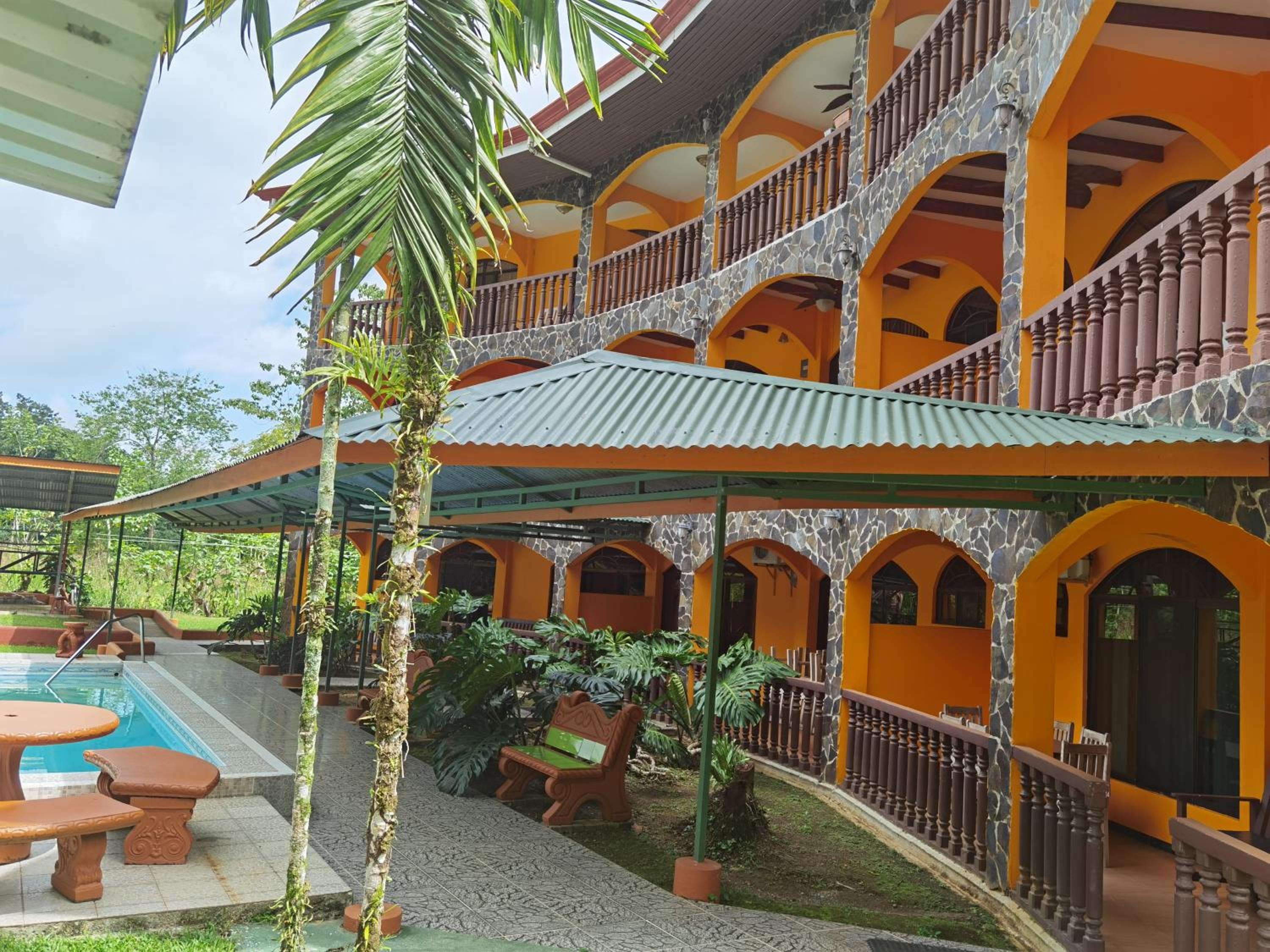 Right off main road but quiet ,on the edge of the jungle. Wildlife abundant on property.Saw iguana toucans frogs macaws and other colorful birds.Good pool . Rooms were good. Armando was super helpful,spoke great English,gave great recommendations on restaurants (Tex Mex adjacent to property)Left my headphones and he what apped me and put them in mail on his own time and they caught up with me at my next stay in Puerto Jimenez.Covered parking fully equipped kitchen hot water gated entrance. Thanks Armando.