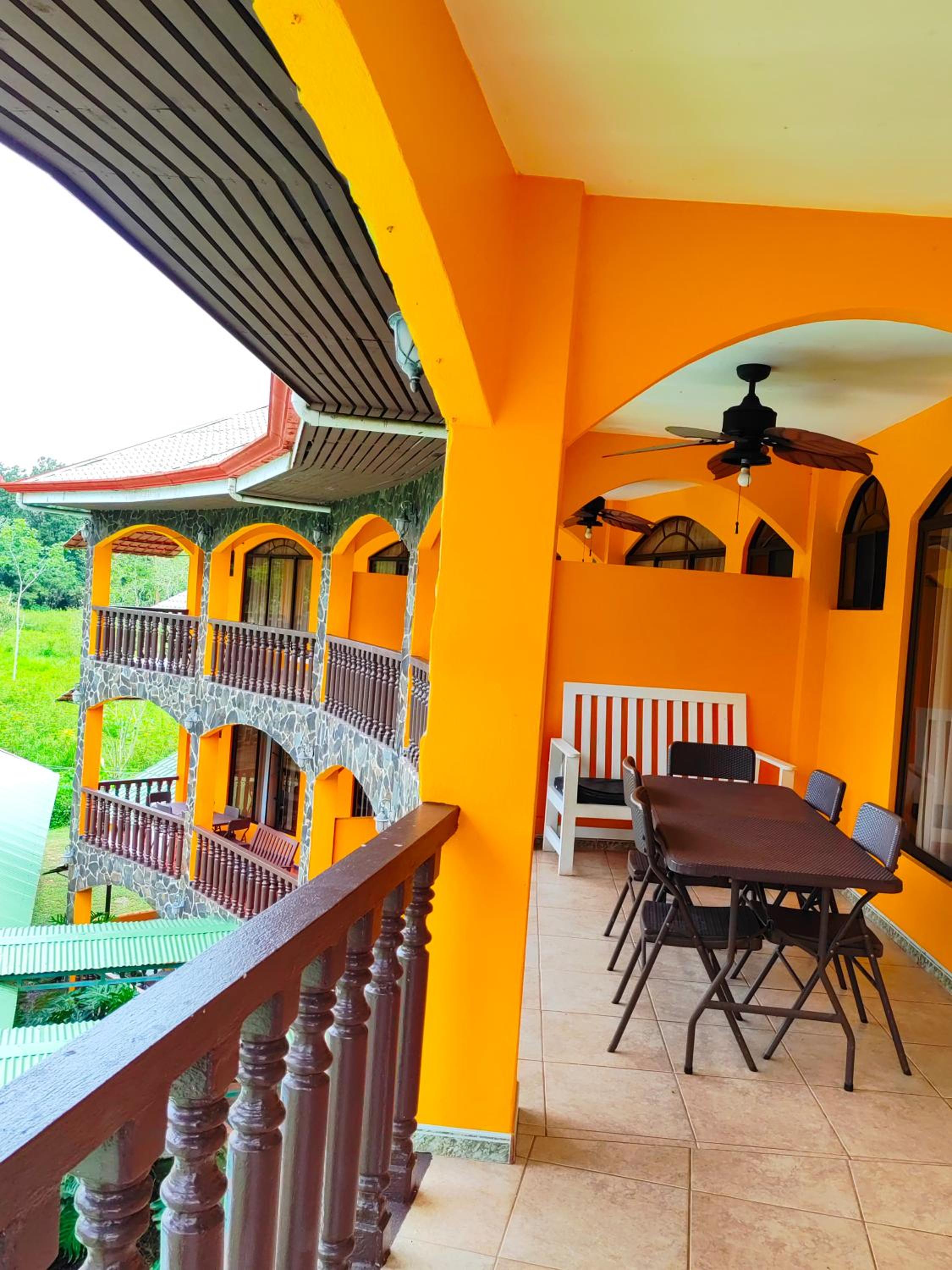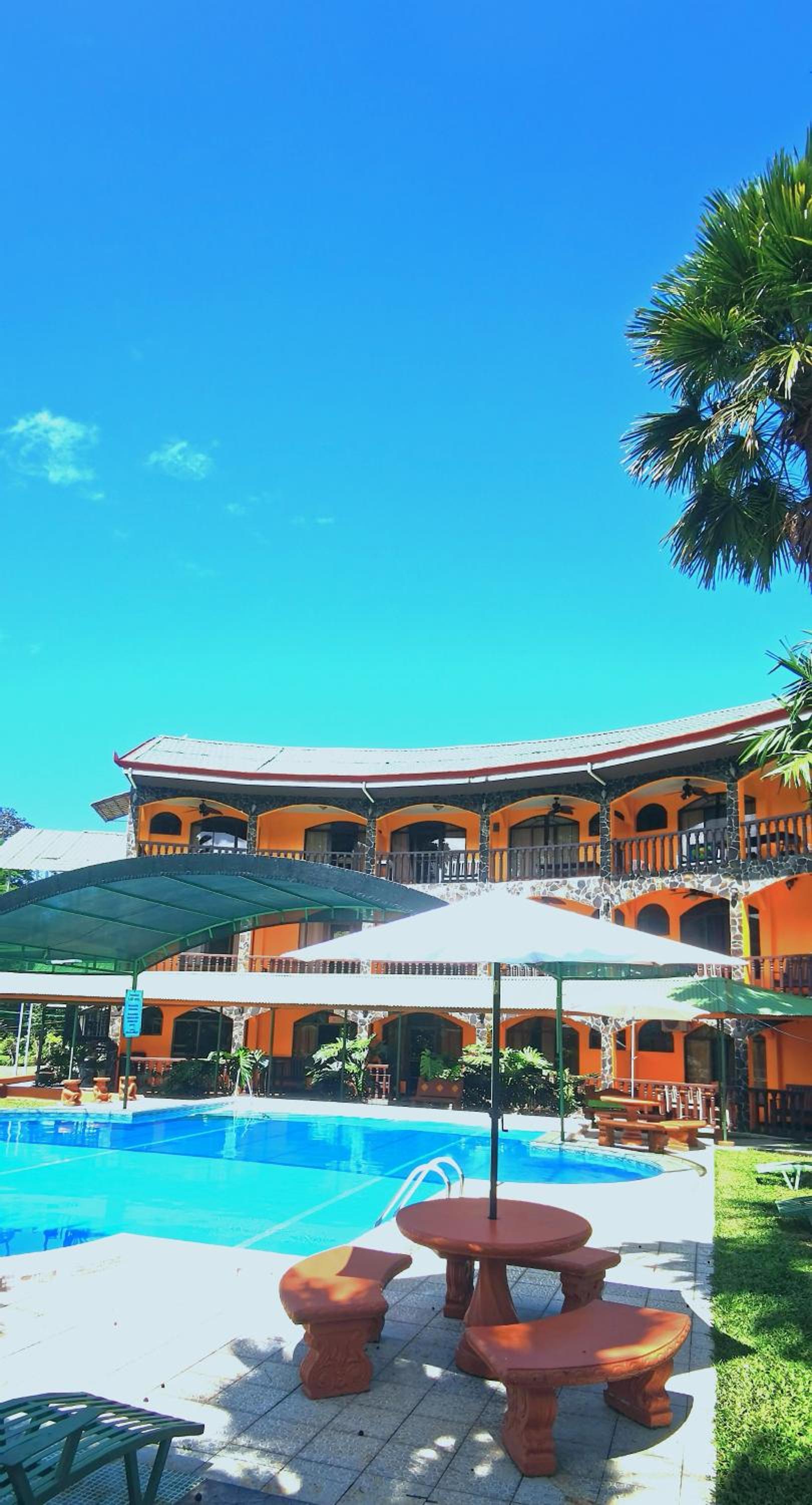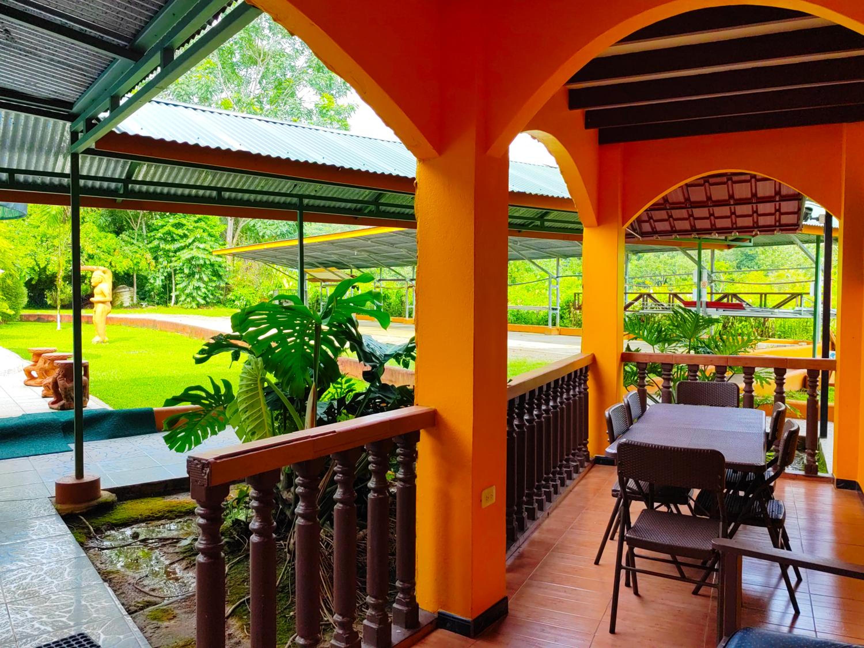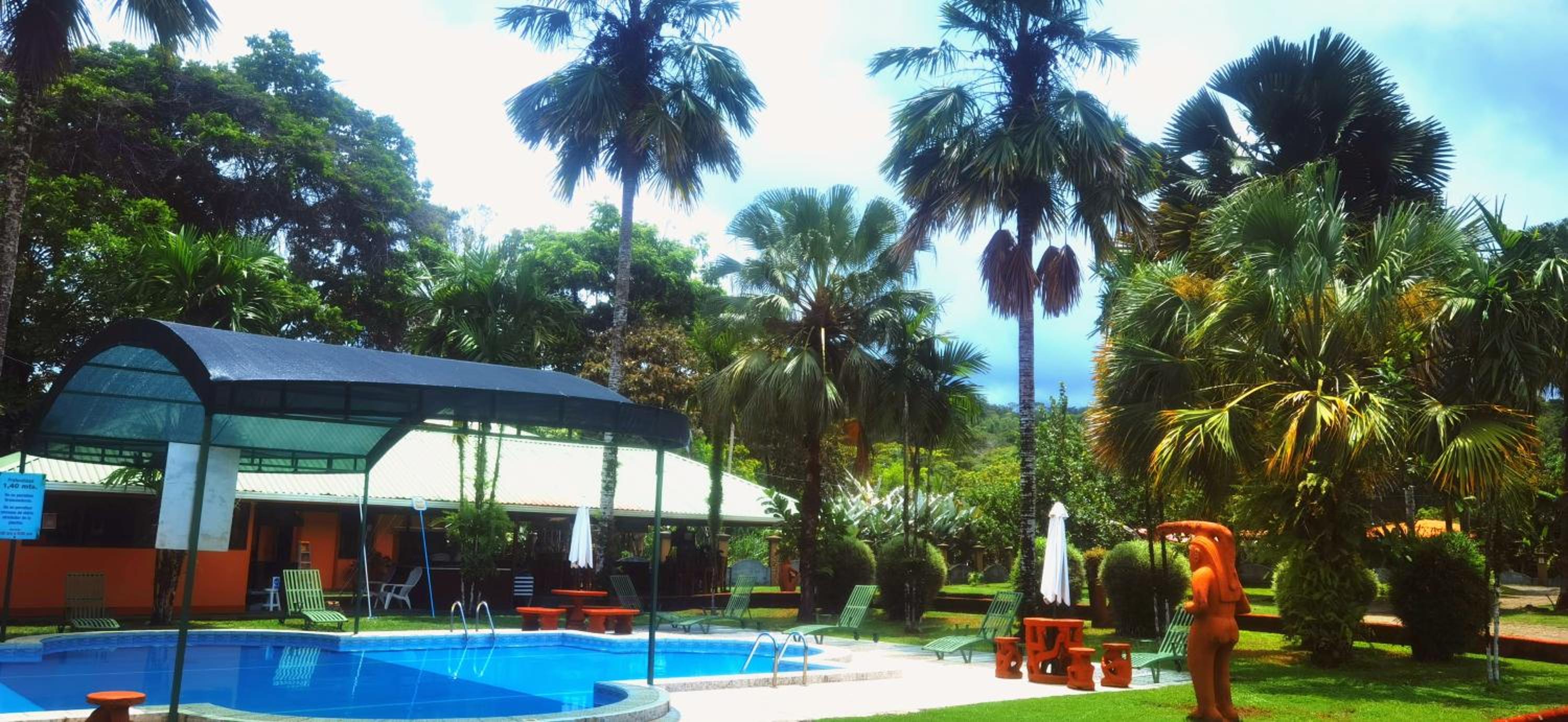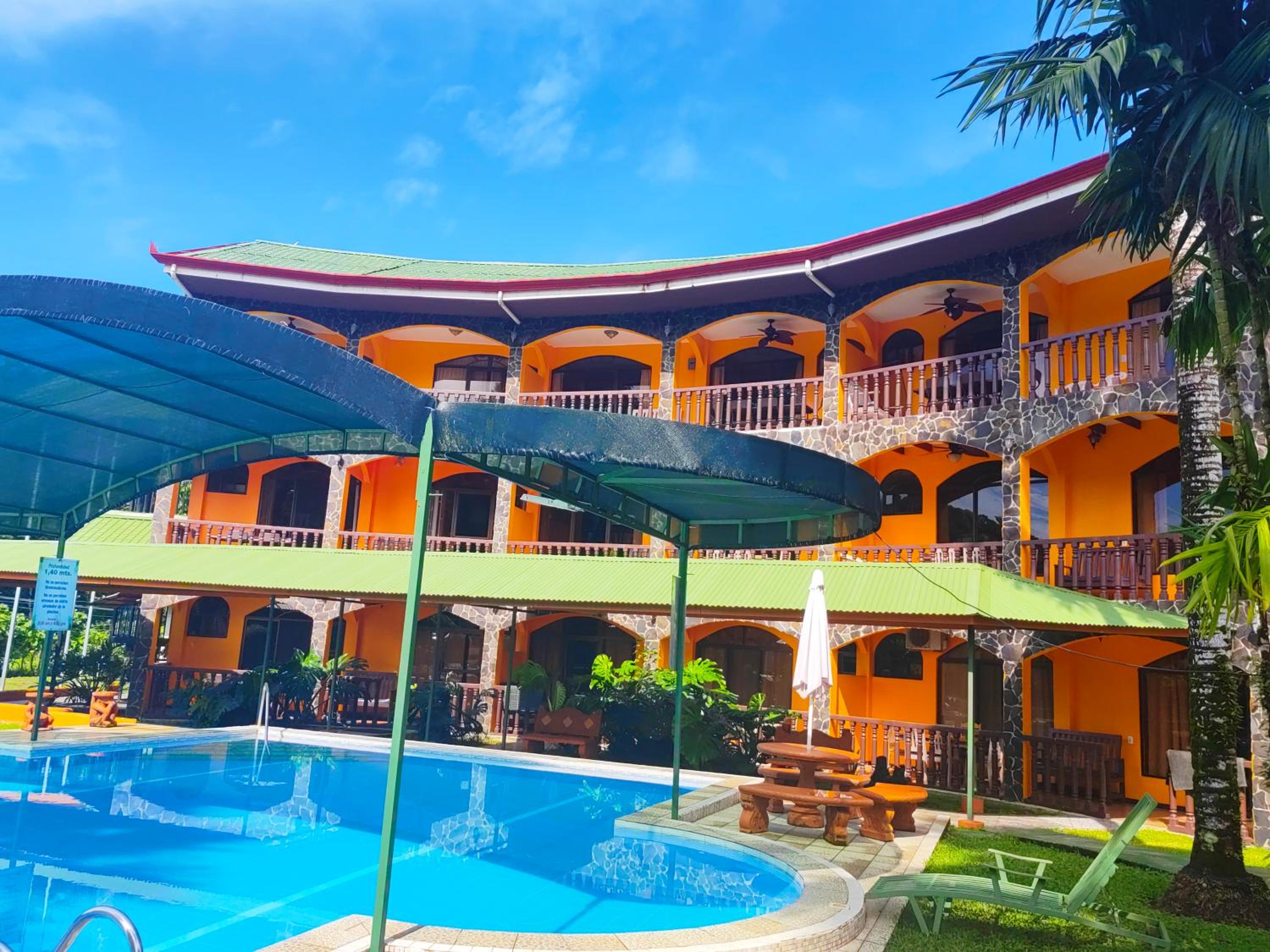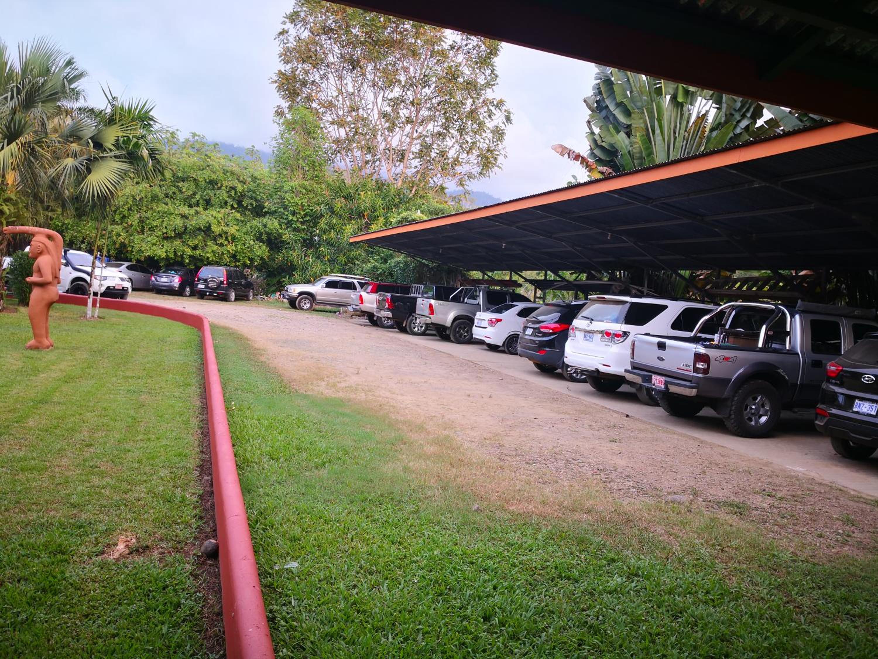 Right off main road but quiet ,on the edge of the jungle. Wildlife abundant on property.Saw iguana toucans frogs macaws and other colorful birds.Good pool . Rooms were good. Armando was super helpful,spoke great English,gave great recommendations on restaurants (Tex Mex adjacent to property)Left my headphones and he what apped me and put them in mail on his own time and they caught up with me at my next stay in Puerto Jimenez.Covered parking fully equipped kitchen hot water gated entrance. Thanks Armando.