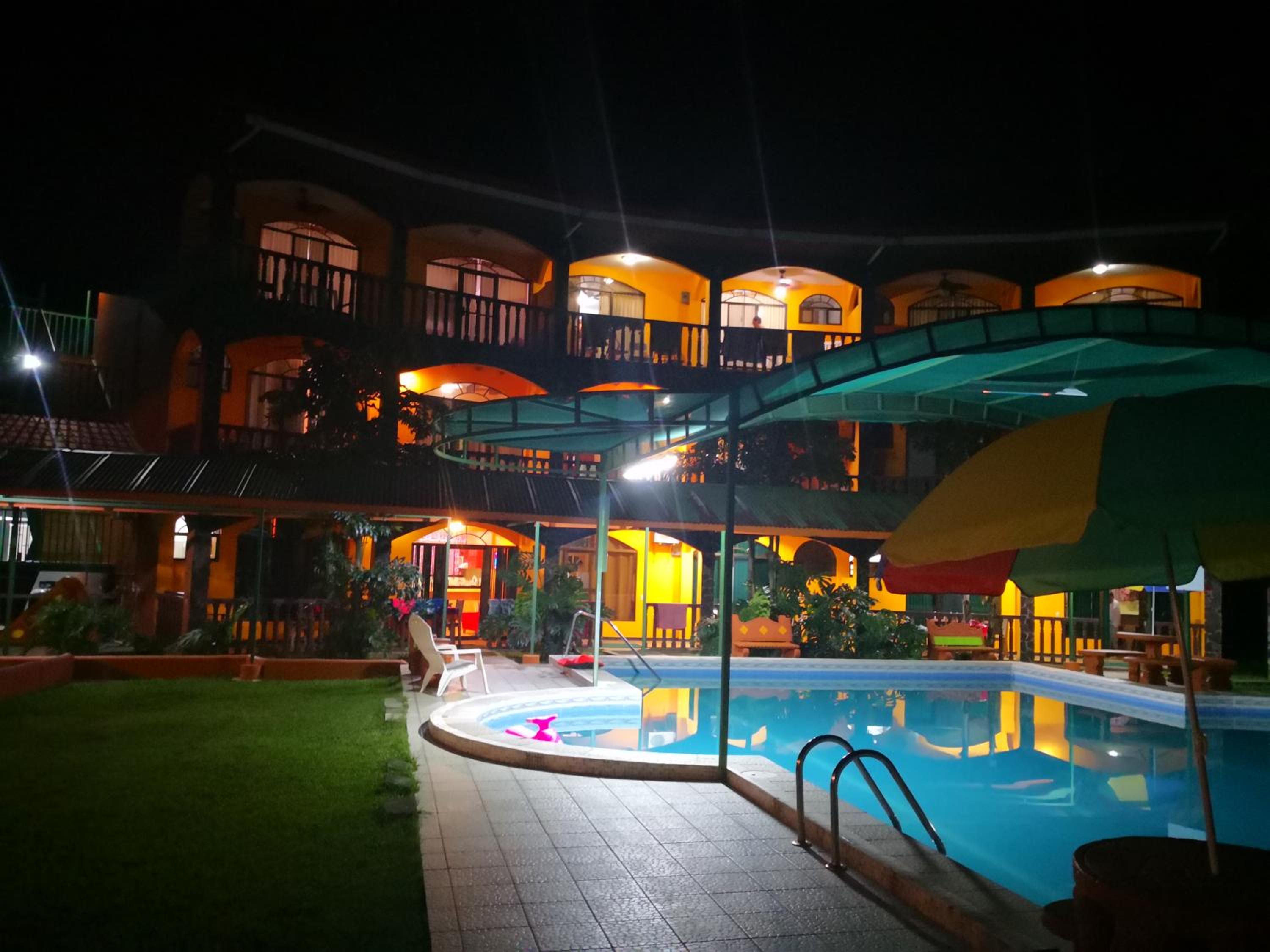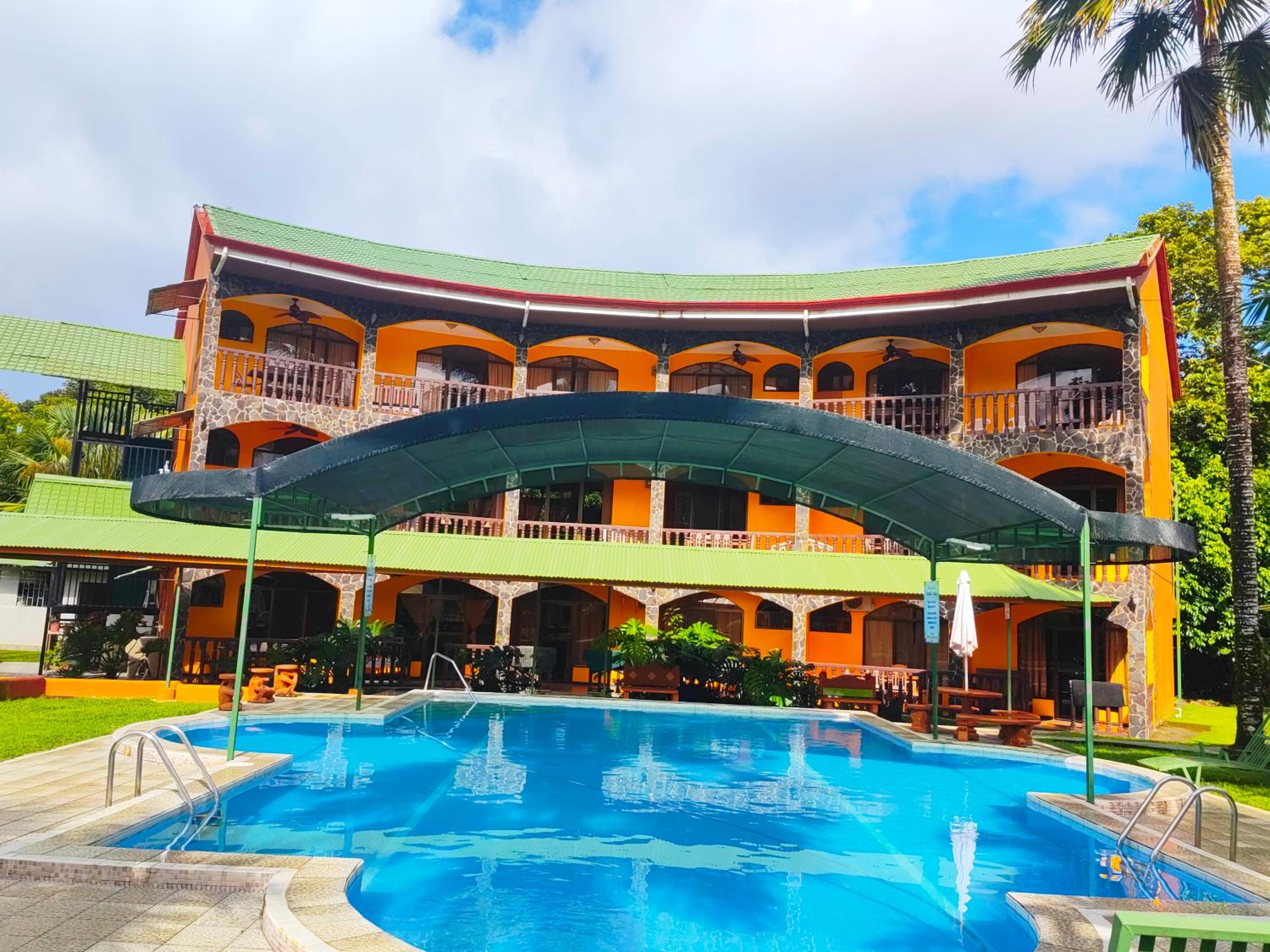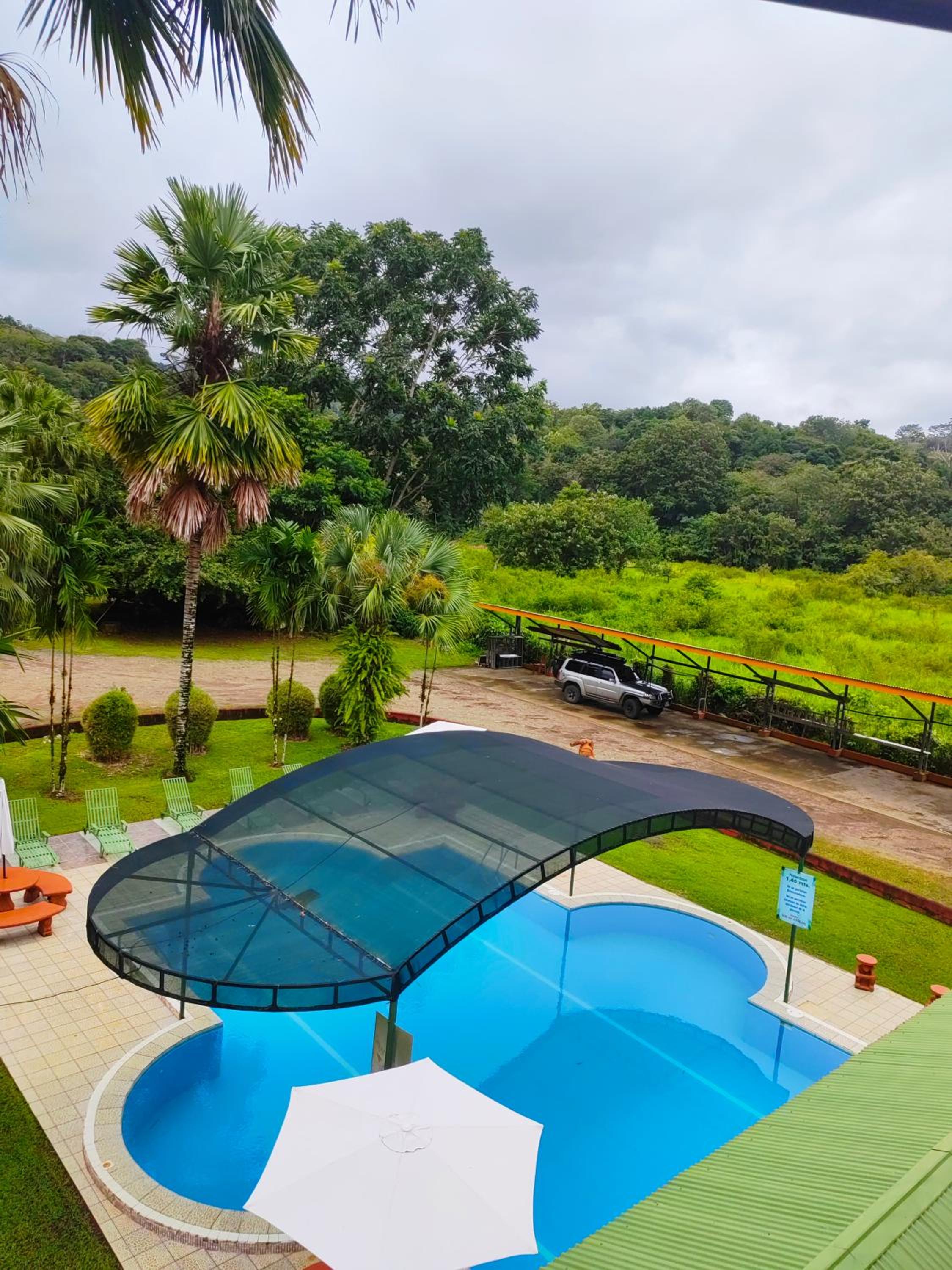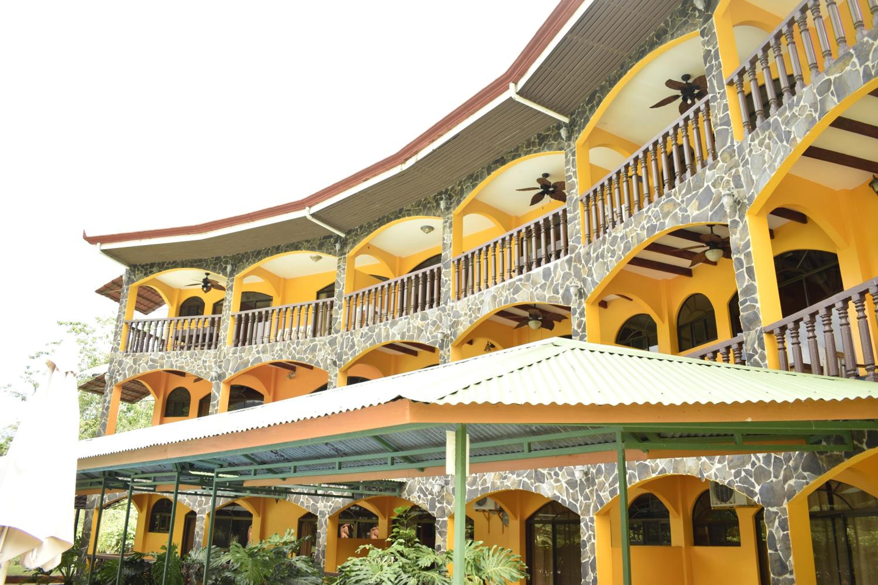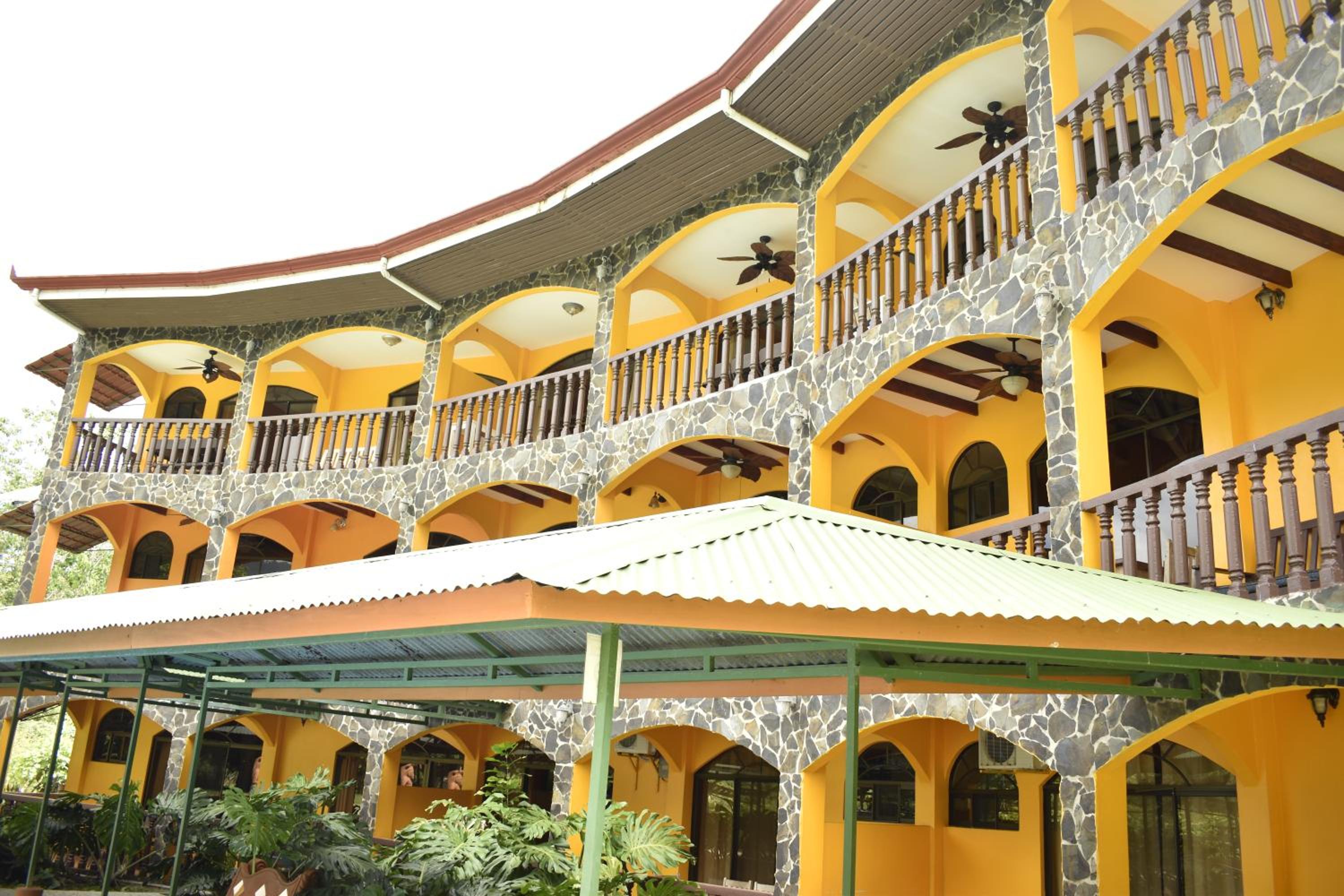 Right off main road but quiet ,on the edge of the jungle. Wildlife abundant on property.Saw iguana toucans frogs macaws and other colorful birds.Good pool . Rooms were good. Armando was super helpful,spoke great English,gave great recommendations on restaurants (Tex Mex adjacent to property)Left my headphones and he what apped me and put them in mail on his own time and they caught up with me at my next stay in Puerto Jimenez.Covered parking fully equipped kitchen hot water gated entrance. Thanks Armando.