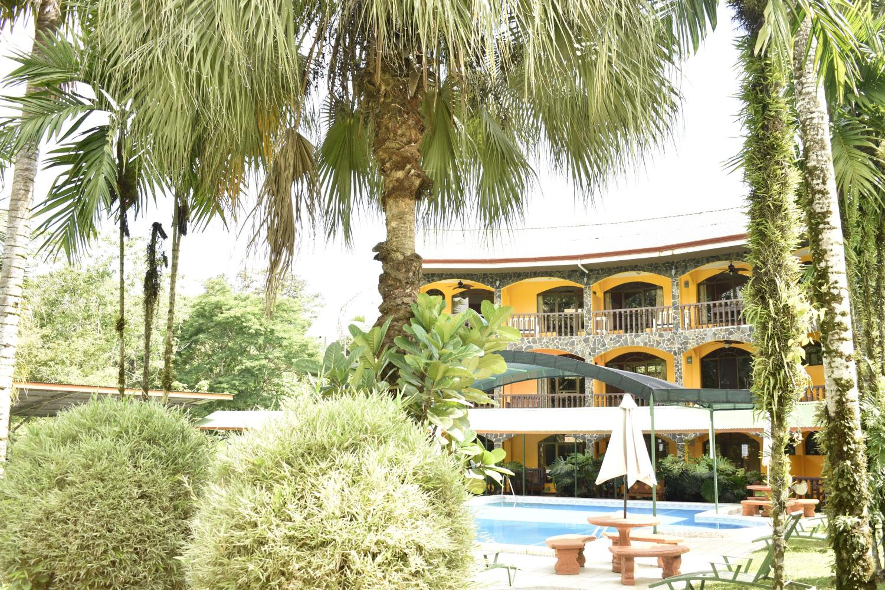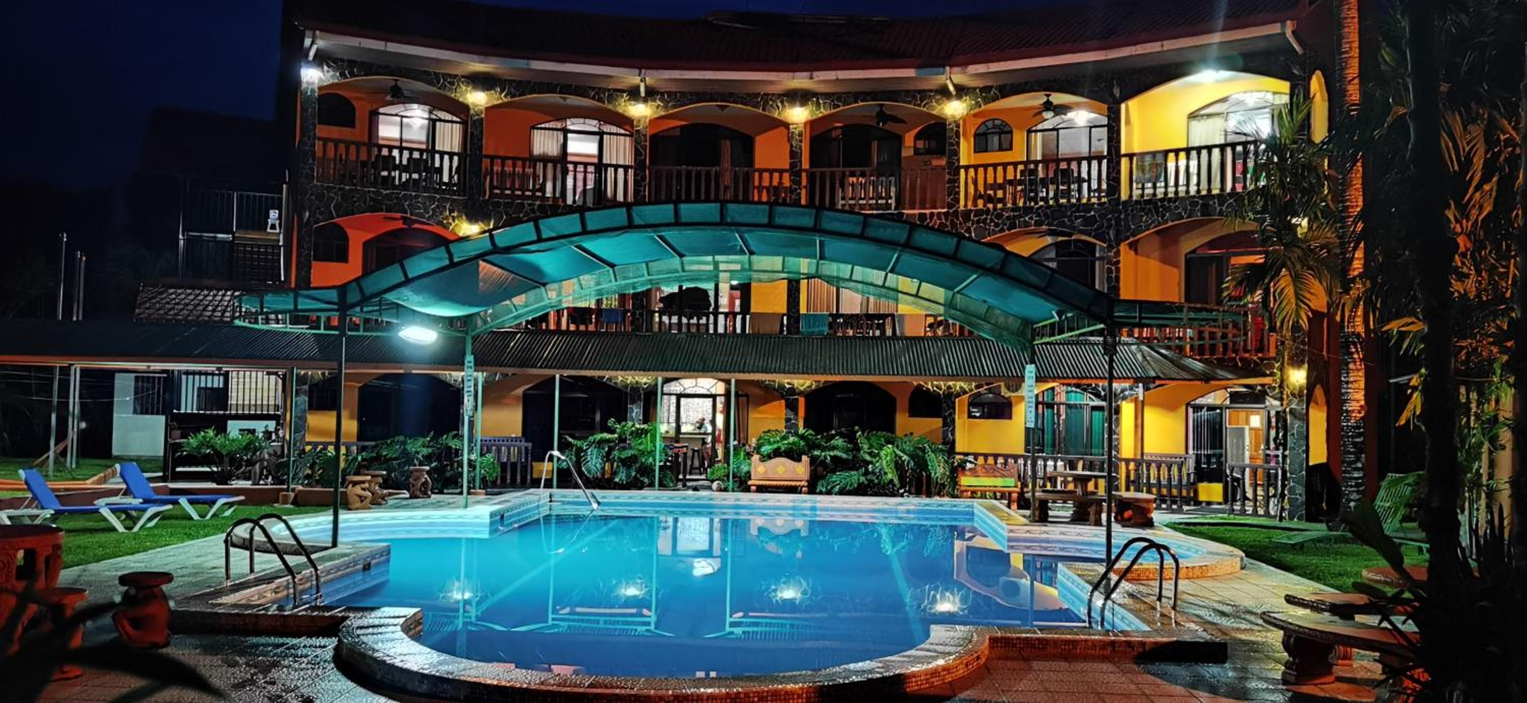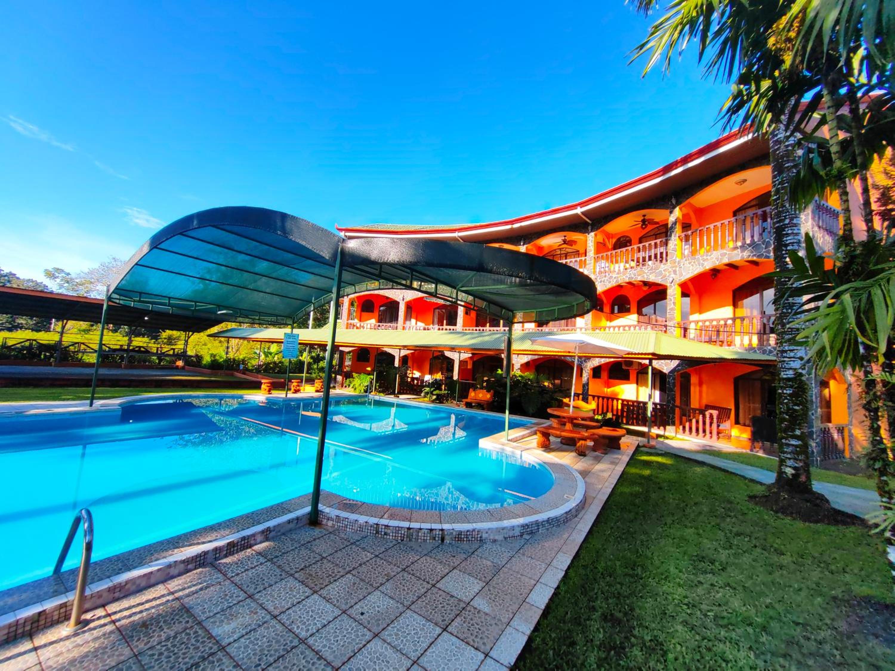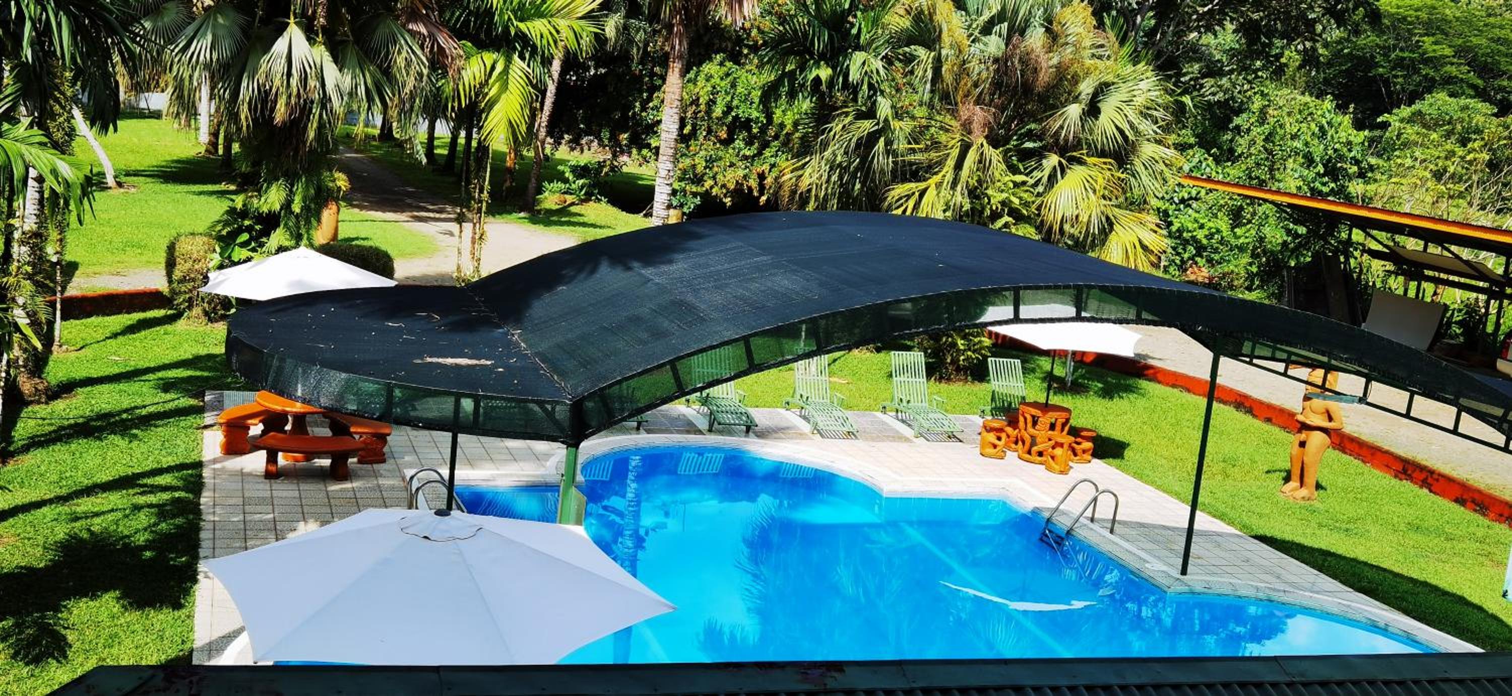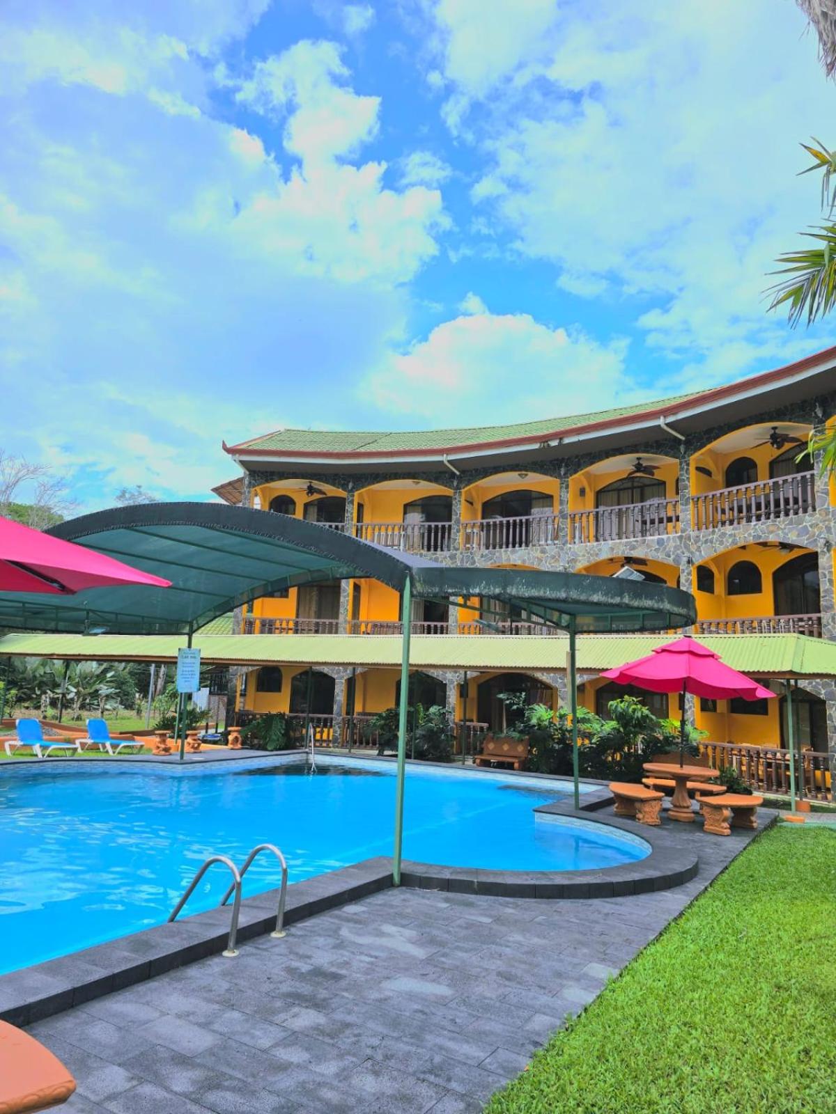 Right off main road but quiet ,on the edge of the jungle. Wildlife abundant on property.Saw iguana toucans frogs macaws and other colorful birds.Good pool . Rooms were good. Armando was super helpful,spoke great English,gave great recommendations on restaurants (Tex Mex adjacent to property)Left my headphones and he what apped me and put them in mail on his own time and they caught up with me at my next stay in Puerto Jimenez.Covered parking fully equipped kitchen hot water gated entrance. Thanks Armando.