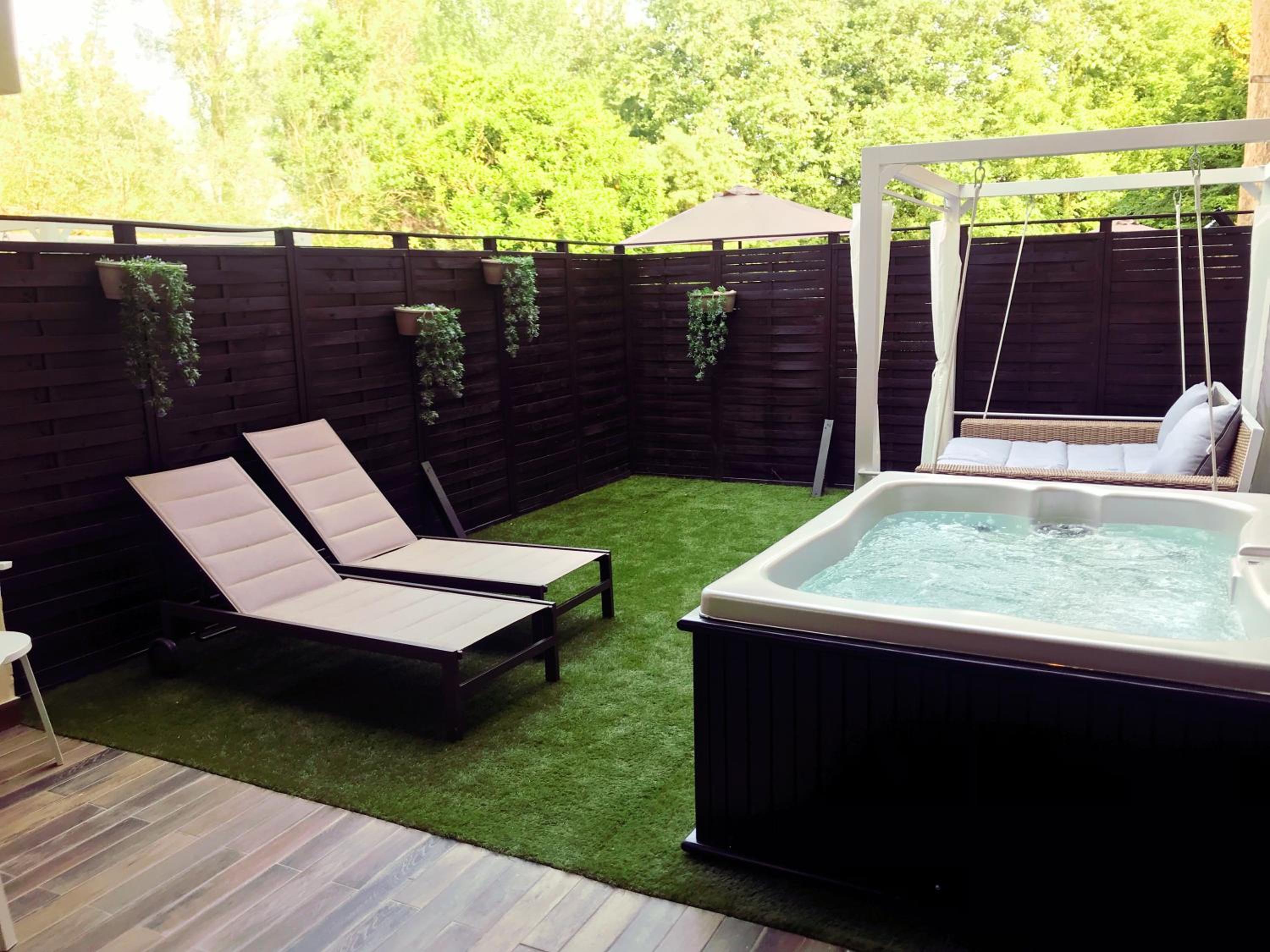 Het hout bij de jacuzzi was verrot en het filter van de jacuzzi was smerig. De jacuzzi was twee keer in storing, doordat het waterpijl te laag was. Waarschijnlijk lekte het, want het kunstgras in de tuin was zeiknat, het onkruit groeide er overal tussendoor.