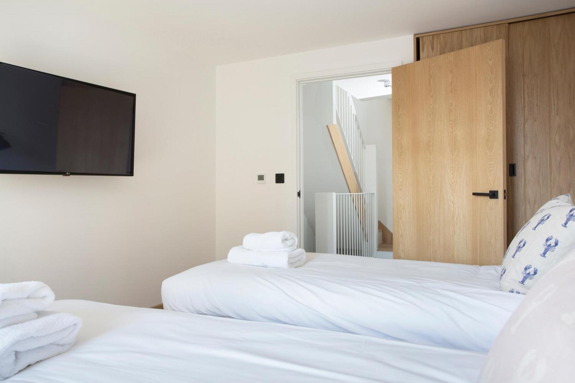 The location is excellent, right in the middle of Whitstable town and close to any of the restaurants and activities. The apartment has a car parking space on the ground level, a twin room and bathroom on the second level, and a double room and bathroom with a balcony on the third level. The "sea view" is off to the side as the building is orientated at 90 degrees to the shore. We stayed in the second closest to the shore (number 6 of 7), but if you were in a further along apartment (lower number) I imagine the view is much diminished. The facilities are modern inside, with fridge and kettles provided. Each room has a TV.