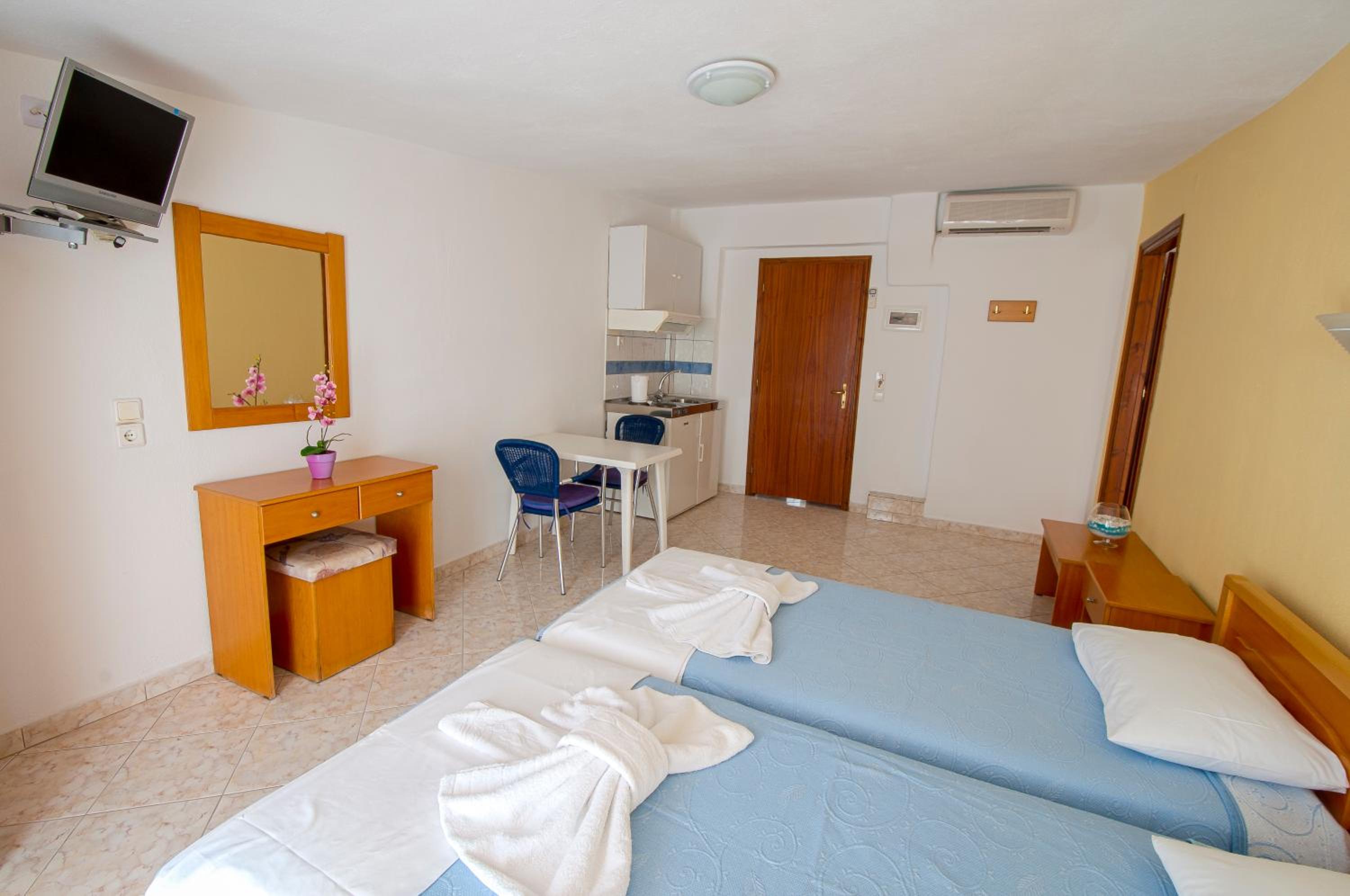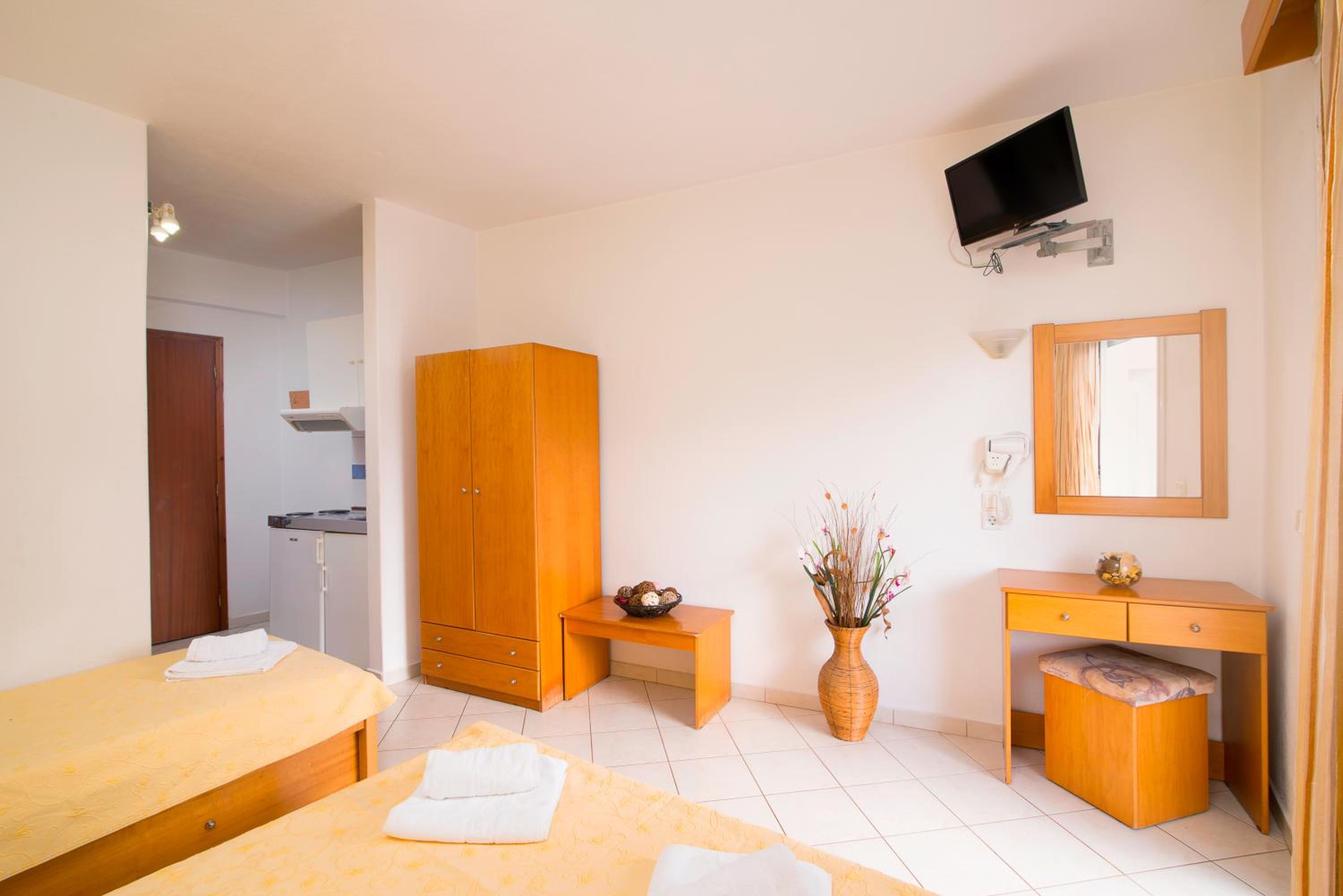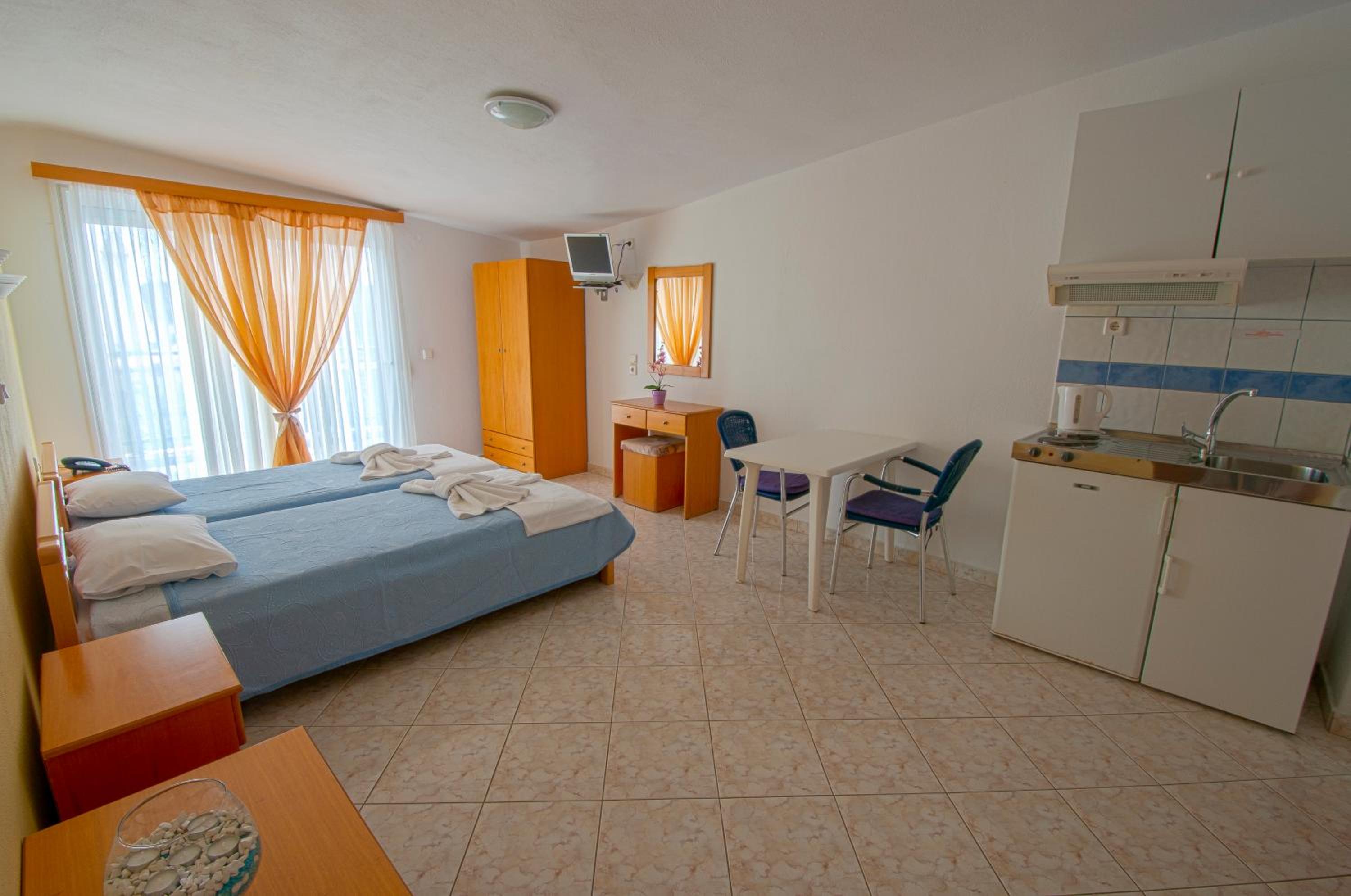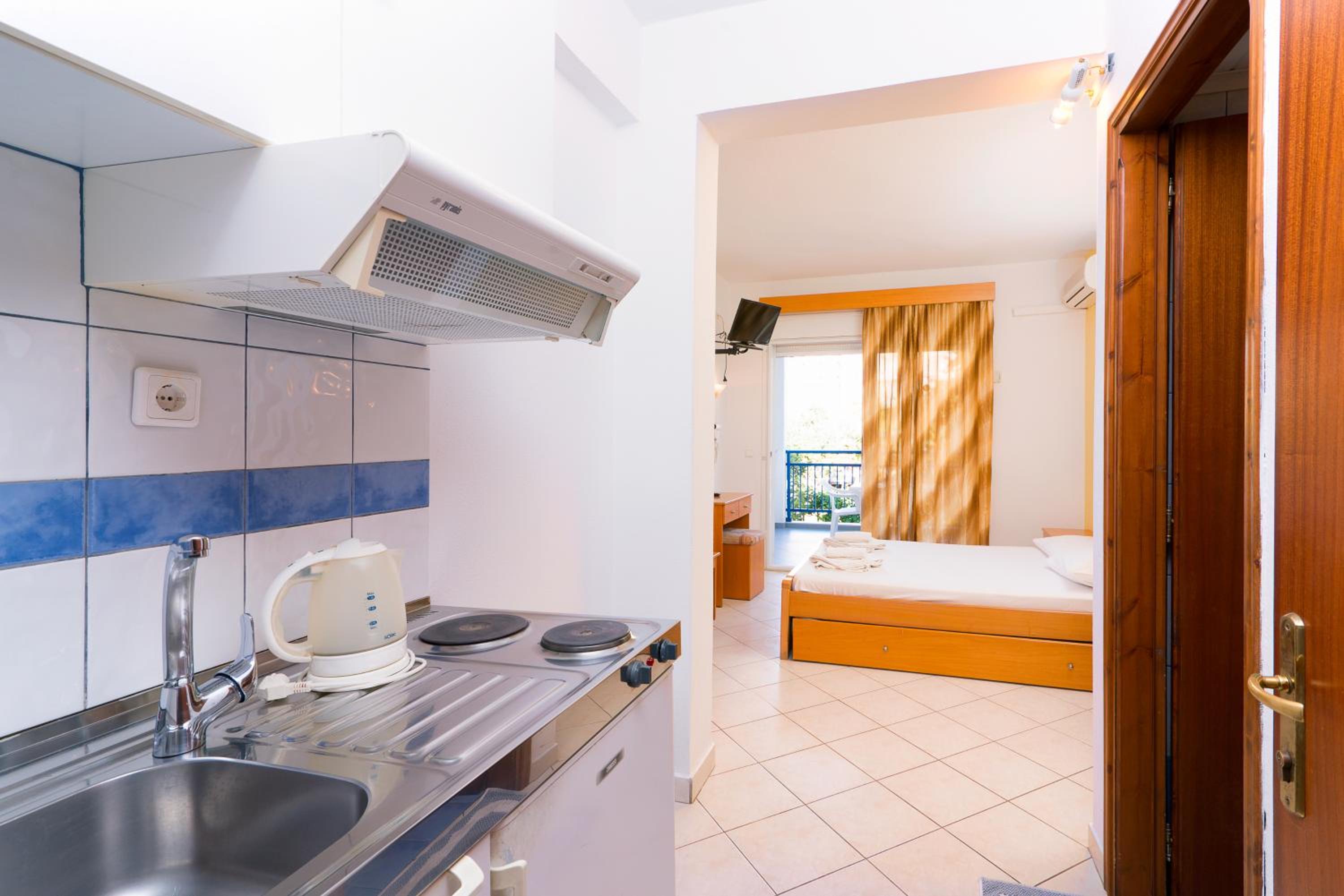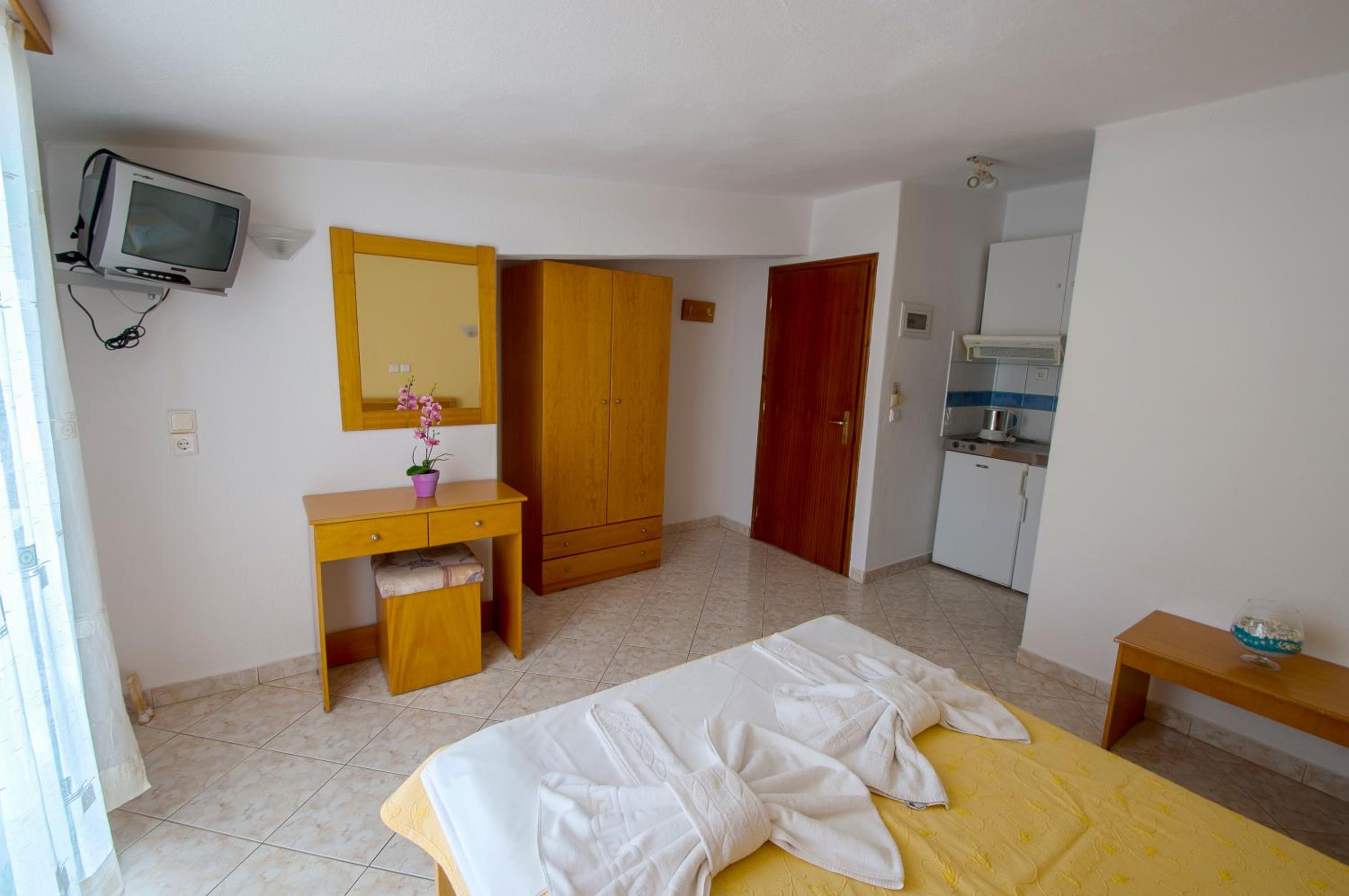 The studios and apartments at Maria are thoughtfully designed with air conditioning, wooden furnishings, and tiled floors, providing a comfortable stay. The kitchenette, TV, and private bathroom further enhance the convenience and relaxation for guests.