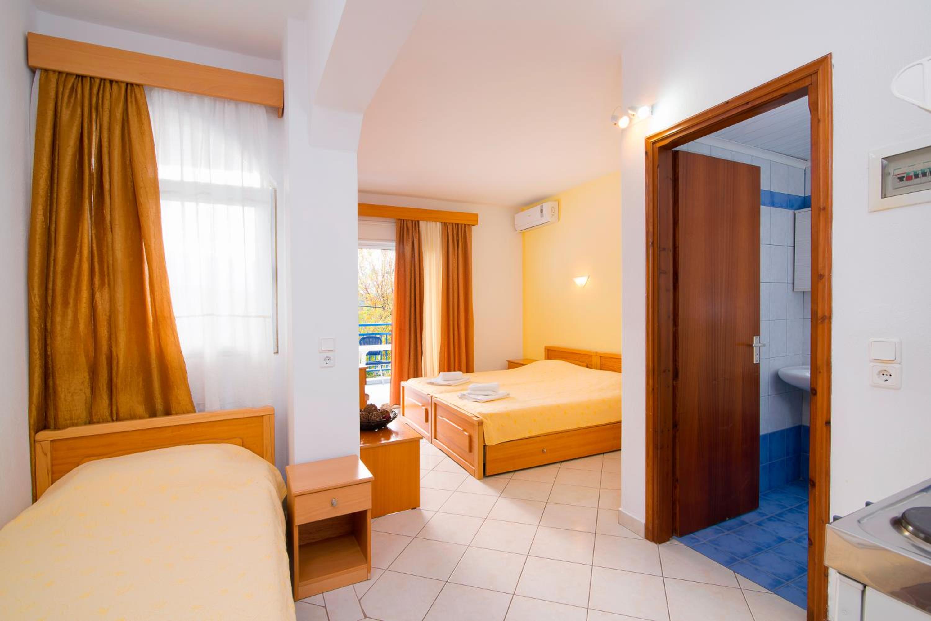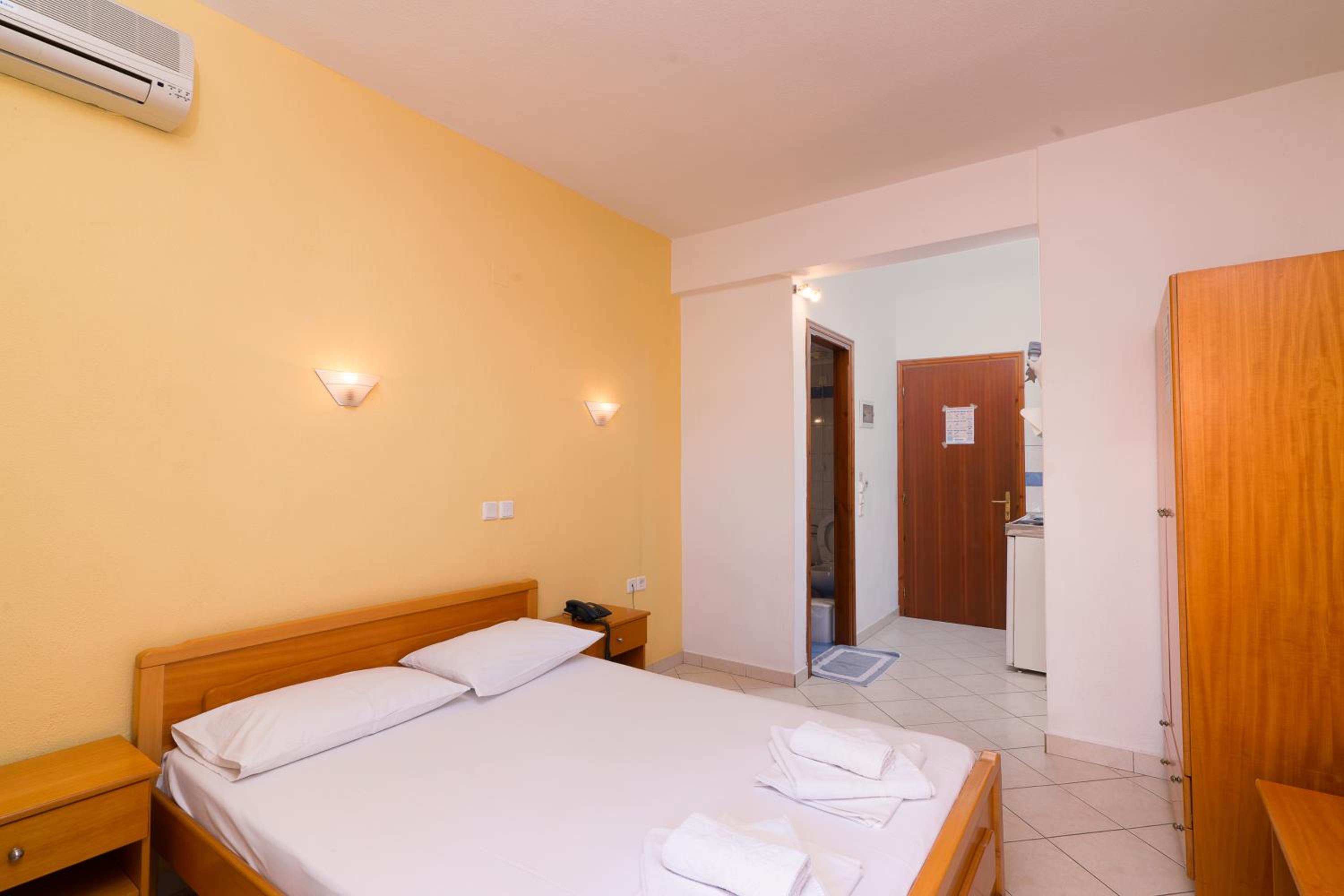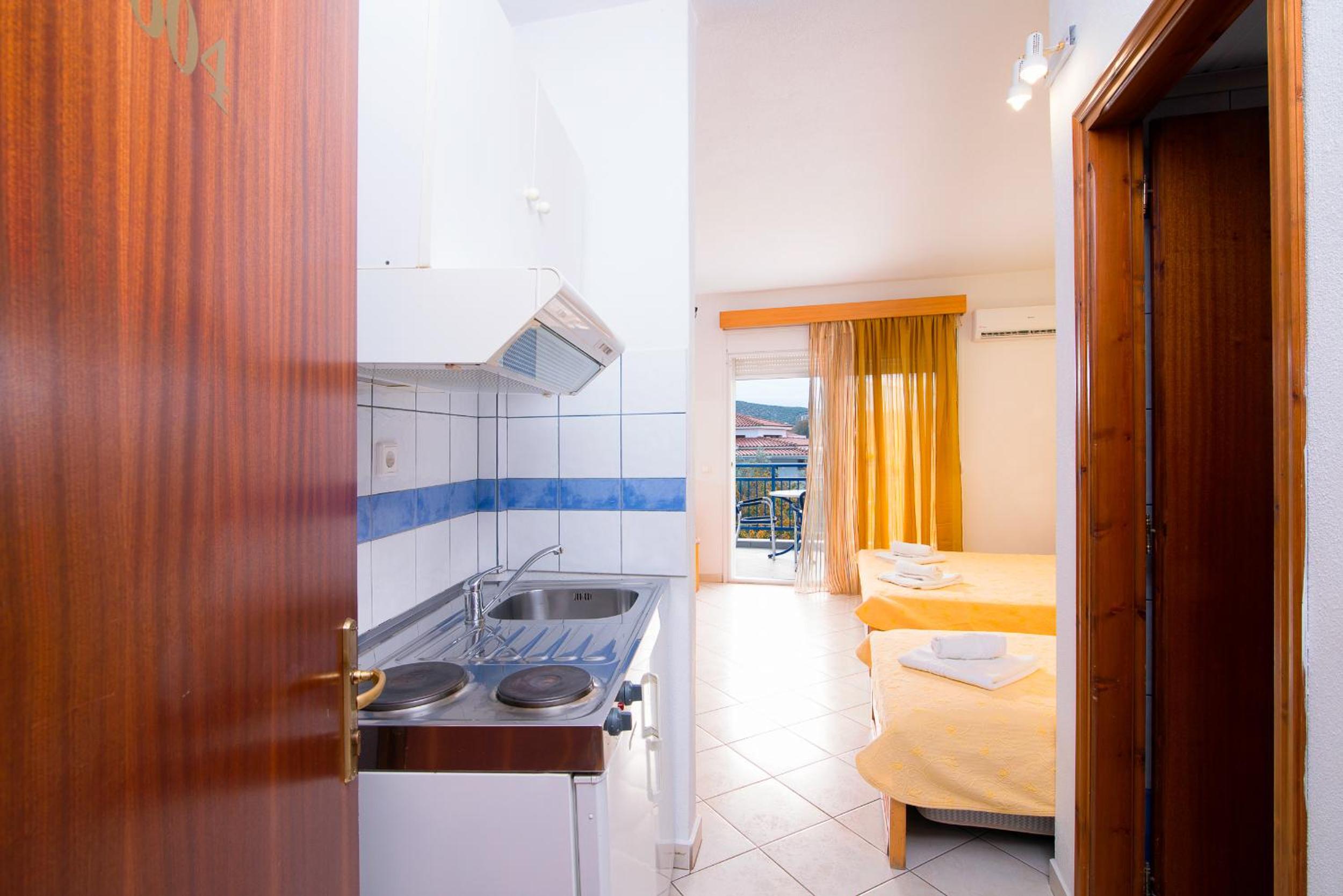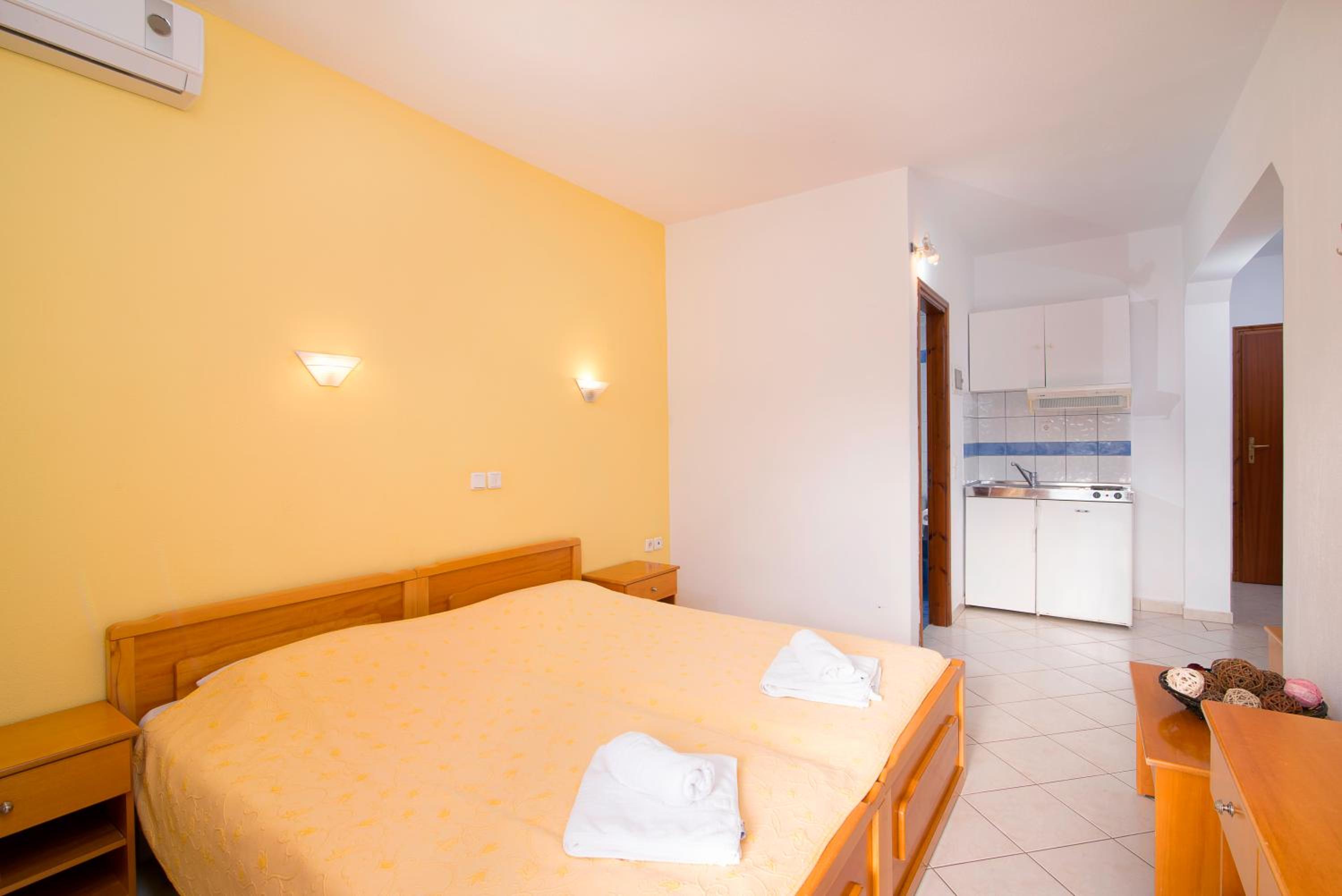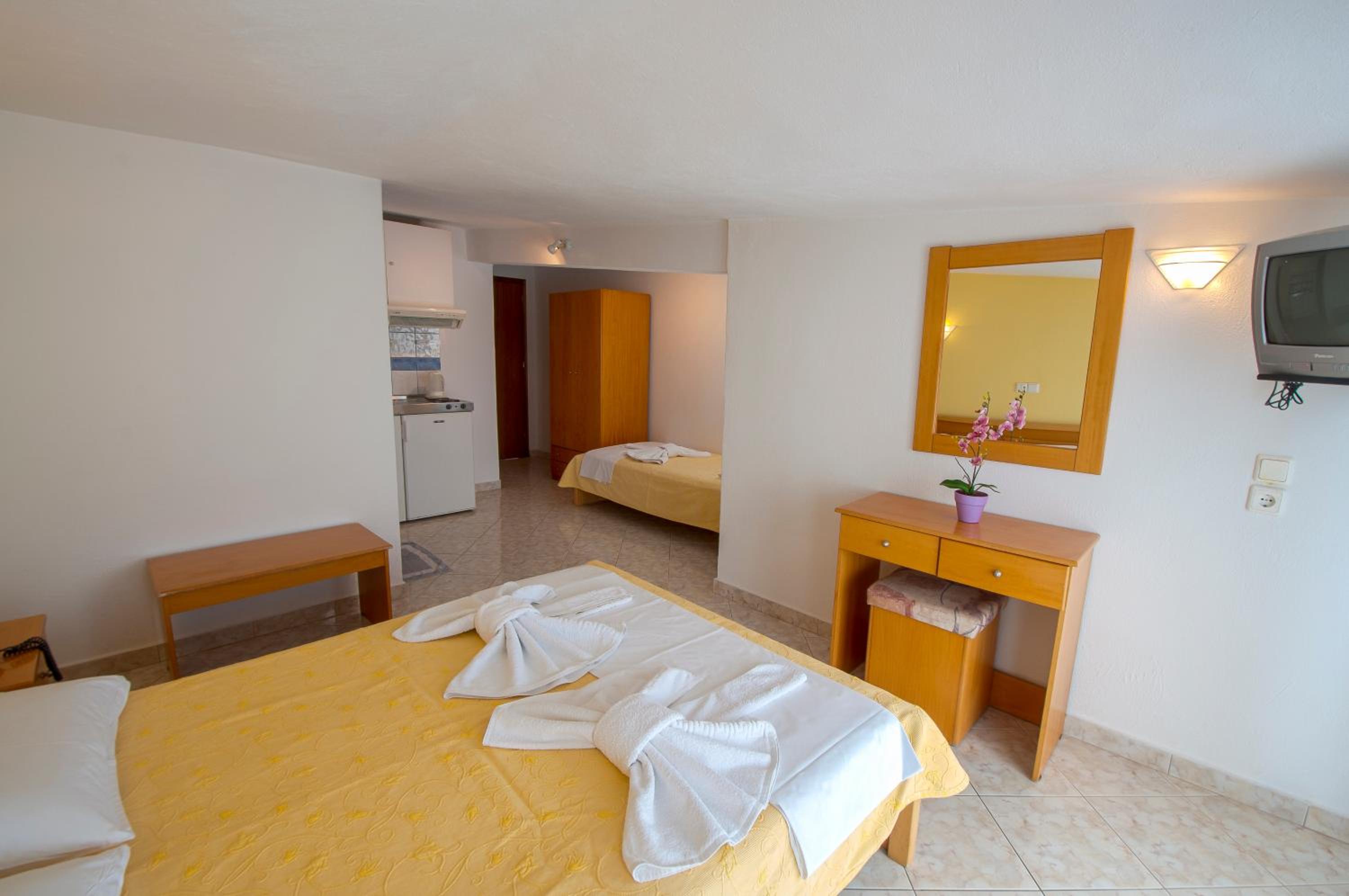 The studios and apartments at Maria are thoughtfully designed with air conditioning, wooden furnishings, and tiled floors, providing a comfortable stay. The kitchenette, TV, and private bathroom further enhance the convenience and relaxation for guests.