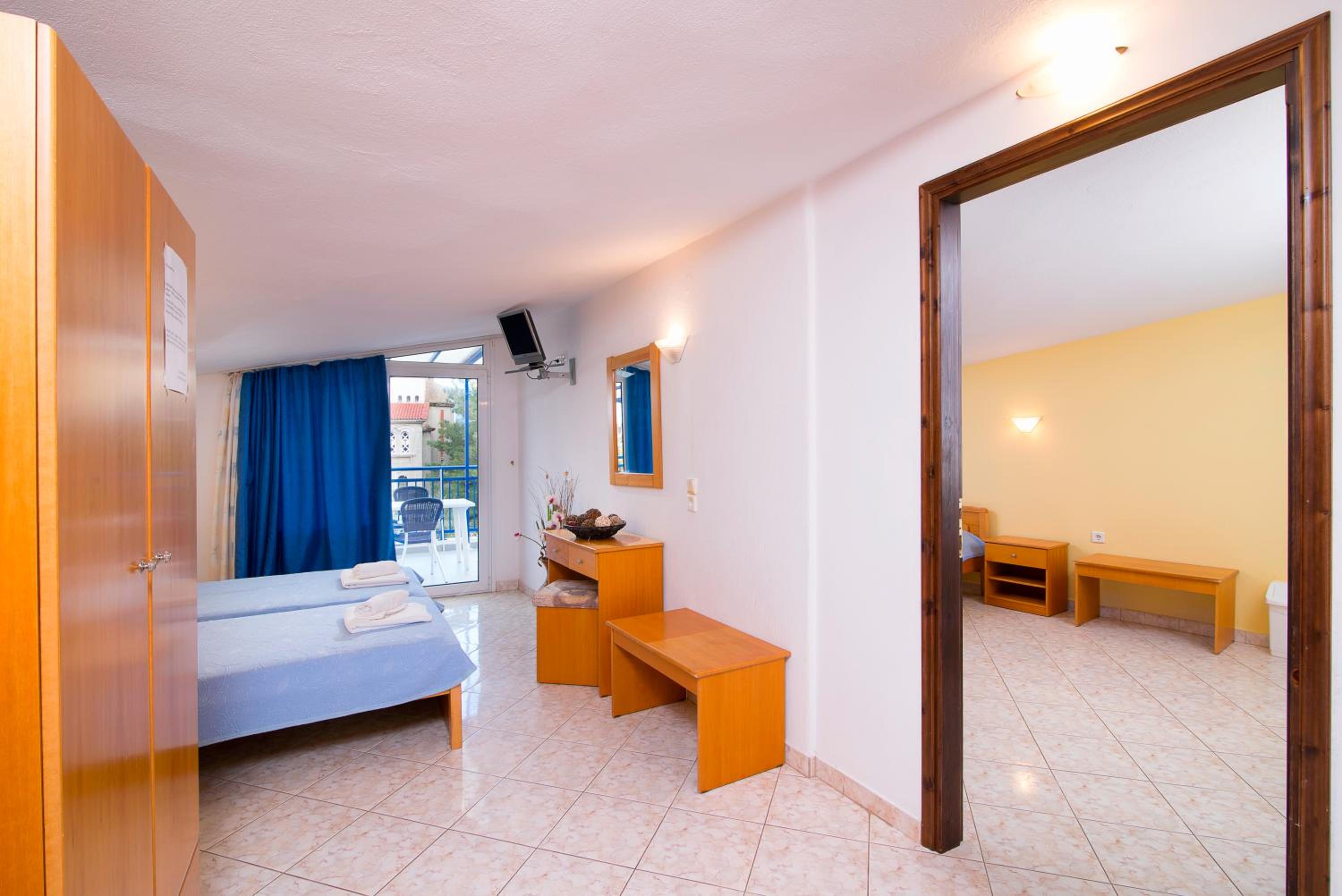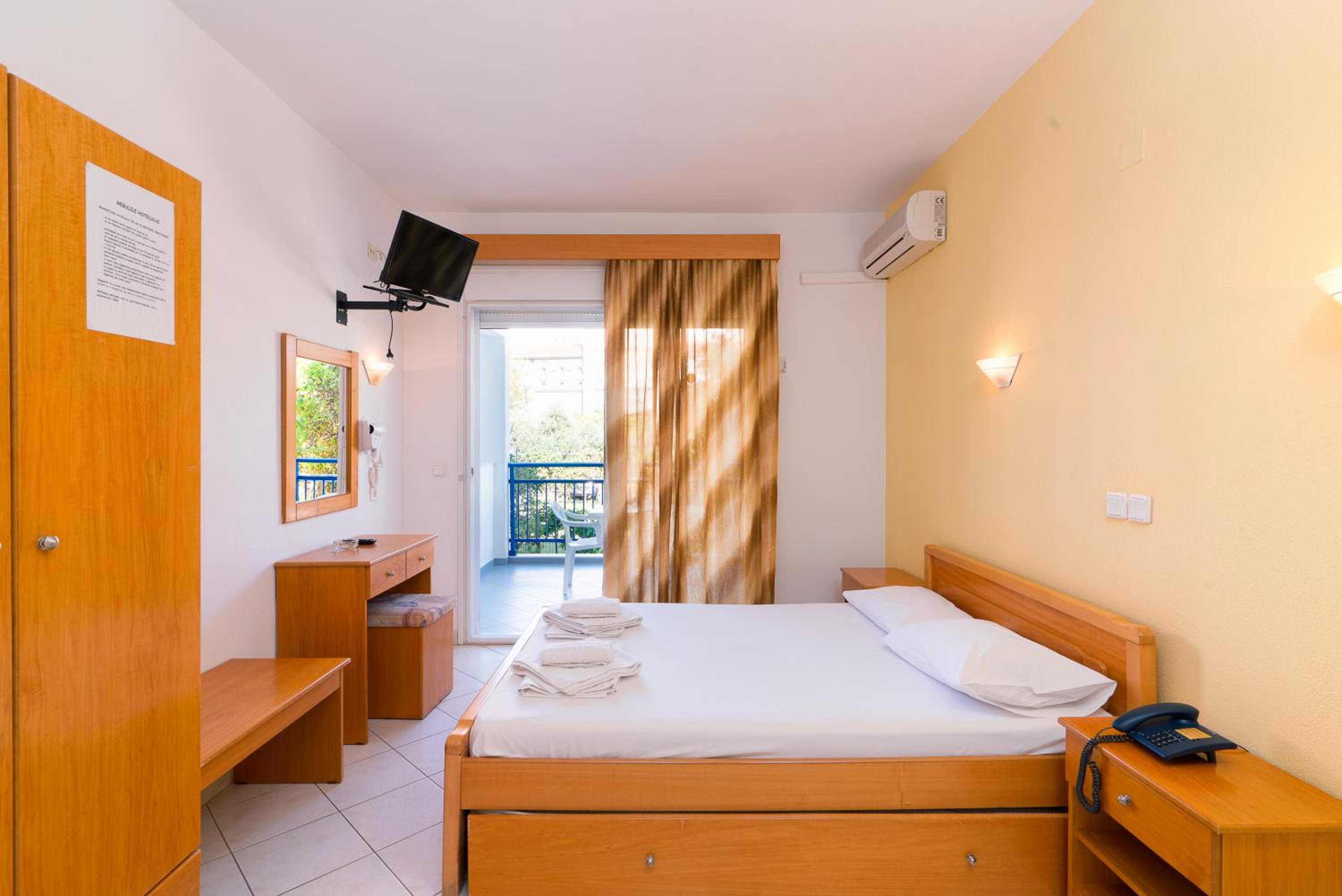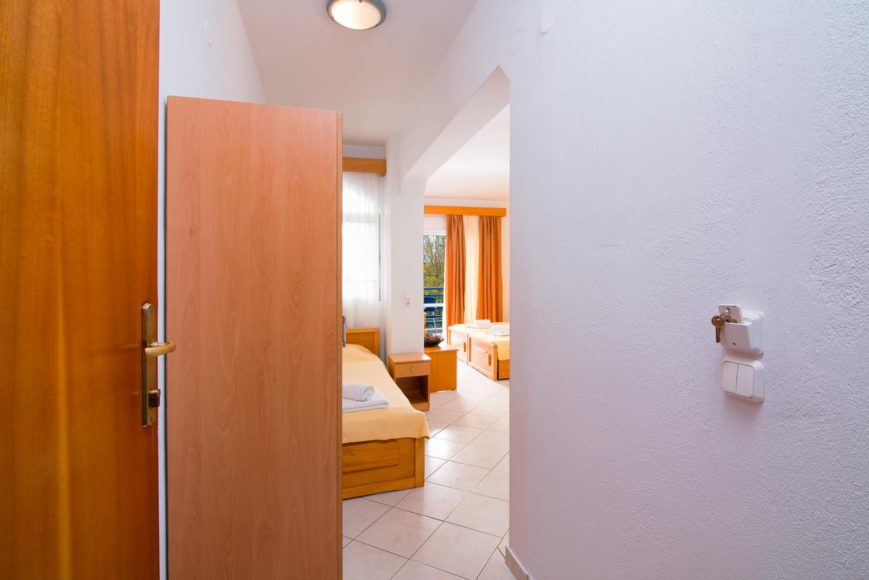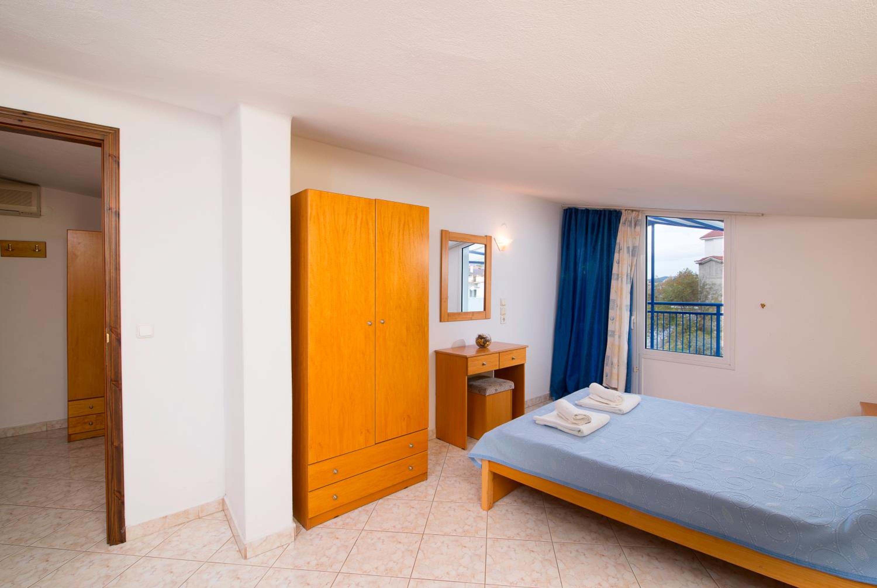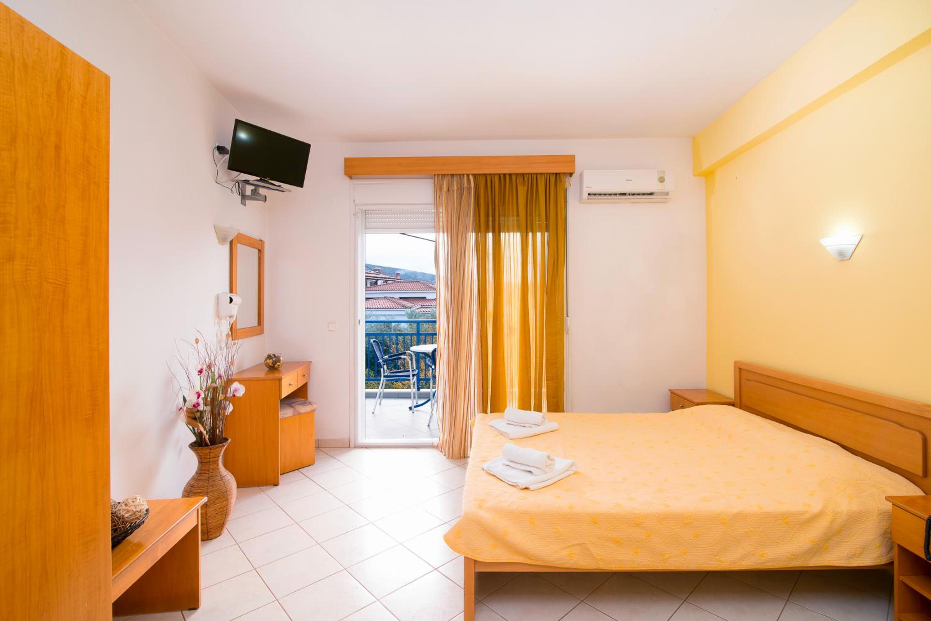 The studios and apartments at Maria are thoughtfully designed with air conditioning, wooden furnishings, and tiled floors, providing a comfortable stay. The kitchenette, TV, and private bathroom further enhance the convenience and relaxation for guests.