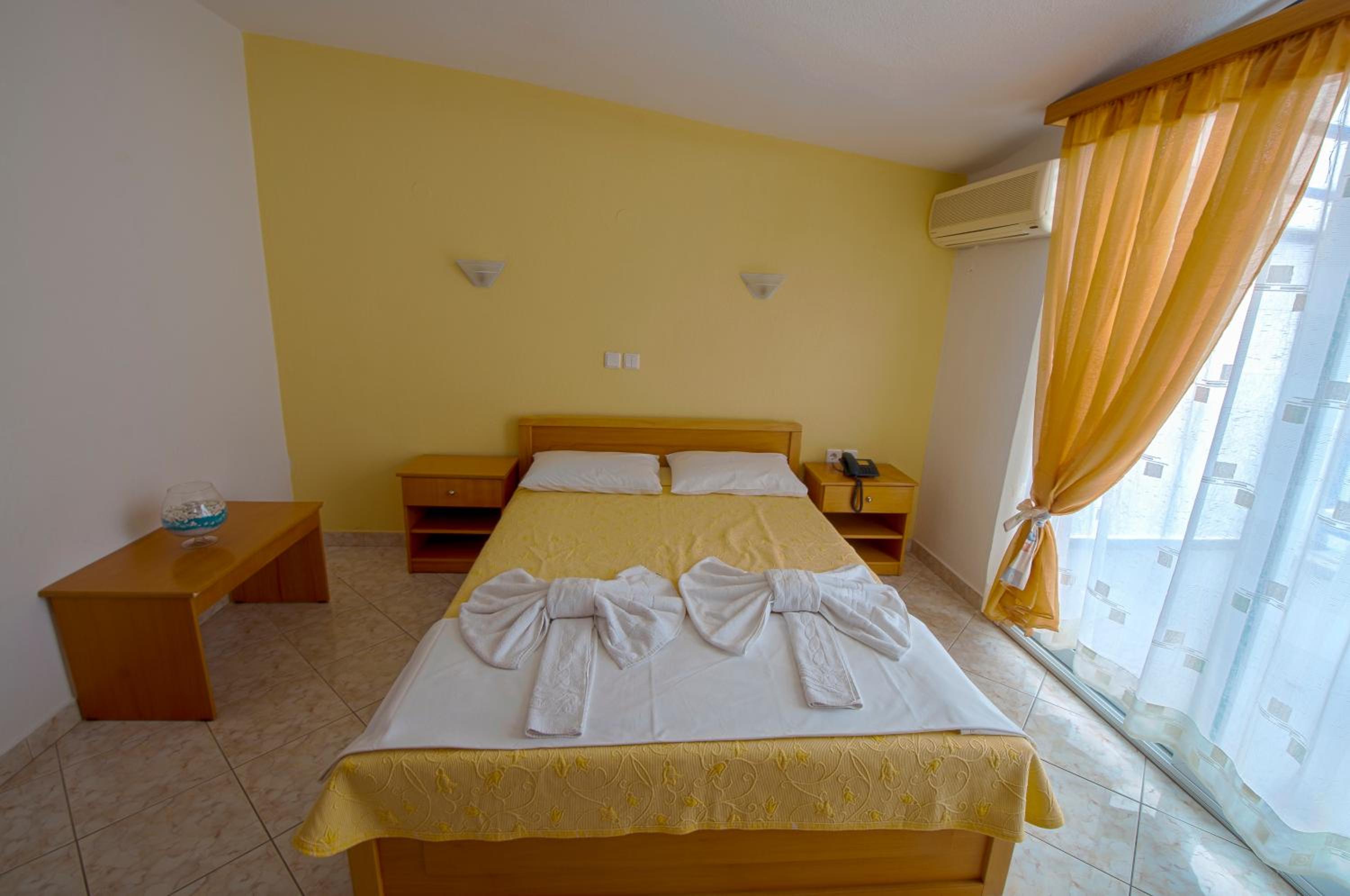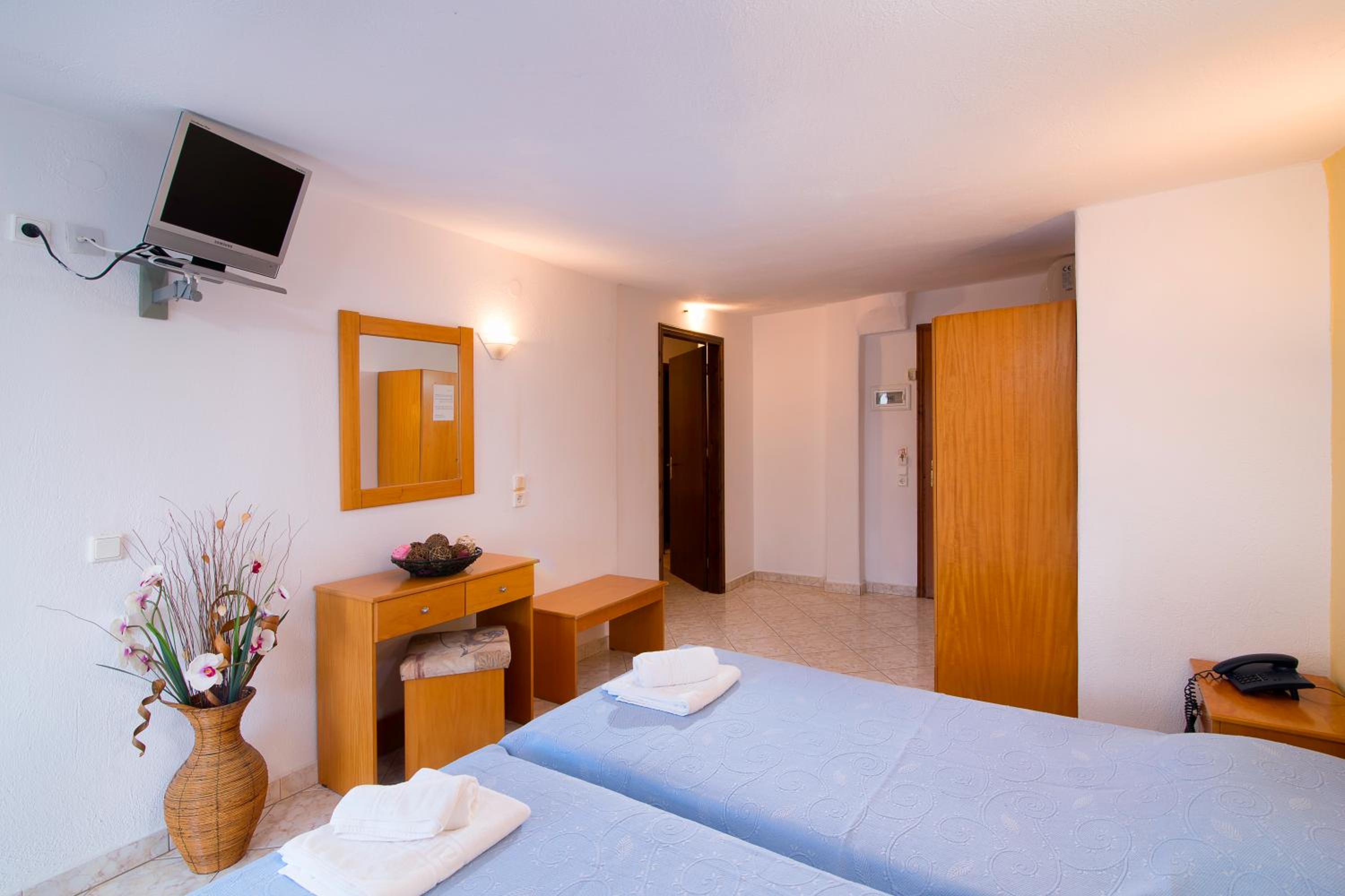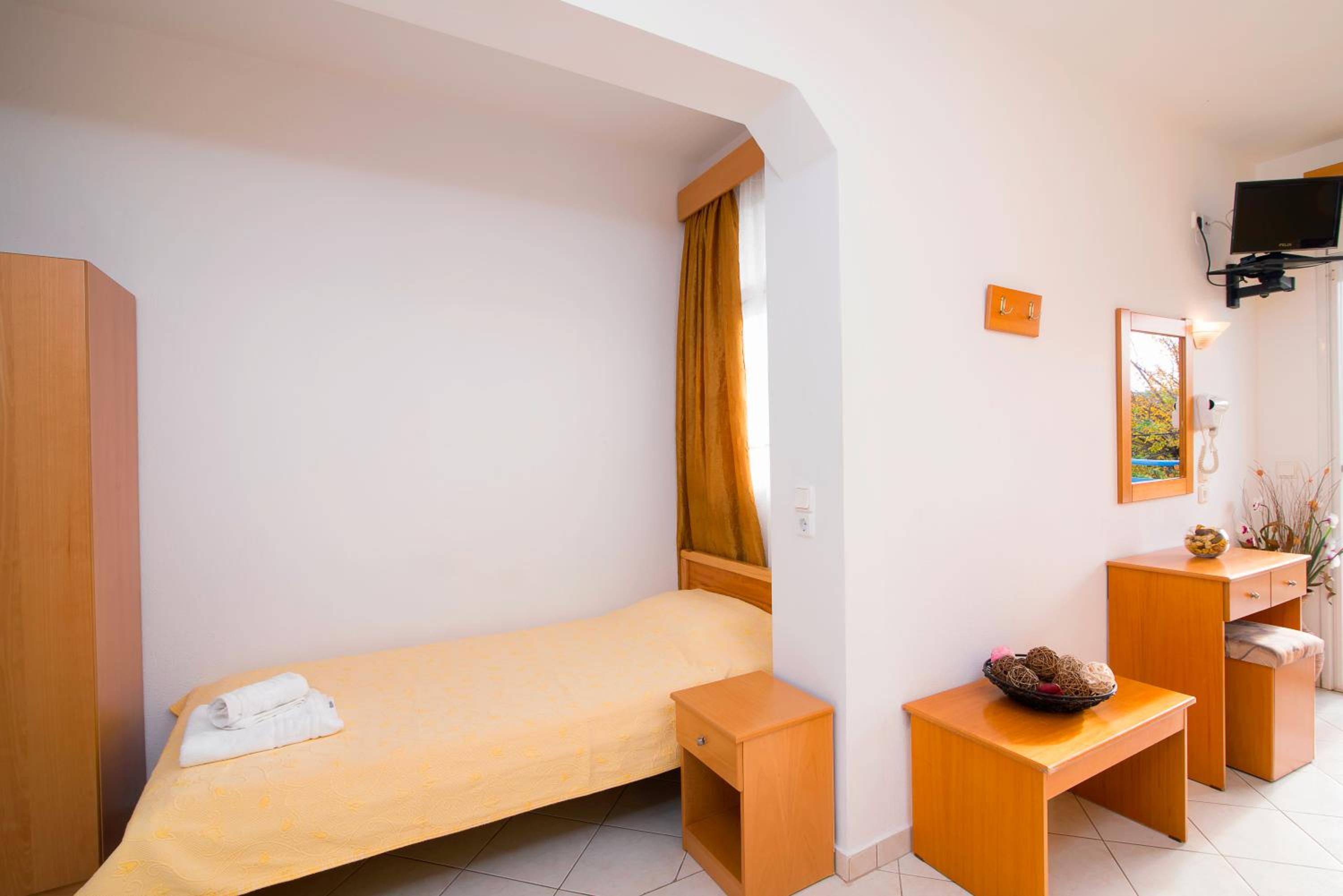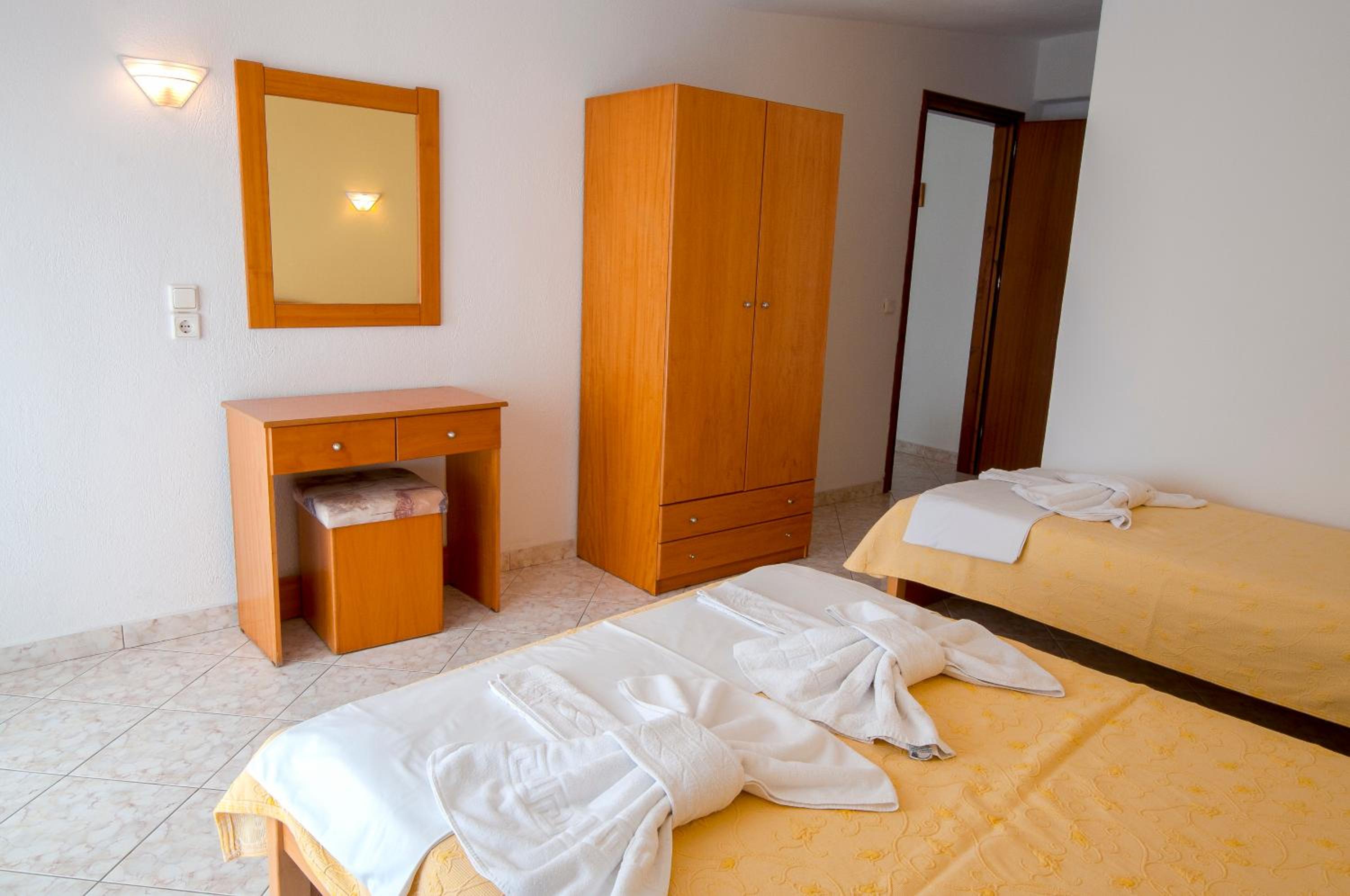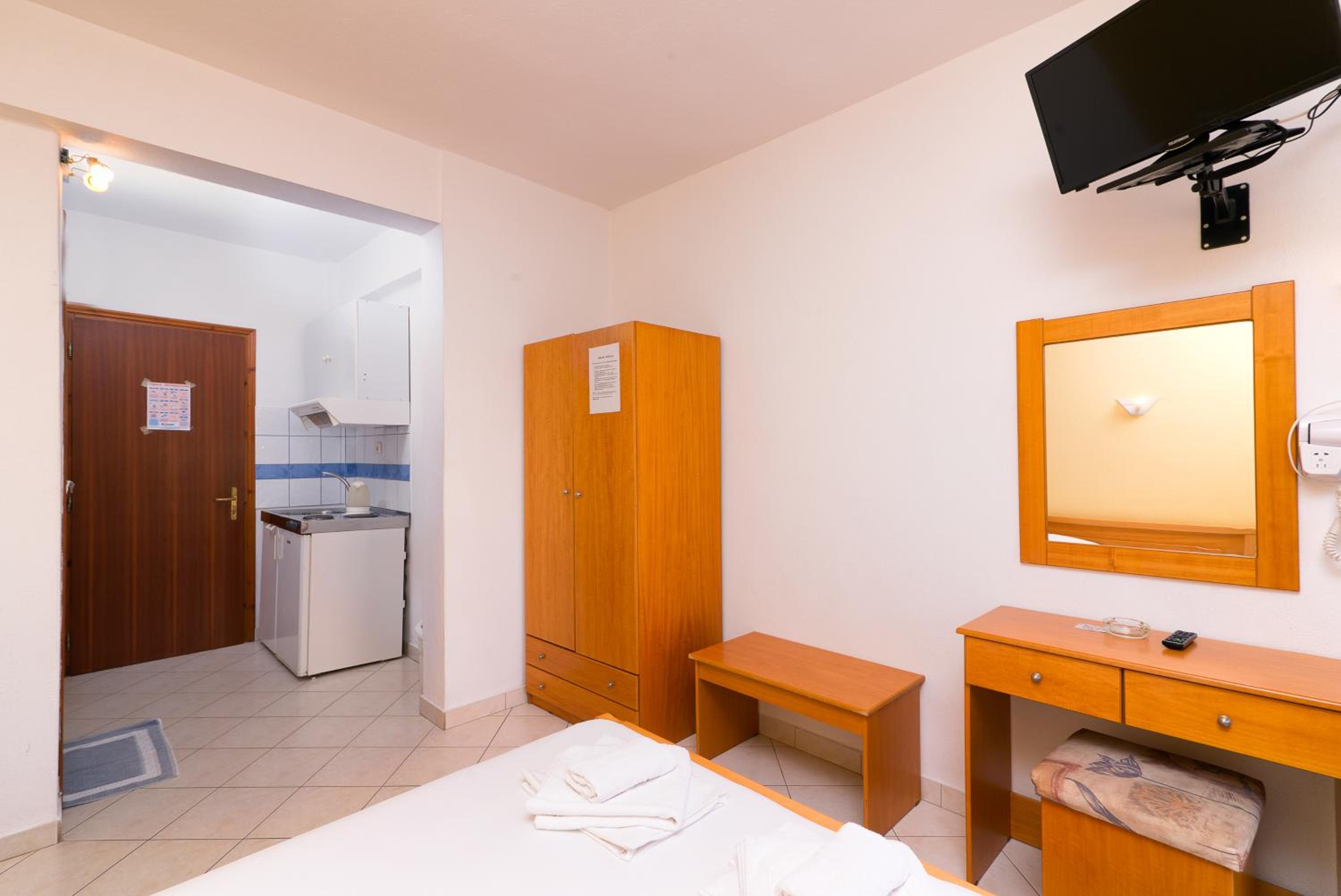 The room was at second floor, with sea view but had the roof as a mansard and was not comfortable and we can feel all the heat. We had AC but was not so well positioned so we couldnt use it too long during the night. The bed was 140 with 200 which was rather small for us, as adults and the pillows and maitress were very hard and we can not sleep and rest so well. The door to the balcony was not opening so easy and in the bathroom was a very noisy ventilator. The furniture was old and not so well equipped. The water from the kitchen sink was only cold.
