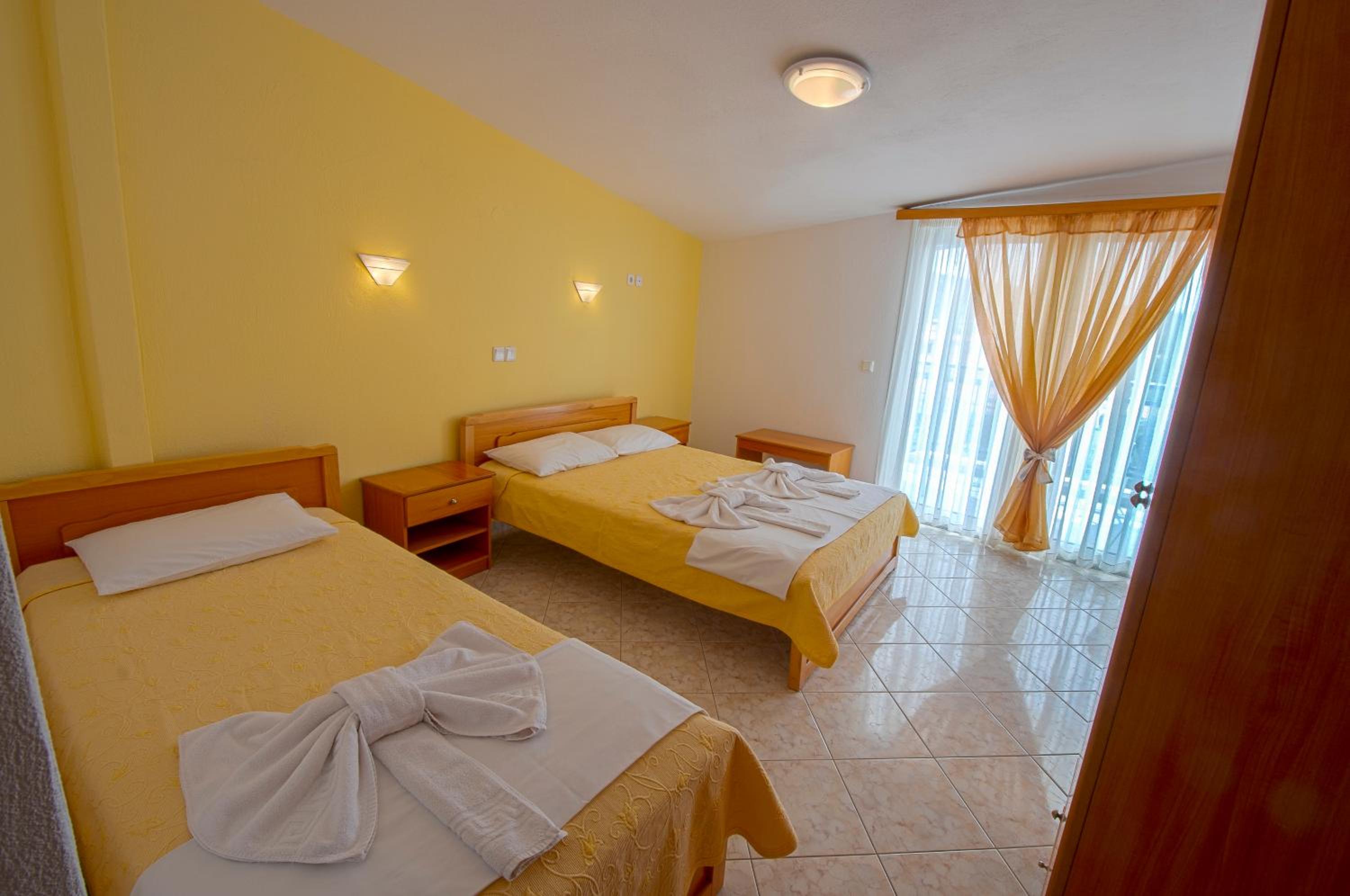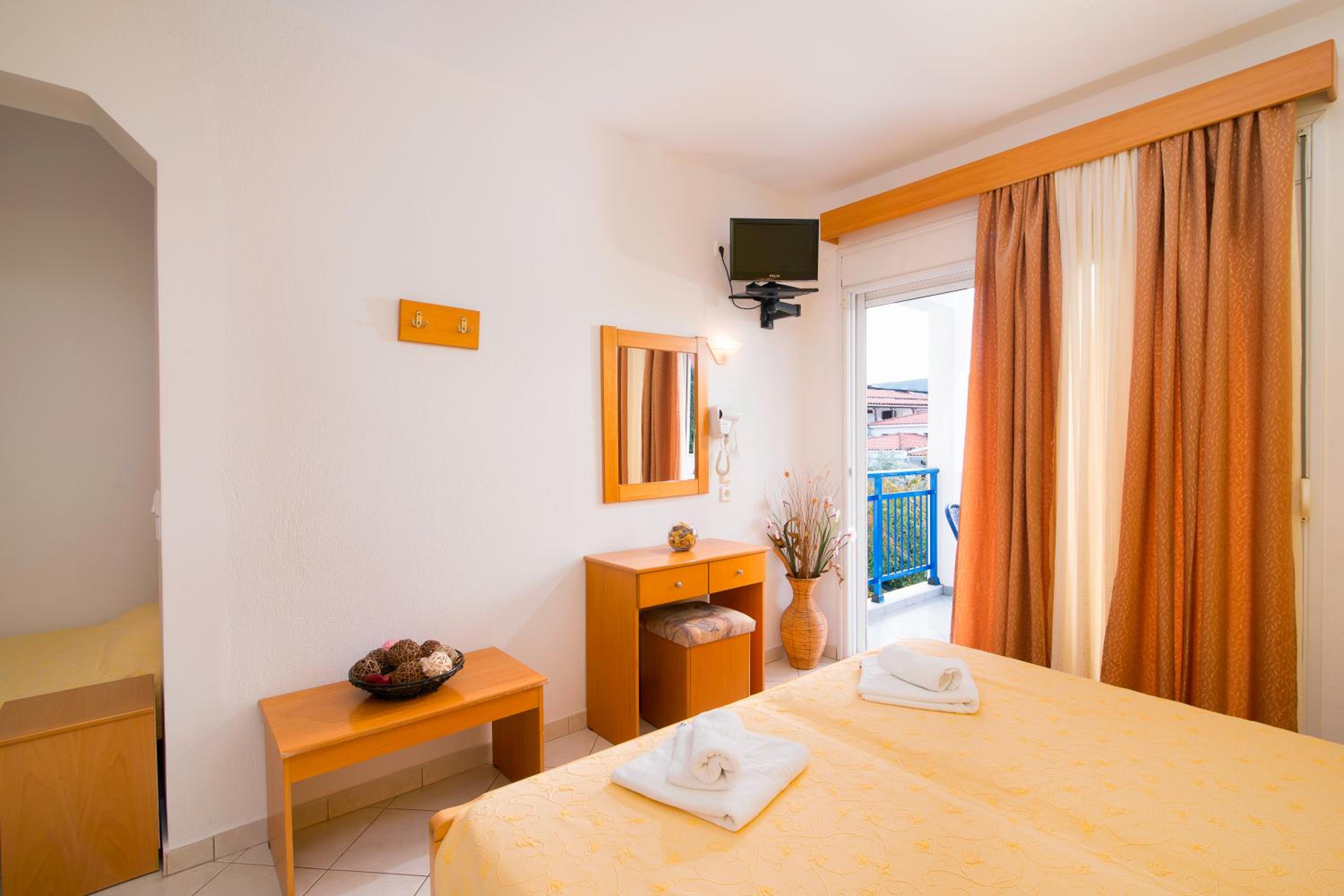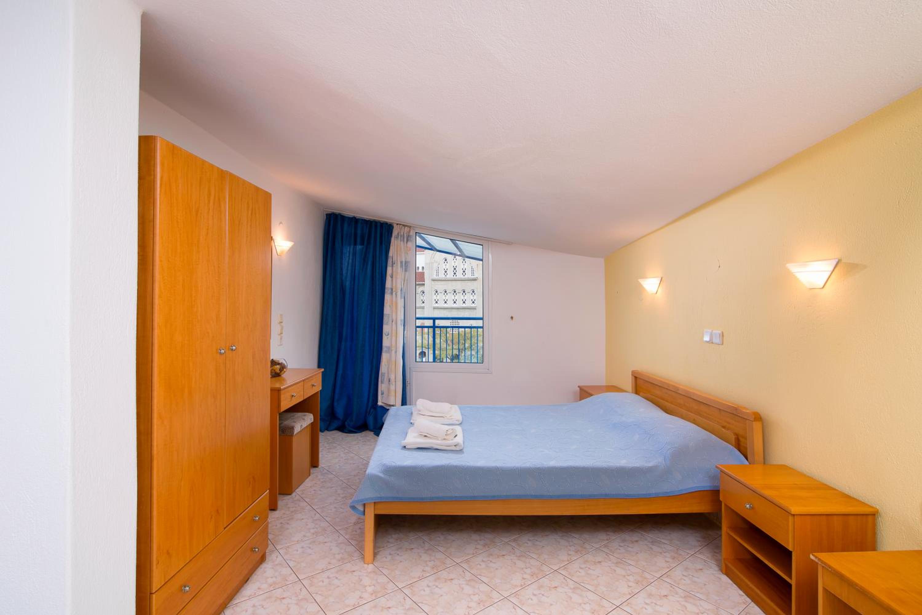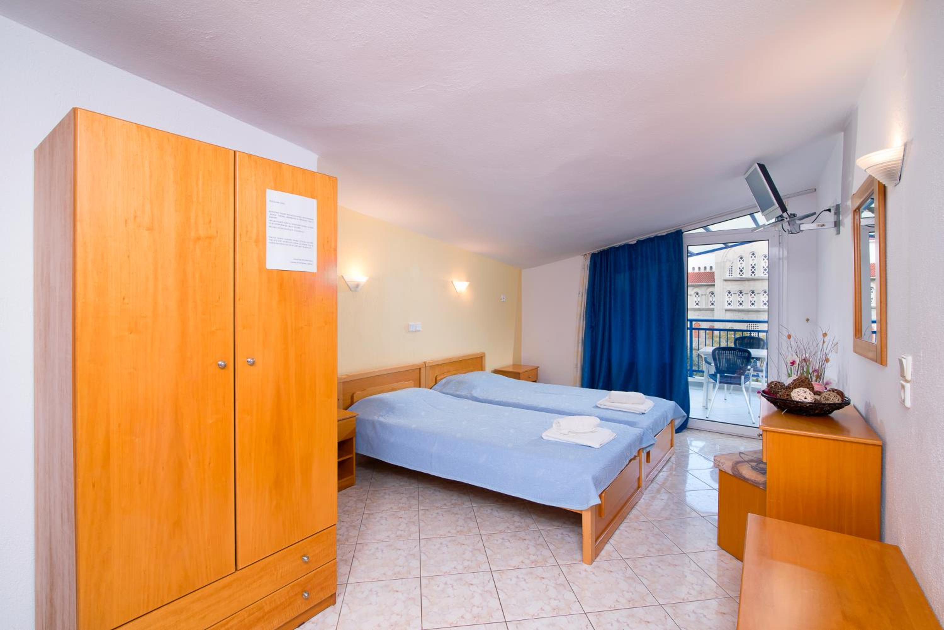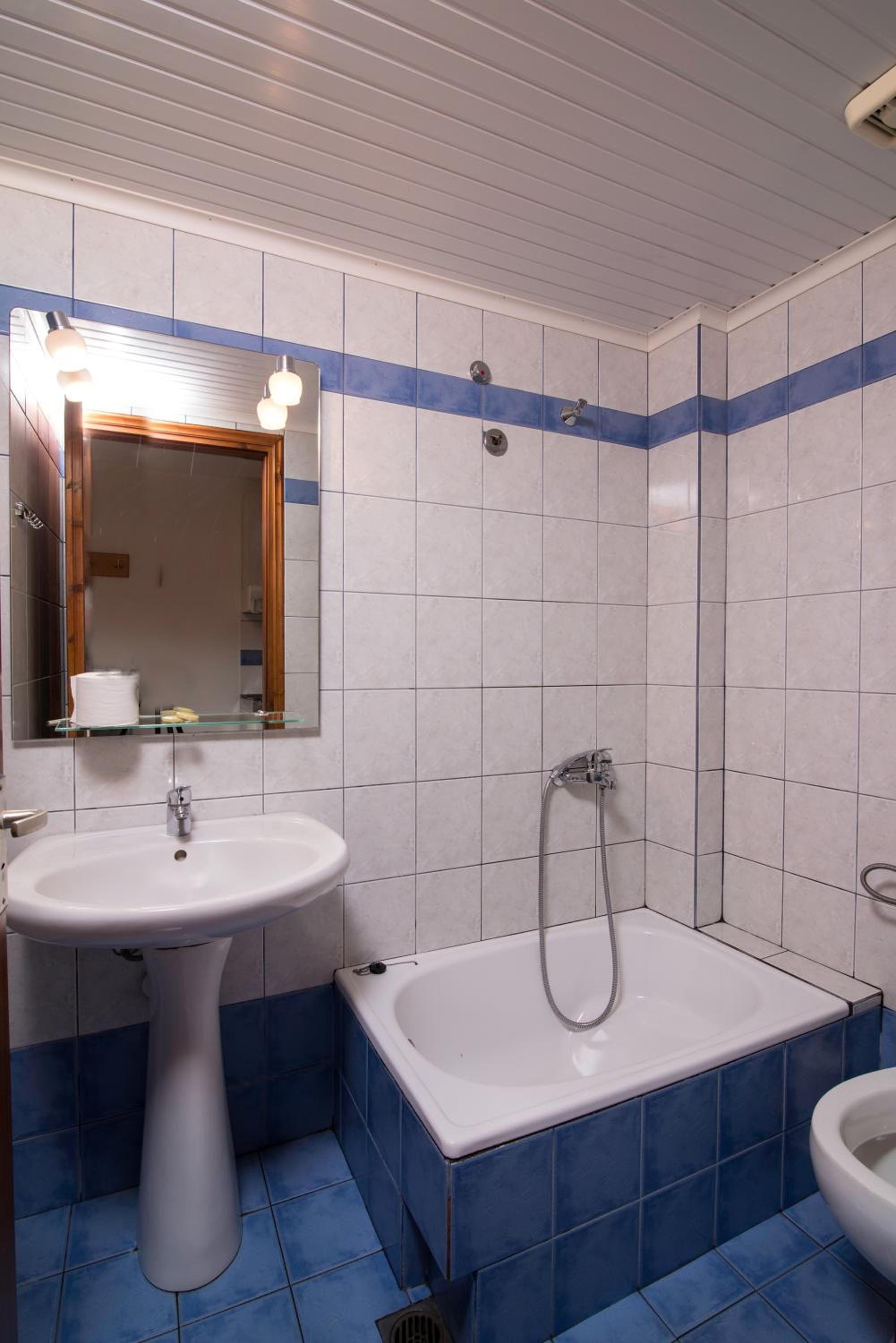 The room was at second floor, with sea view but had the roof as a mansard and was not comfortable and we can feel all the heat. We had AC but was not so well positioned so we couldnt use it too long during the night. The bed was 140 with 200 which was rather small for us, as adults and the pillows and maitress were very hard and we can not sleep and rest so well. The door to the balcony was not opening so easy and in the bathroom was a very noisy ventilator. The furniture was old and not so well equipped. The water from the kitchen sink was only cold.