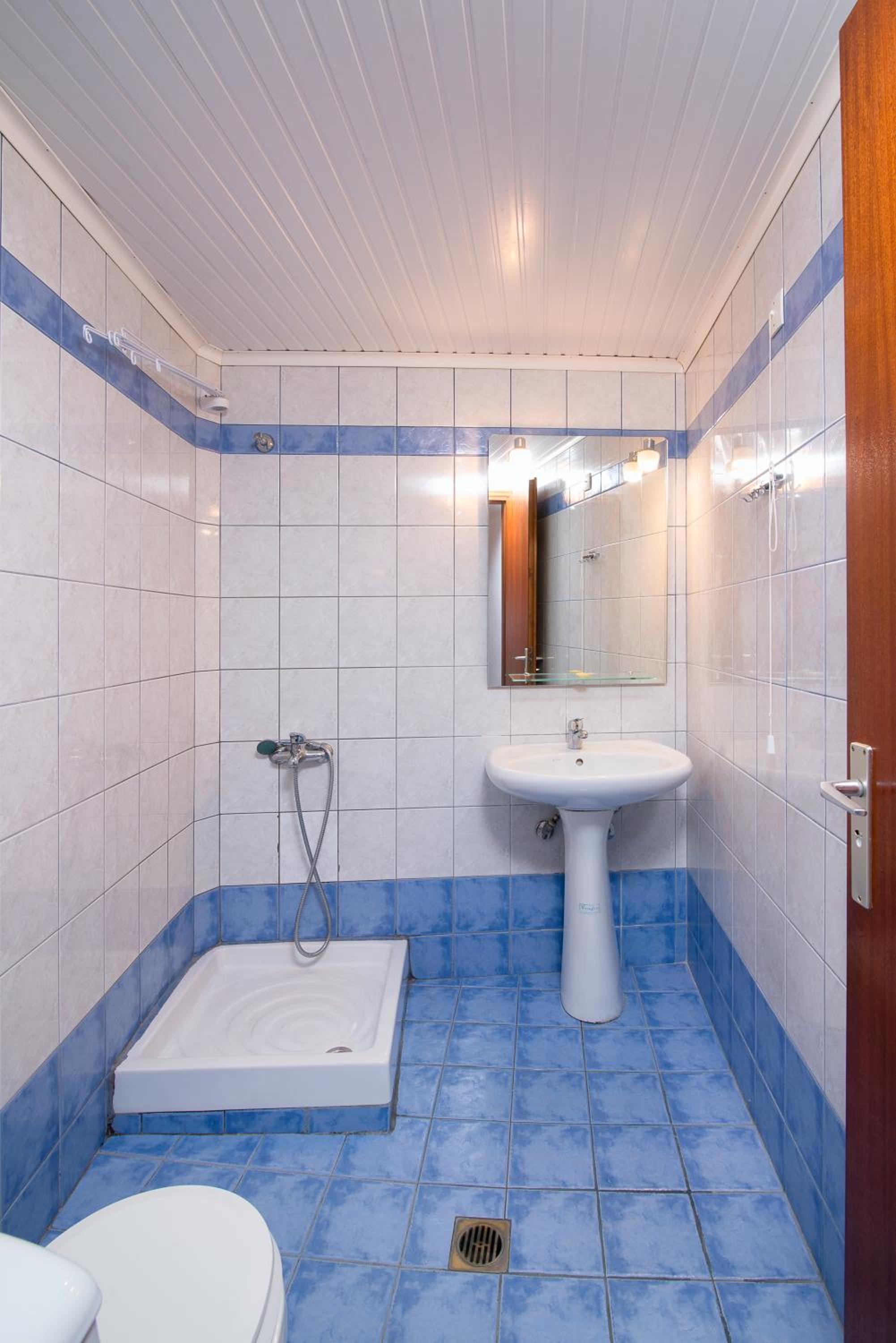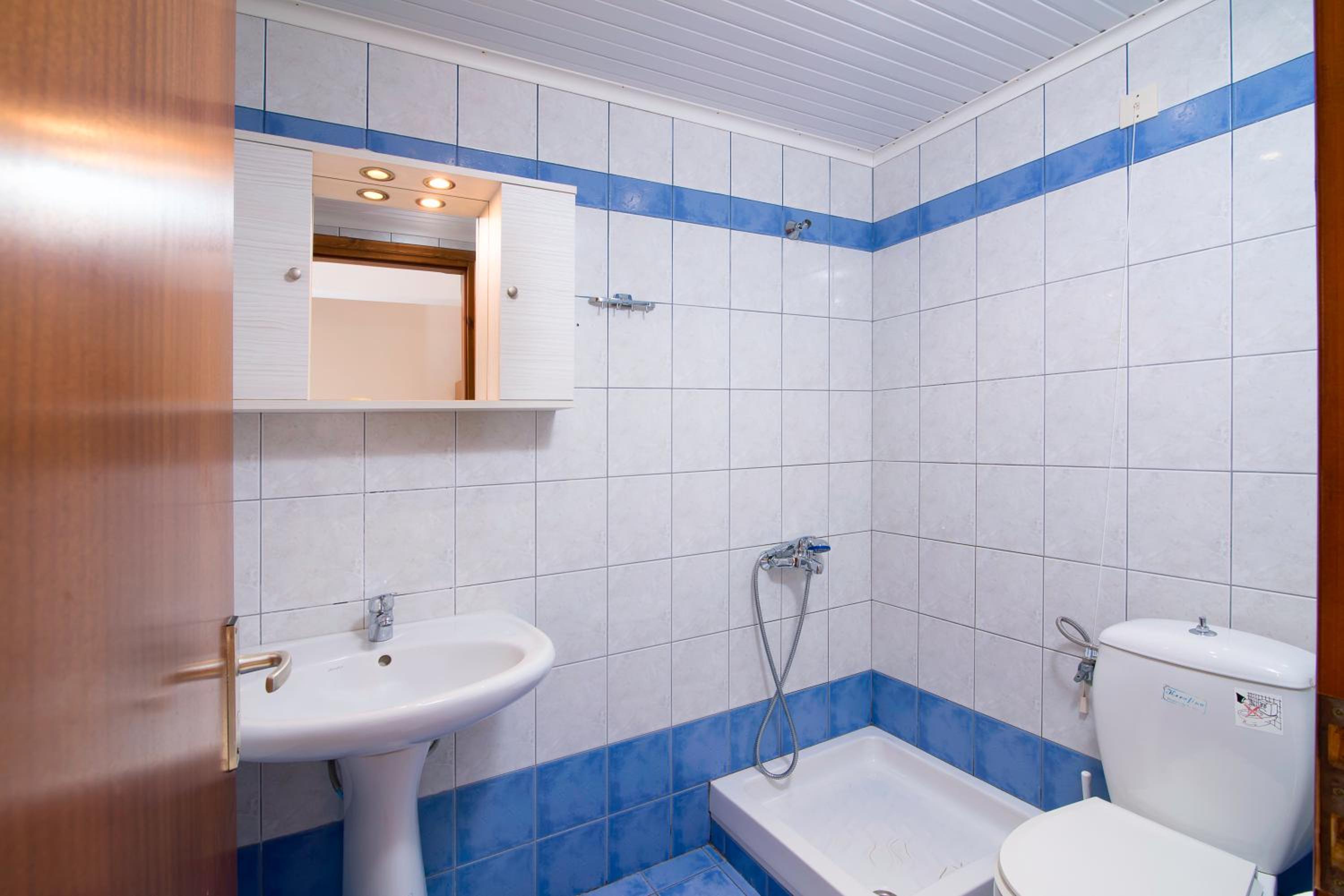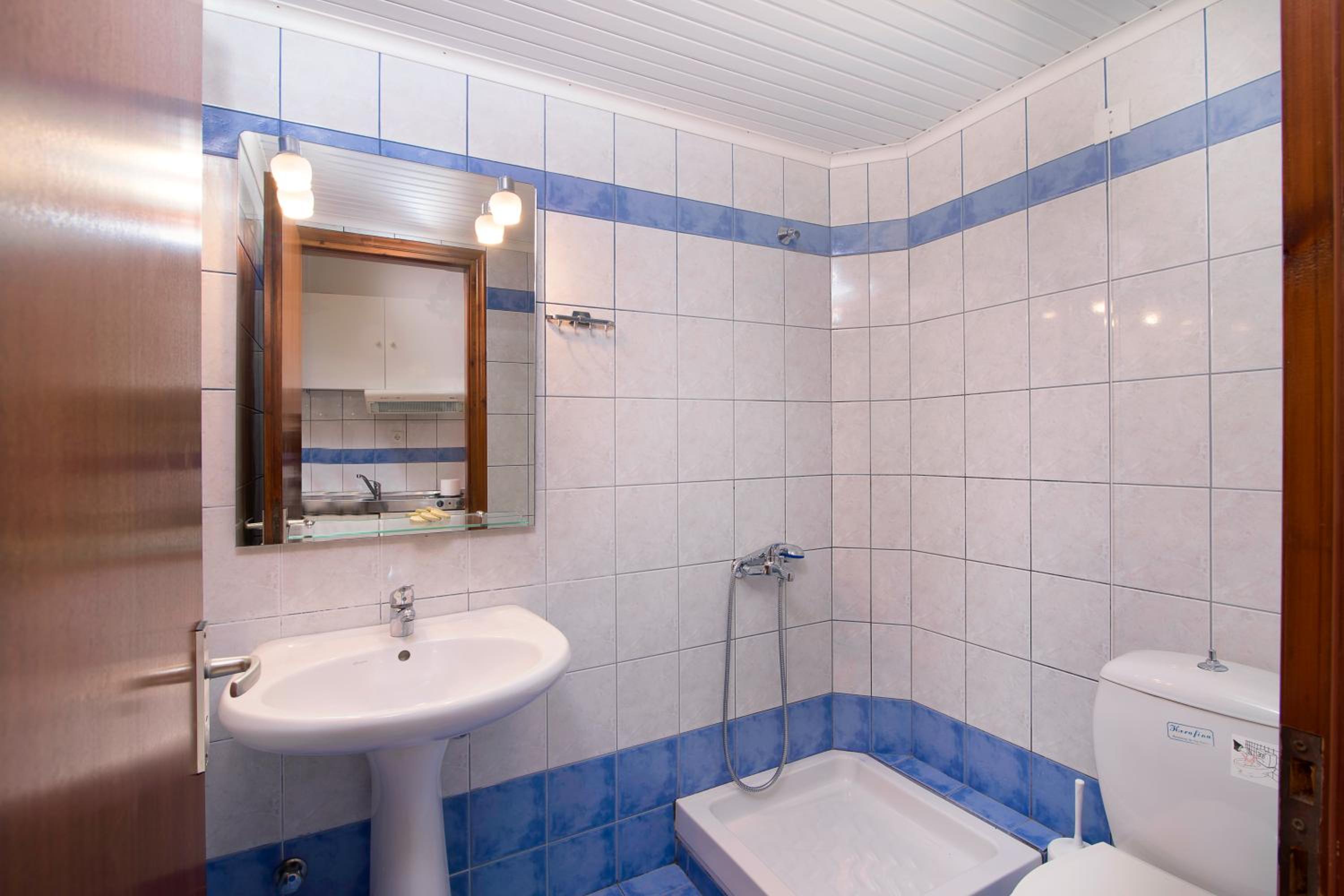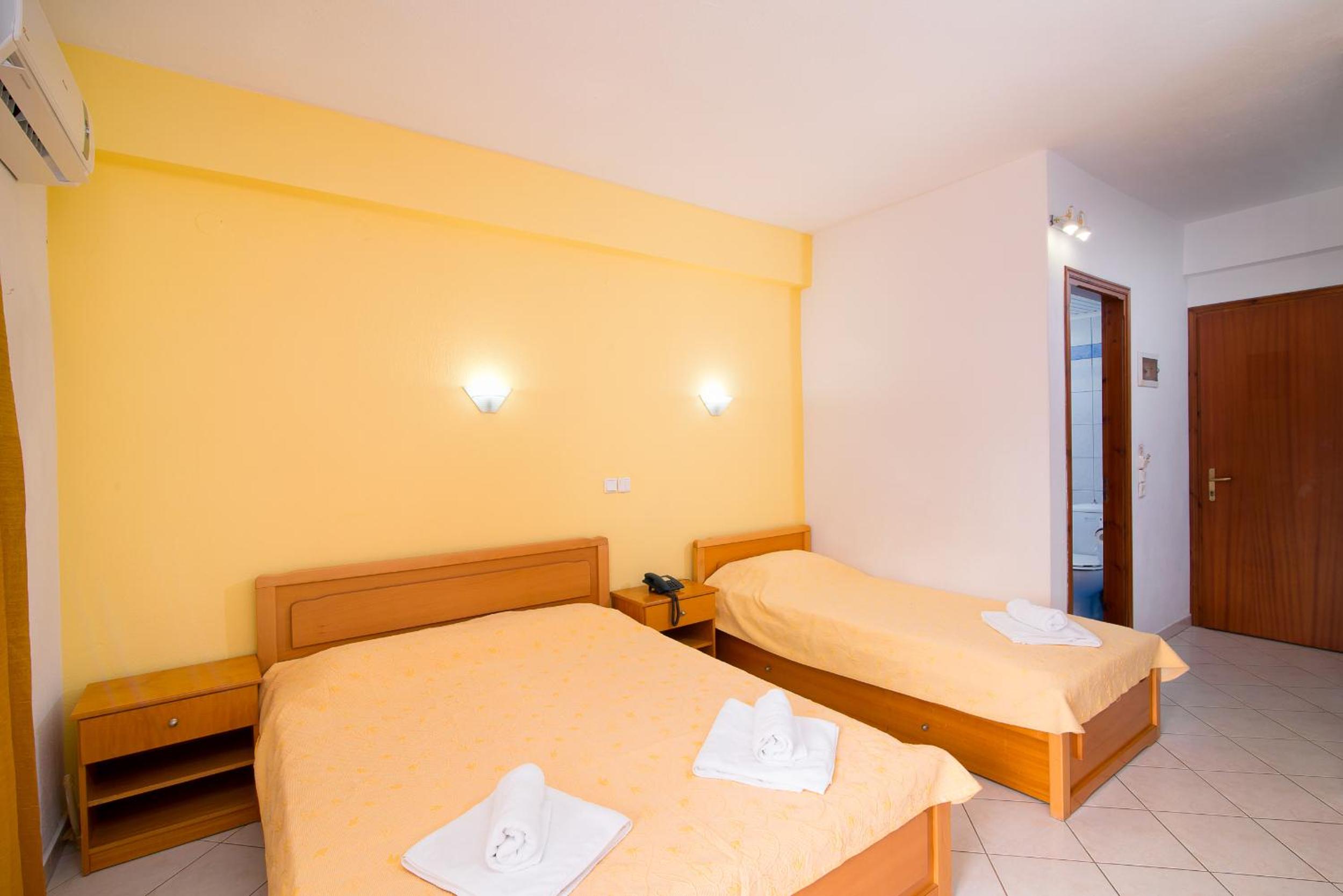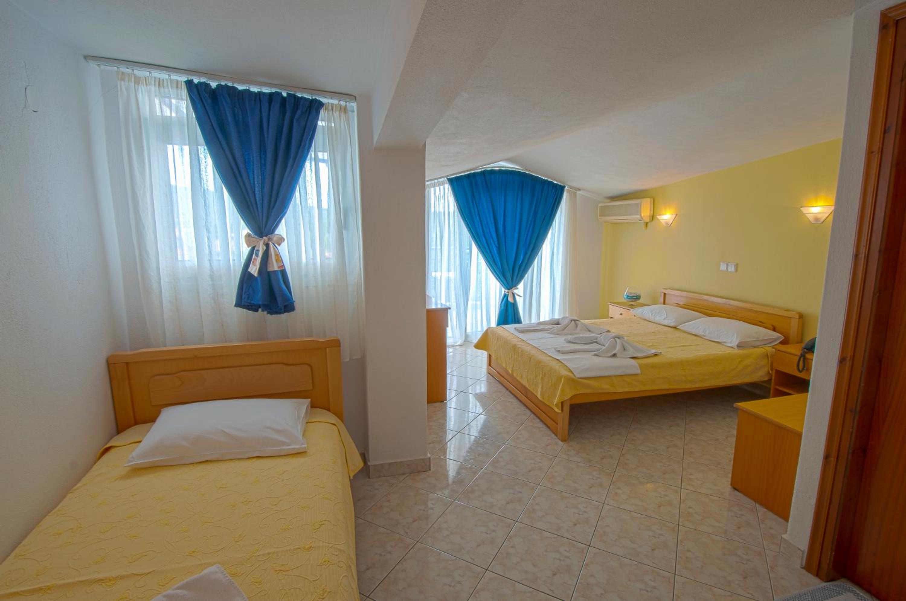 The room was at second floor, with sea view but had the roof as a mansard and was not comfortable and we can feel all the heat. We had AC but was not so well positioned so we couldnt use it too long during the night. The bed was 140 with 200 which was rather small for us, as adults and the pillows and maitress were very hard and we can not sleep and rest so well. The door to the balcony was not opening so easy and in the bathroom was a very noisy ventilator. The furniture was old and not so well equipped. The water from the kitchen sink was only cold.