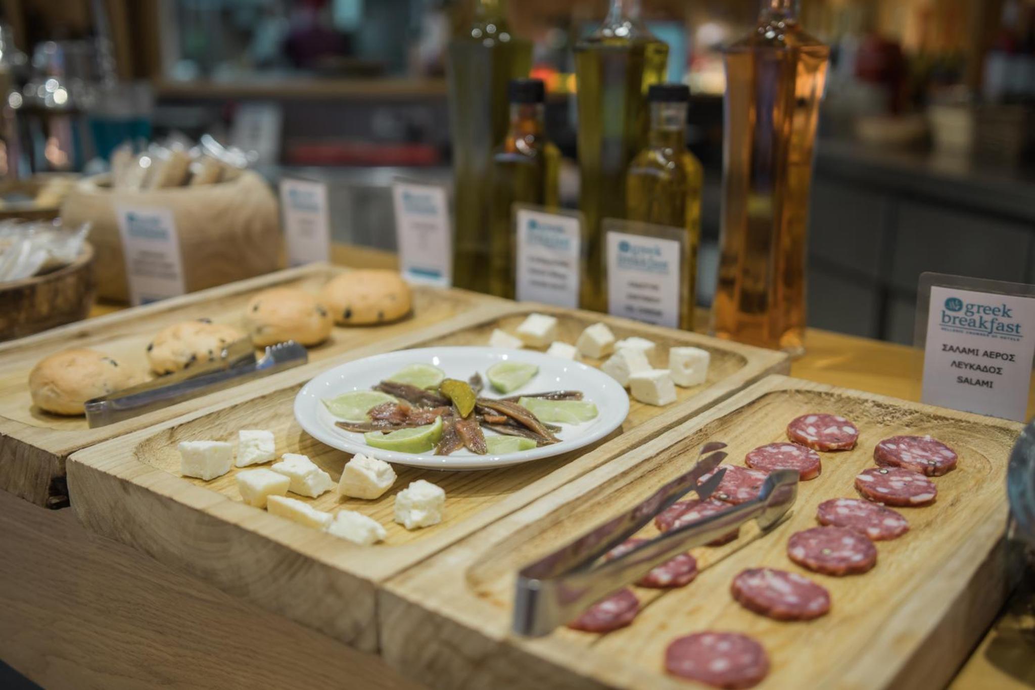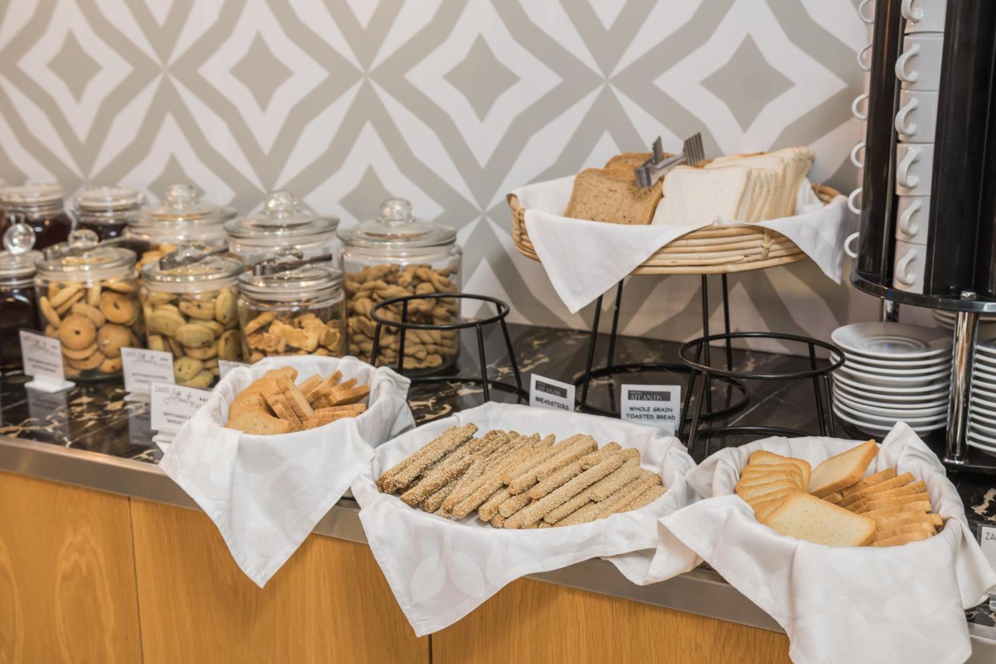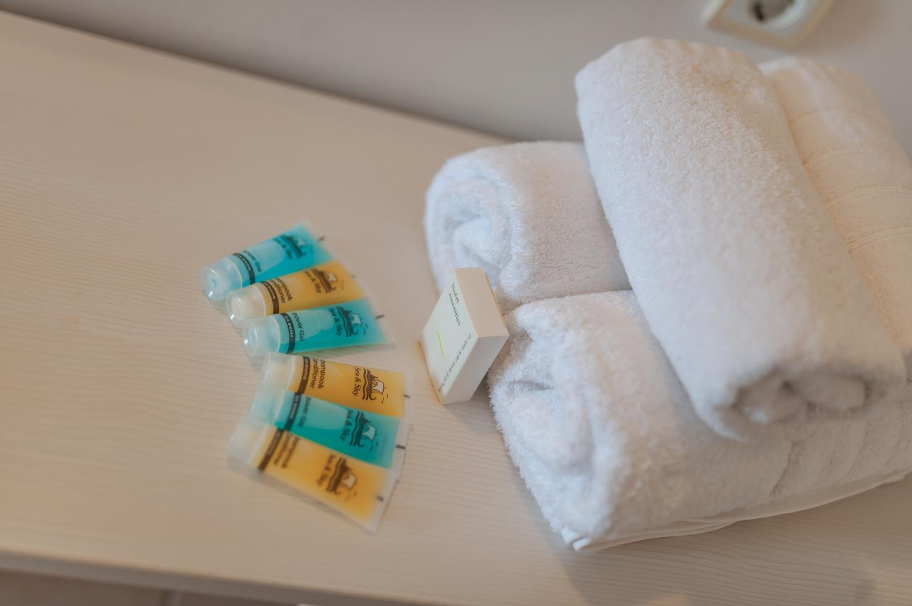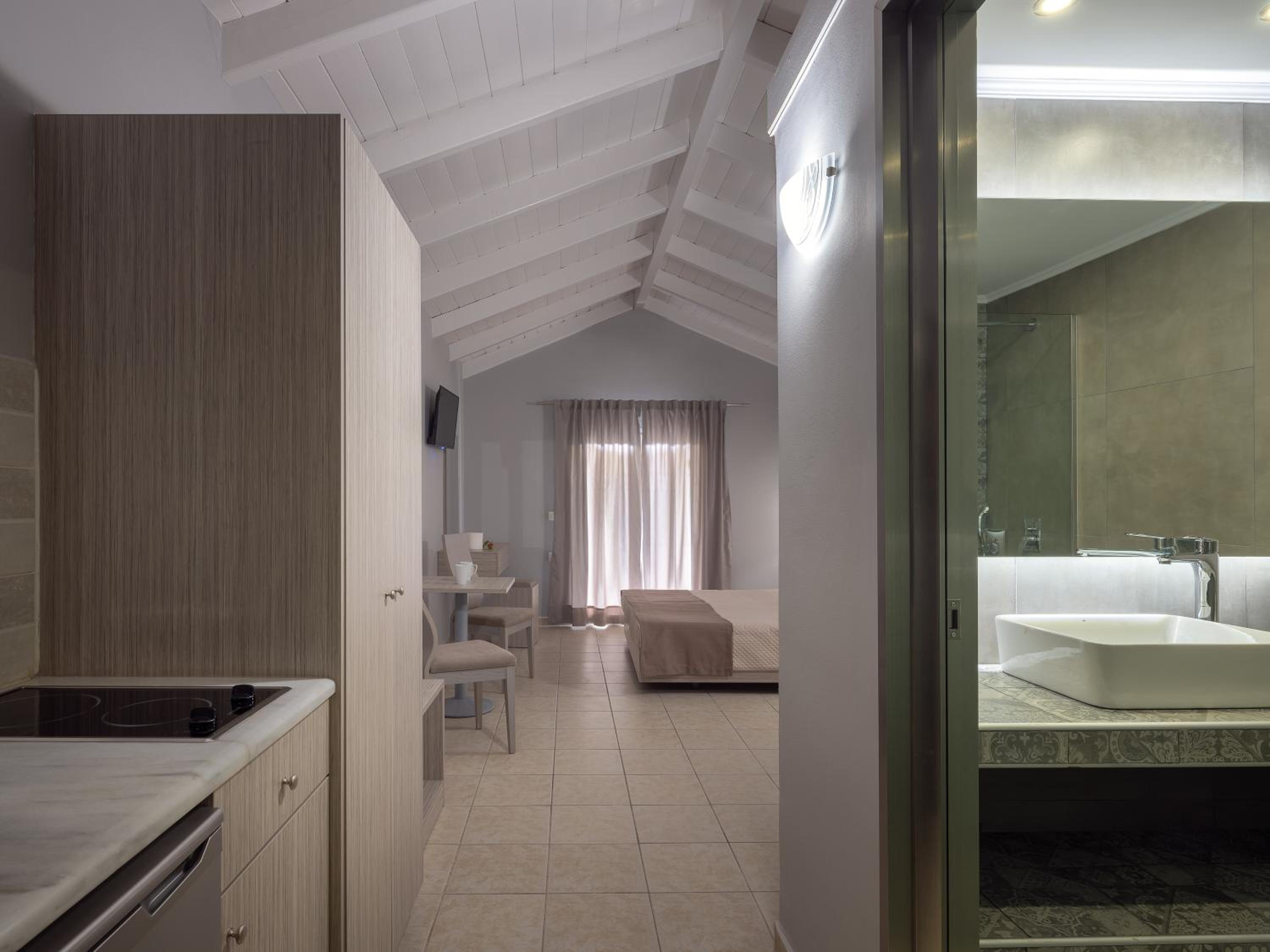Room was small, we got "upgraded" to a deluxe twin/double (instead of the studio with kitchenette we were expecting and not much room to manoeuvre around the sharp corners of the bed and so have two lovely bruises on my shins. Storage lacking as no drawers so all clothing on display. The bathroom was typically Greek in that everything got soaked!! Shower was excellent though, despite the water everywhere and the glass door meant the light from the corridors lit up the room throughout the night on and off. Ordering drinks and food from a McDonalds type ordering system and card only was not great.