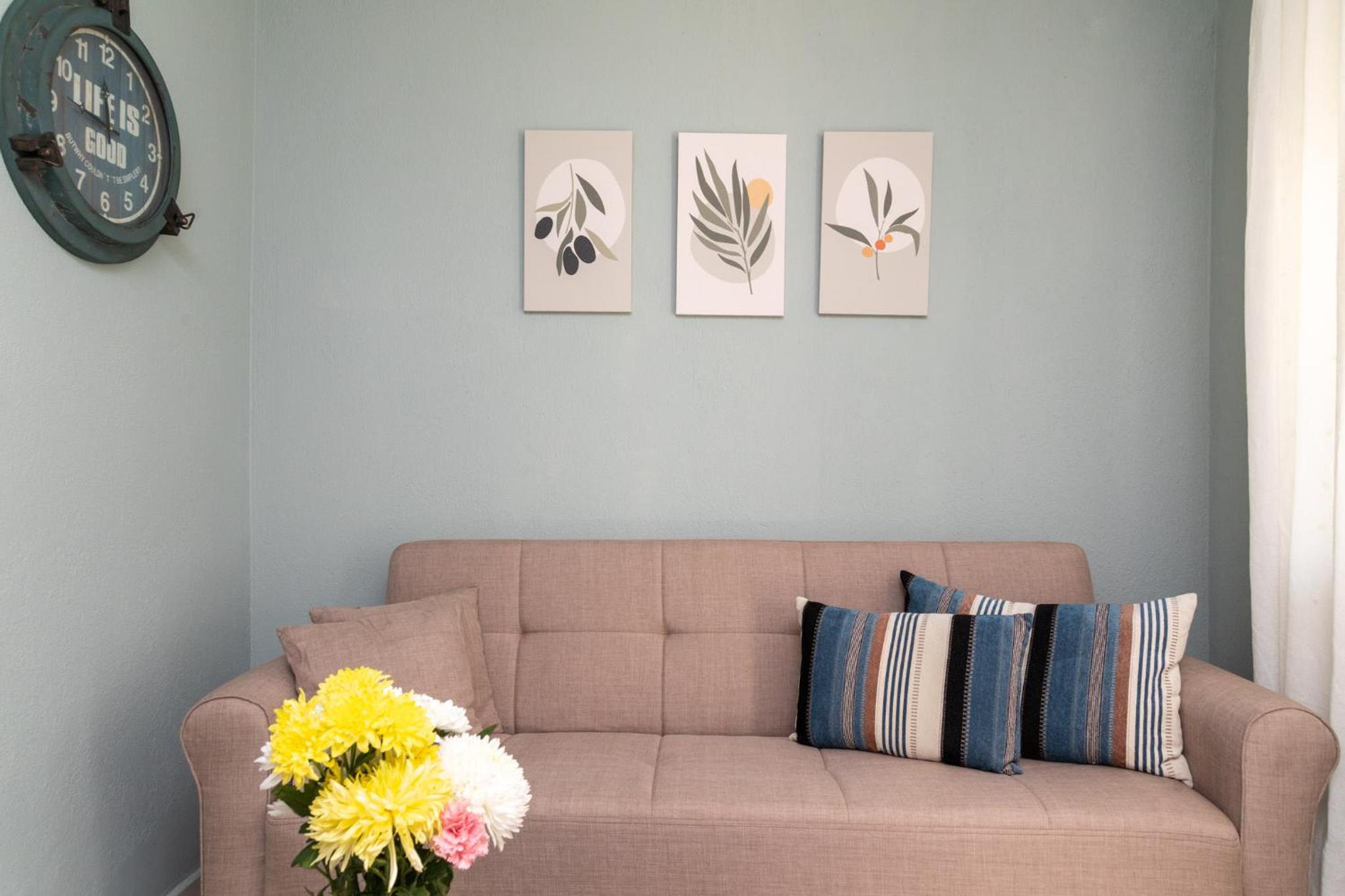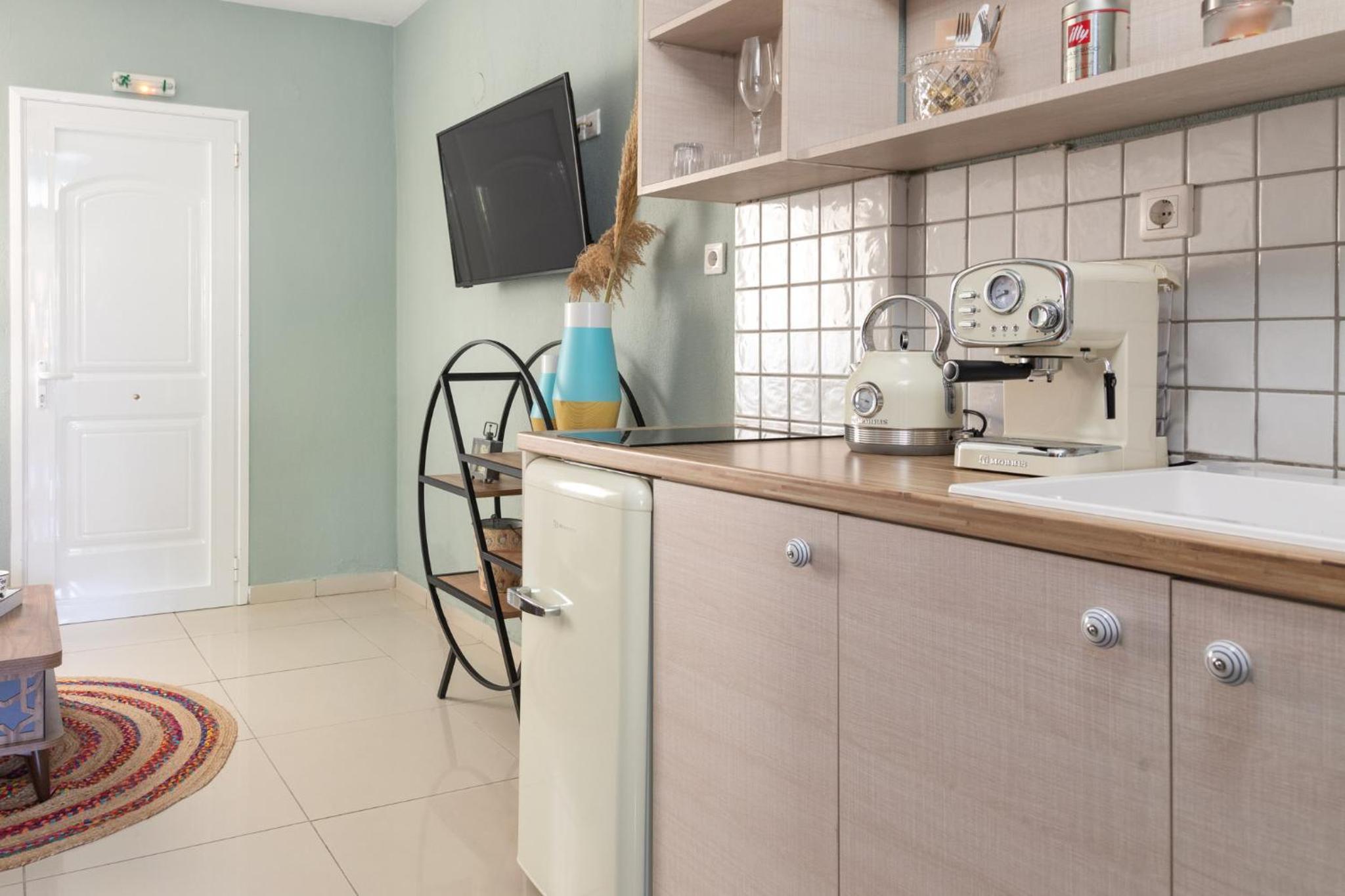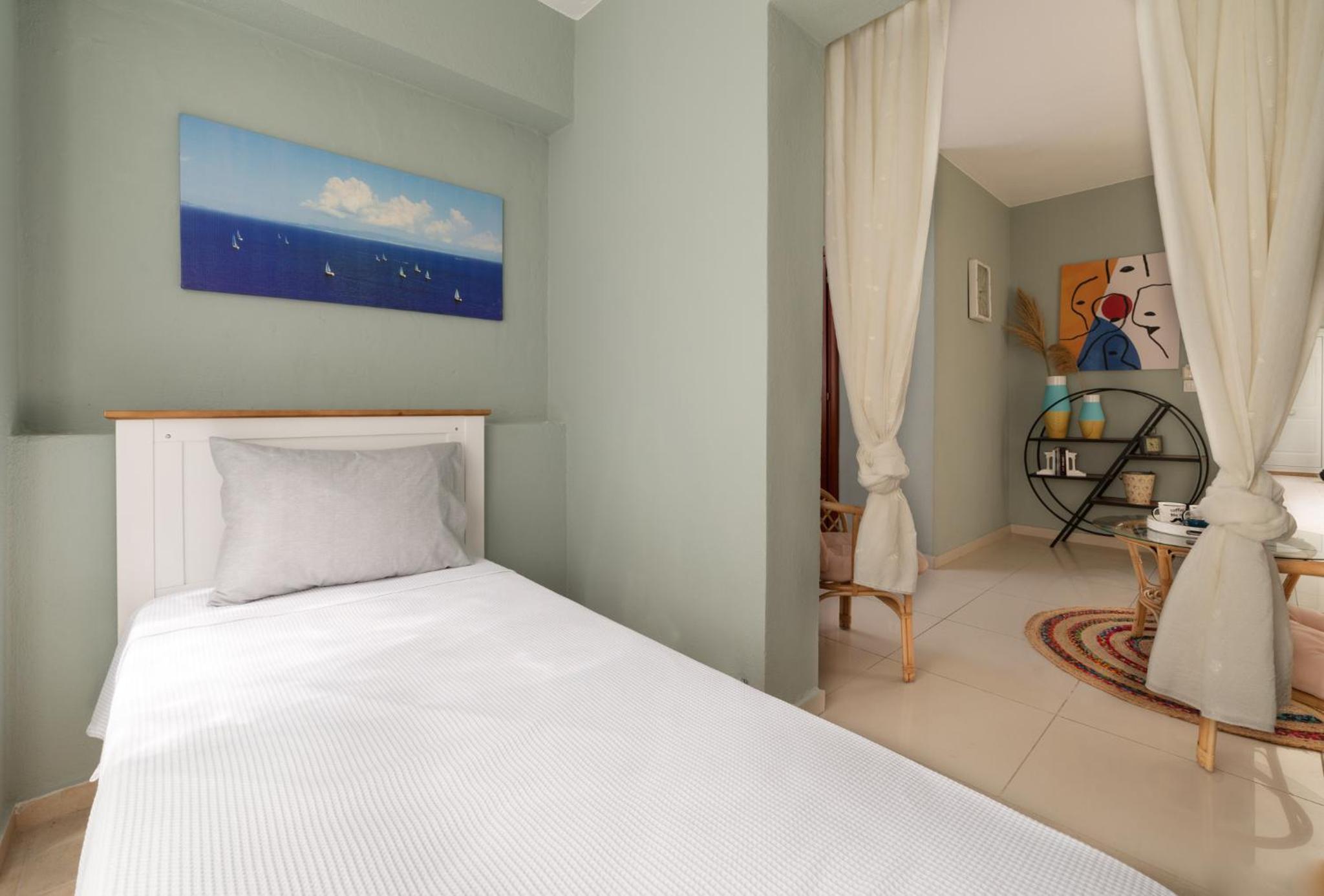The apartment is quite nice and very well located – just a few steps from the sea. The air conditioning is only in the main bedroom, so the second “bedroom” is actually a small space off the living room separated by a curtain. The A/C doesn’t reach there, so there’s a fan instead. If the nights are cool, it’s fine, but otherwise it can get noticeably warmer than the main bedroom.