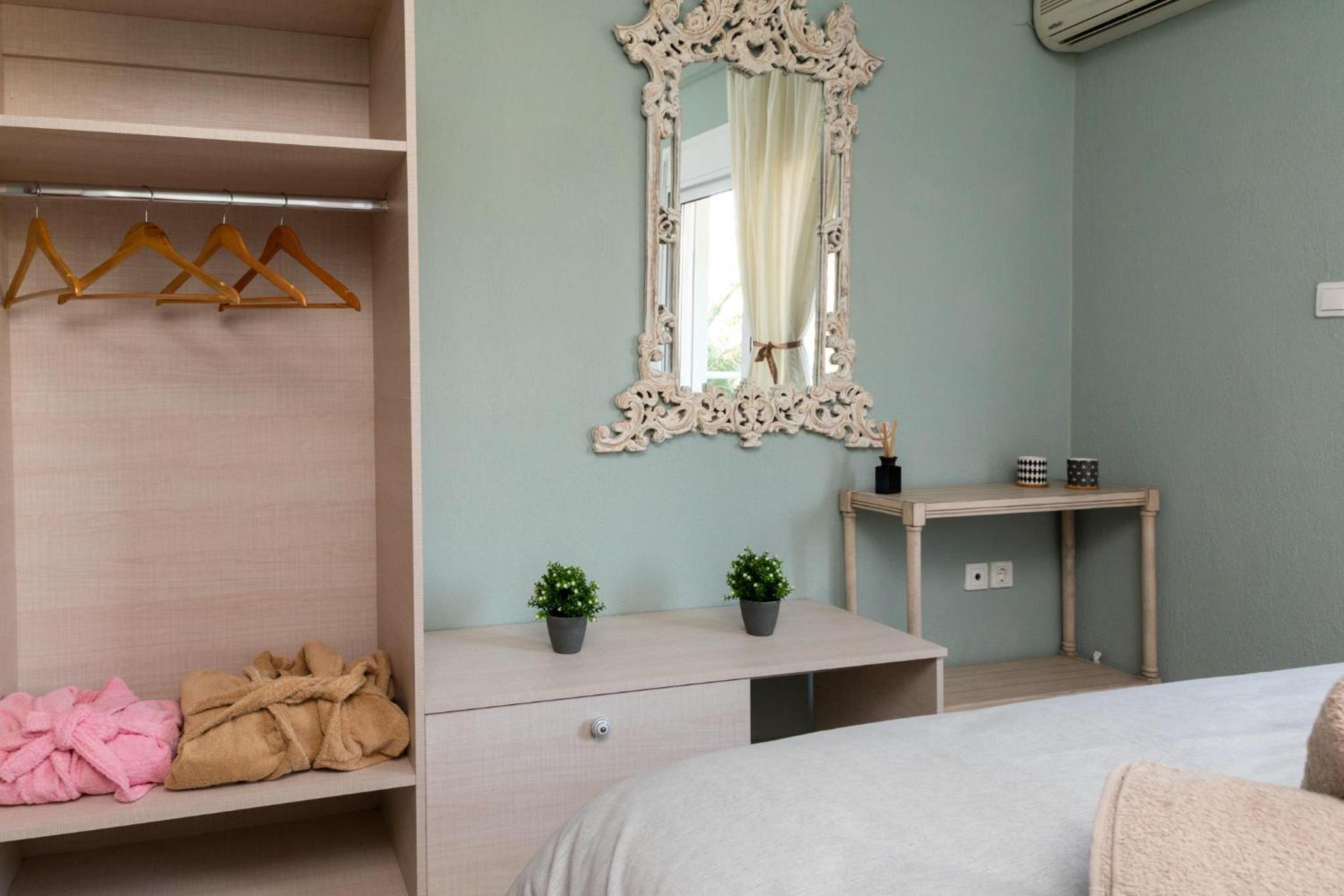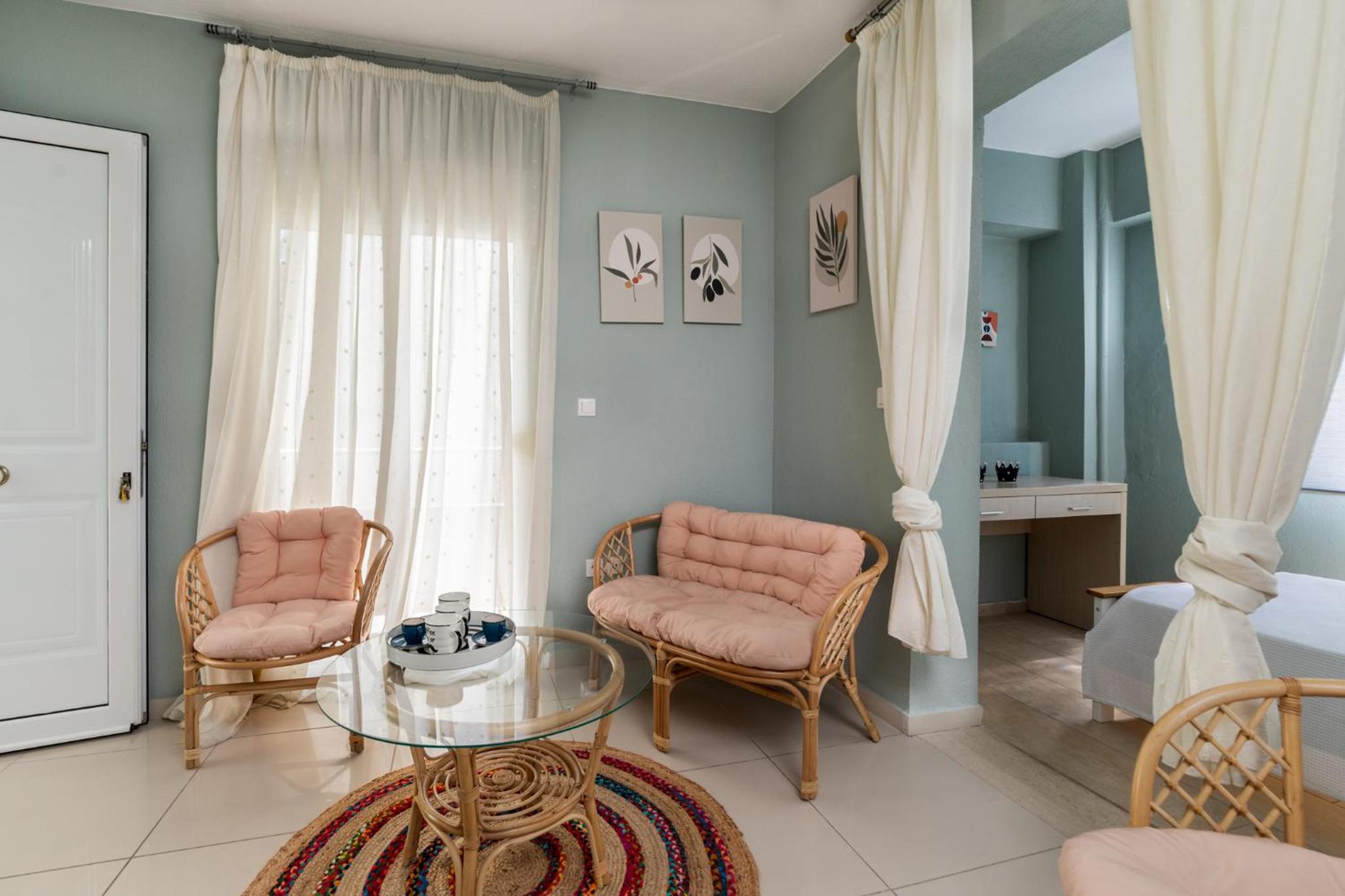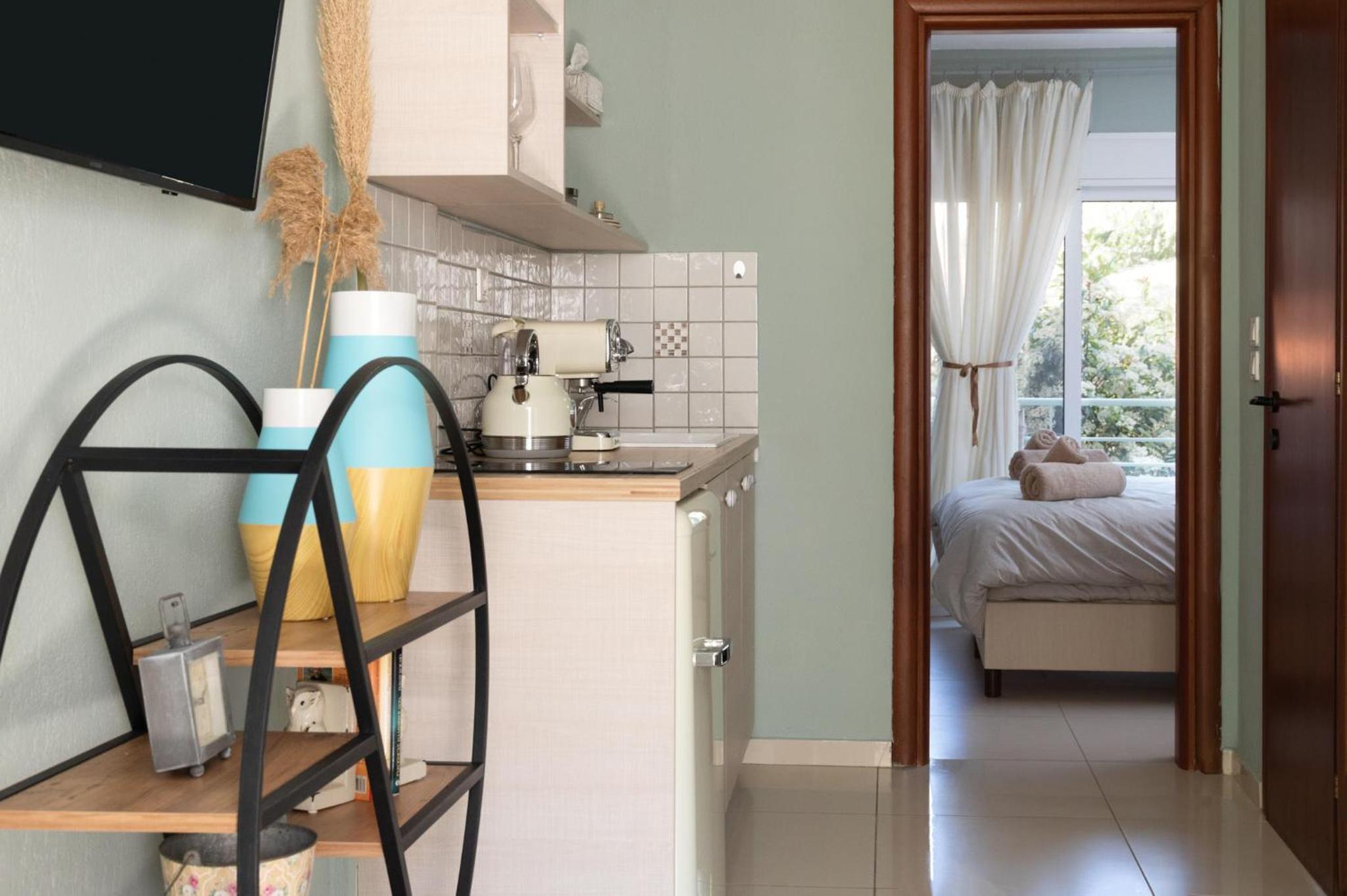 Super modern, customer oriented staff, good parking, close to the beach, close to supermarkets, center of Nikiti, perfect for families with children. Amazing thing is that they cleaned the room every day, like really cleaned the rooms, leaving the room spotless. Proper bedding, sheets, towels and all the amenities you need and more. Nice thing...they would leave the AC on after cleaning the room and when you would came from the beach would not enter a sauna but a very refreshing atmosphere perfect for mid day nap or relaxation.