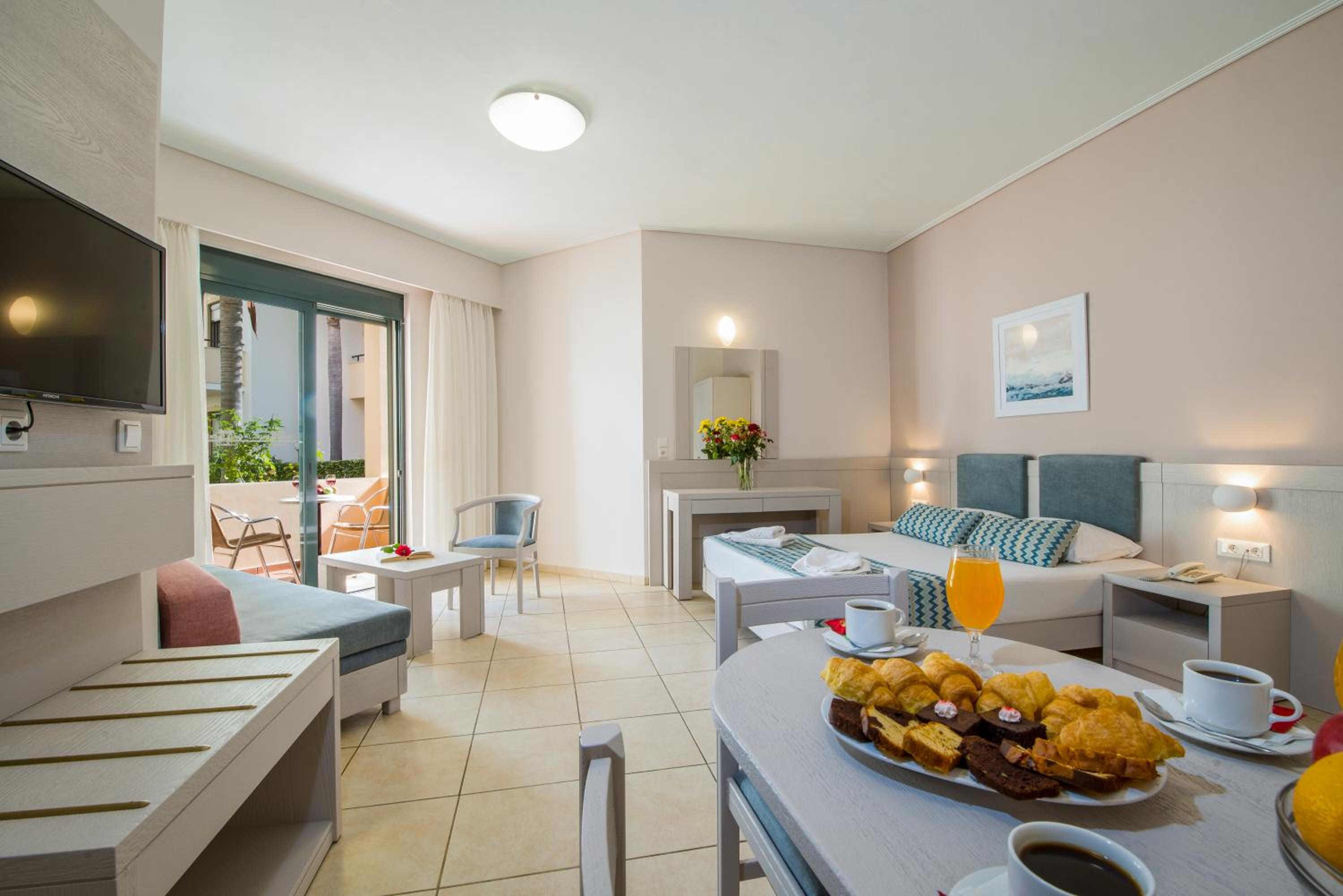 The Creta Palm Resort Hotel & Apartments offers a luxurious stay with rooms overlooking lush gardens and swimming pools. Each air-conditioned room is equipped with modern amenities including an LCD TV, kitchenette, and a lavish bathroom with a bathtub.