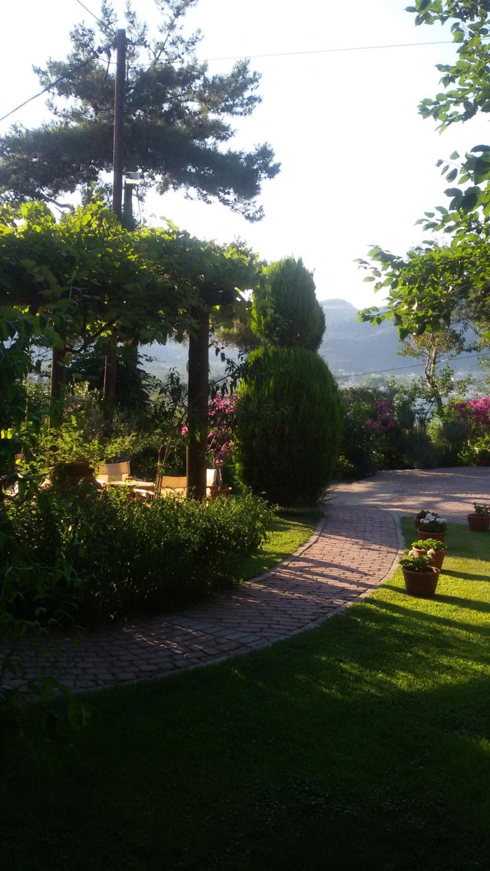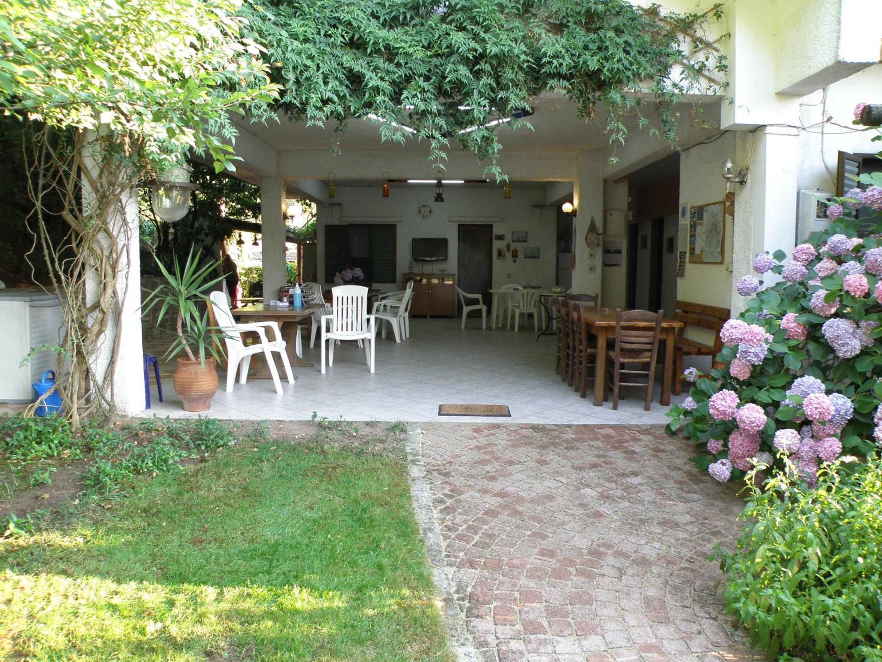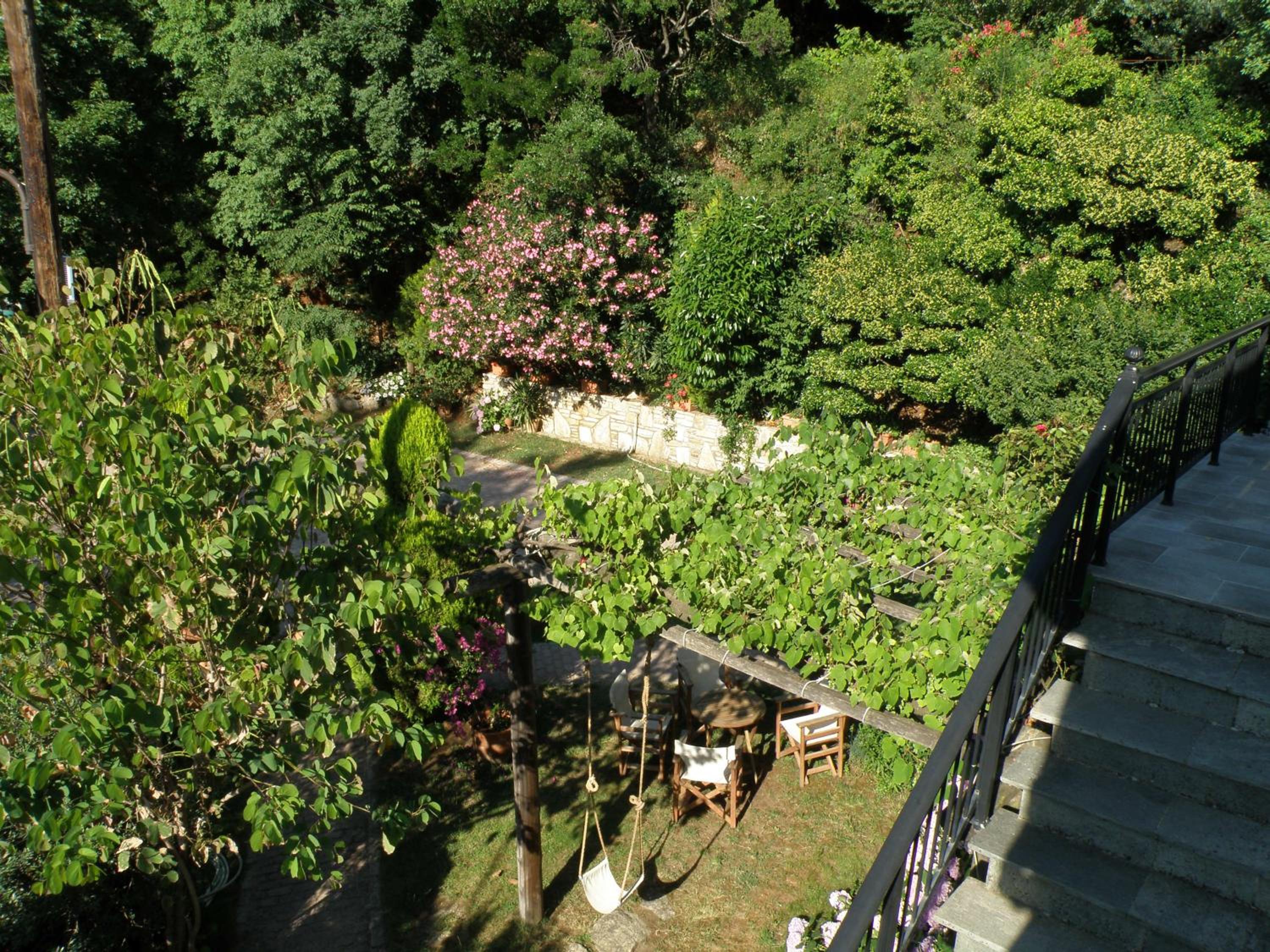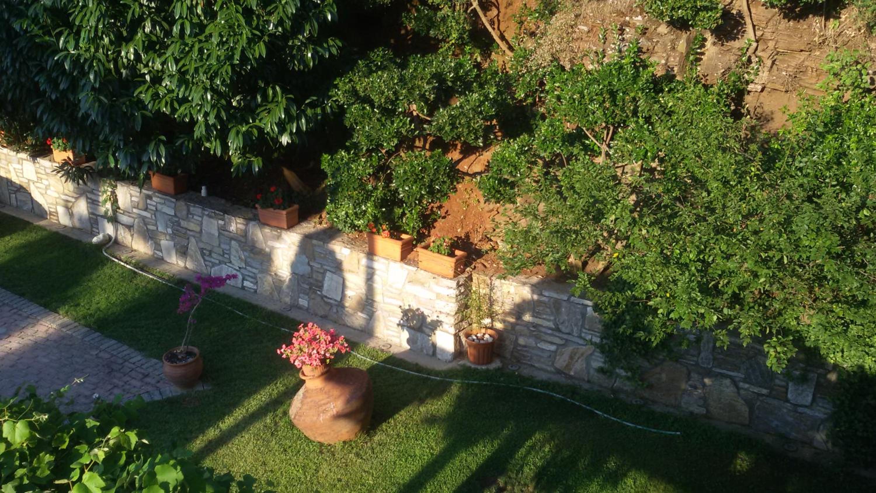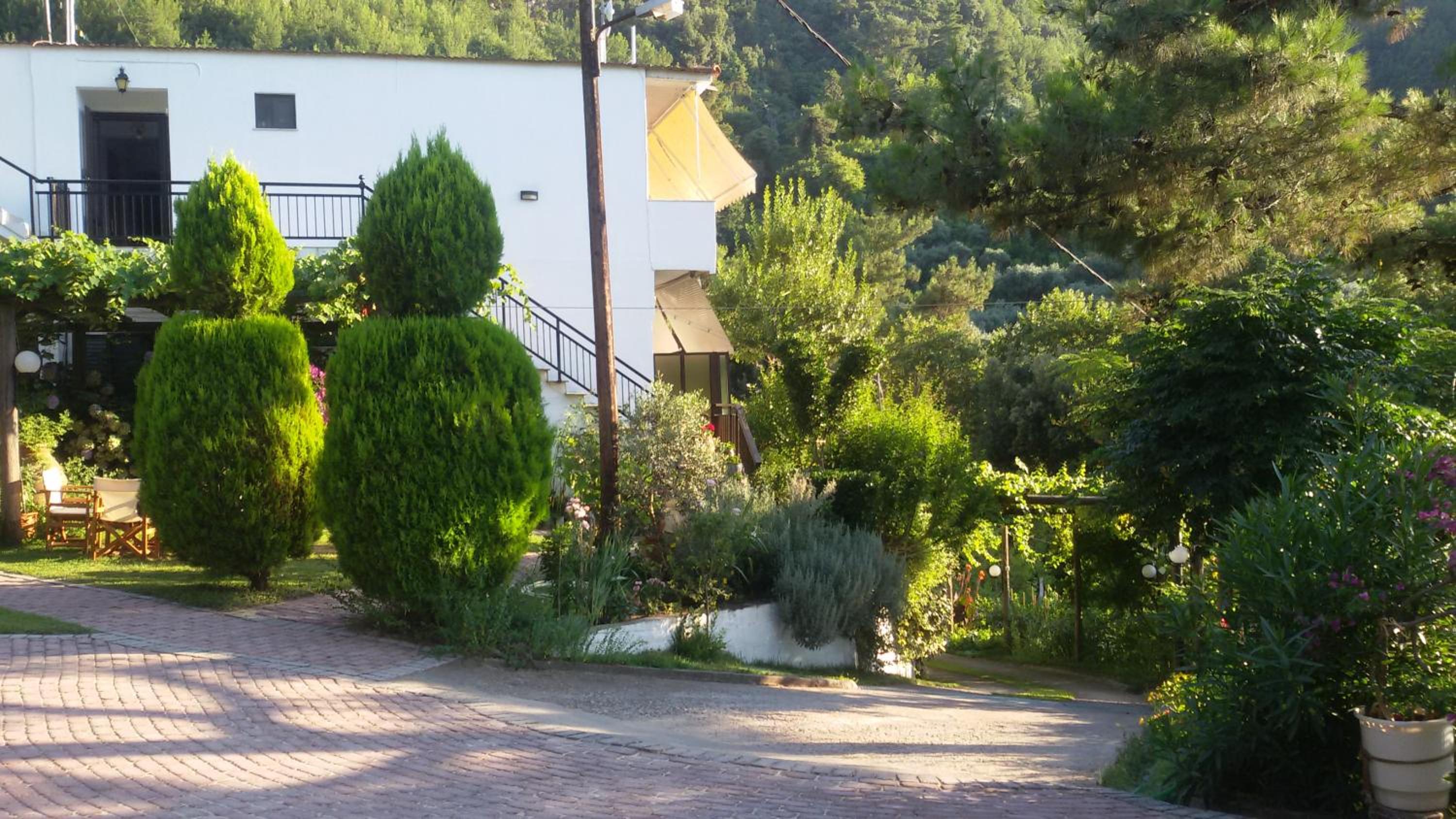 Curtea este spațioasă, cu alei pavate cu piatră, flori, arbori ornamentali și un colț de grădină perfect pentru relaxare. Parcarea este generoasă și bine organizată, ceea ce este un mare plus pentru Thassos.