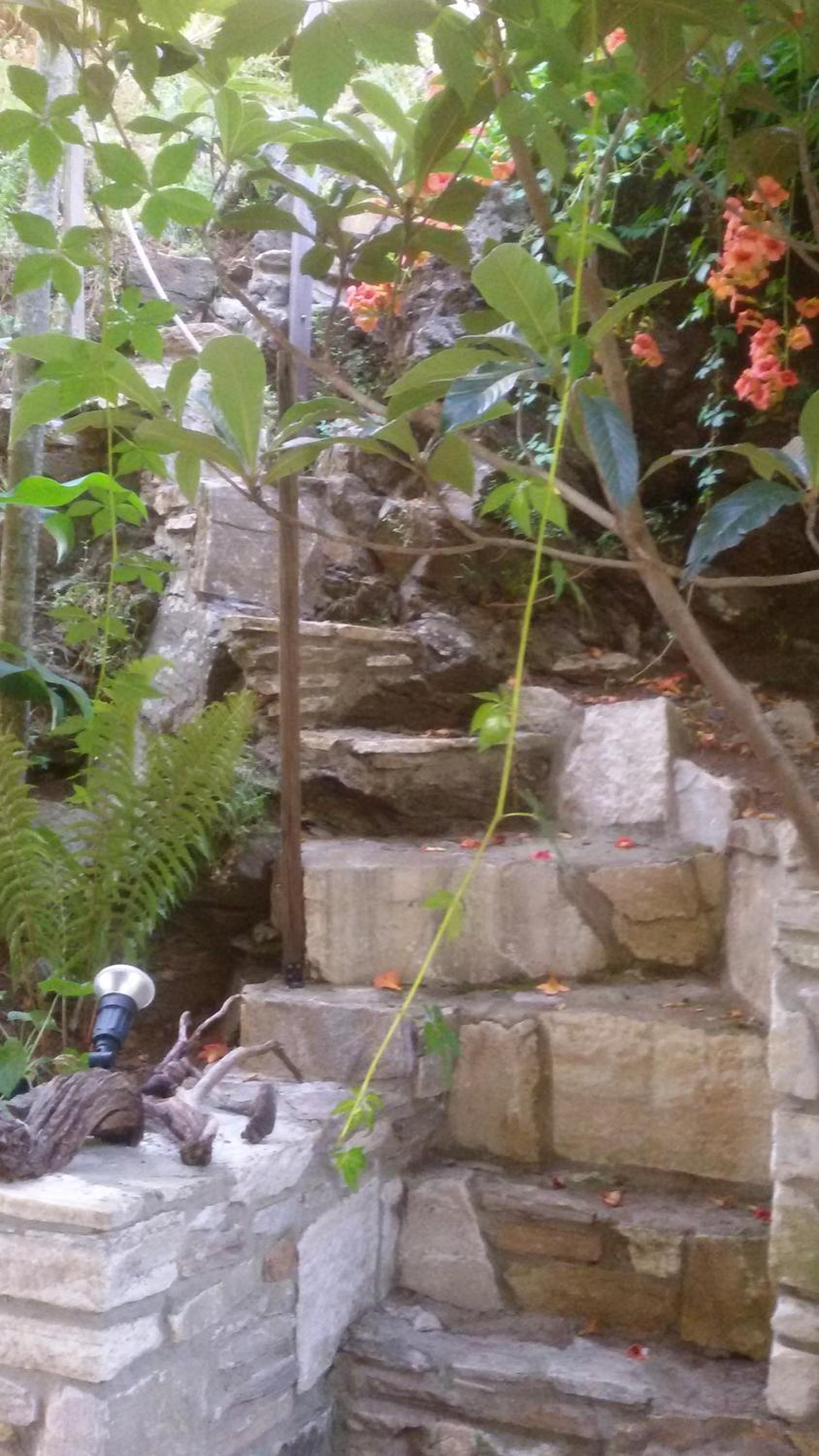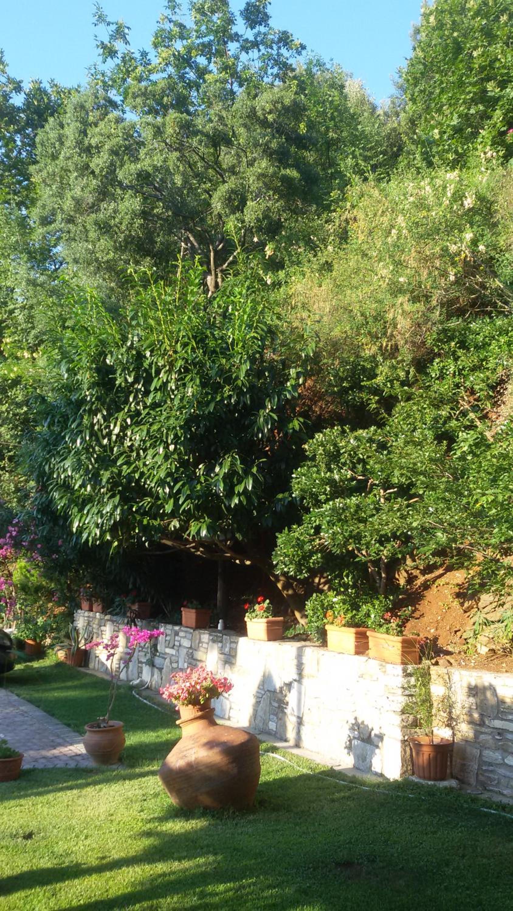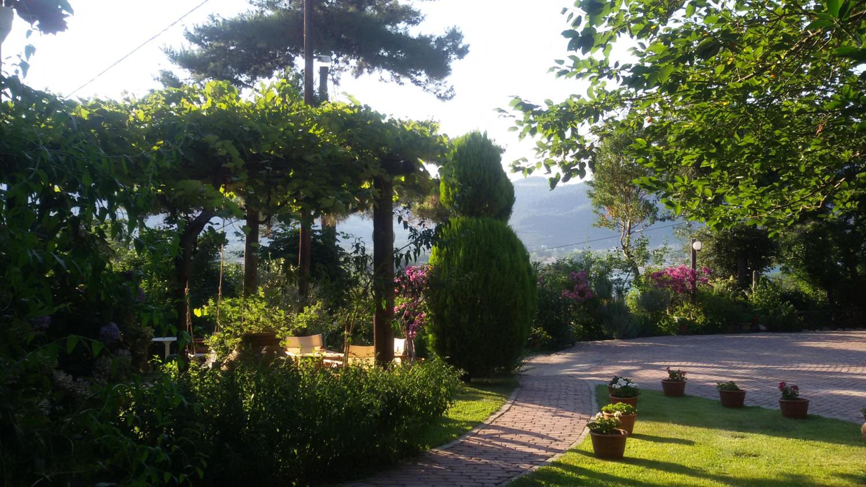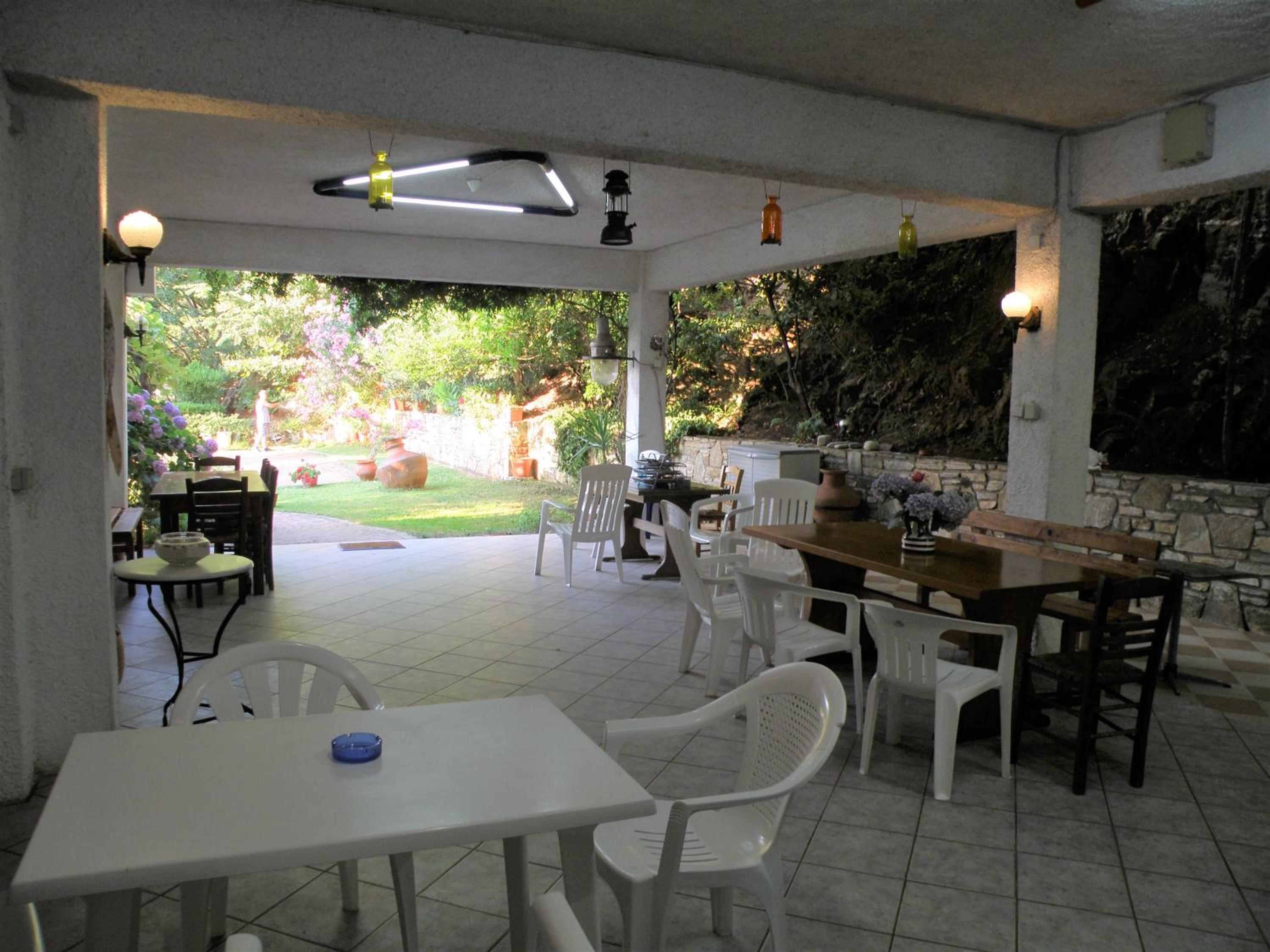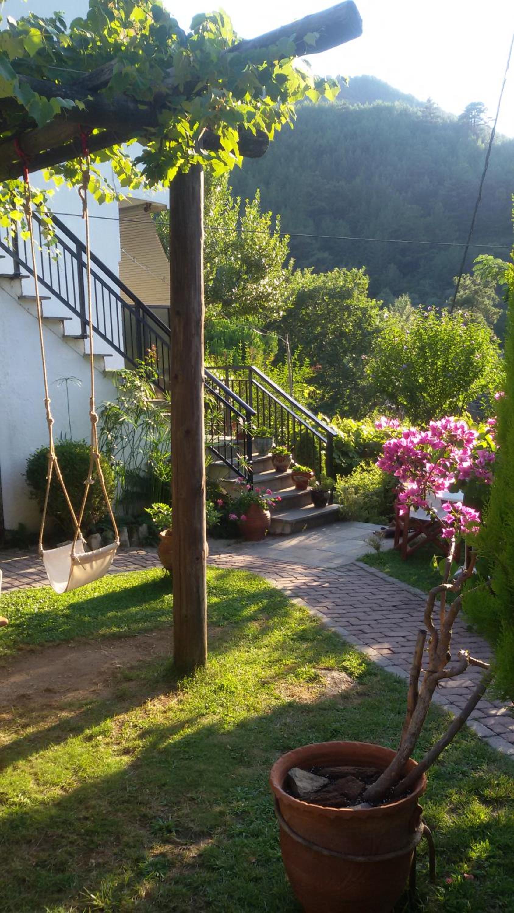Curtea este spațioasă, cu alei pavate cu piatră, flori, arbori ornamentali și un colț de grădină perfect pentru relaxare. Parcarea este generoasă și bine organizată, ceea ce este un mare plus pentru Thassos.