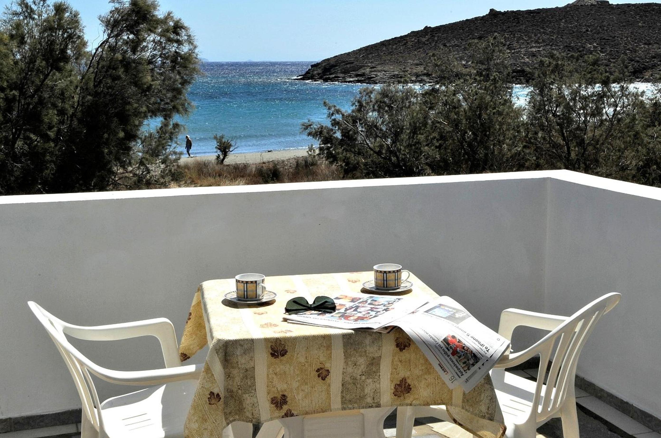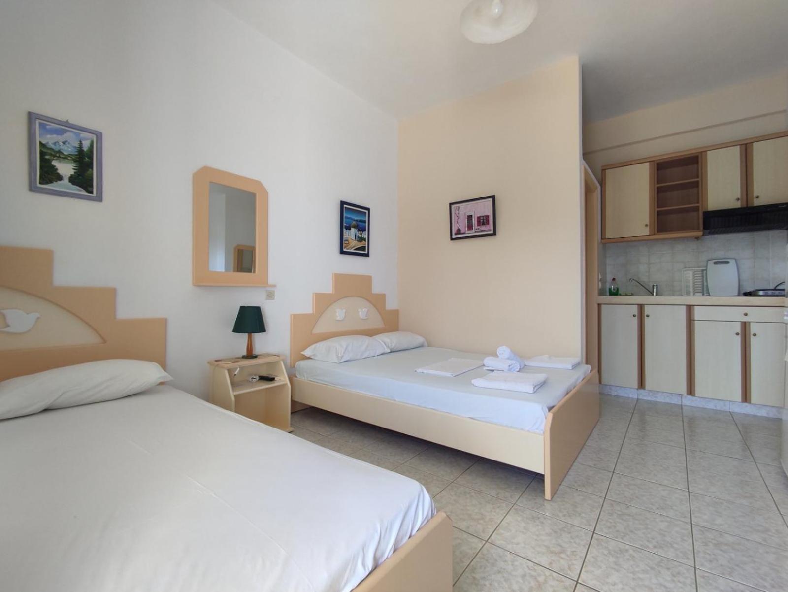 Our room was beachfront, with a great spacious patio to relax on in a quiet little village with a nice number of tavernas 2 minutes walk away. The studio was spacious with great amenities and very clean. The owners were so nice! So helpful and friendly with everything we needed. We stayed 5 days and could stay longer. There were 3 beds but just two of us so we had our own space. The bus was easy to get into town and we hired a car from a place around the corner cheaply. Lovely walks, views and beach clubs ( small ) and the water was amazing. Value for money was incredible and can’t wait to go back.