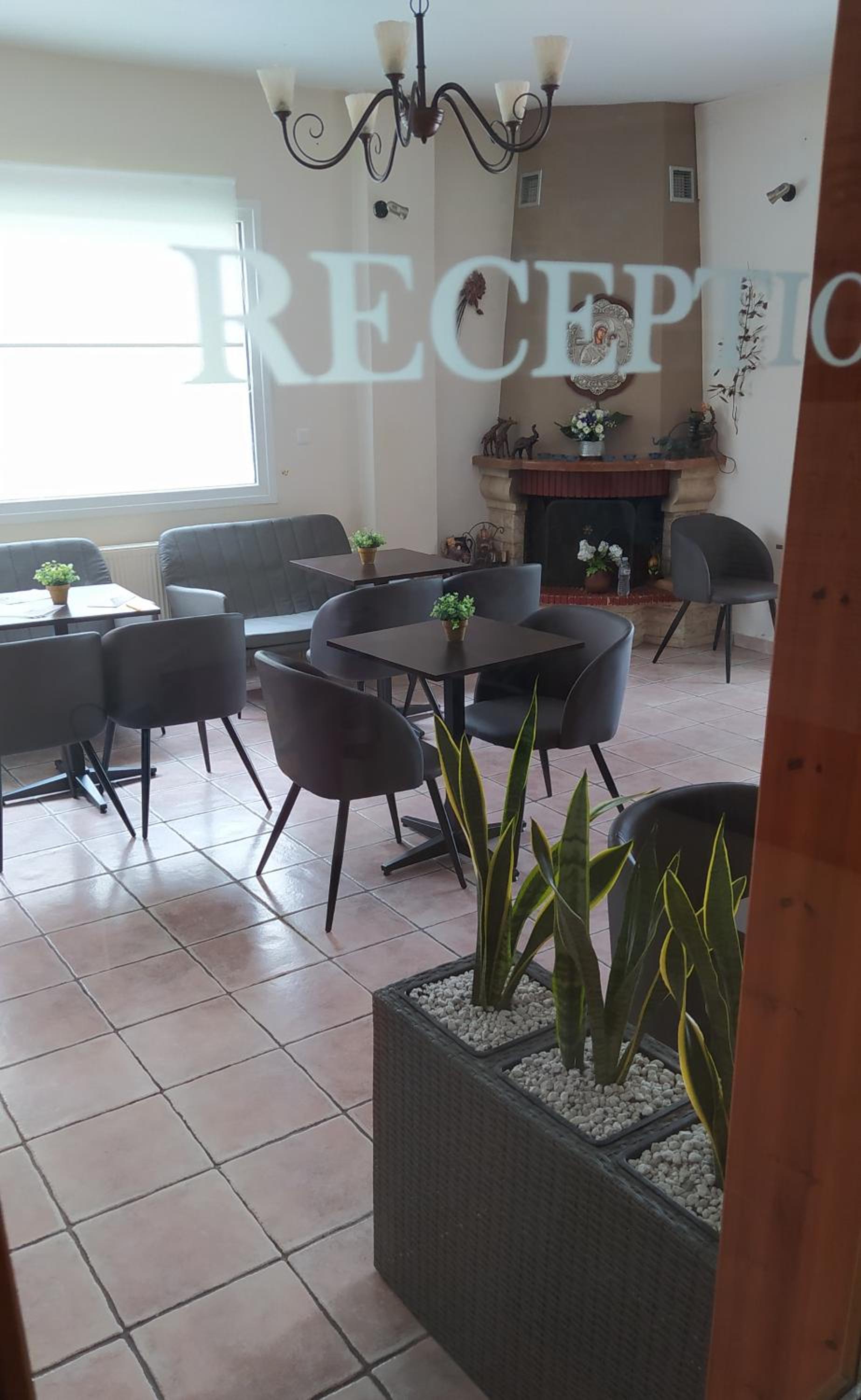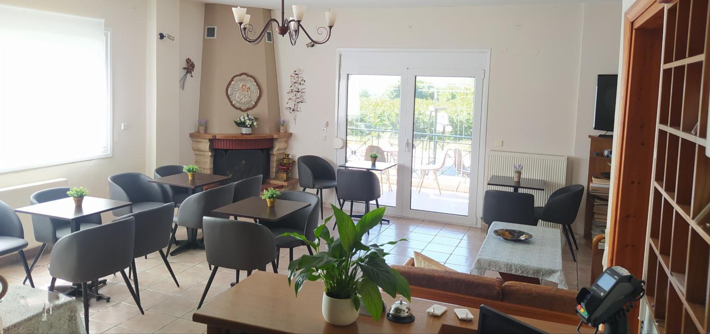 Enjoy the serene ambiance of Drosia Hotel's blossomed garden and unwind by the cozy fireplace at the snack bar.