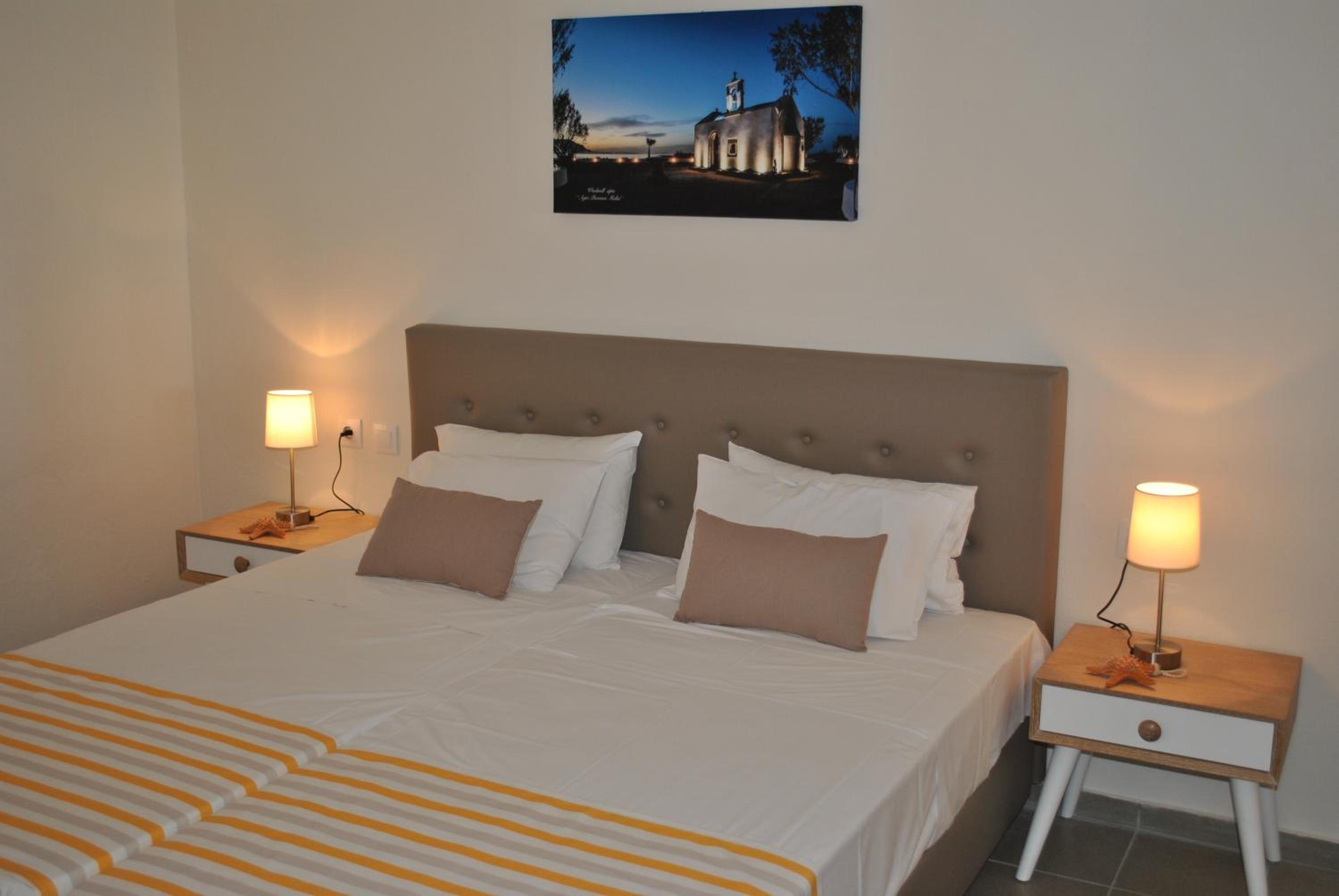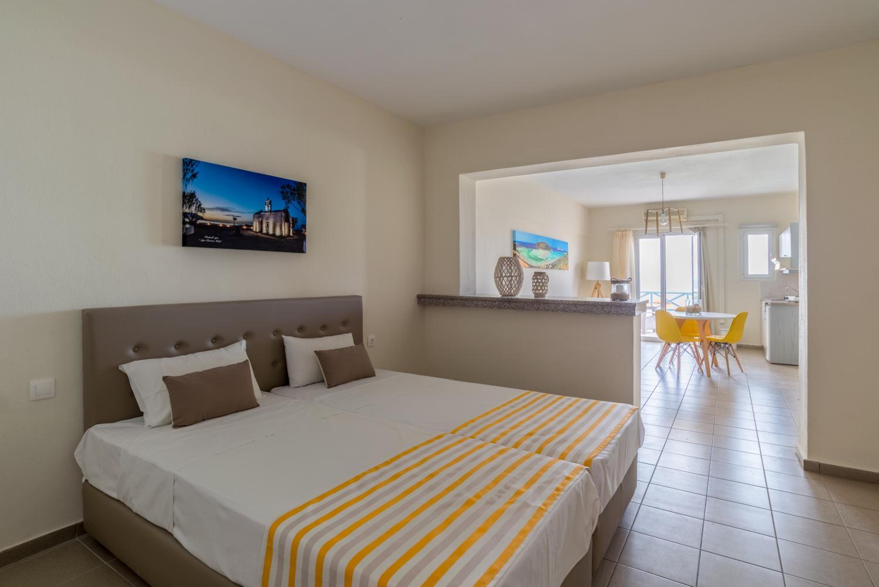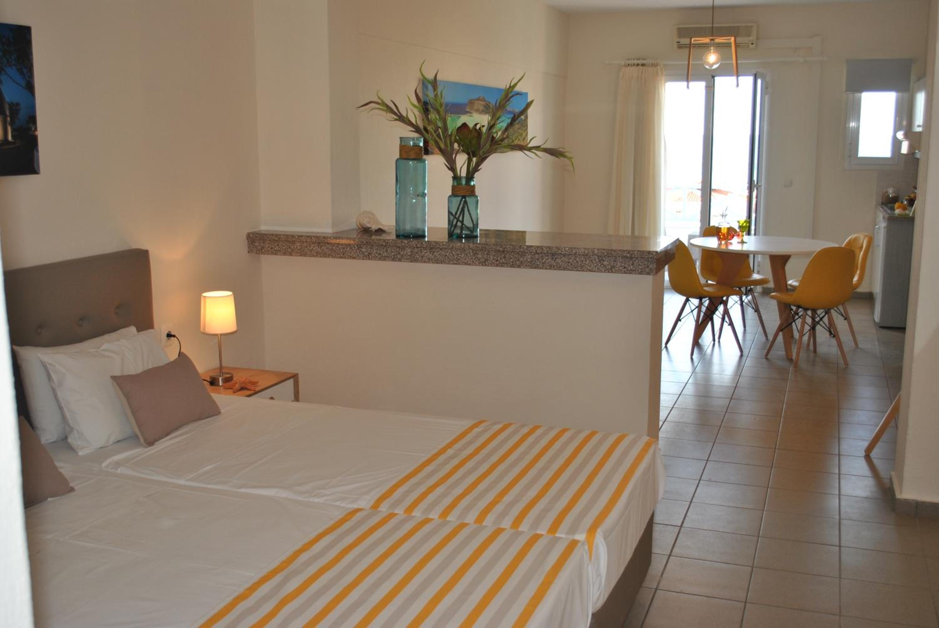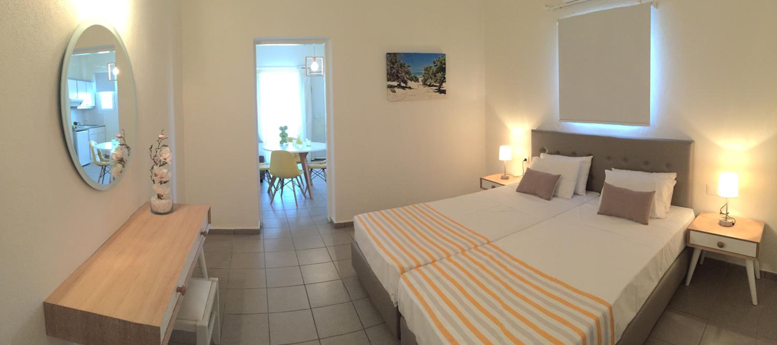 Die Lage ist super - direkt am Strand und die Nutzung der Liegen mit Sonnenschirm ist inklusive. In direkter Nähe gibt es Supermärkte und Tavernen. Die Klimaanlage funktioniert sehr gut und das Zimmer ist groß mit 2 Balkonen.