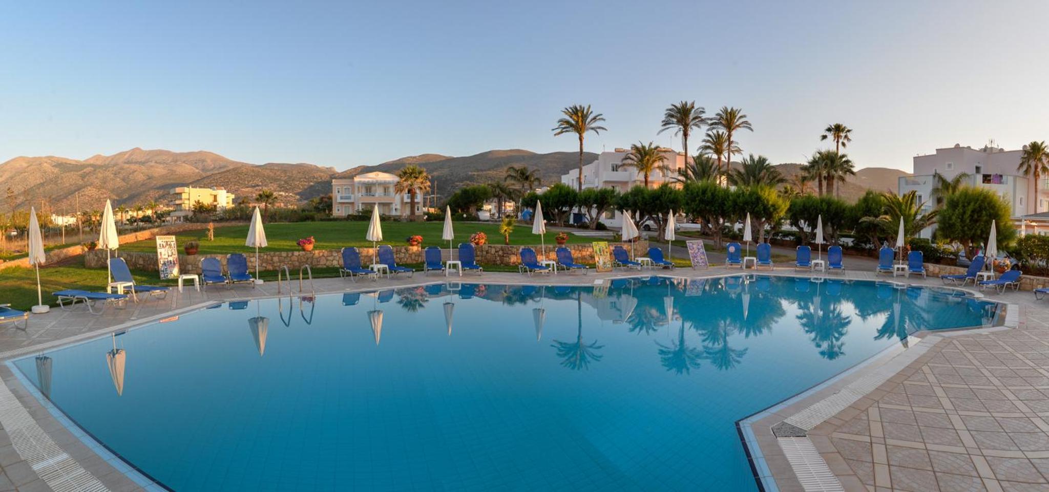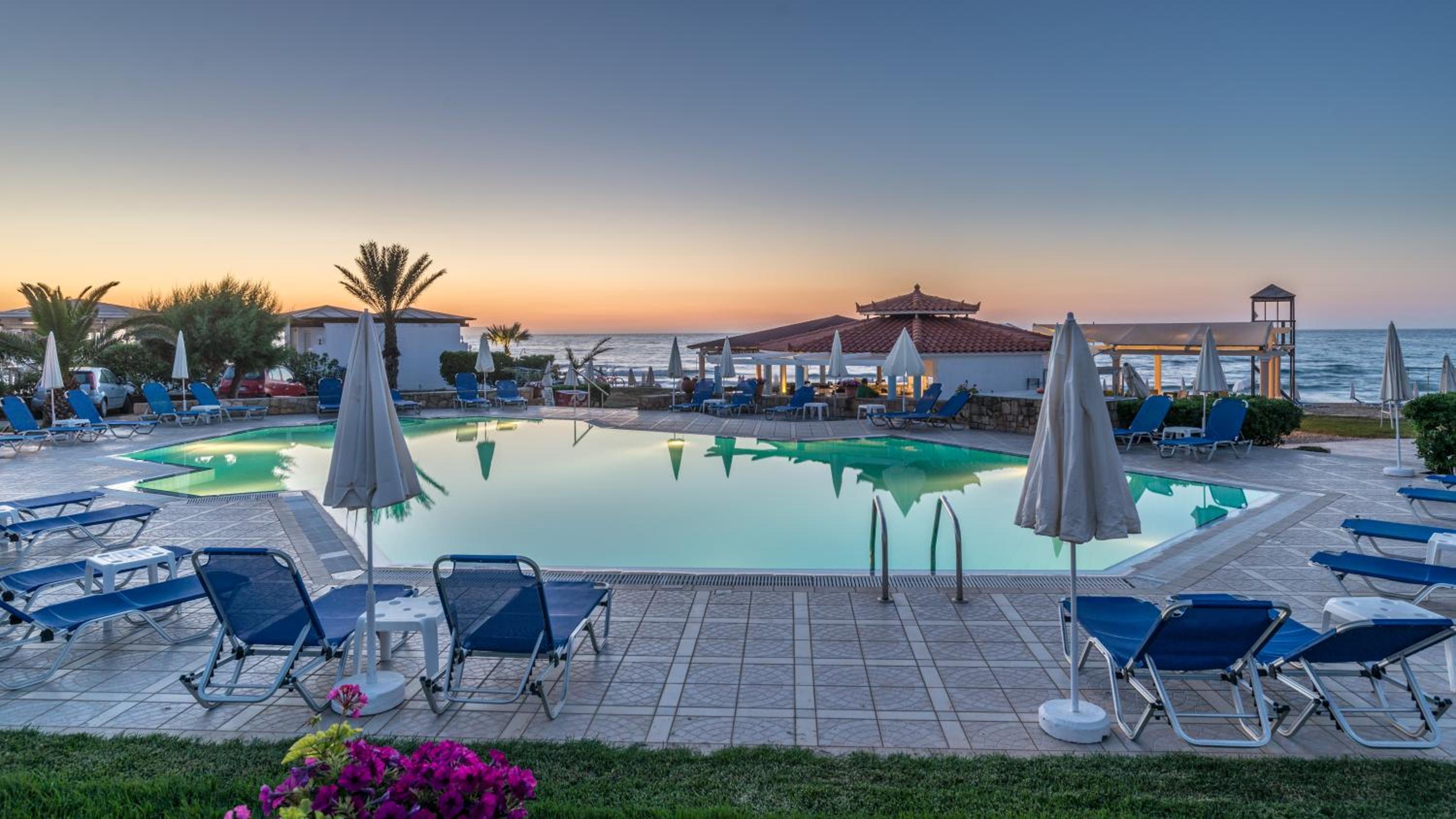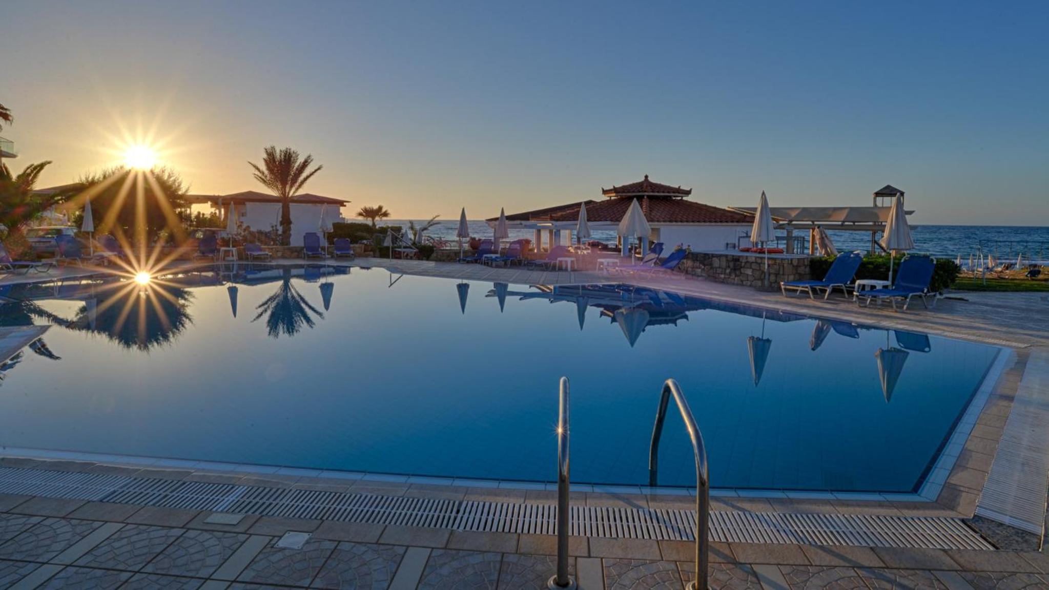 Location is really good.At the end of the busy part of Malia so much quieter. Beach, pool and snack bar all great. Frequent cleaning and towels are changed often. Close to restaurants and shops. Parking on site. Always had sunbeds available.