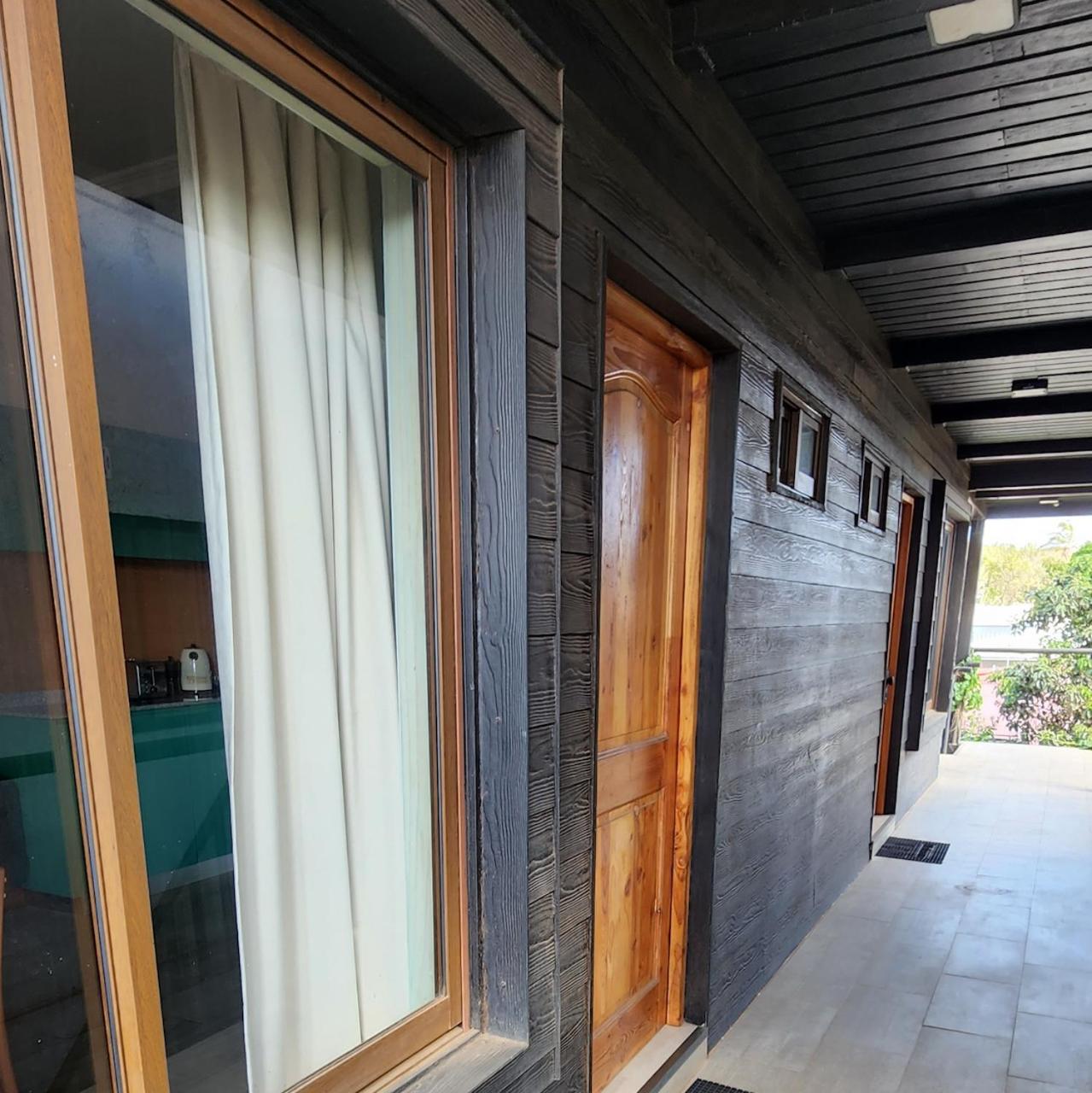 The property's is behind a small market and side driveway/entrance is all dirt. The photos only show the building. We had the room on the first floor right off the side entrance. We opened the windows because it was very hot. The windows had no screens so we not only got mosquitoes but we killed 4 huge roaches. One crawling in the middle of the night around the wall behind the bed