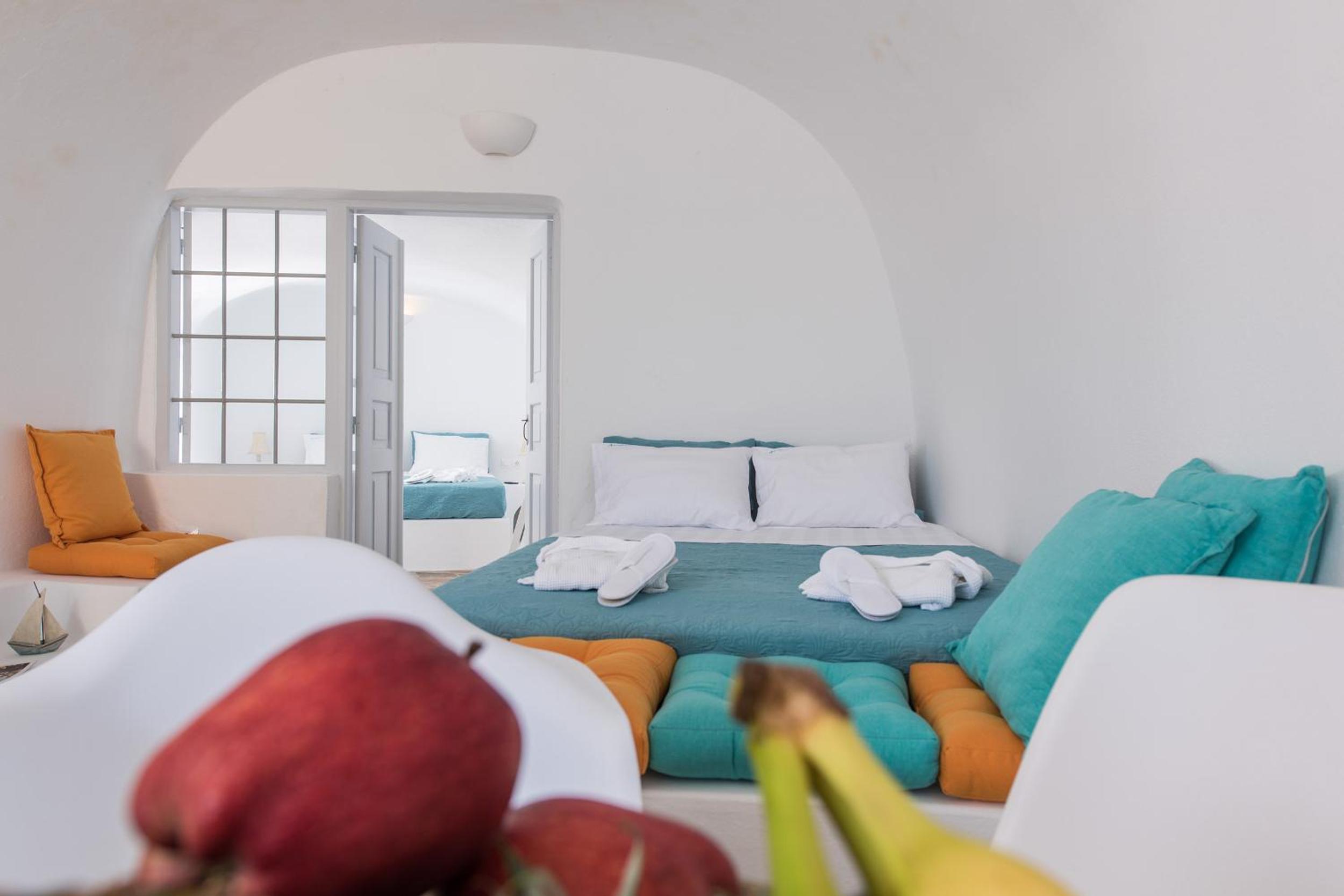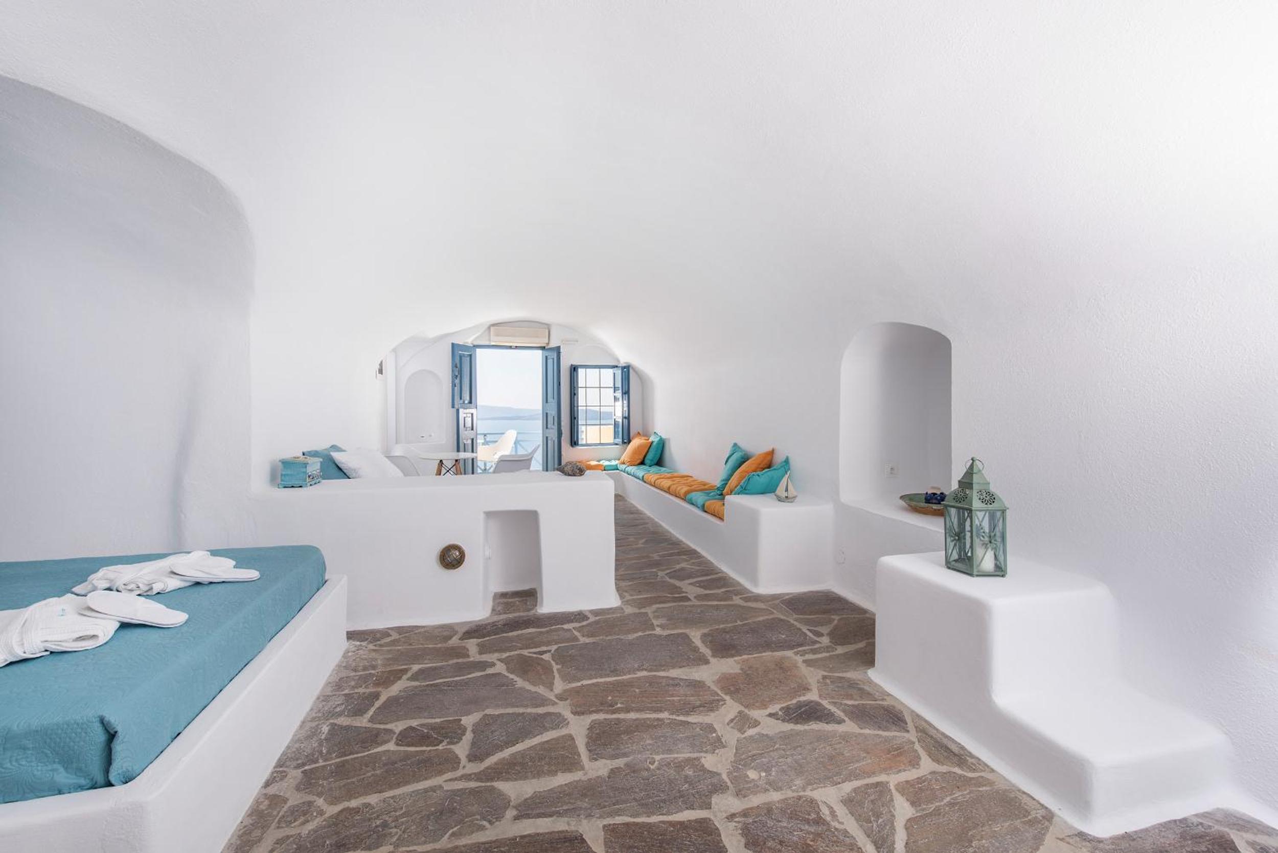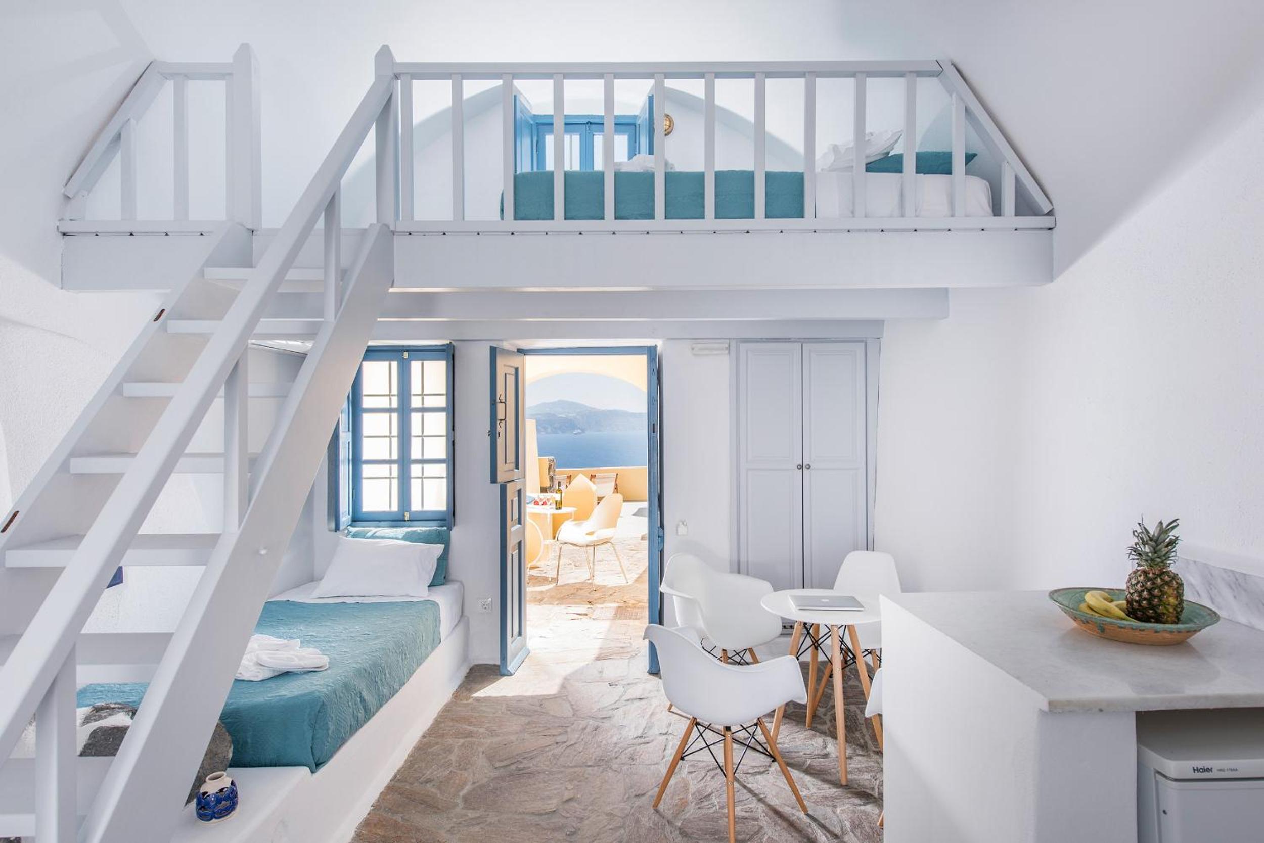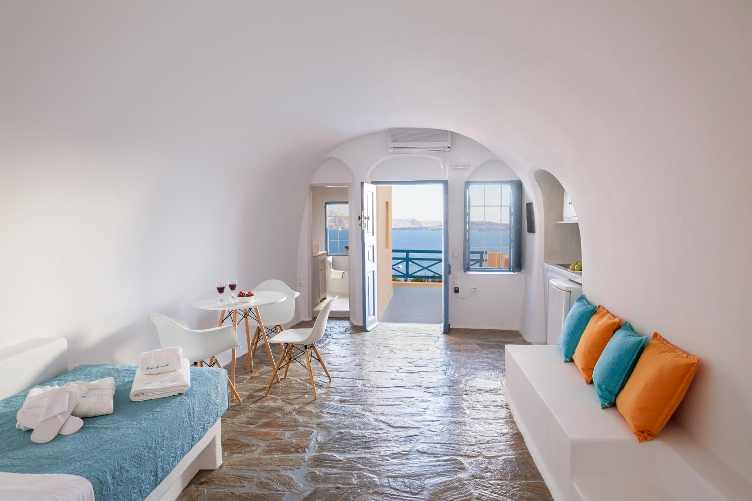 Those views were incredible! The suite was a little outdated but very comfy, The loungers in our balcony were a little dirty but we were provided with pool towels, so we used them of course. Location was incredible in Oia. We were assisted with our luggage and had no problems with the stairs.