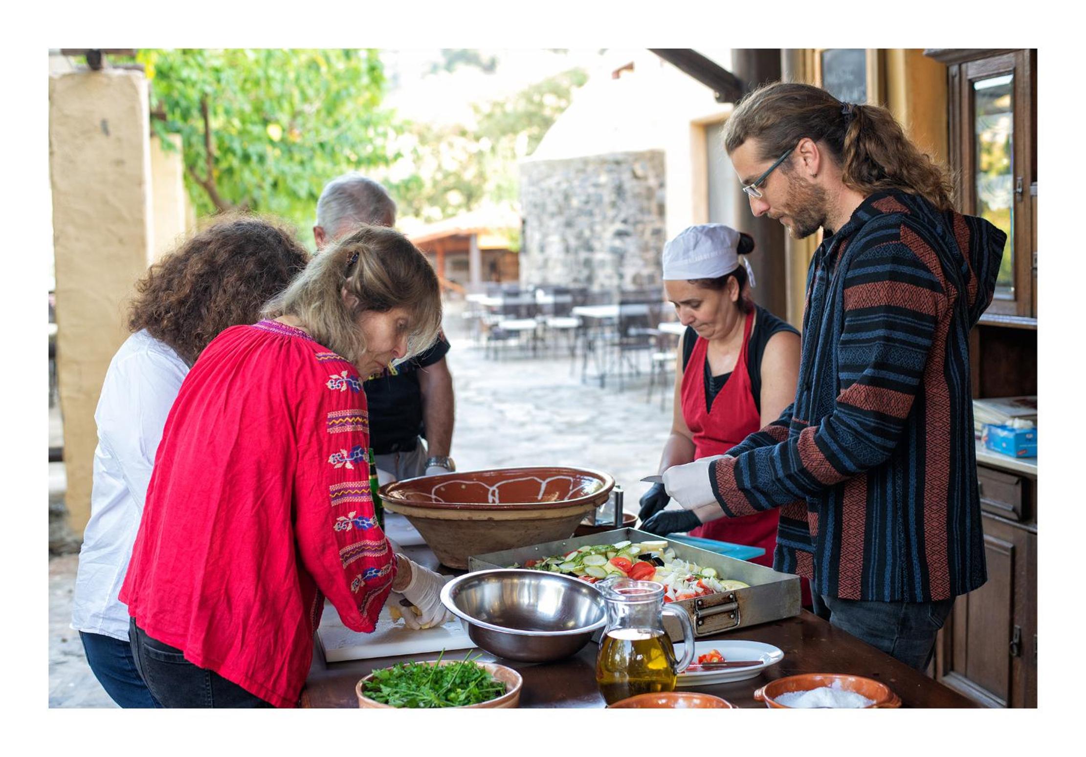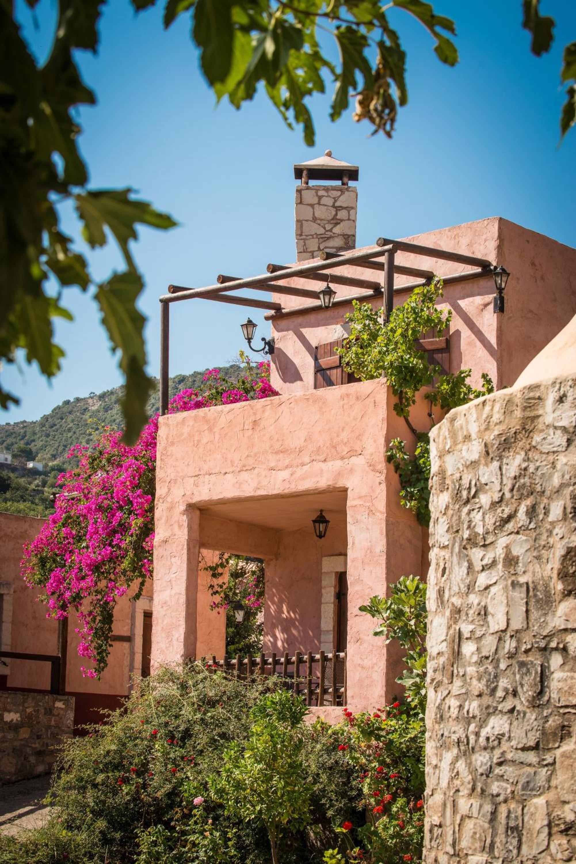 Guests can enjoy traditional Cretan cuisine at Enagron's restaurant, participate in cooking classes, and even help prepare food using ingredients grown on the hotel's farm without fertilizers.