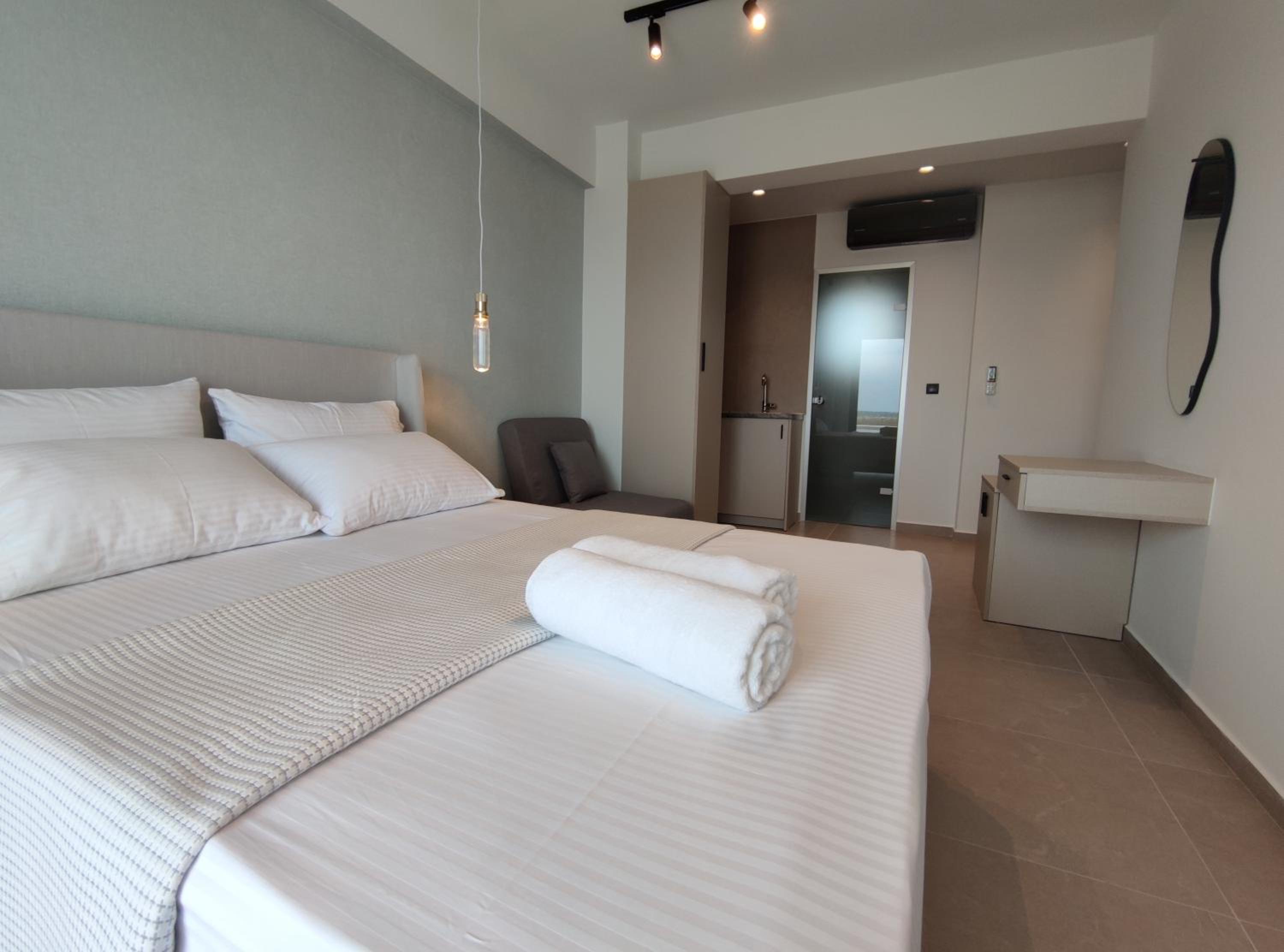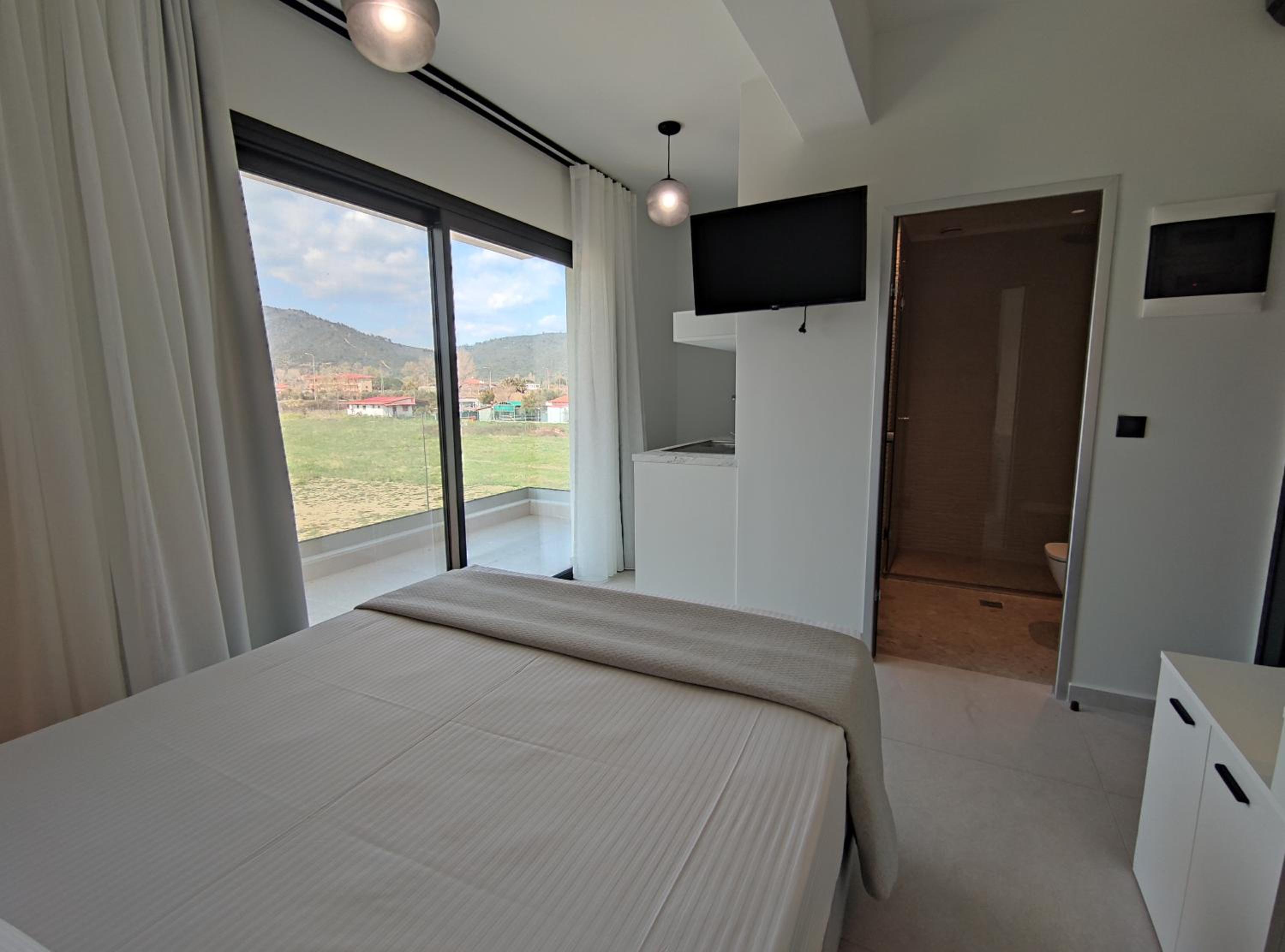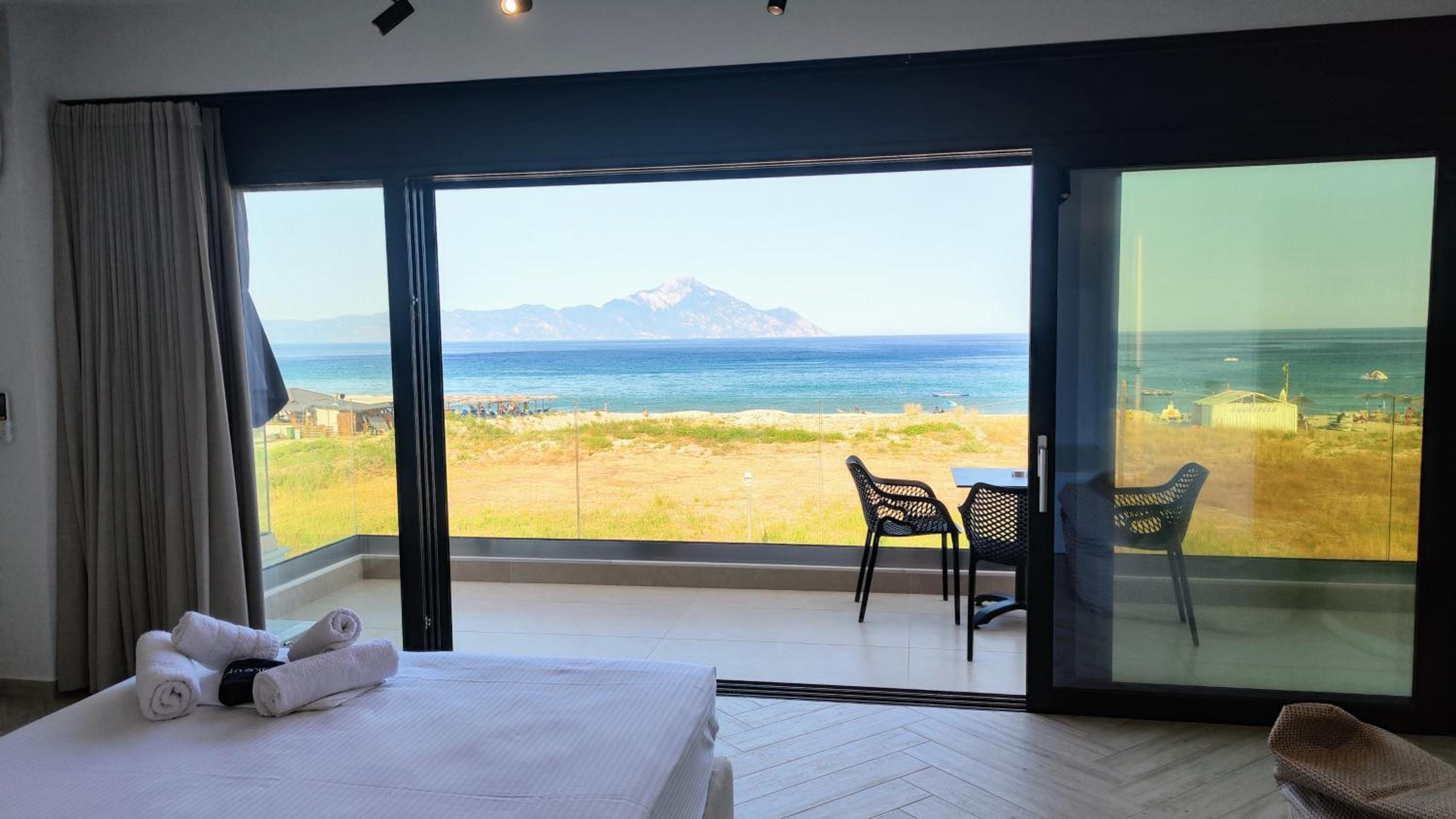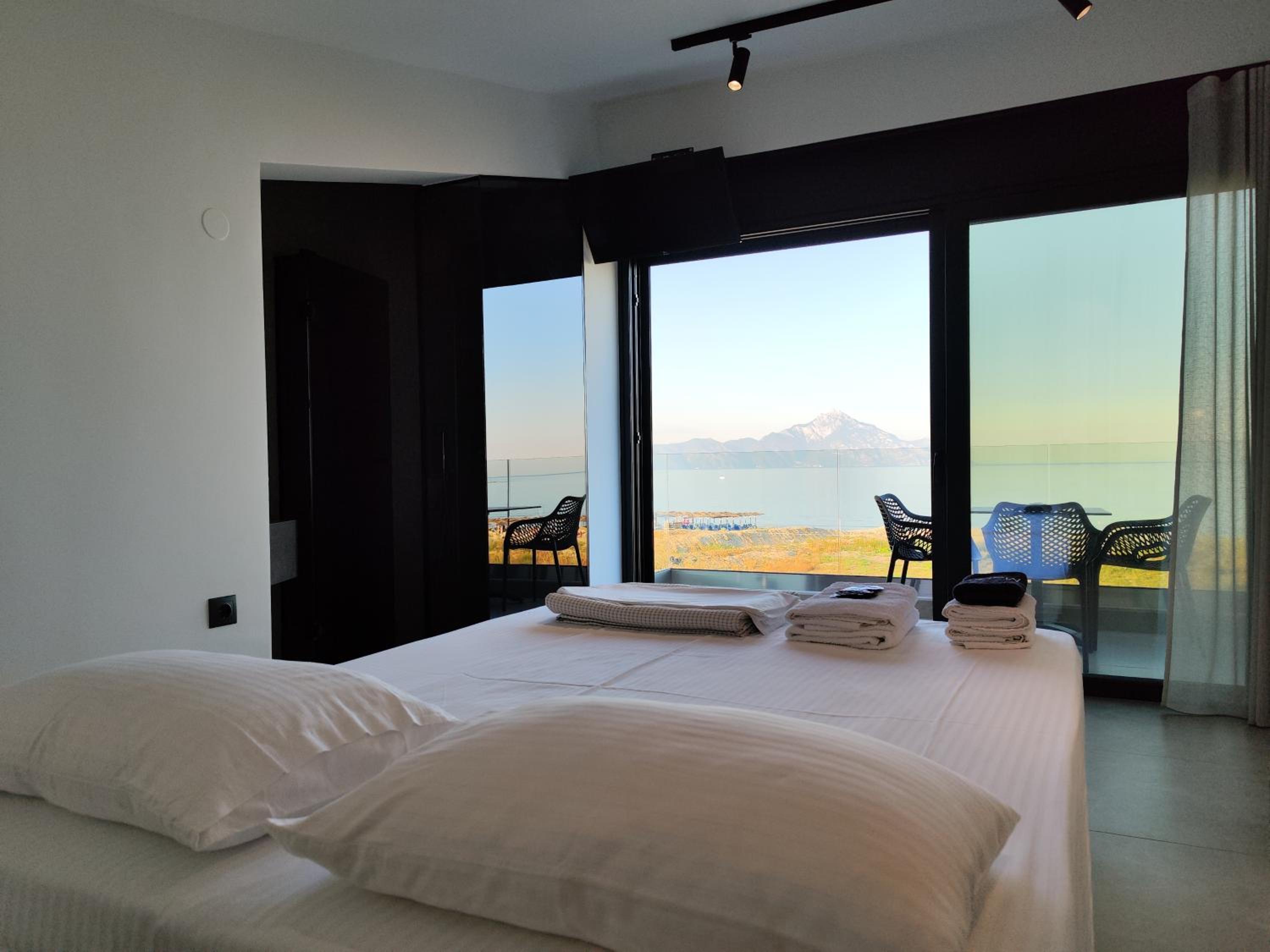 Family-Friendly Accommodation: With spacious family rooms and a welcoming terrace, Onar in Sarti caters to families looking for a relaxing getaway. The flat-screen TV, well-equipped kitchenette, and cozy bed linens ensure a comfortable stay for all.