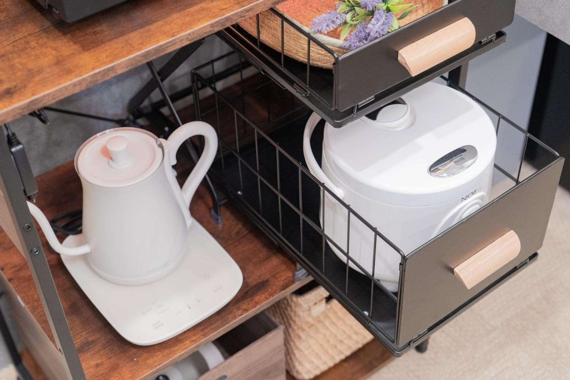 The apartment has a tv that you can connect with your phone, a microwave, water cooker and a stove. And best of all: a washer with detergent and softener! The bed is very comfortable, with nightlights built in, and plenty of pillows.