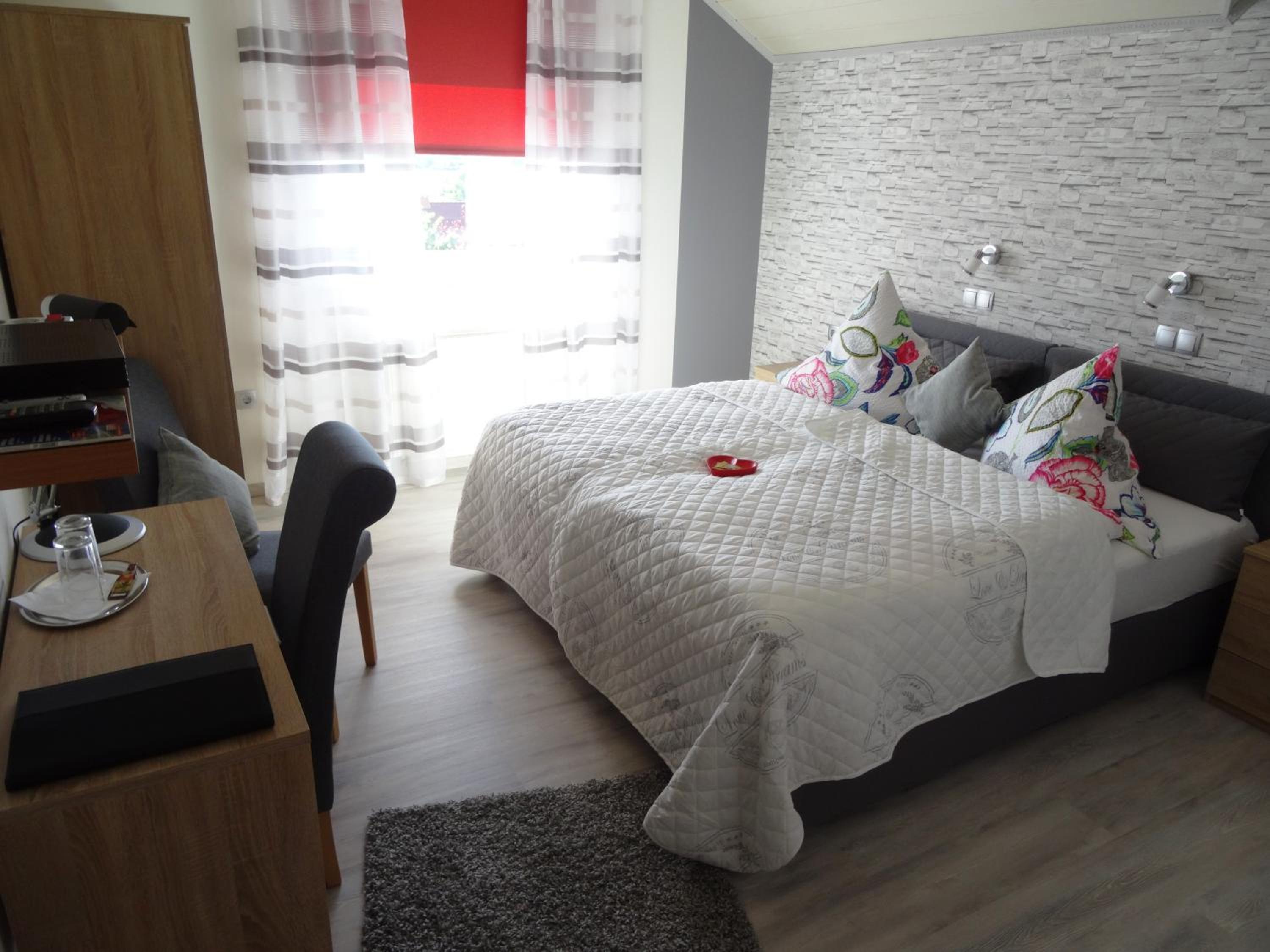 Das Zimmer ist modern und geschmackvoll, für eine Dorfpension etwas klein.