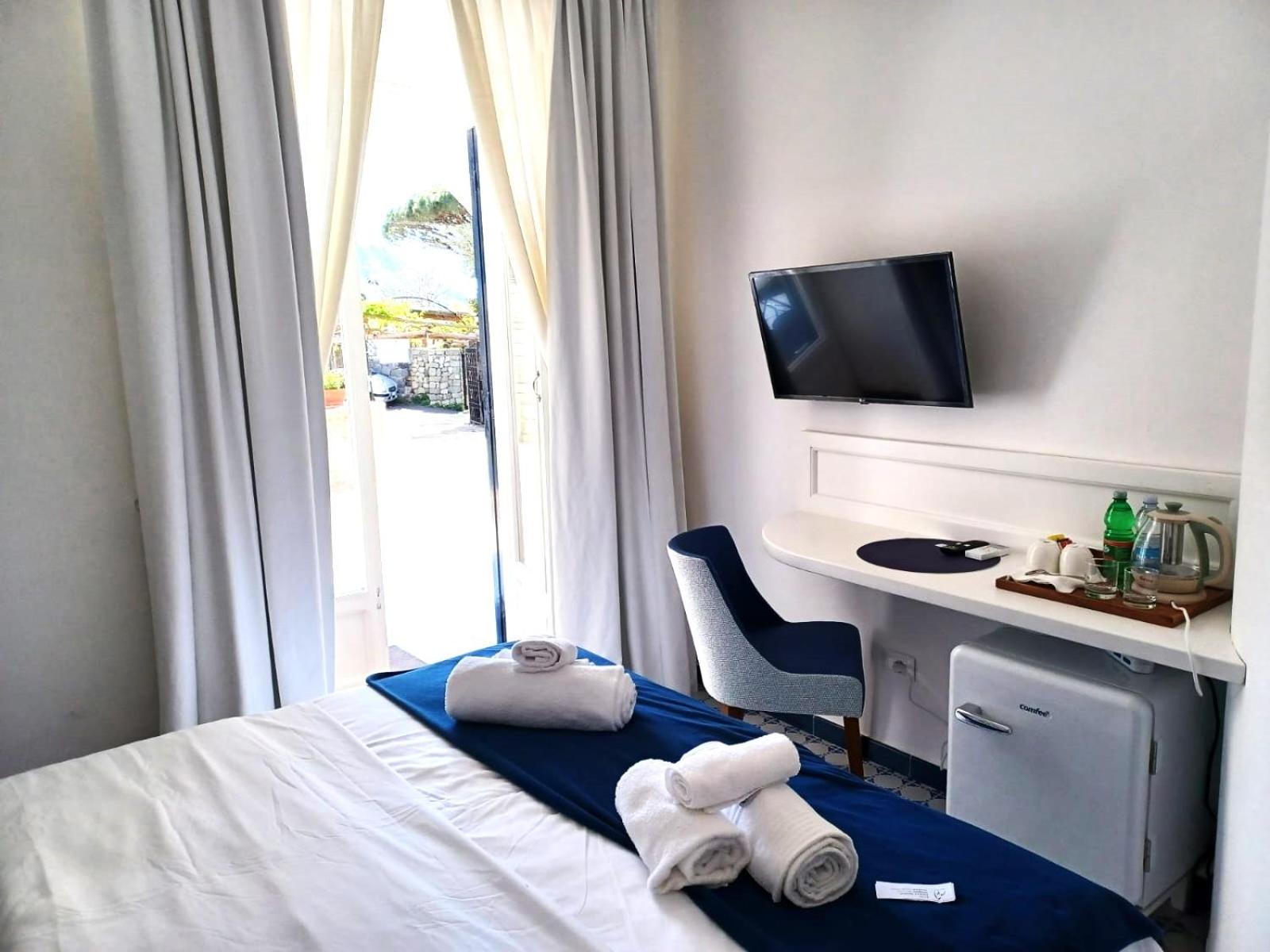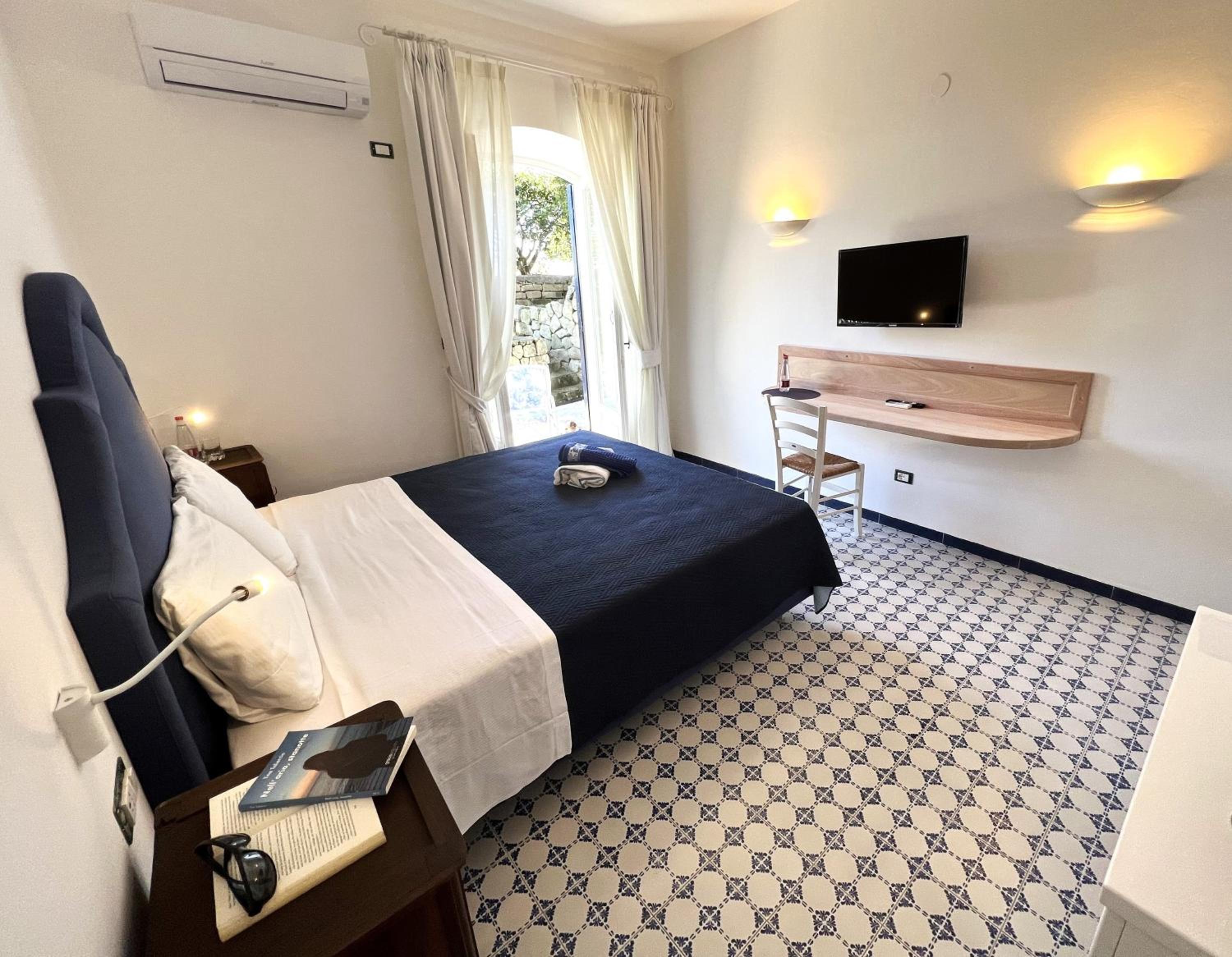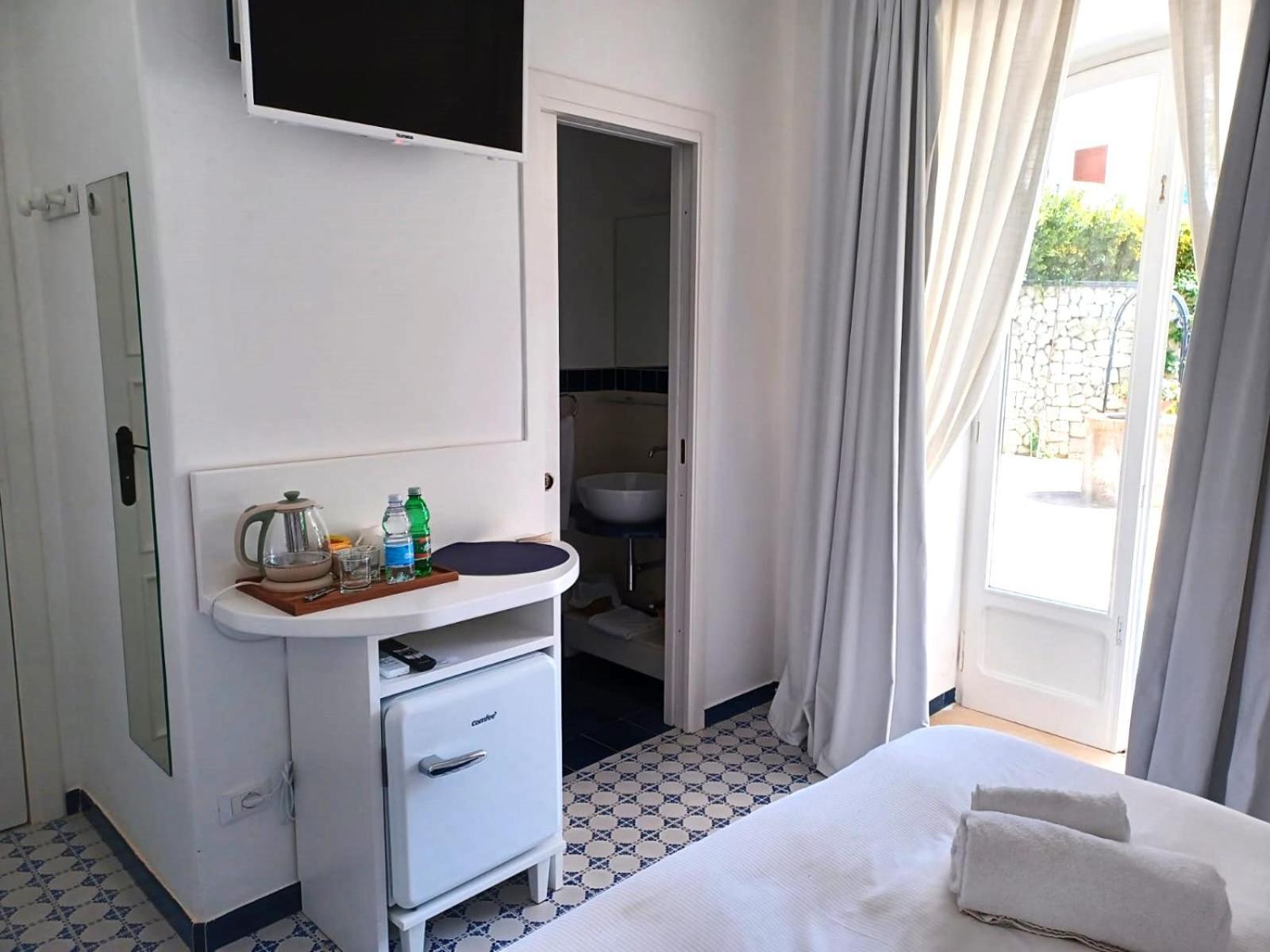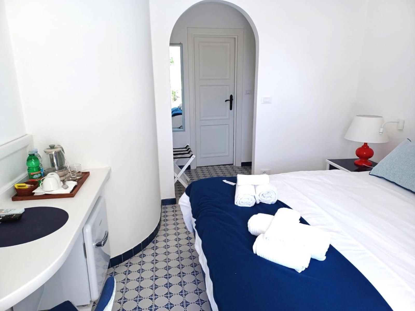 Durante il nostro soggiorno di 2 notti non sono mai state fatte le pulizie nel nostro alloggio, né rifatti i letti o cambiati gli asciugamani. C'era un bollitore con alcune bustine di the e caffè solubile, ma mancavano tazze e cucchiaini. Le porte della doccia non chiudevano completamente il vano e quindi il pavimento del bagno si riempiva d'acqua. Non sono stati forniti né ciabattine per la camera né teli per la piscina; la fornitura di prodotti per il bagno era veramente minima. Quando si accendeva la luce nel bagno cieco, entrava in funzione un aspiratore piuttosto rumoroso, che però non si disattivava spegnendo la luce e questo ha causato un notevole disagio la prima notte. La struttura si trova in alto rispetto al mare e per raggiungere la spiaggia di Citara e le terme abbiamo dovuto camminare per circa 20 minuti, percorrendo una strada trafficata e con marciapiedi a tratti inesistenti; al ritorno, dato che la strada era in salita, abbiamo dovuto aspettare un autobus, piuttosto affollato; invece abbiamo visto che altri alberghi venivano a prendere i loro clienti con una navetta.