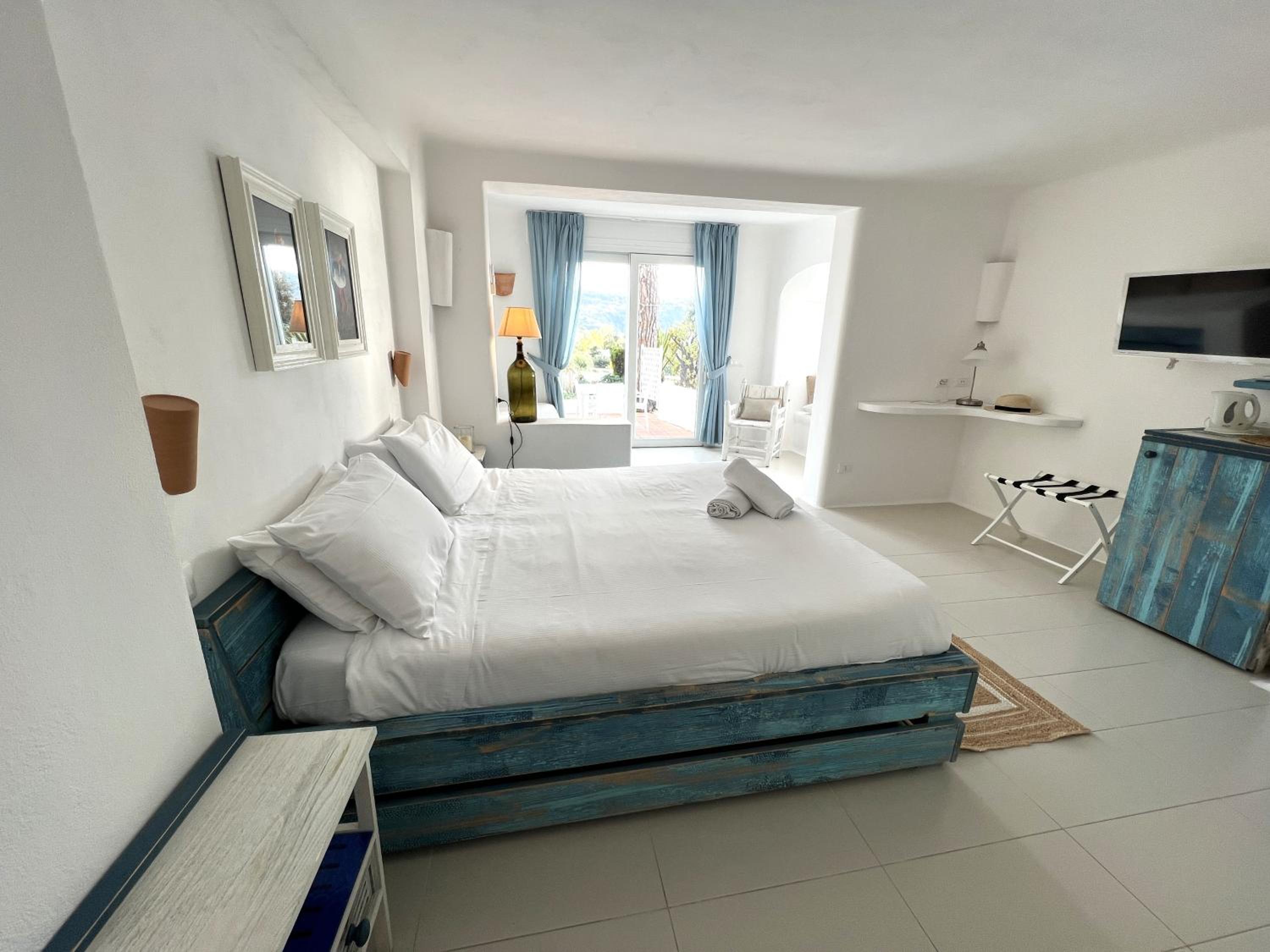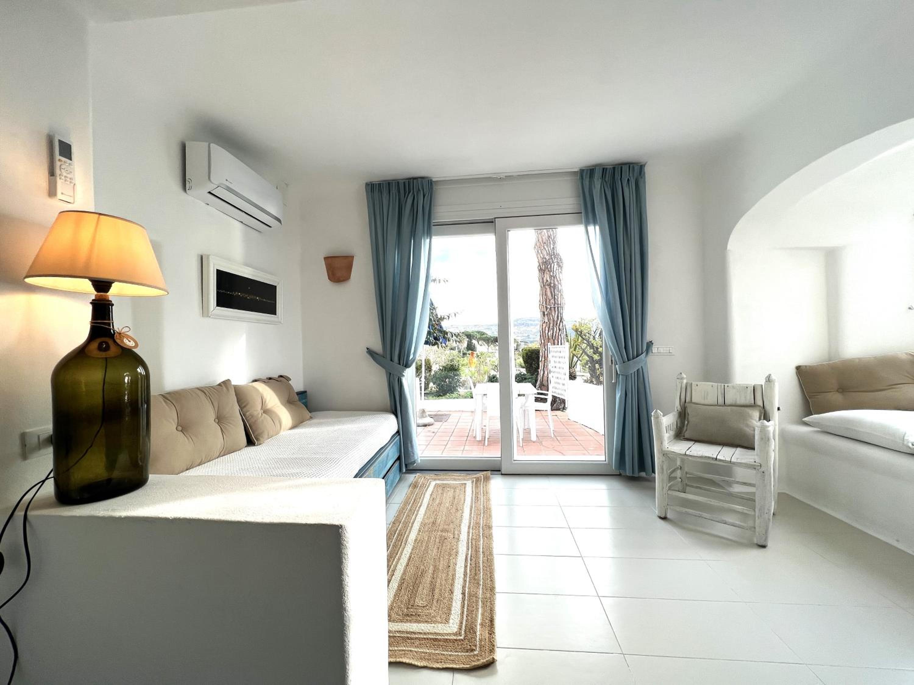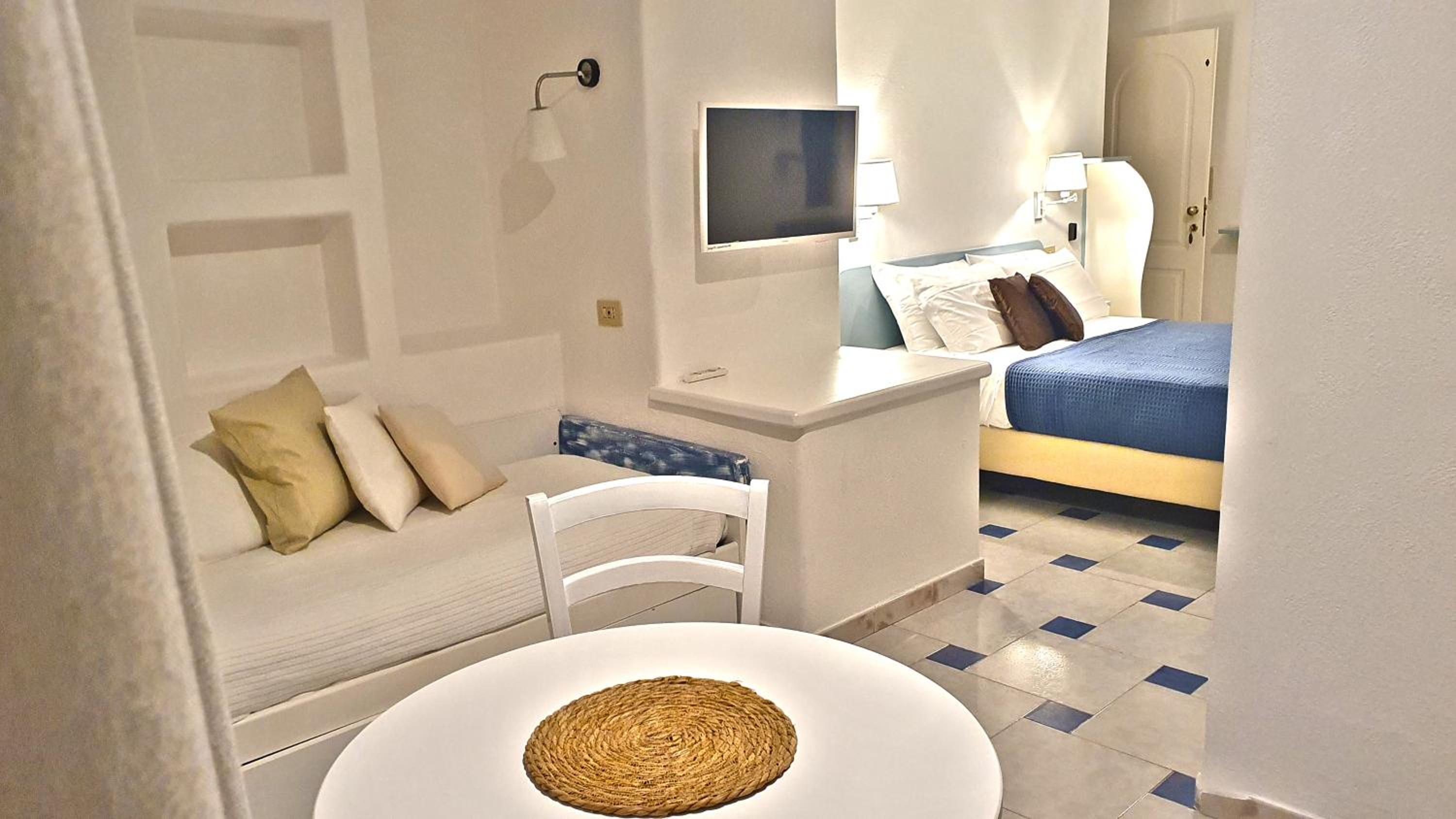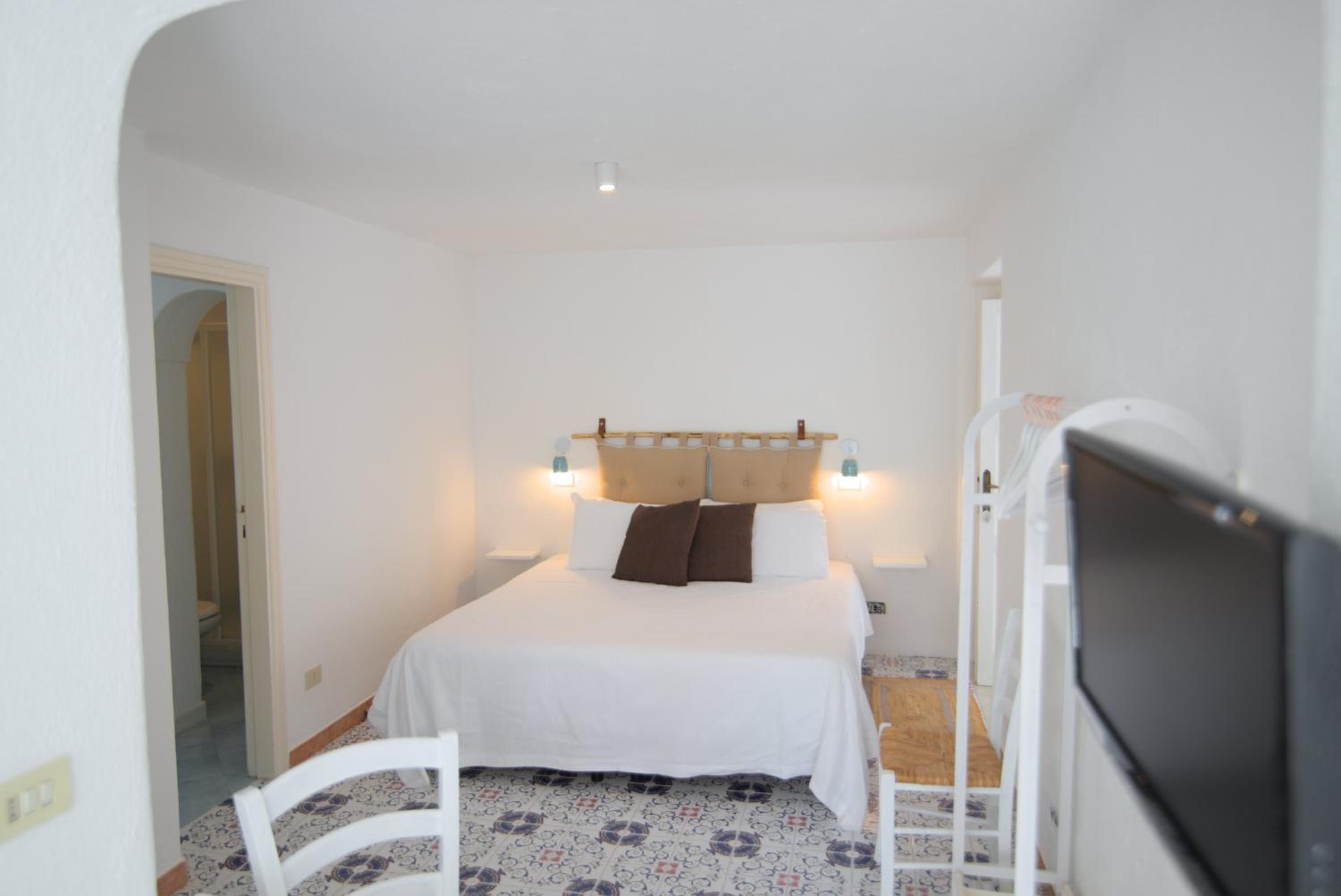 Durante il nostro soggiorno di 2 notti non sono mai state fatte le pulizie nel nostro alloggio, né rifatti i letti o cambiati gli asciugamani. C'era un bollitore con alcune bustine di the e caffè solubile, ma mancavano tazze e cucchiaini. Le porte della doccia non chiudevano completamente il vano e quindi il pavimento del bagno si riempiva d'acqua. Non sono stati forniti né ciabattine per la camera né teli per la piscina; la fornitura di prodotti per il bagno era veramente minima. Quando si accendeva la luce nel bagno cieco, entrava in funzione un aspiratore piuttosto rumoroso, che però non si disattivava spegnendo la luce e questo ha causato un notevole disagio la prima notte. La struttura si trova in alto rispetto al mare e per raggiungere la spiaggia di Citara e le terme abbiamo dovuto camminare per circa 20 minuti, percorrendo una strada trafficata e con marciapiedi a tratti inesistenti; al ritorno, dato che la strada era in salita, abbiamo dovuto aspettare un autobus, piuttosto affollato; invece abbiamo visto che altri alberghi venivano a prendere i loro clienti con una navetta.
