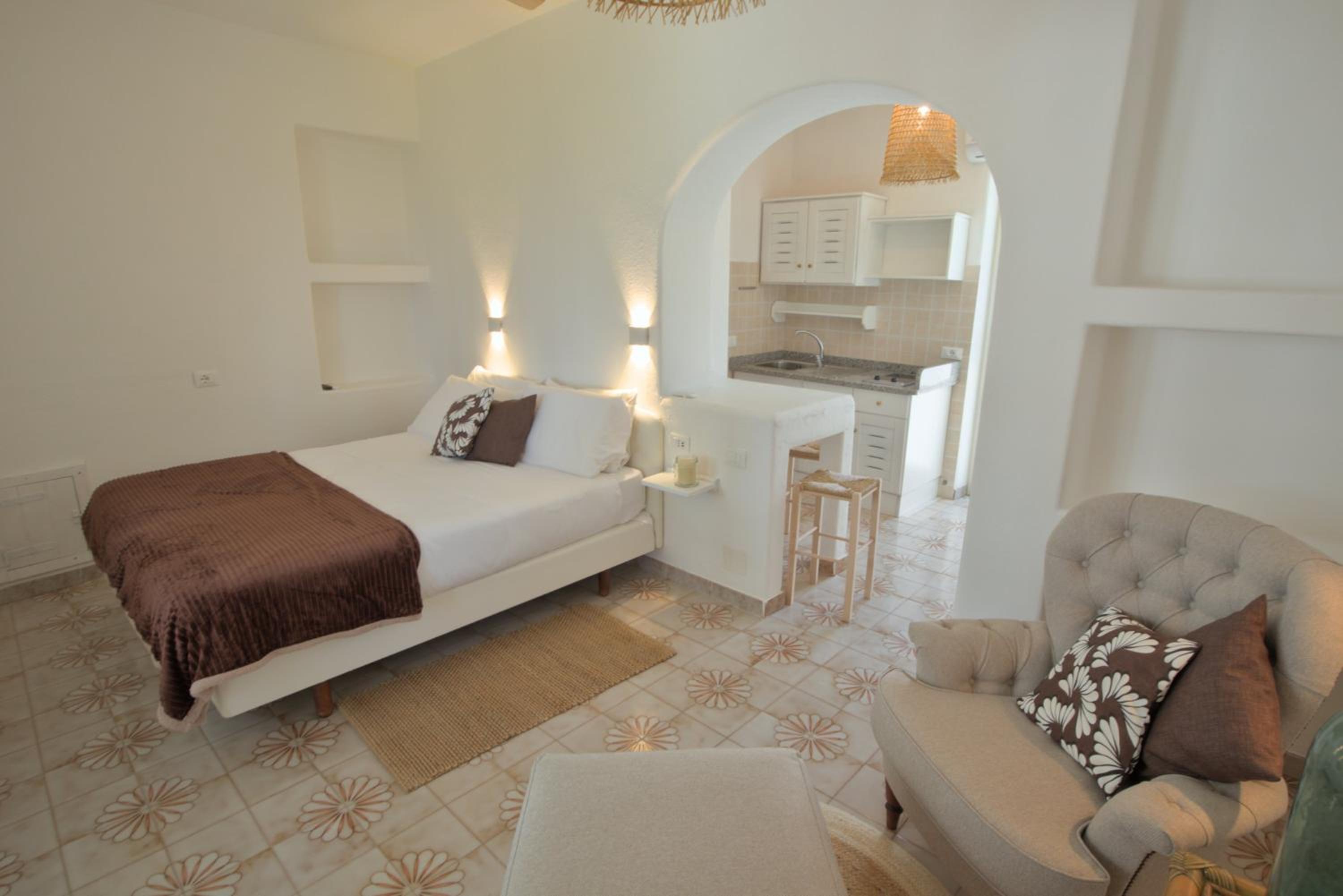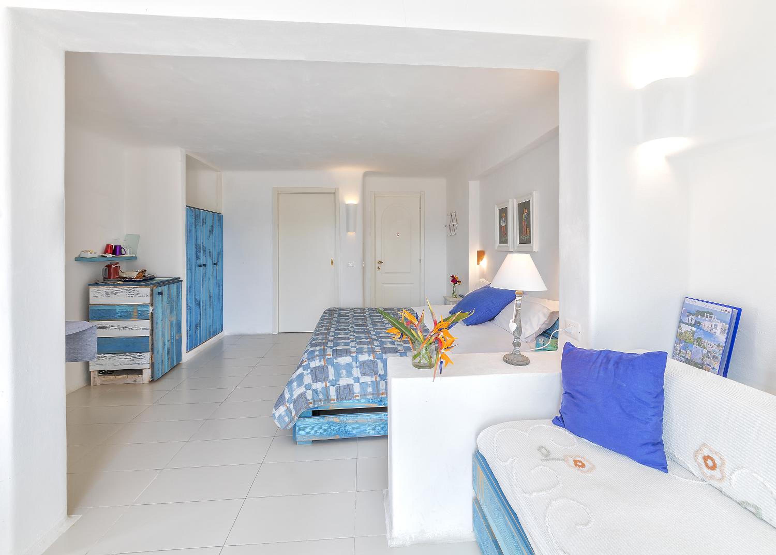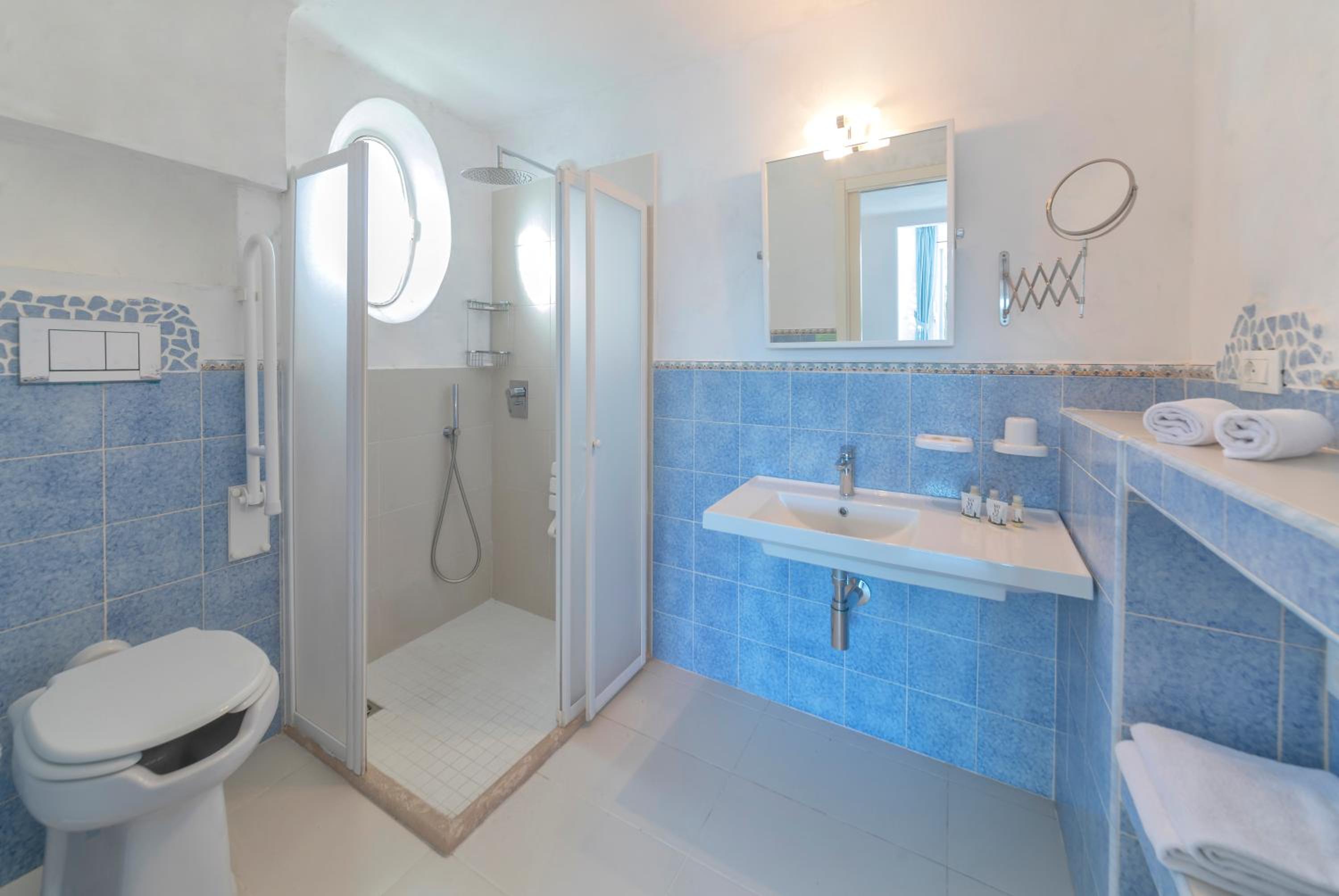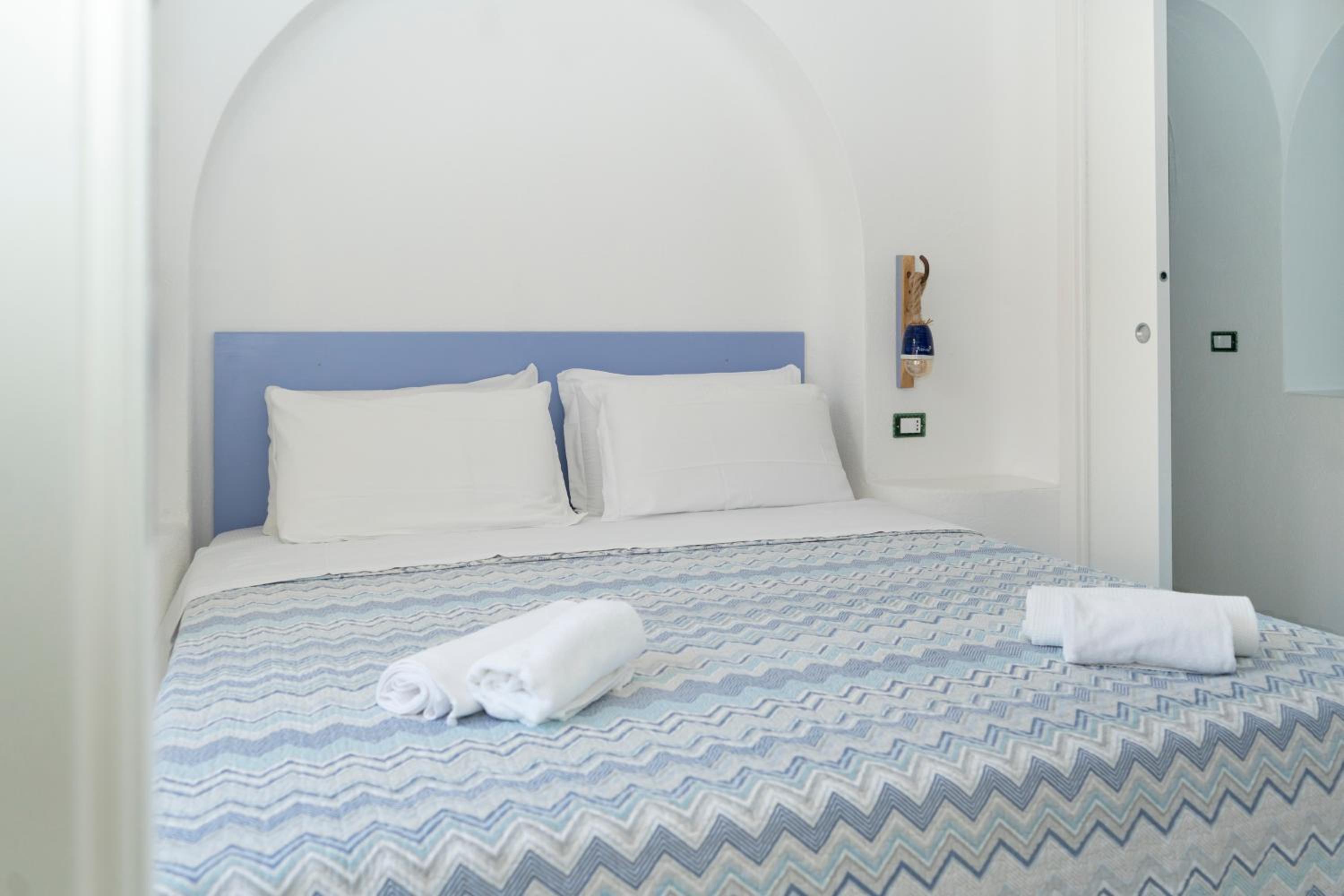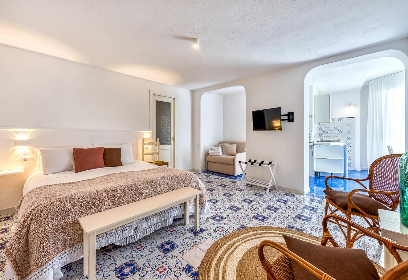 Durante il nostro soggiorno di 2 notti non sono mai state fatte le pulizie nel nostro alloggio, né rifatti i letti o cambiati gli asciugamani. C'era un bollitore con alcune bustine di the e caffè solubile, ma mancavano tazze e cucchiaini. Le porte della doccia non chiudevano completamente il vano e quindi il pavimento del bagno si riempiva d'acqua. Non sono stati forniti né ciabattine per la camera né teli per la piscina; la fornitura di prodotti per il bagno era veramente minima. Quando si accendeva la luce nel bagno cieco, entrava in funzione un aspiratore piuttosto rumoroso, che però non si disattivava spegnendo la luce e questo ha causato un notevole disagio la prima notte. La struttura si trova in alto rispetto al mare e per raggiungere la spiaggia di Citara e le terme abbiamo dovuto camminare per circa 20 minuti, percorrendo una strada trafficata e con marciapiedi a tratti inesistenti; al ritorno, dato che la strada era in salita, abbiamo dovuto aspettare un autobus, piuttosto affollato; invece abbiamo visto che altri alberghi venivano a prendere i loro clienti con una navetta.