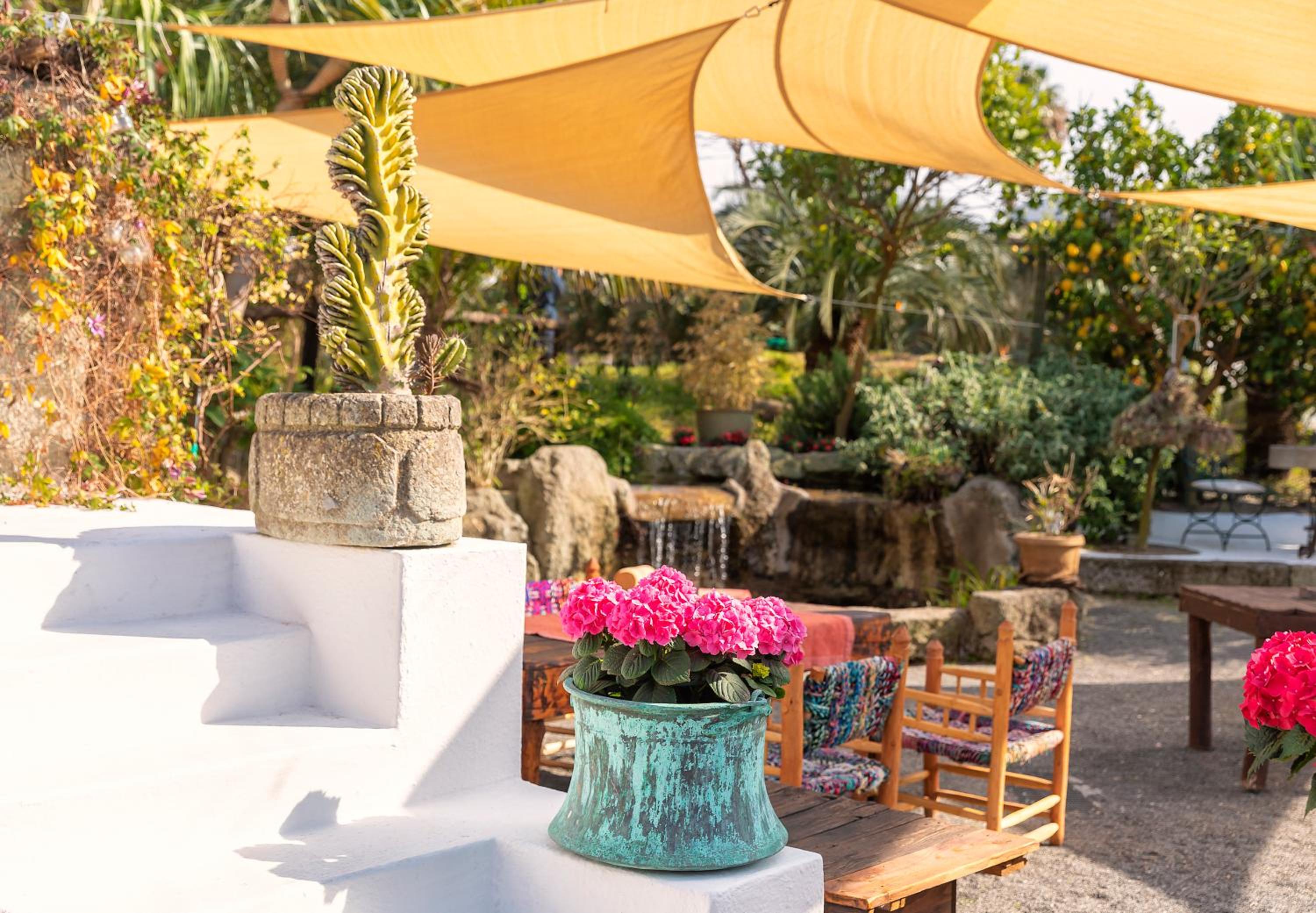 Location molto caratteristica con panorama molto bello e un giardino di piante grasse fantastico. Assistenza alla reception ottima. Colazione buonissima immersi nel giardino con visita di pavoni compresa. Piscina interna con acqua calde e bagno turco. Veramente una bellissima atmosfera con tutti molto gentili e disponibili