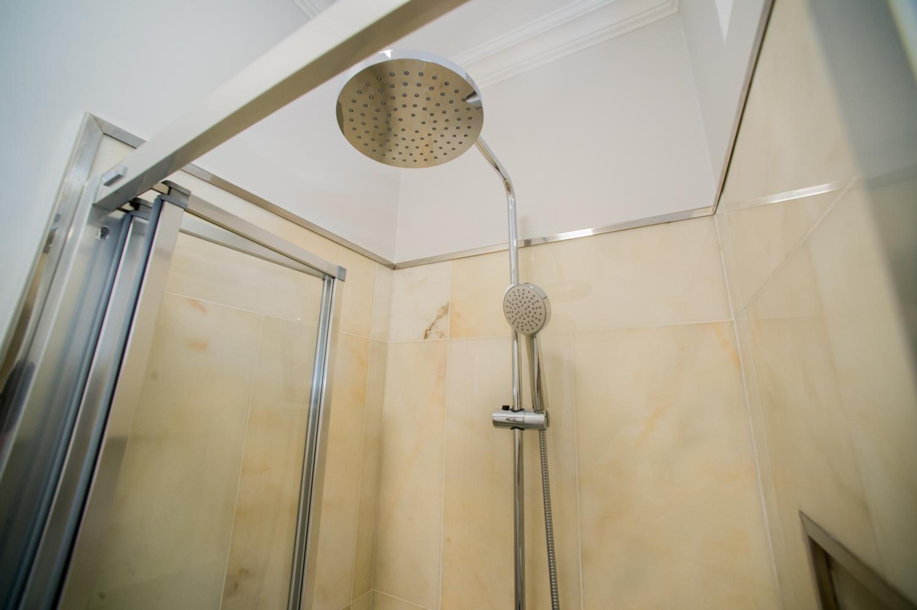 The shower could have been bigger and the shower head could have been replaced because it was leaking.