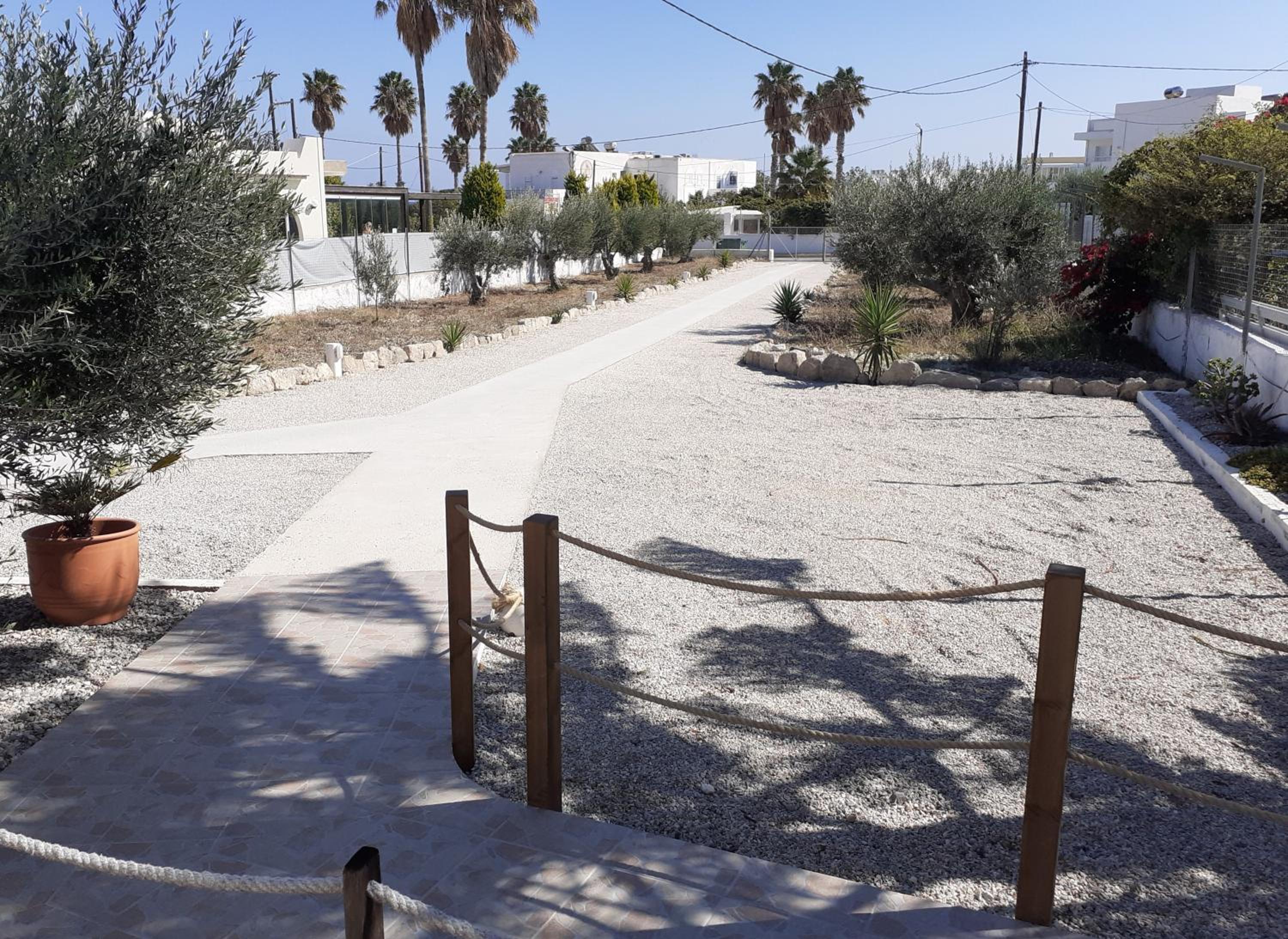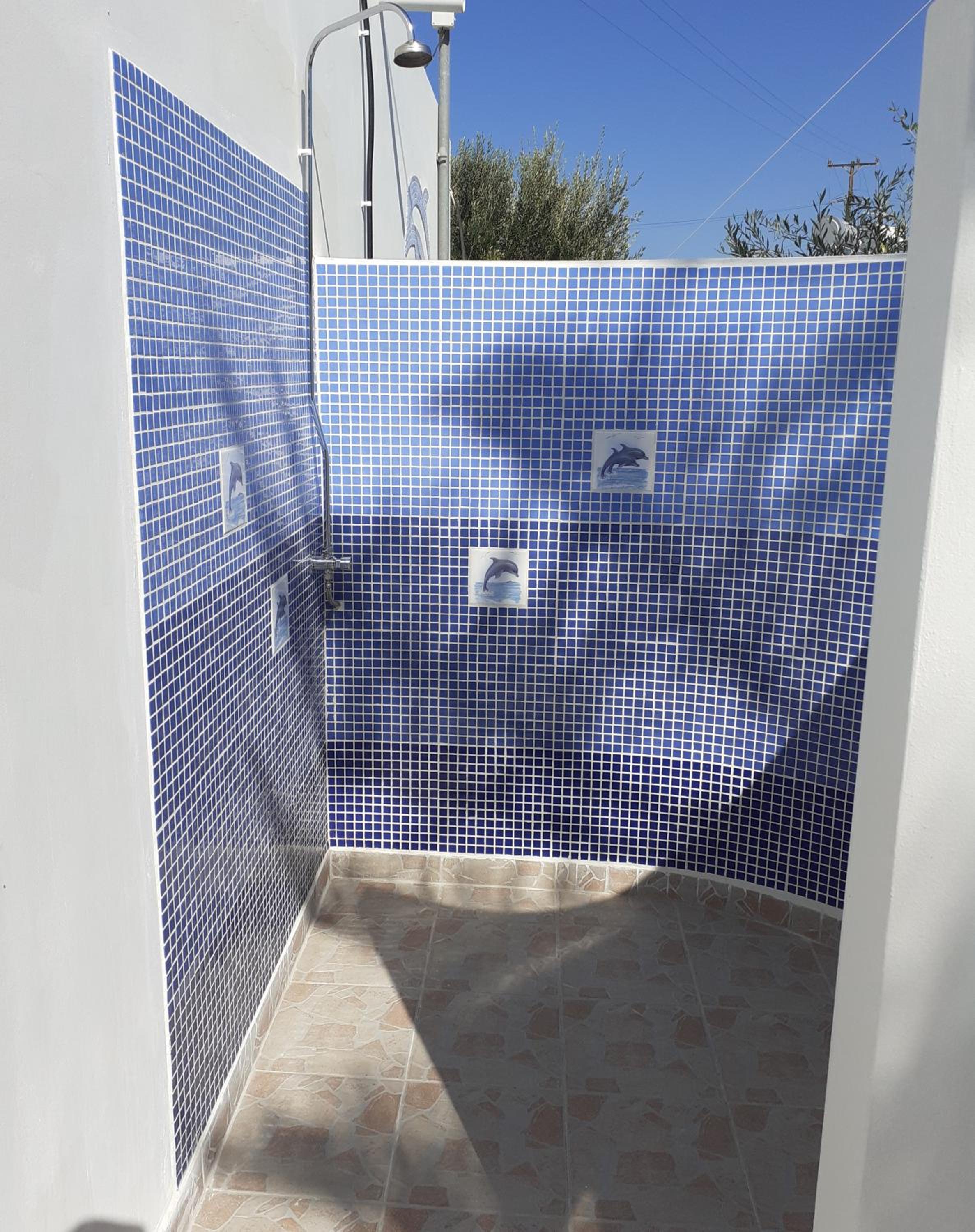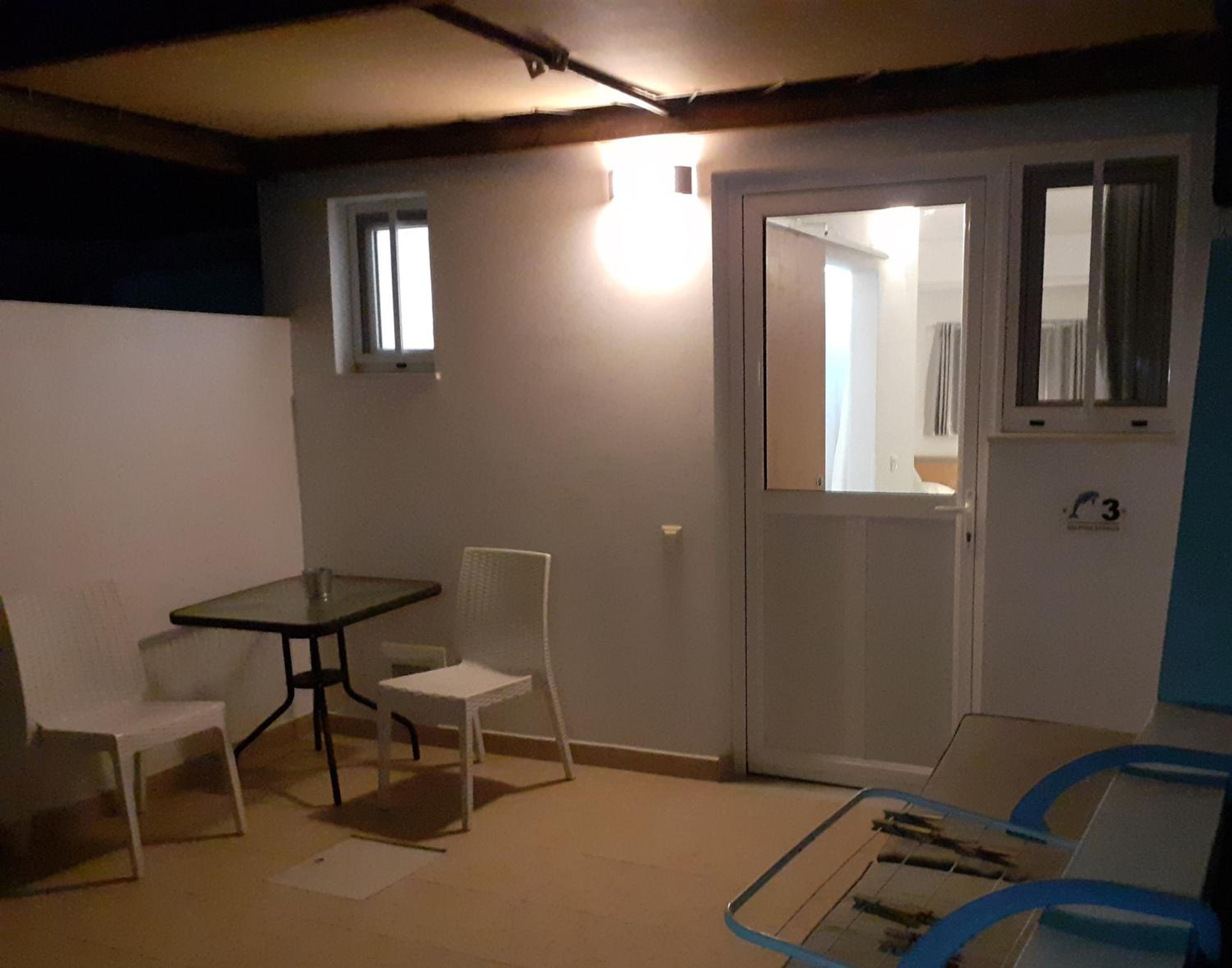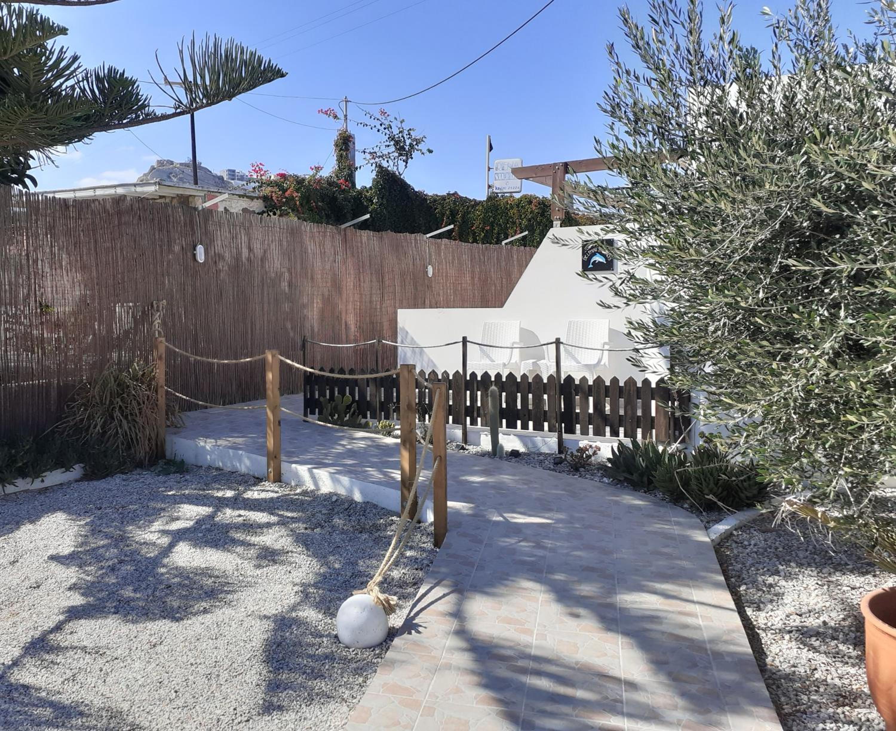 The studios are large, well designed and beautifully finished. The accessible shower room is superb with a powerful shower and plenty of hot water. There is good, free wifi, a free safe and a good sized fridge which was well stocked when we arrived. There is a large patio area at the front of each studio with good quality sun loungers and a small table and chairs. Unfortunately there is no view from the patios (apart from the boundary fence) but that is not uncommon for ground floor accommodation. Cat and Andy are great hosts, friendly and extremely helpful. They provided transfers to and from the airport for a very reasonable price, which was very helpful and convenient. The ladies who tidied and cleaned the rooms (Sammy and Jean) were always friendly and helpful and kept the studio immaculate. The beach is around 250 yards away and there are half a dozen or more tavernas within that distance, plus a small supermarket right next door to the studios.